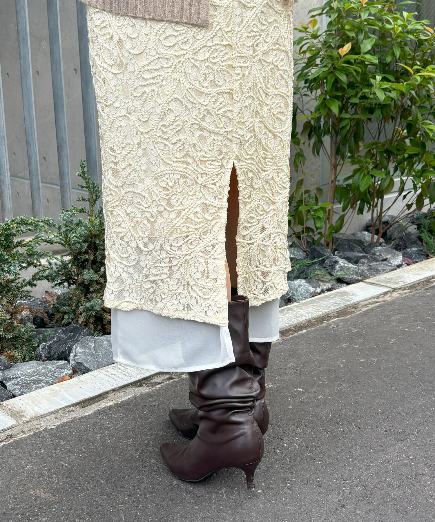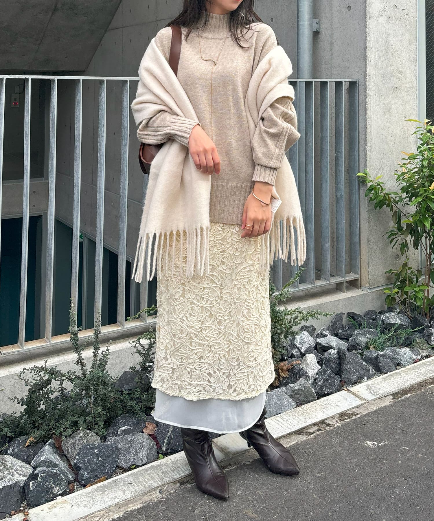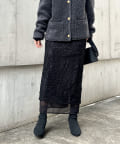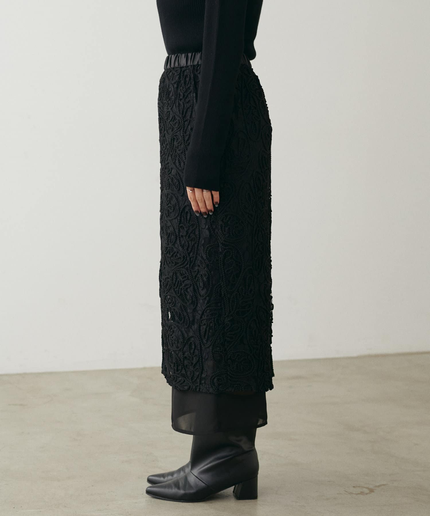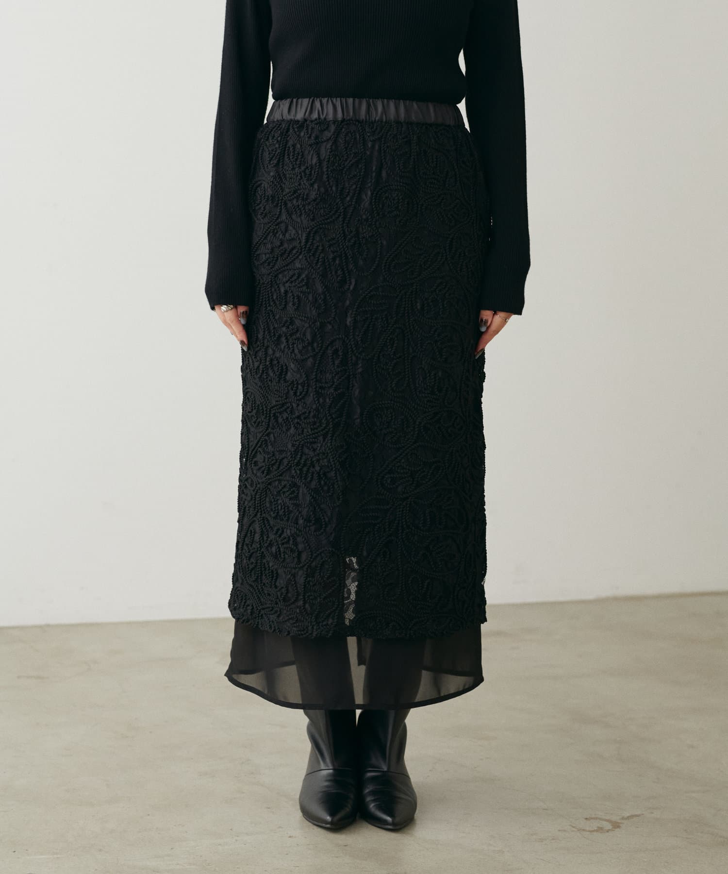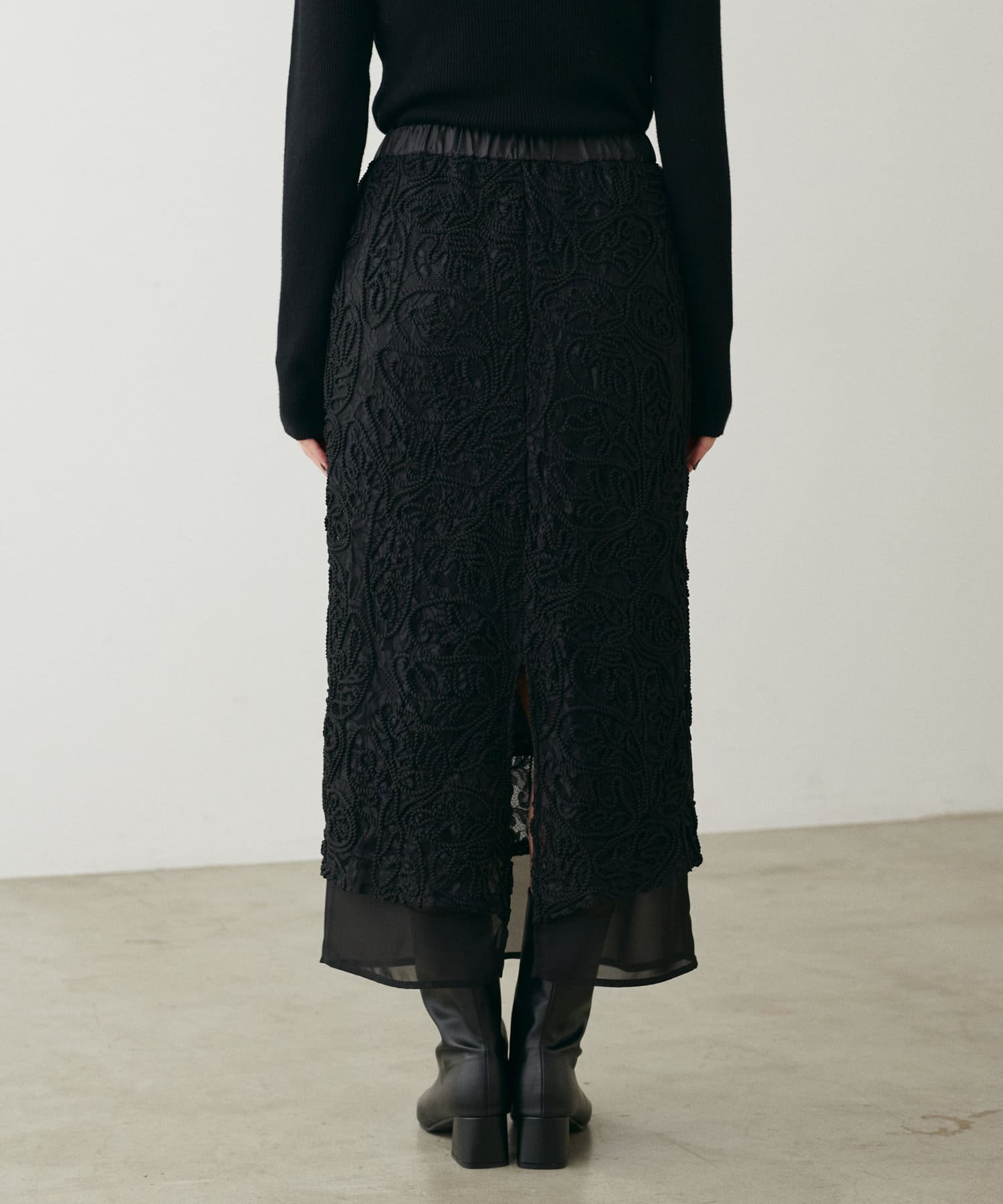全体にひろがるロープレースの模様が気品を纏うIラインスカート。