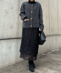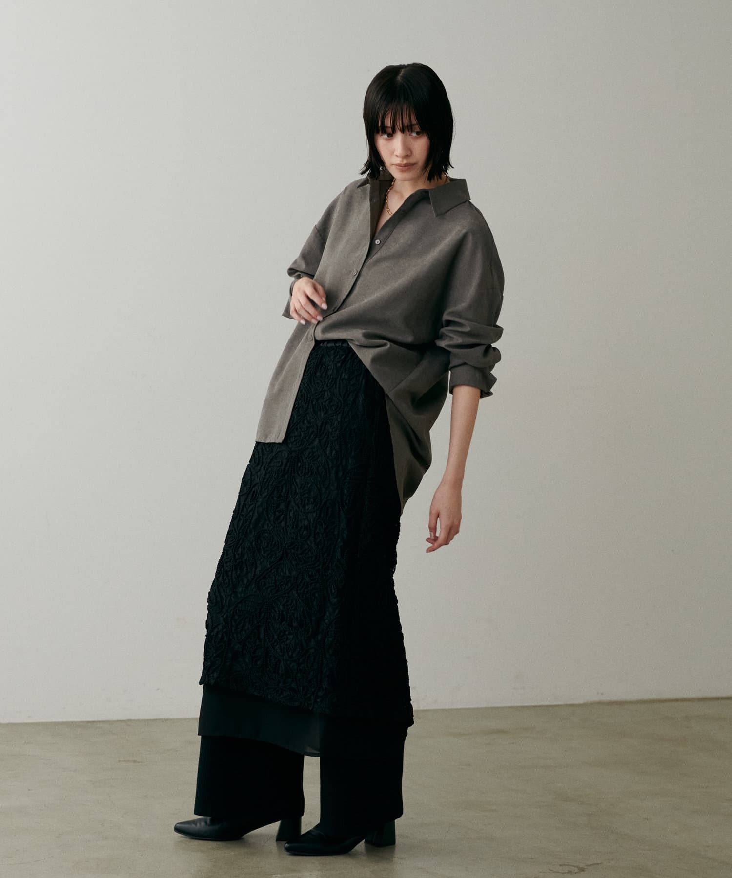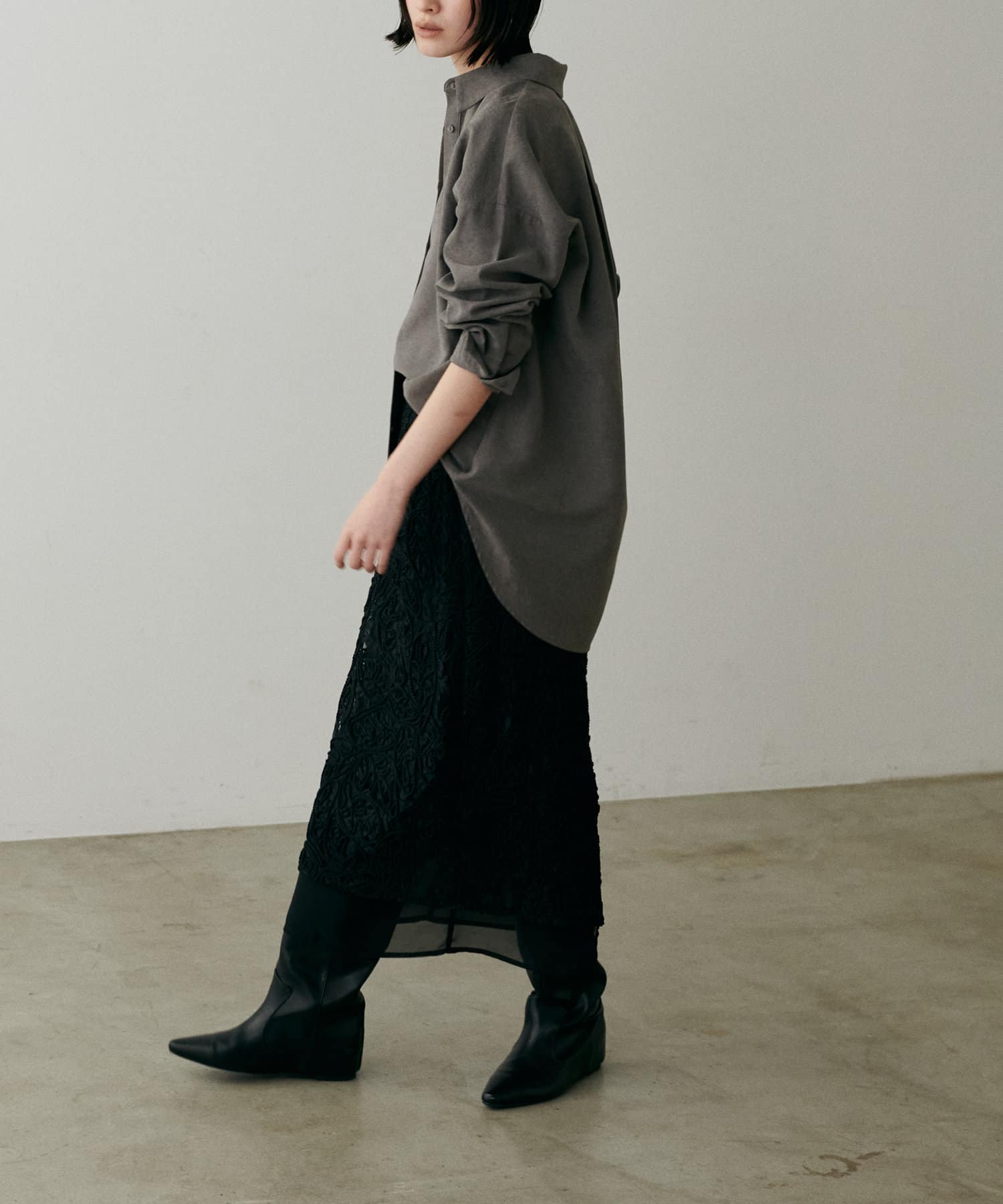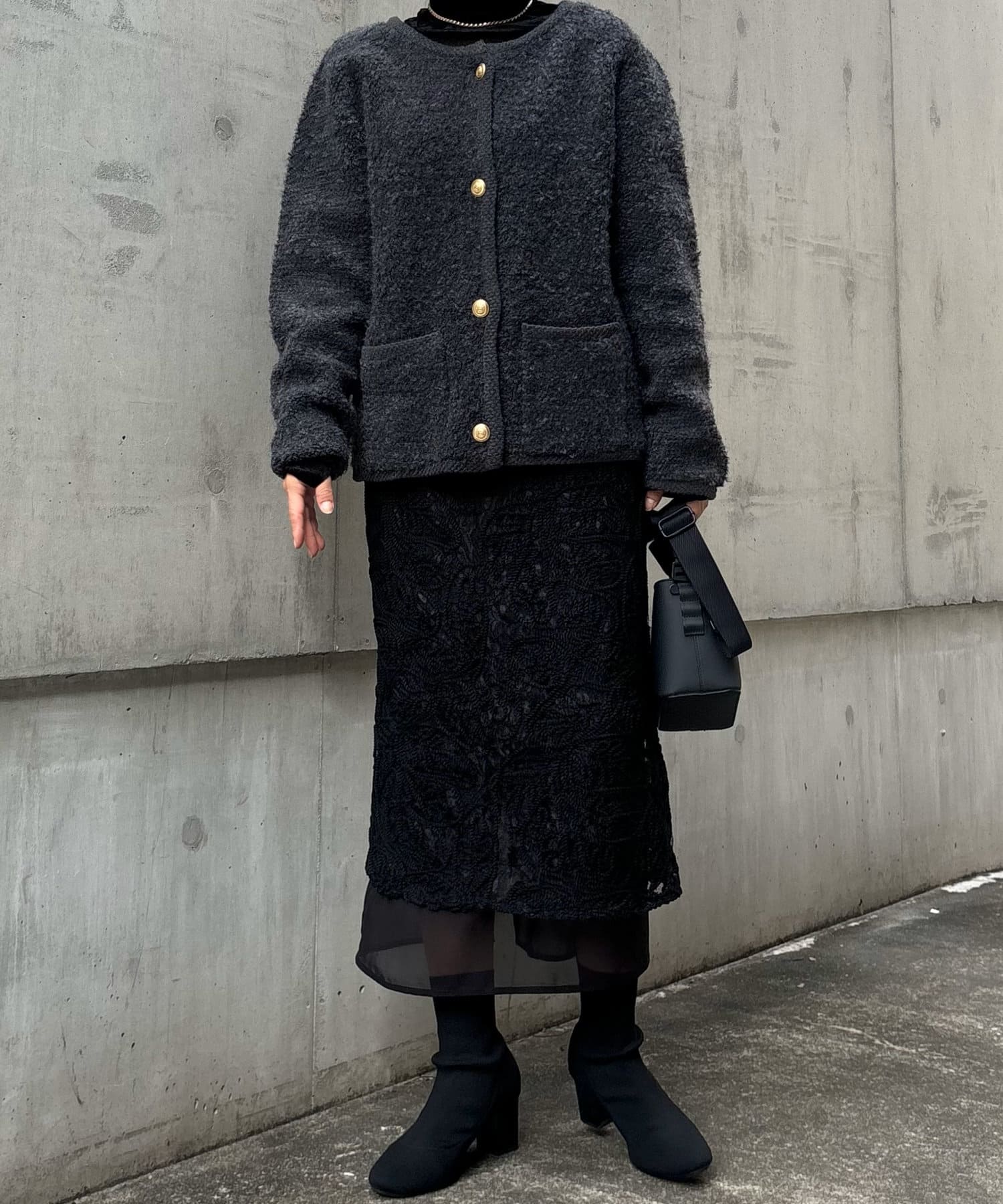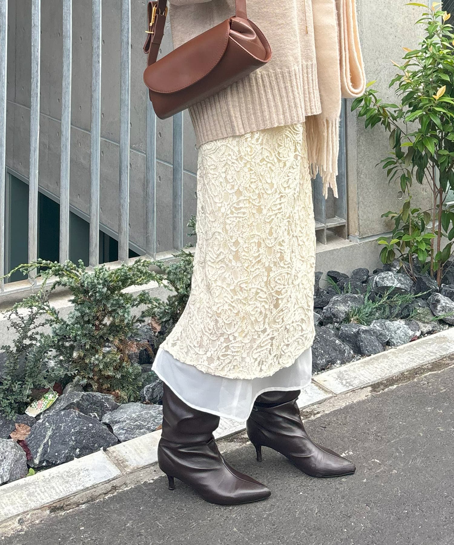 全体にひろがるロープレースの模様が気品を纏うIラインスカート。
