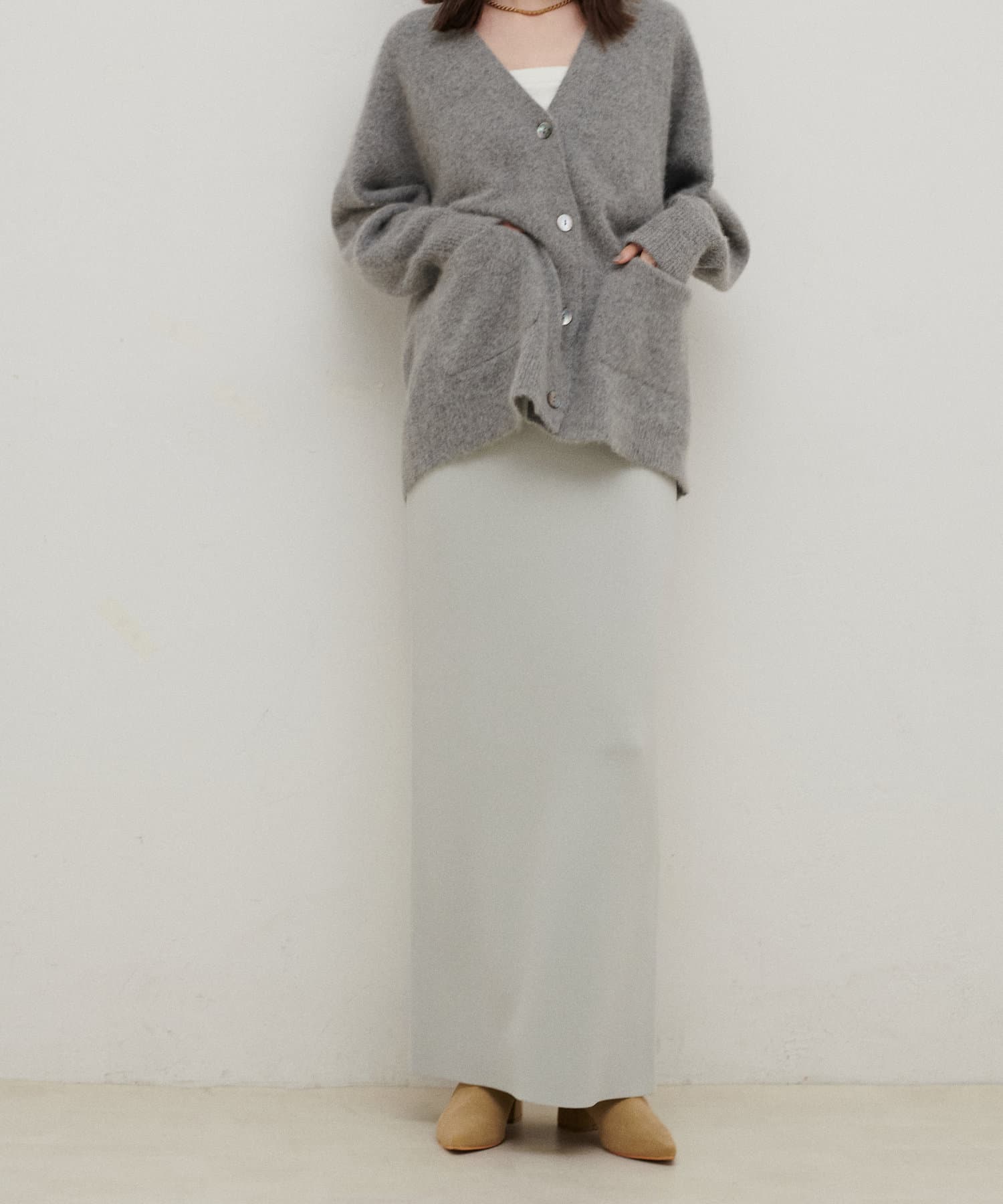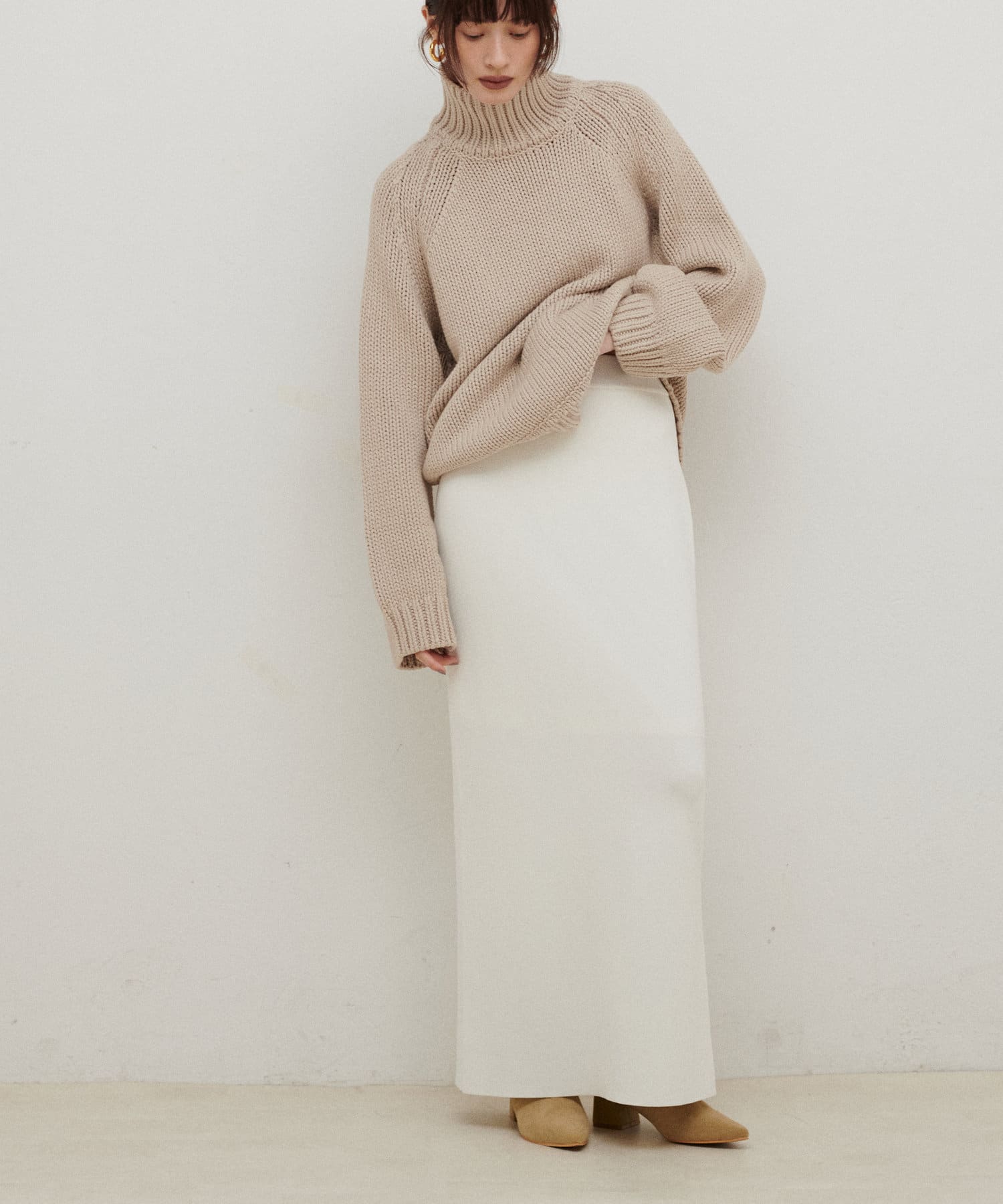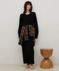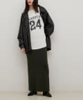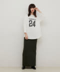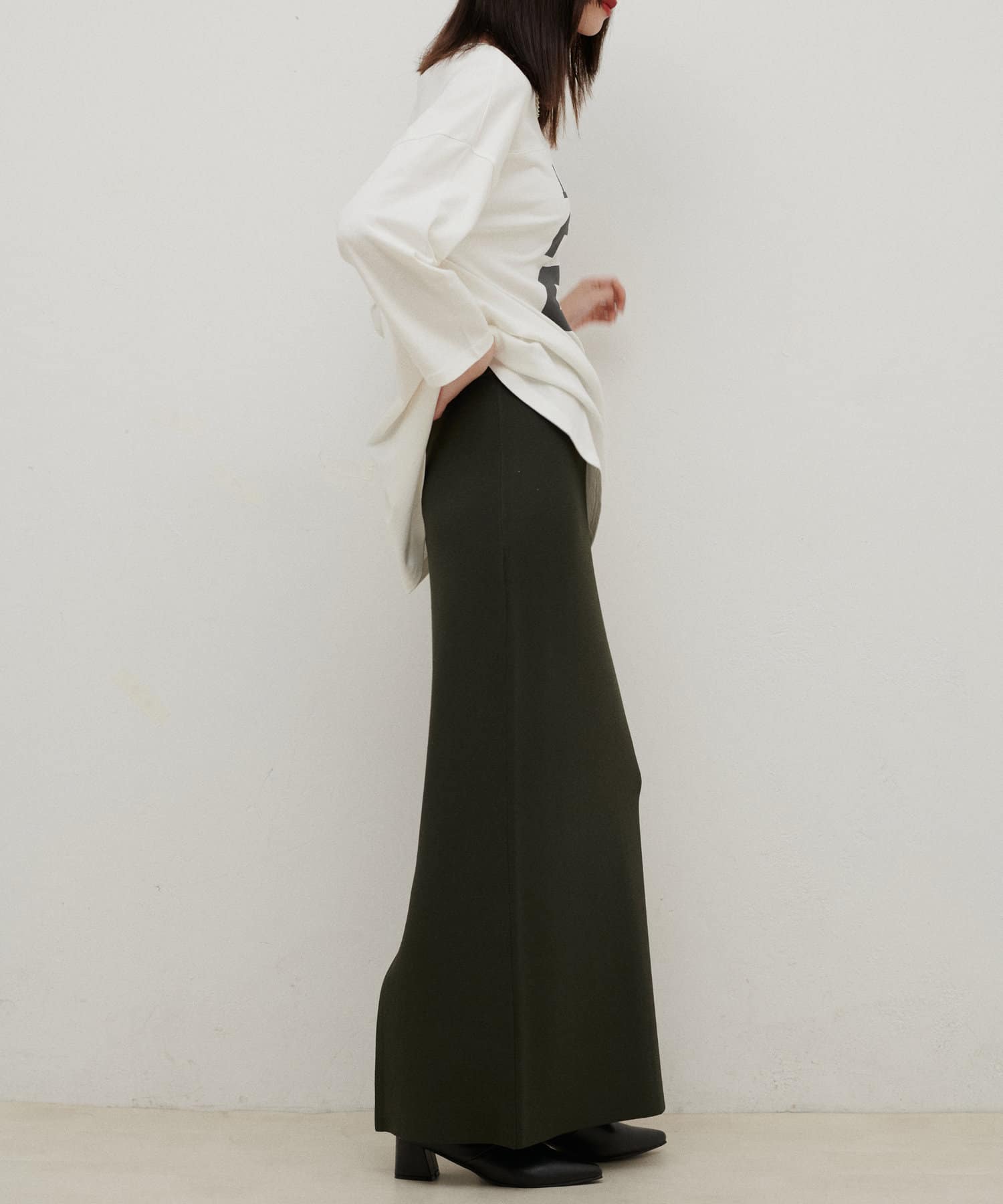 すっきりとしたシルエットのスカートなのでトップスは