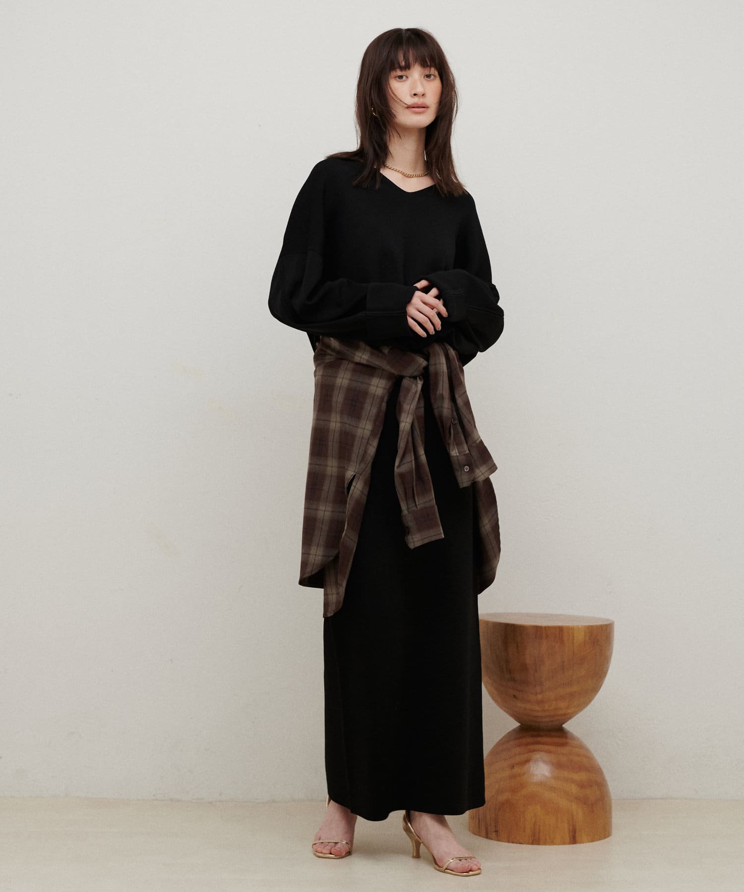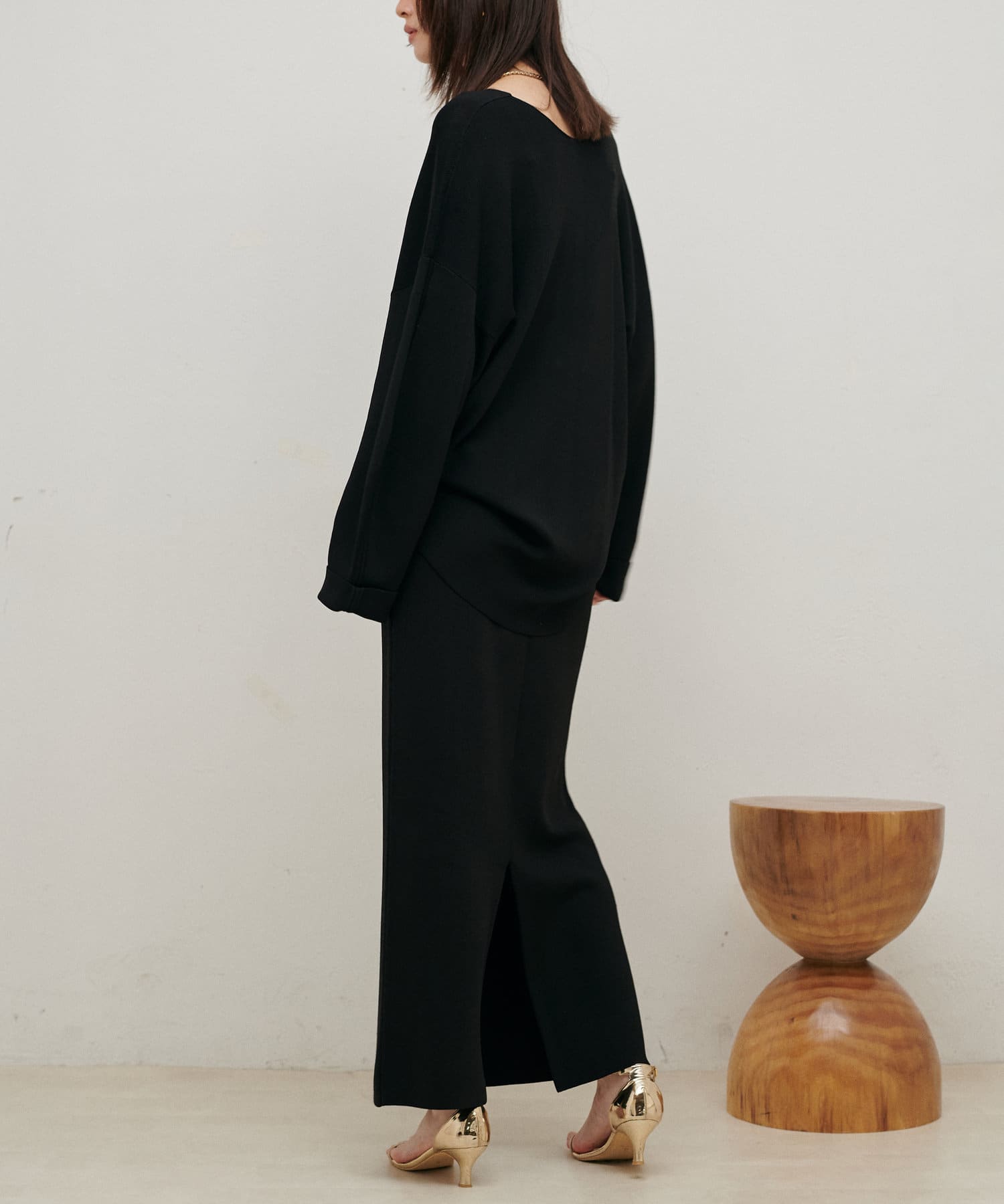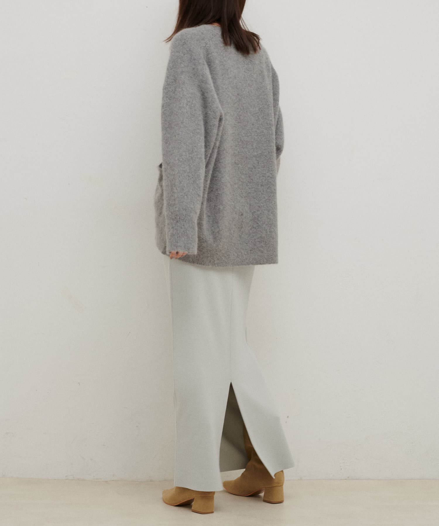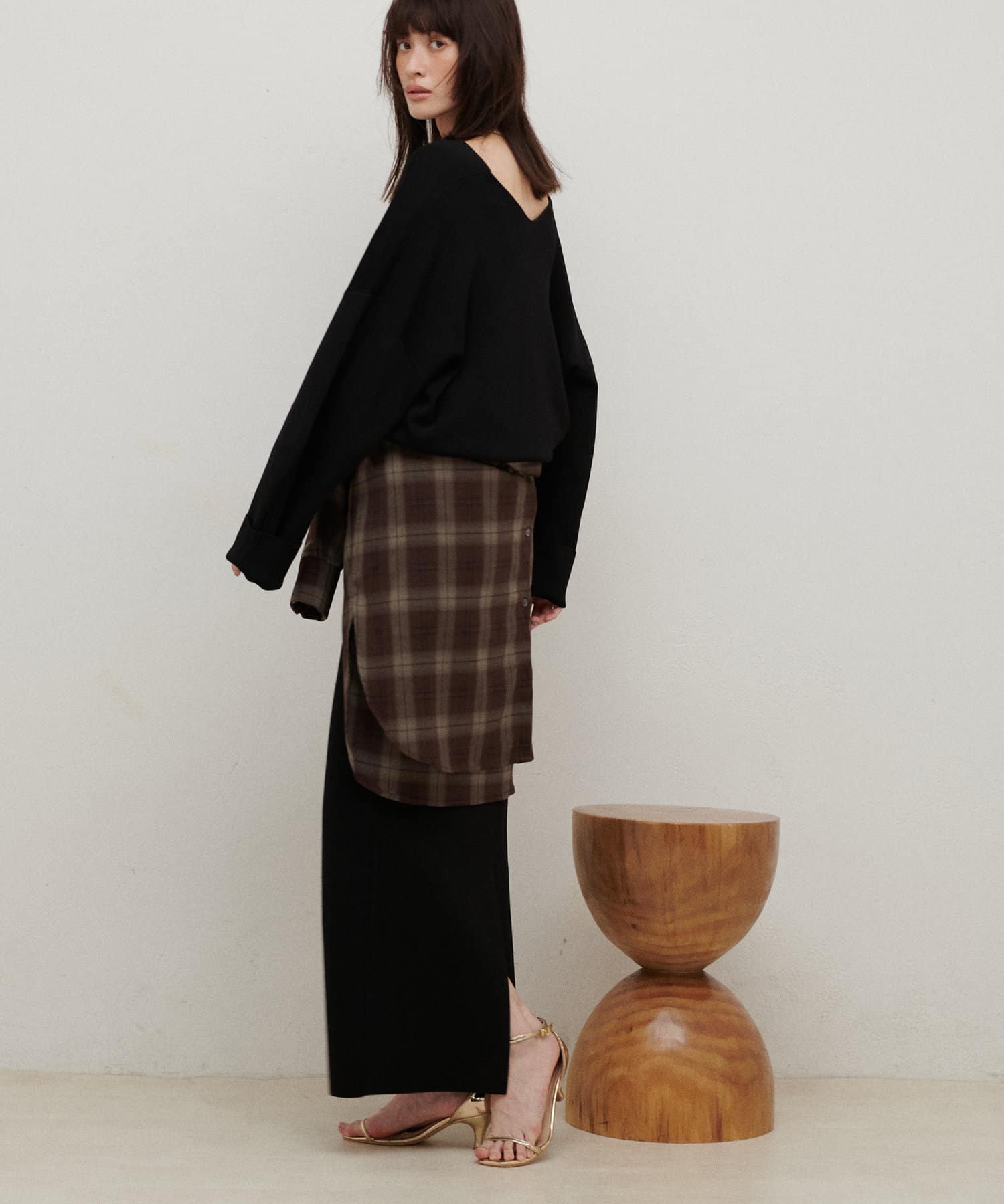 すっきりとしたシルエットのスカートなのでトップスは