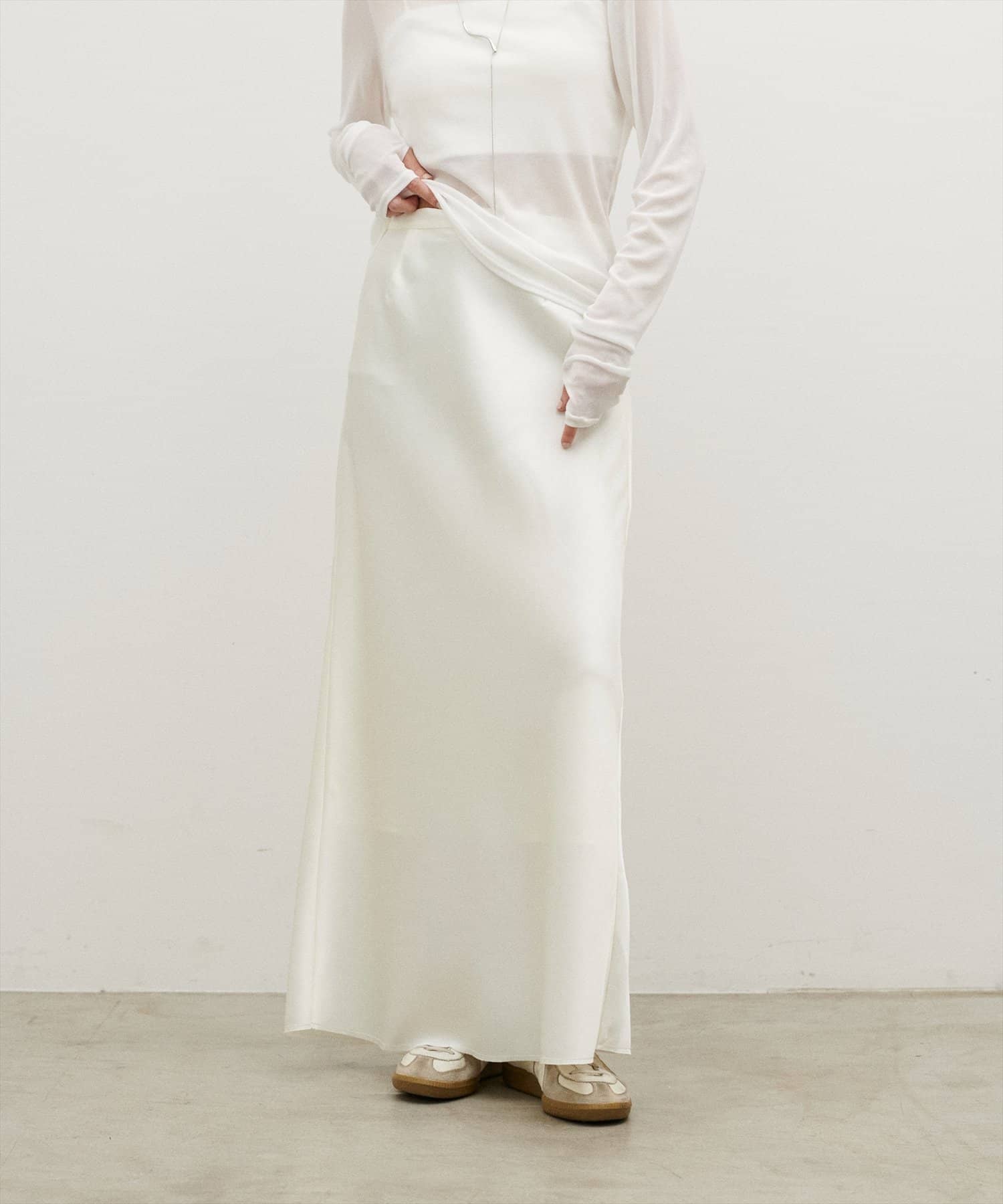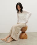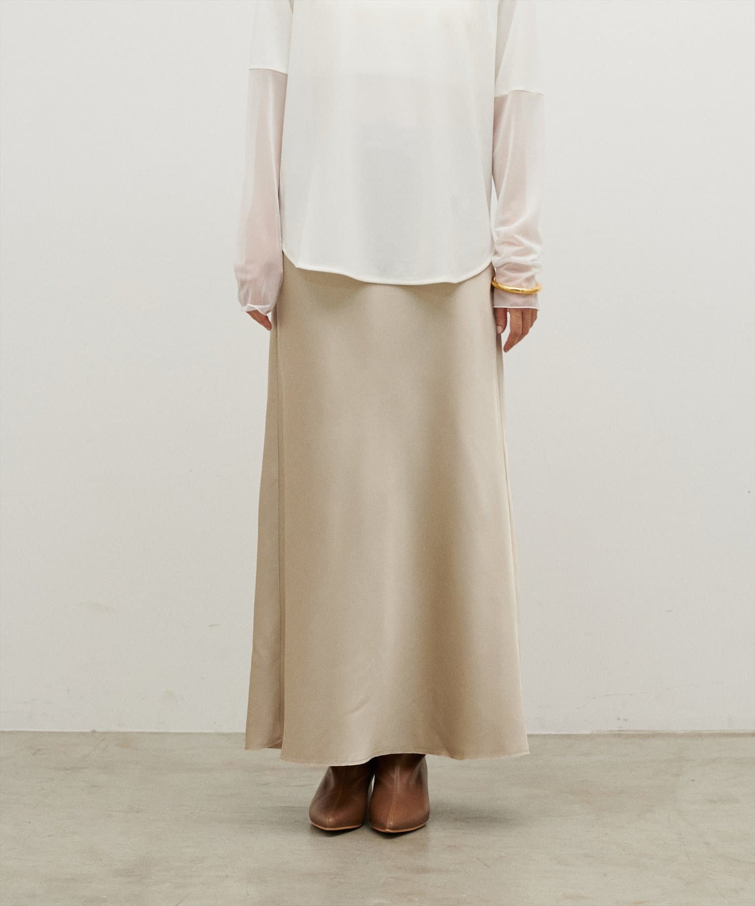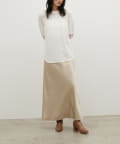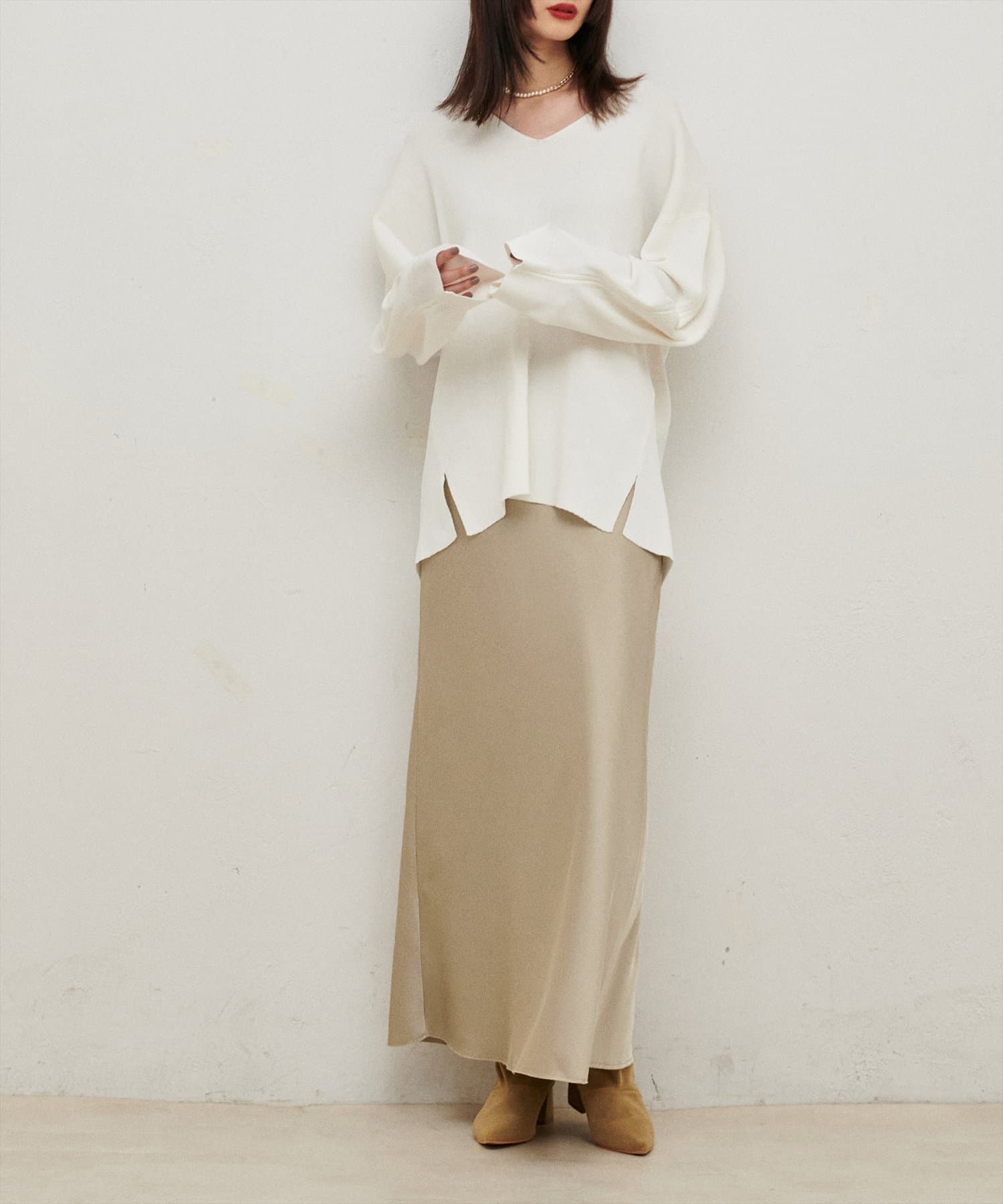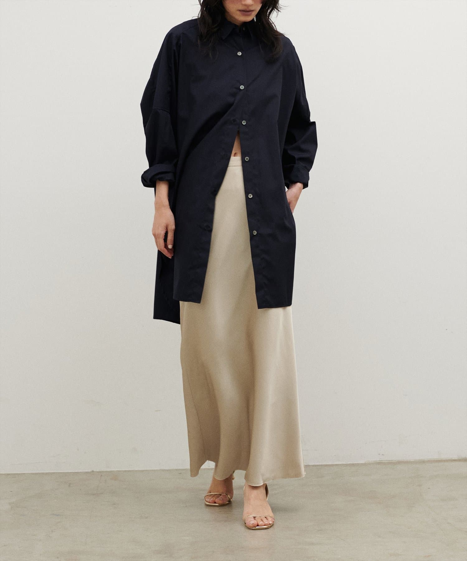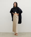 上品なロング丈で女性らしいシルエットを作り上げており、裾は断ち切り仕様に
