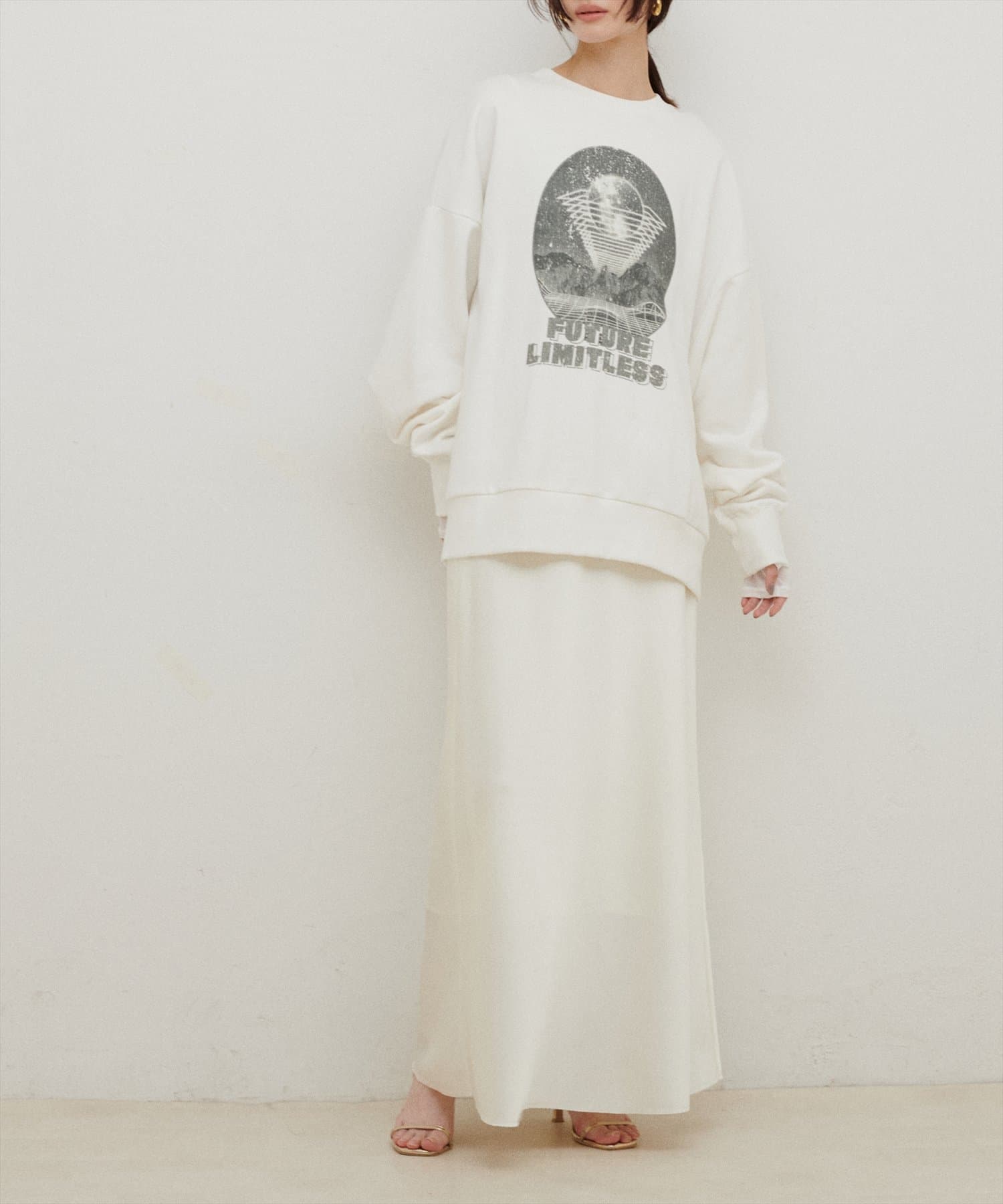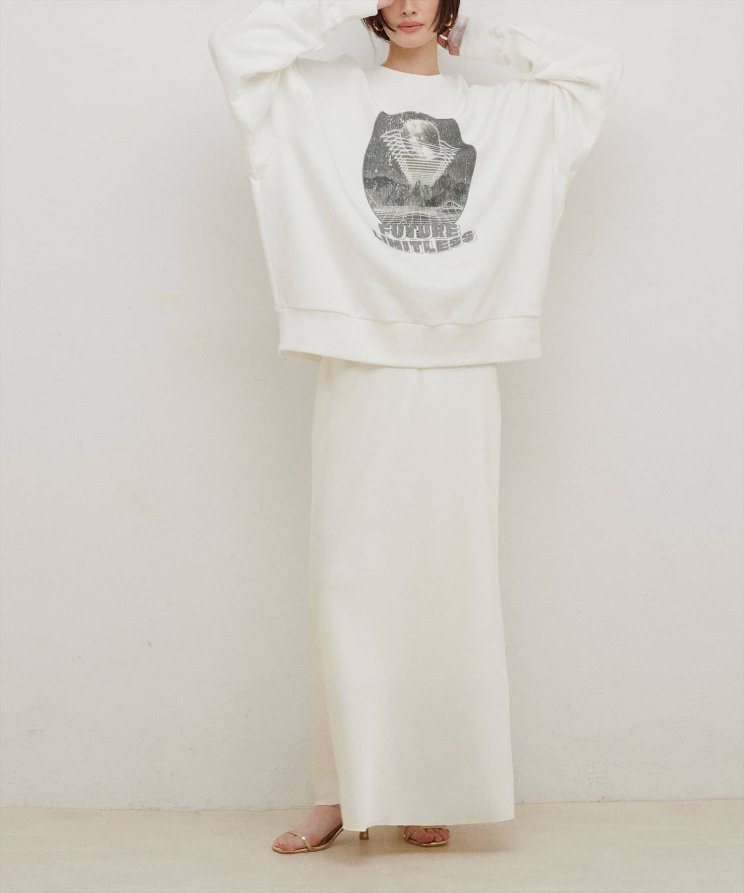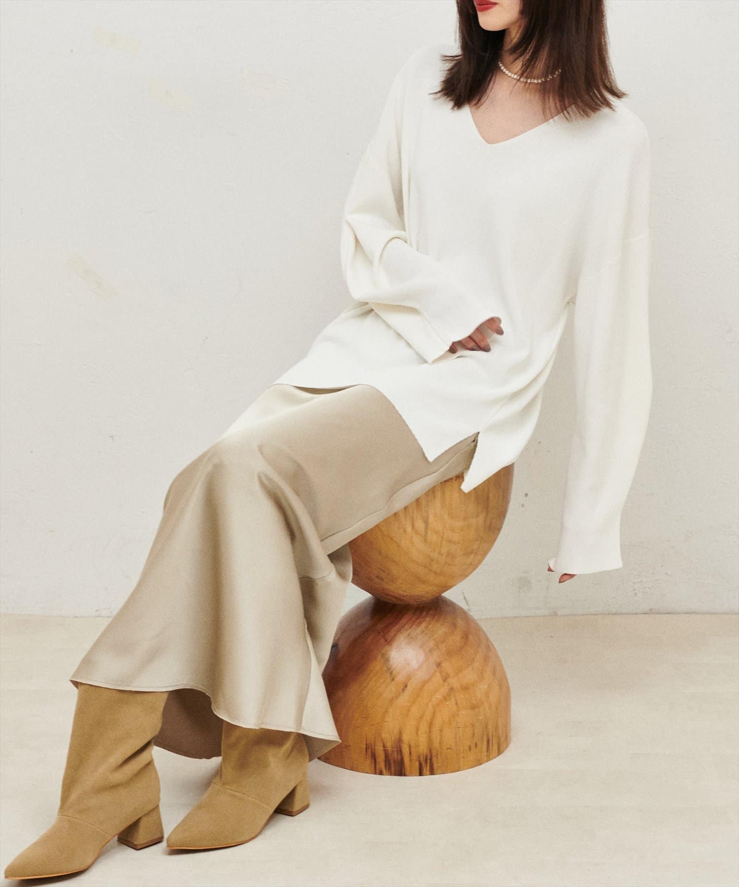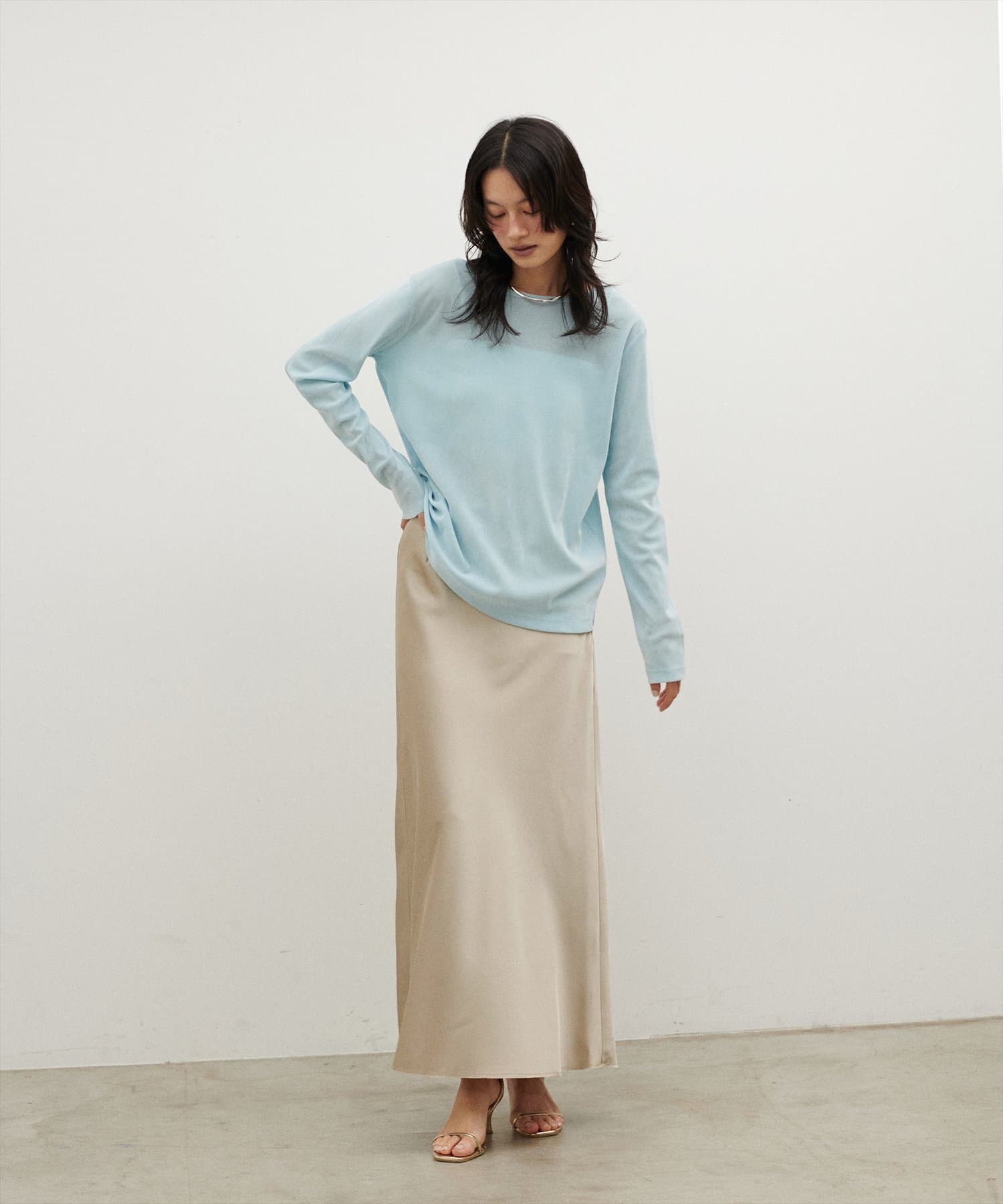 上品なロング丈で女性らしいシルエットを作り上げており、裾は断ち切り仕様に