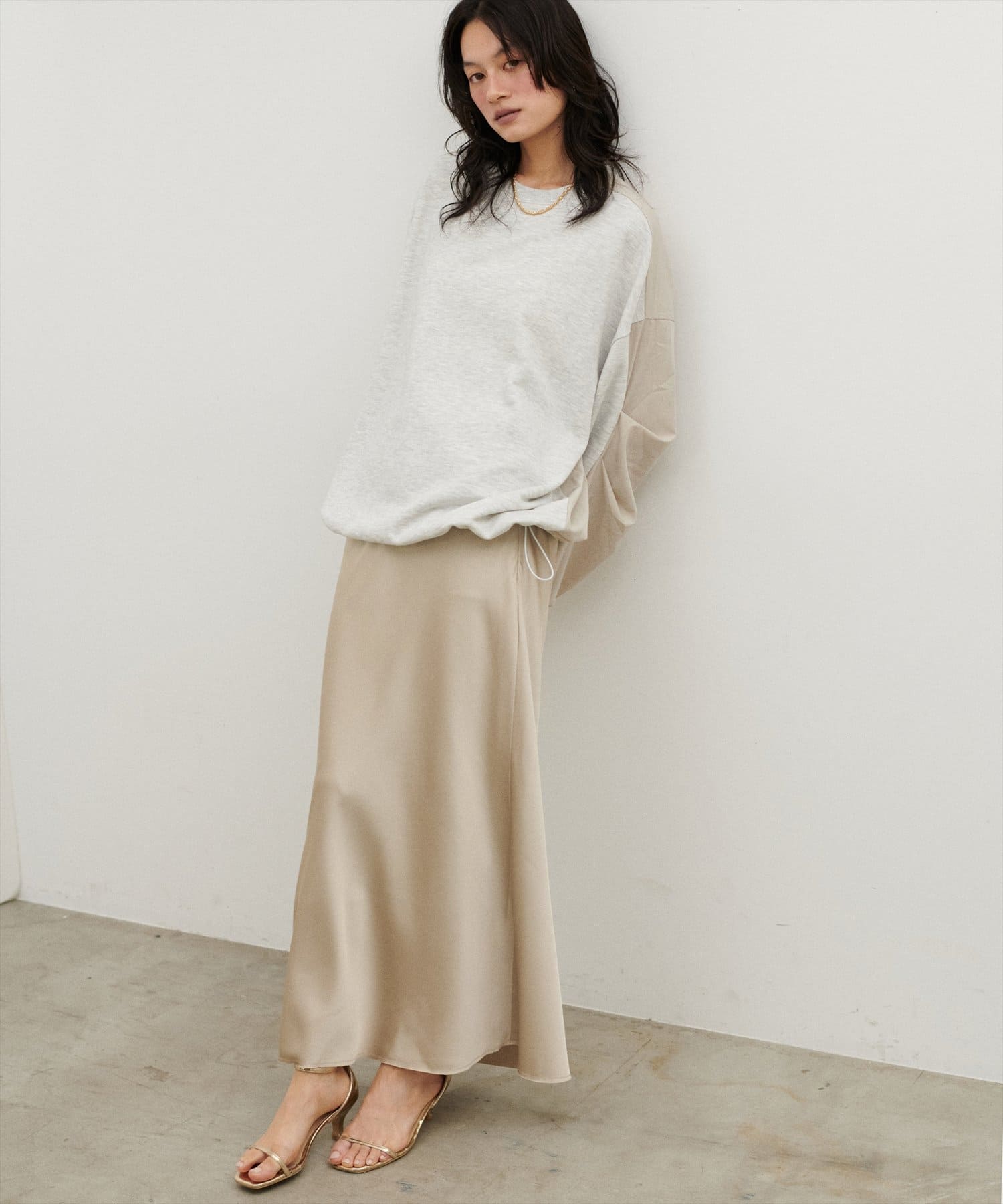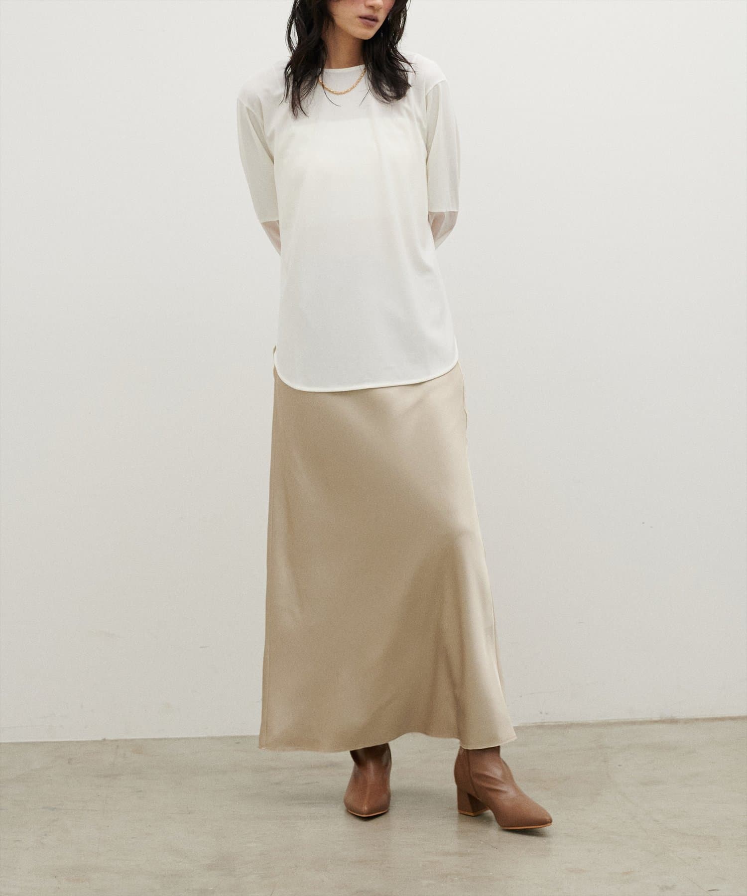 カジュアルなTシャツやカットソーと光沢のあるサテンのコーディネートは