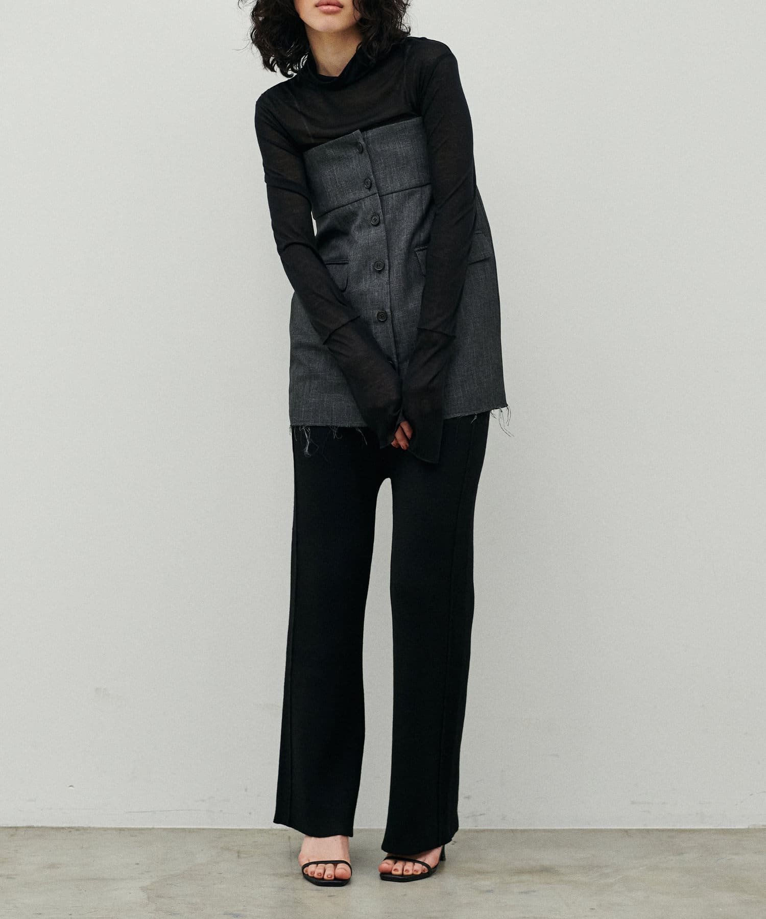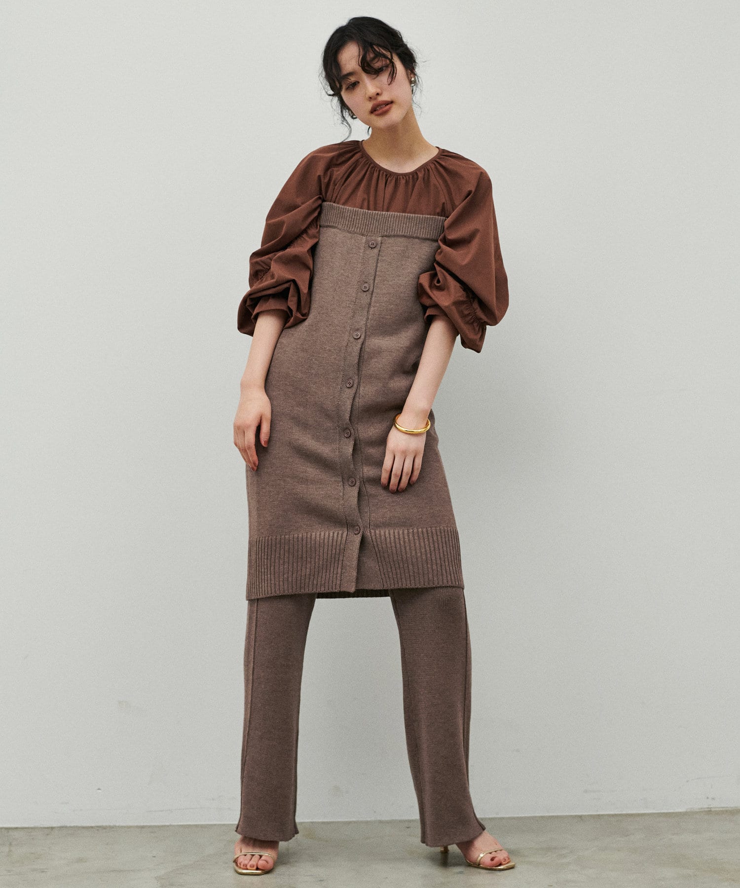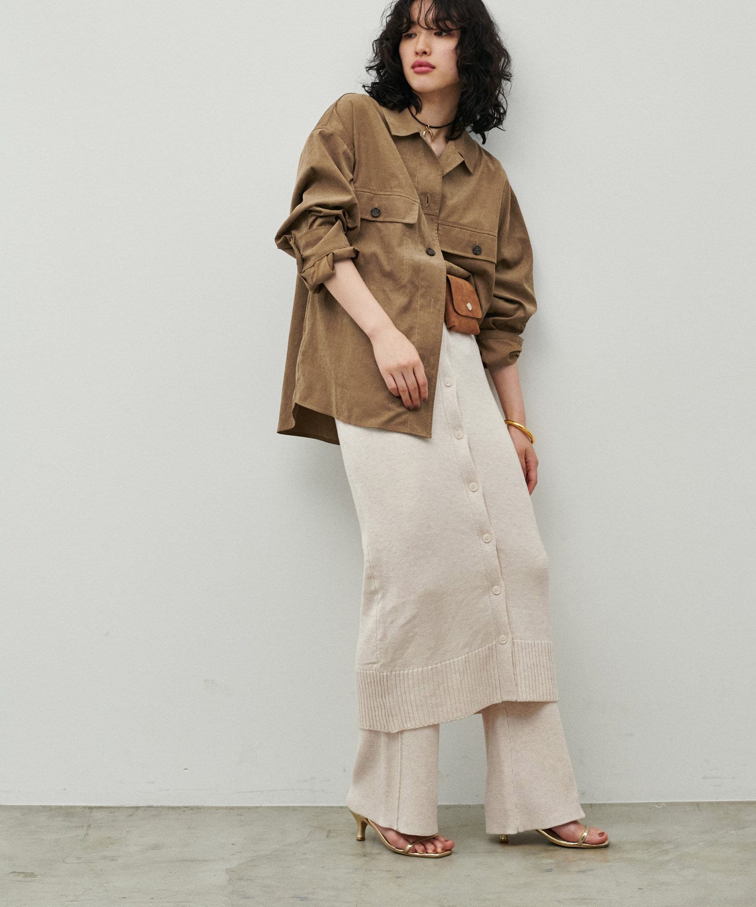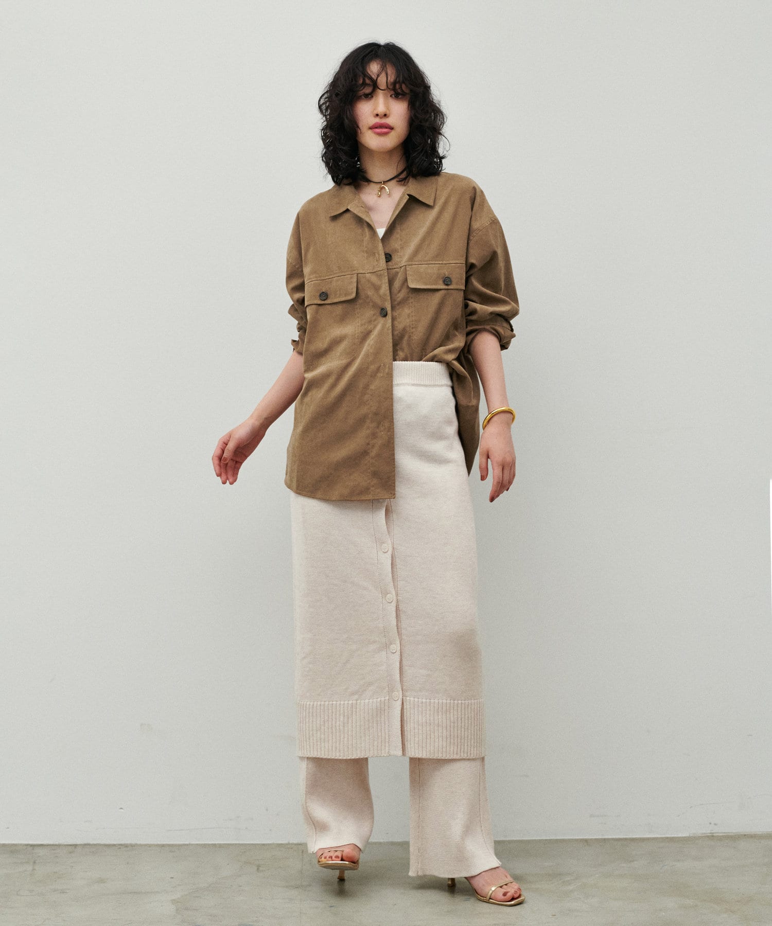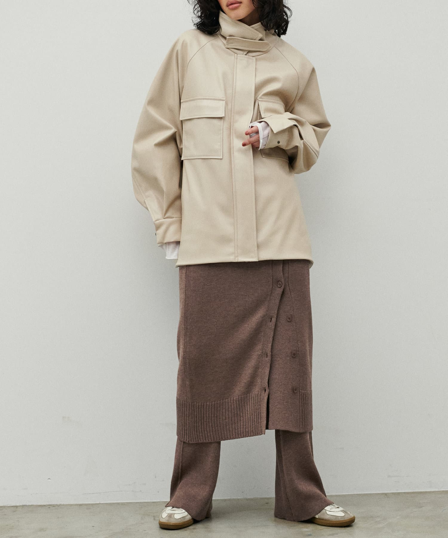 同素材のため、トレンド感のあるレイヤードコーデが
