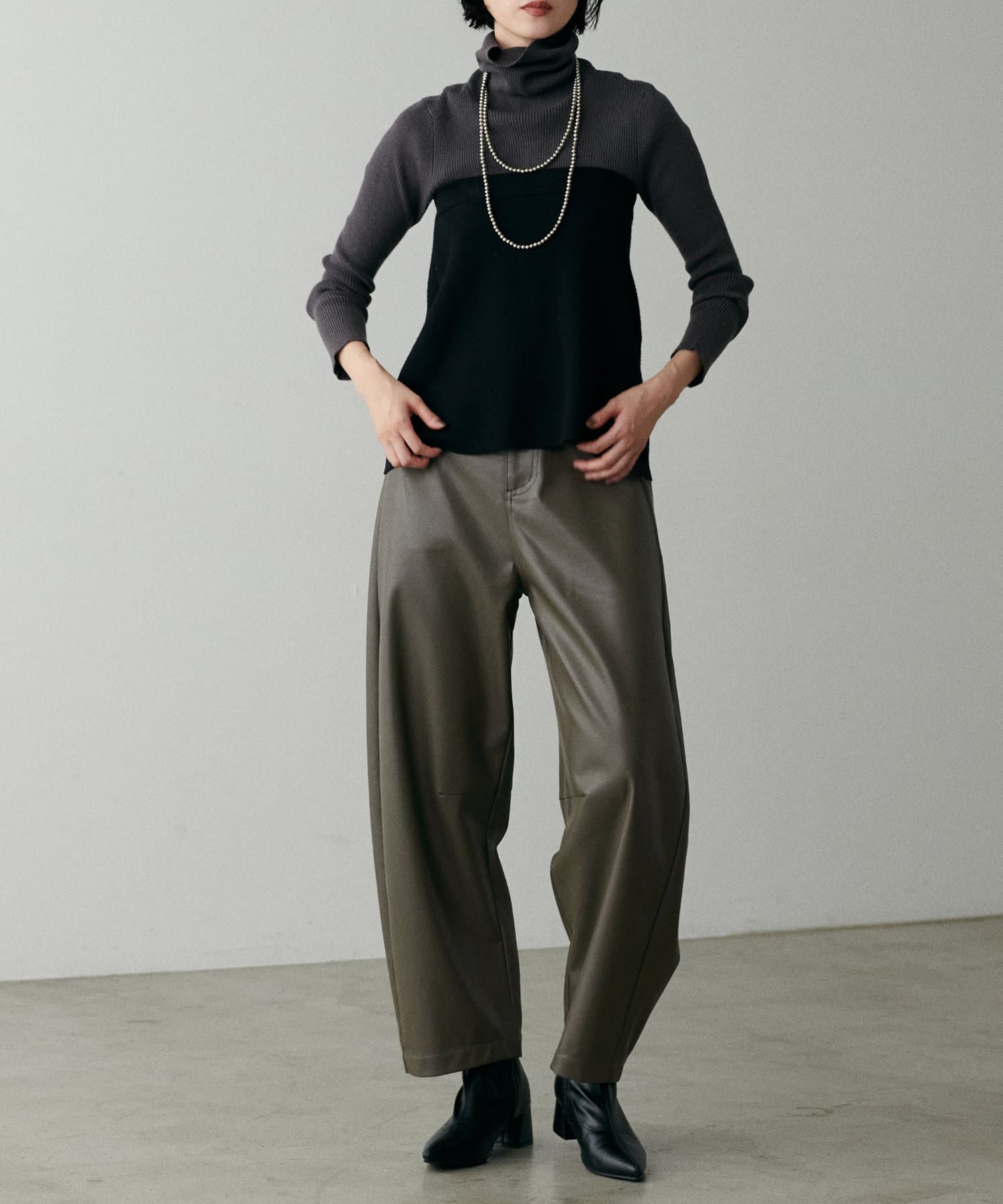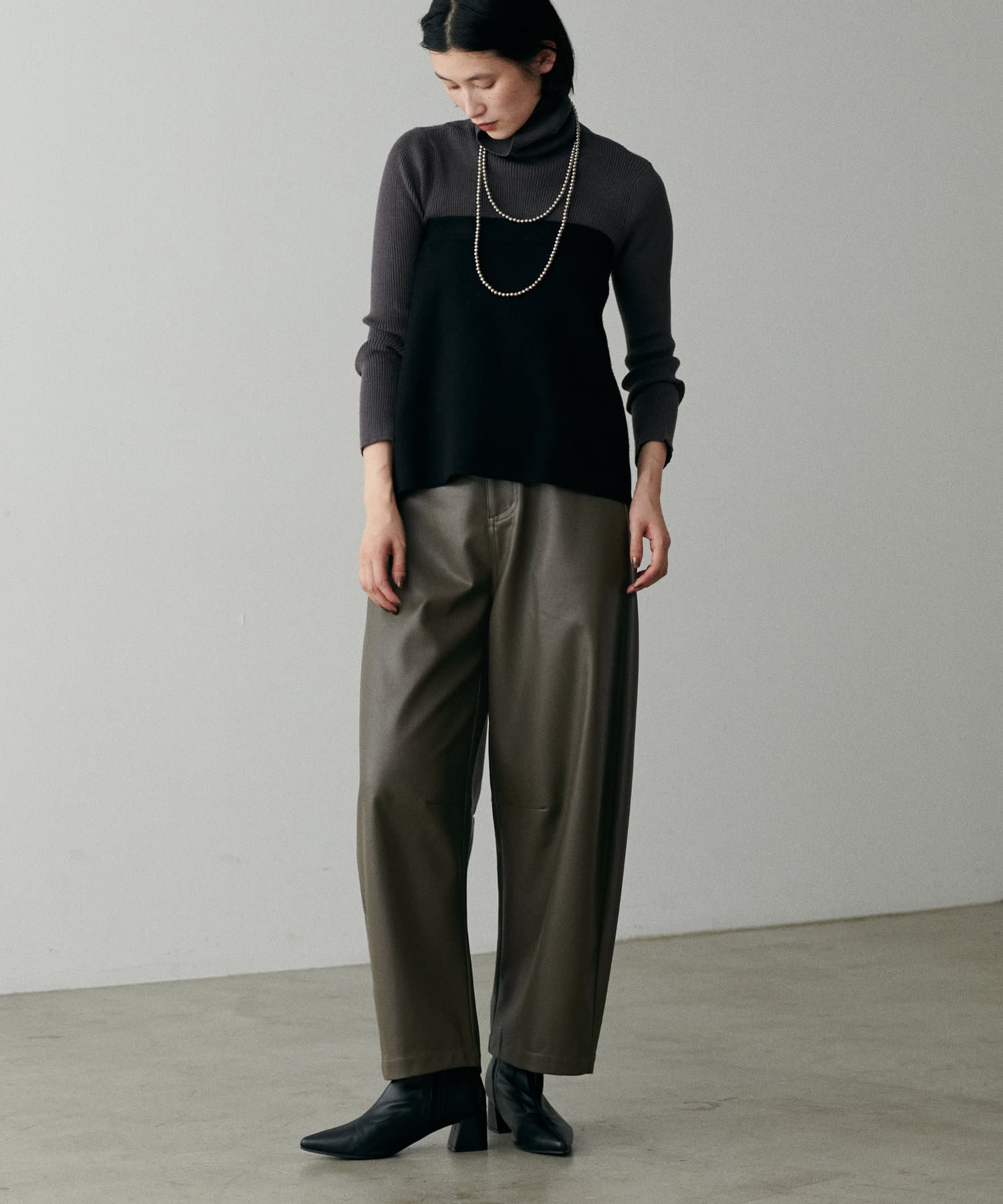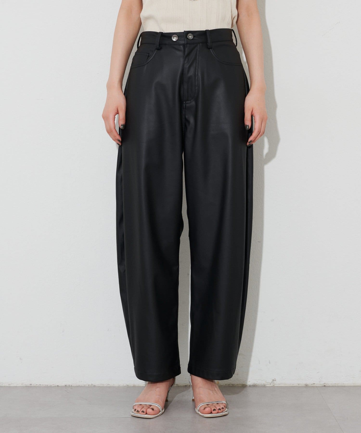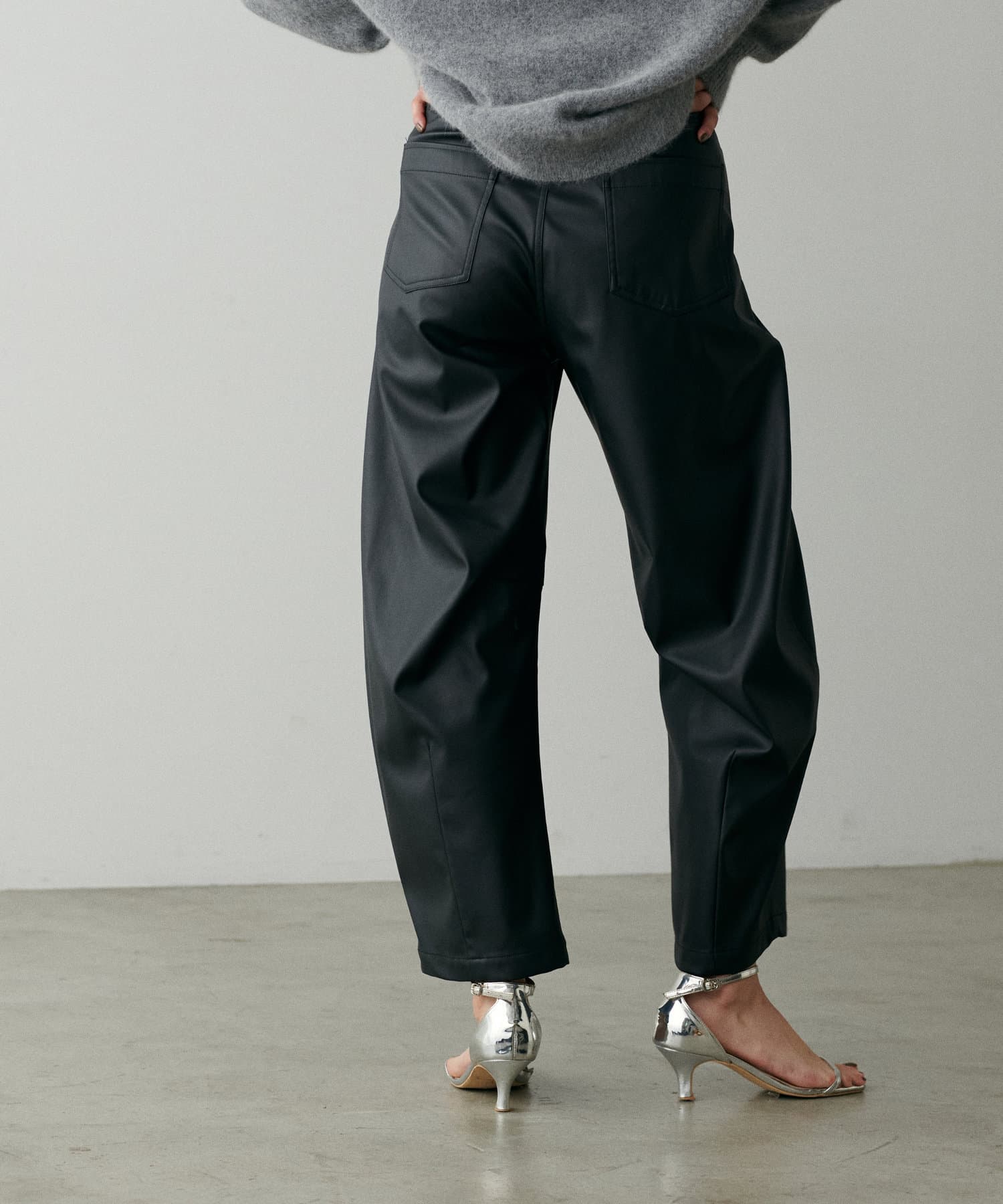 カーヴィーなシルエットによりフェイクレザーのハードさが軽減され、