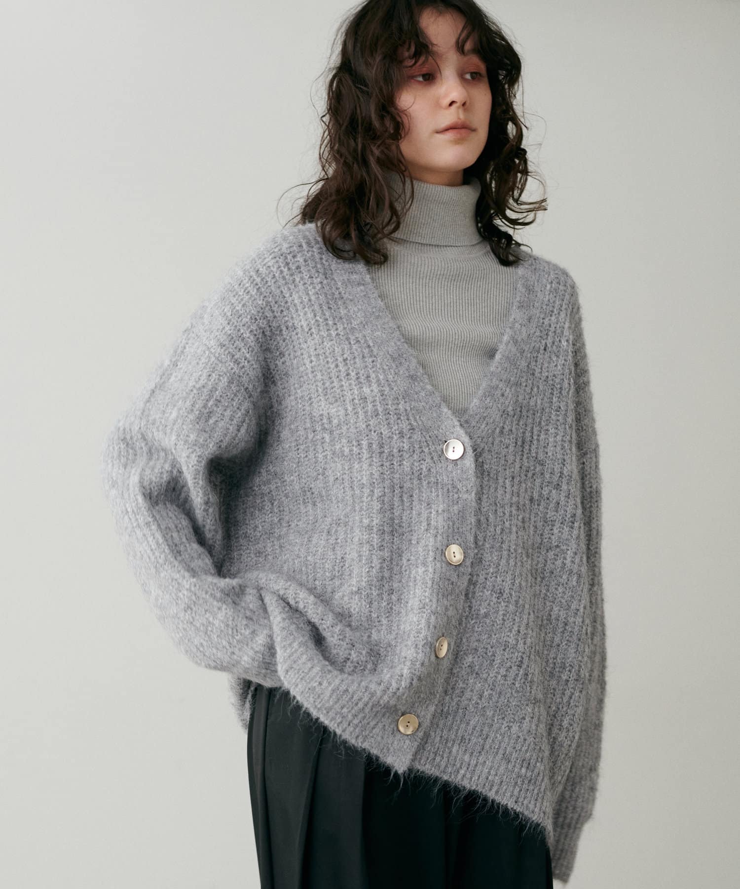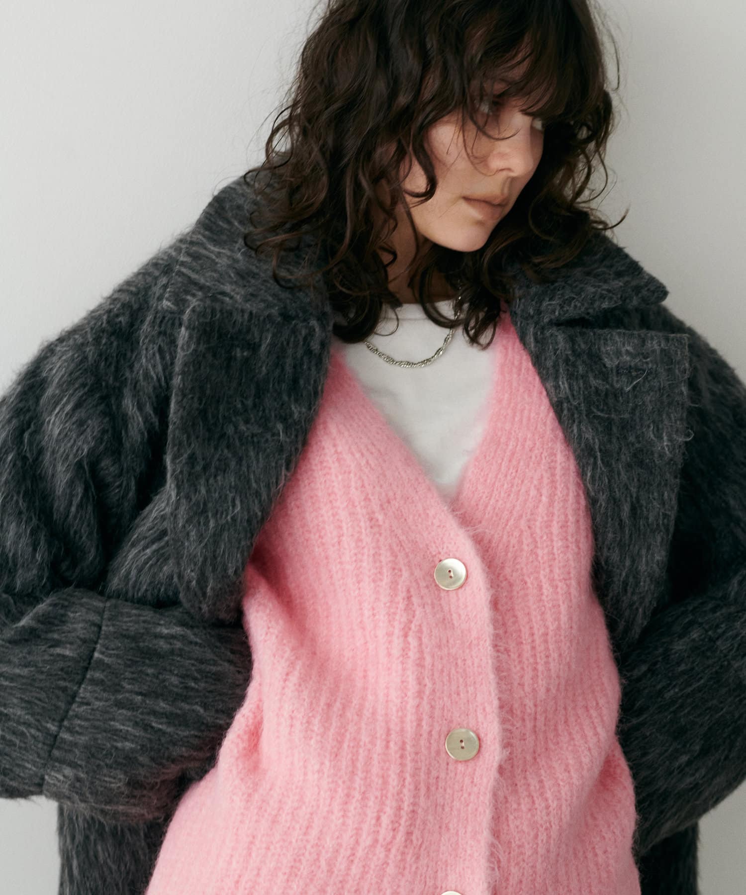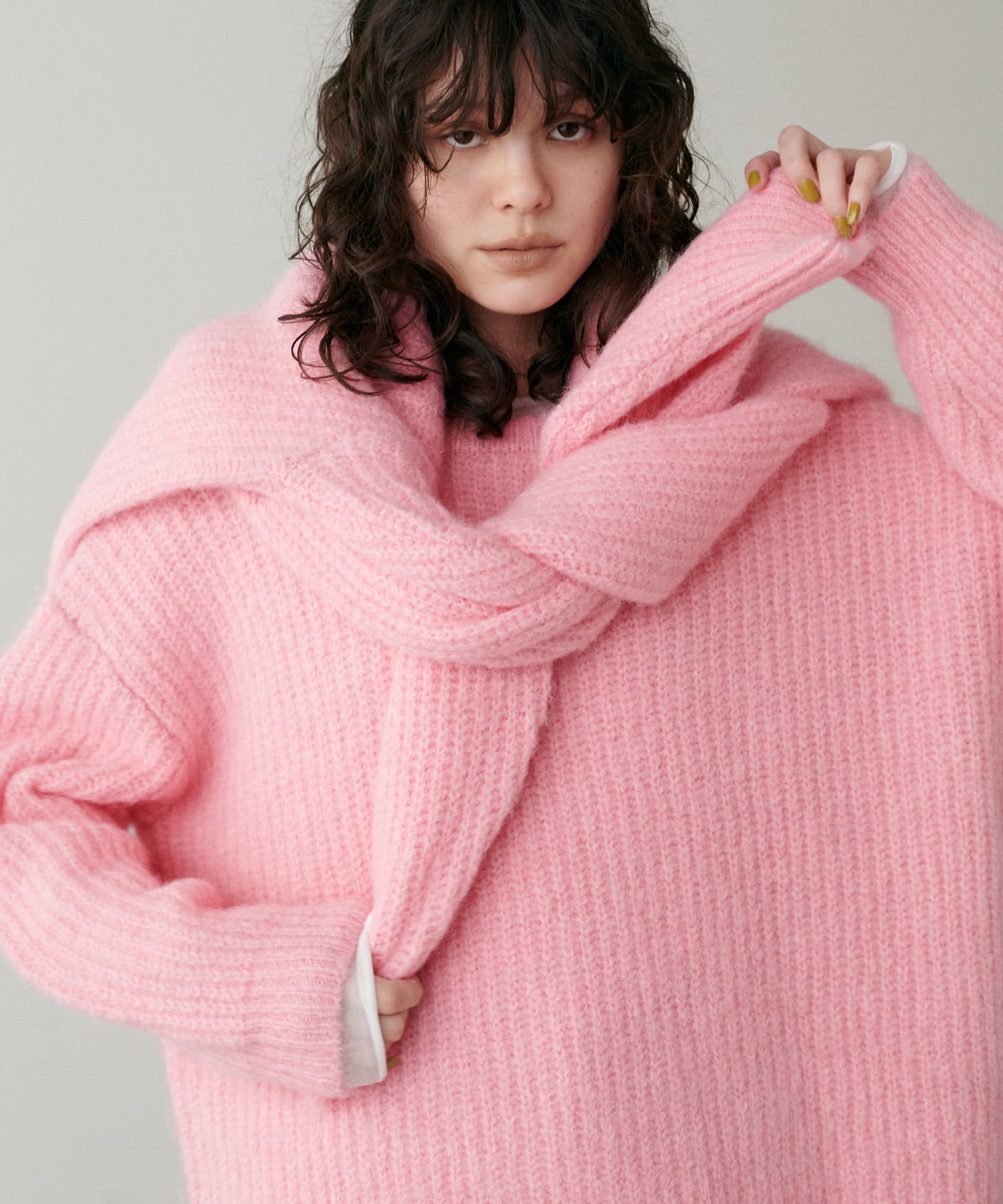 生地感:ふわふわでボリューミーなトレンドのシャギーニット素材。