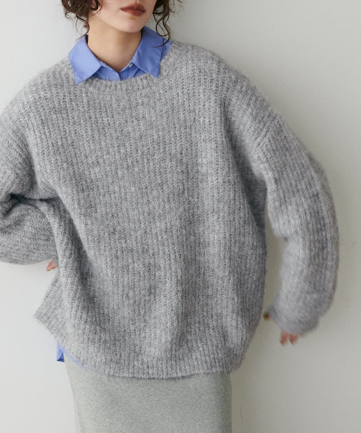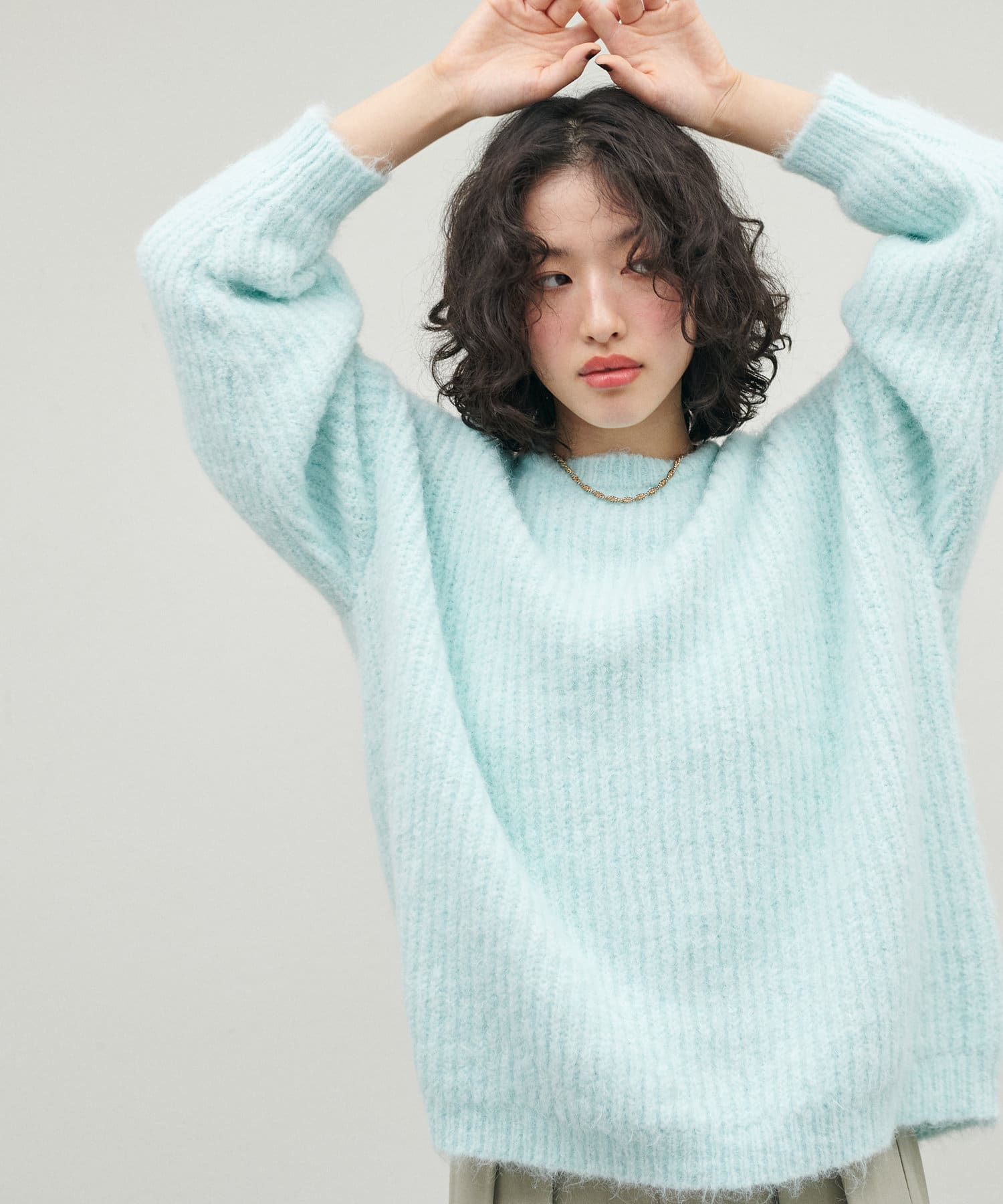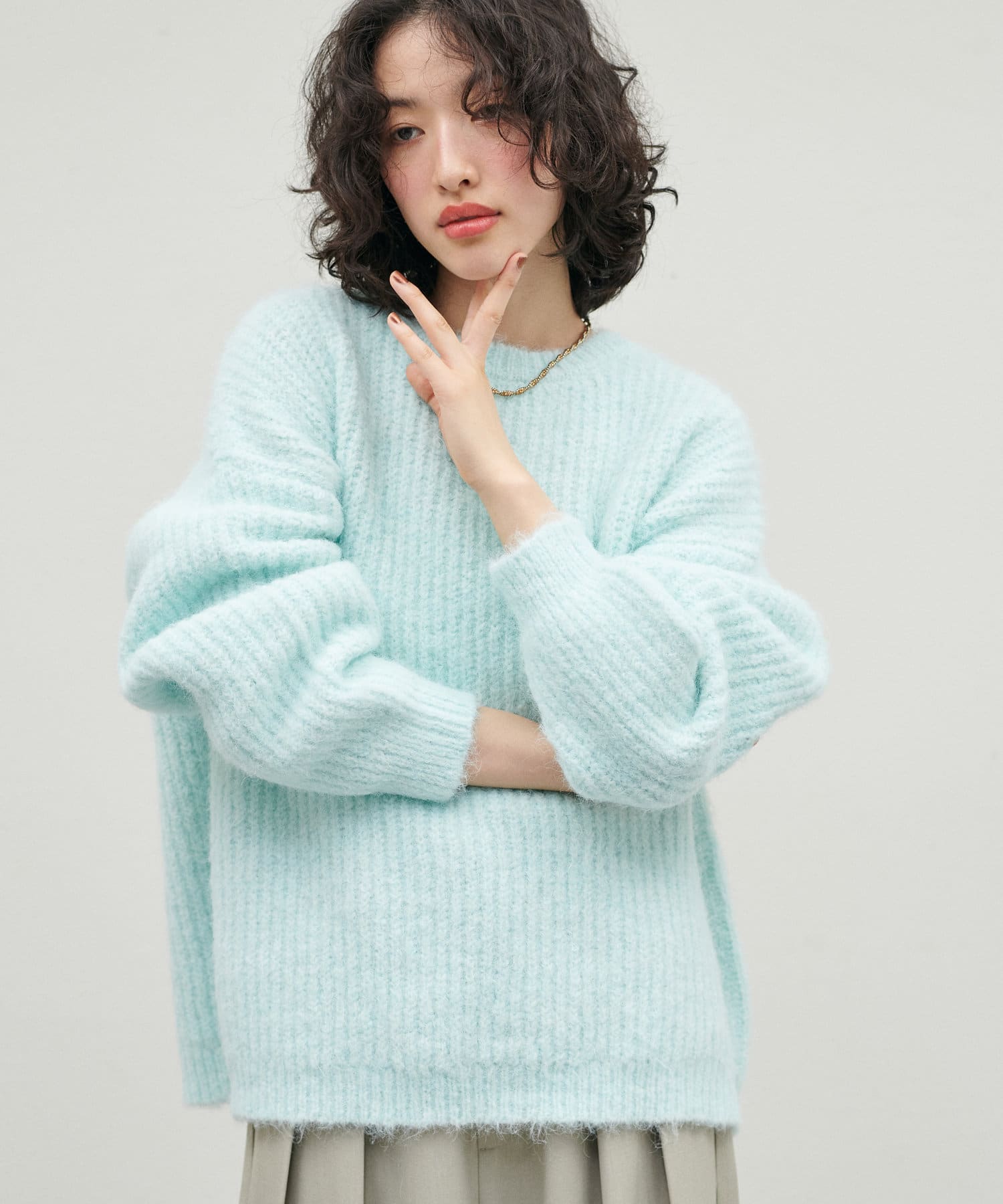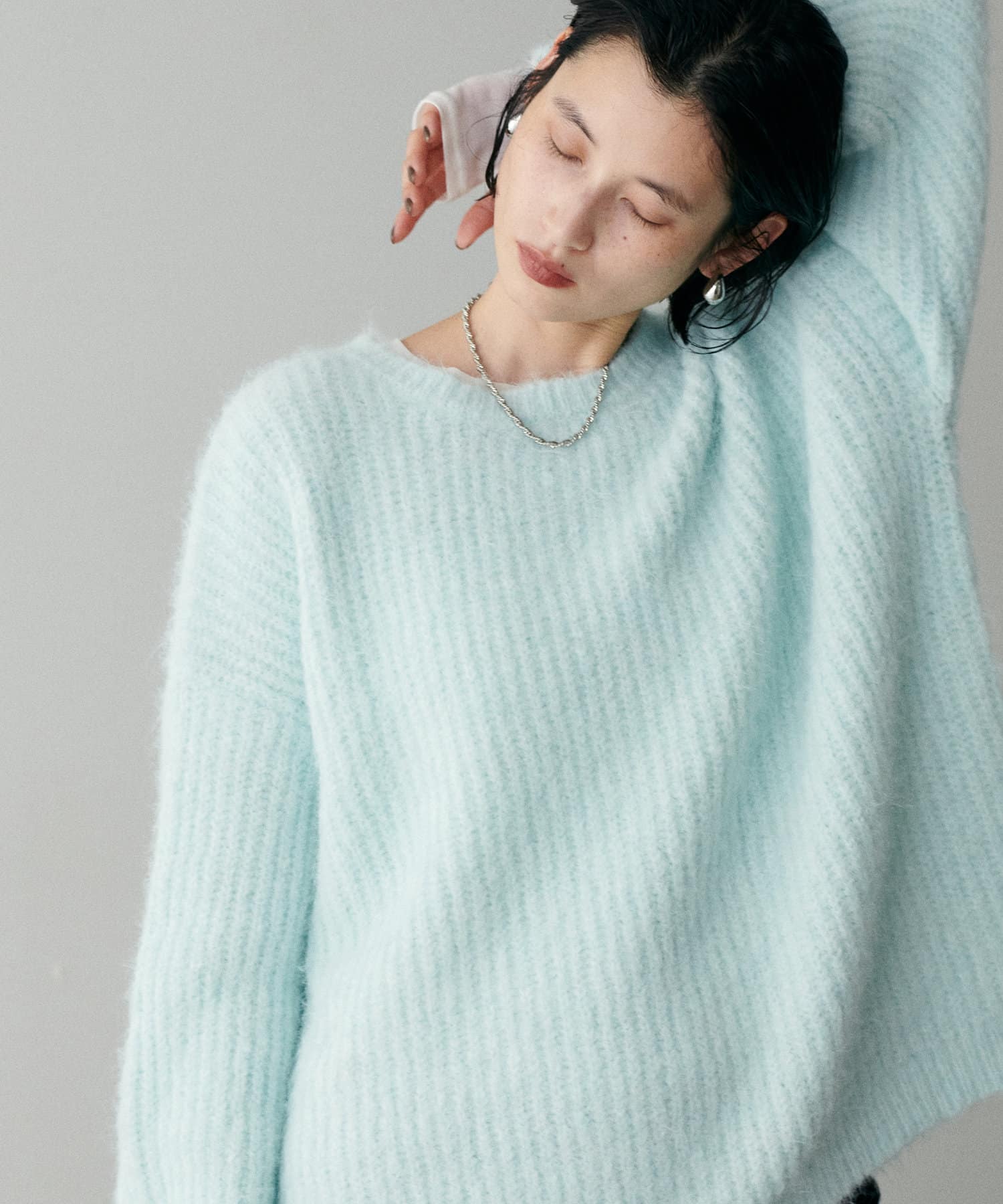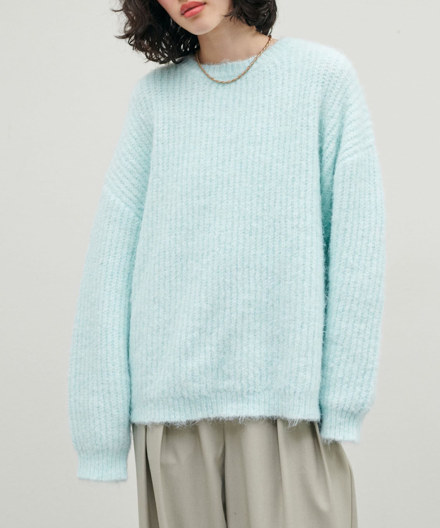 柔らかな質感のふわふわ毛足を楽しめるシャギー素材を使用したニット。