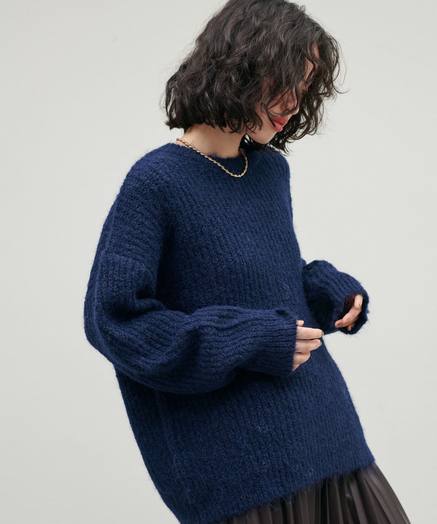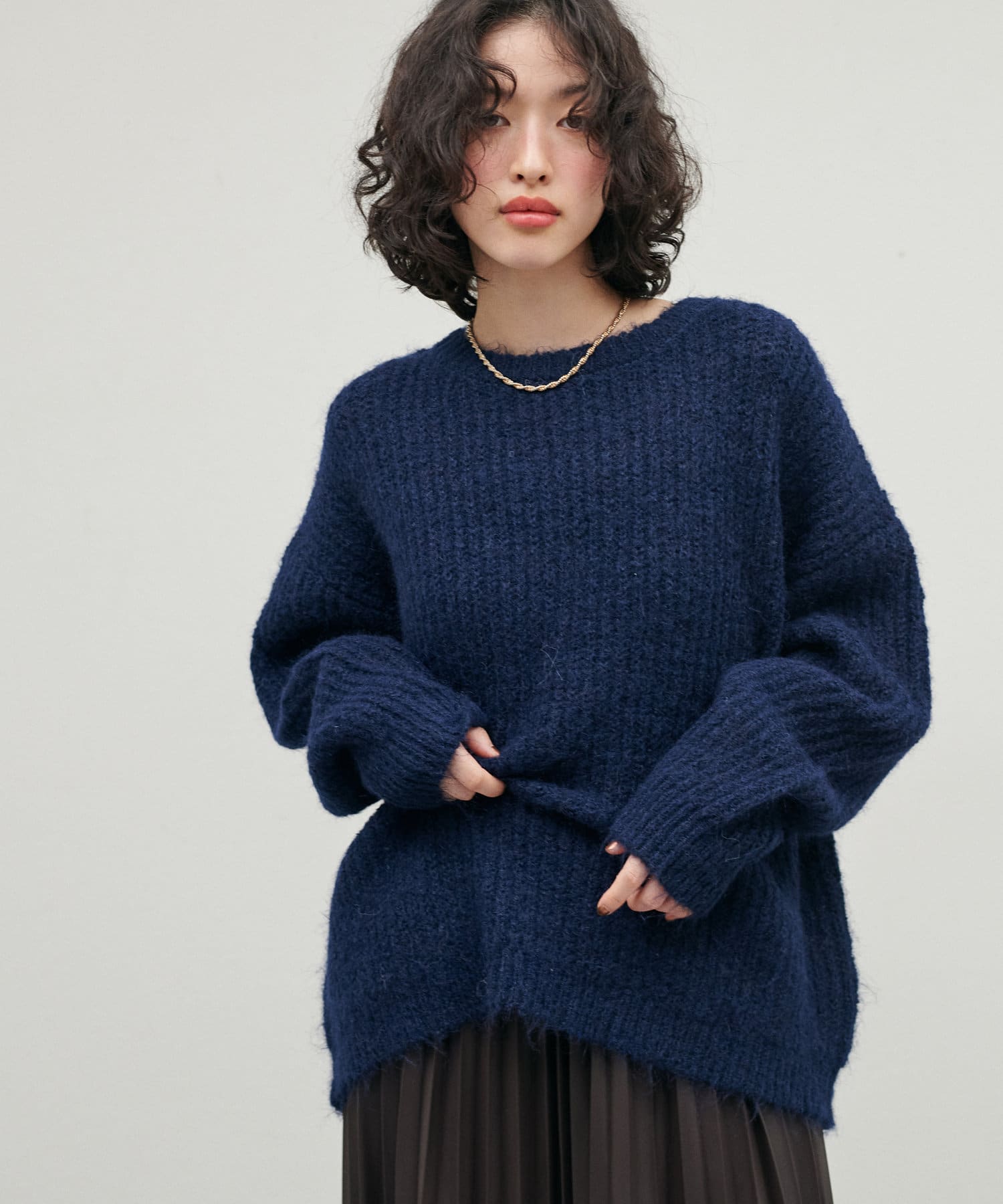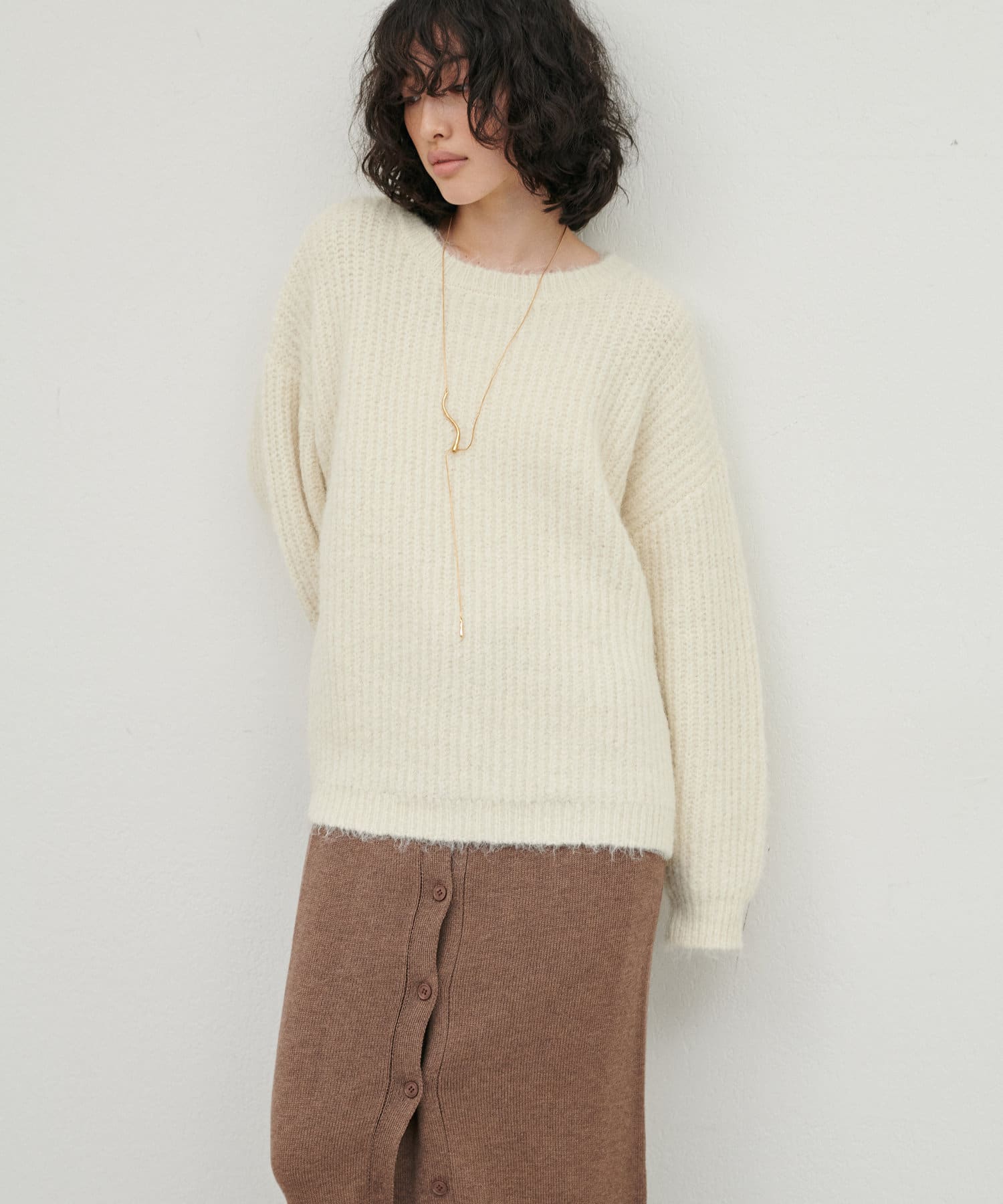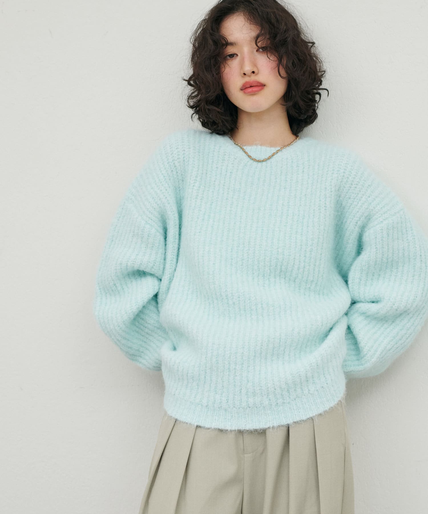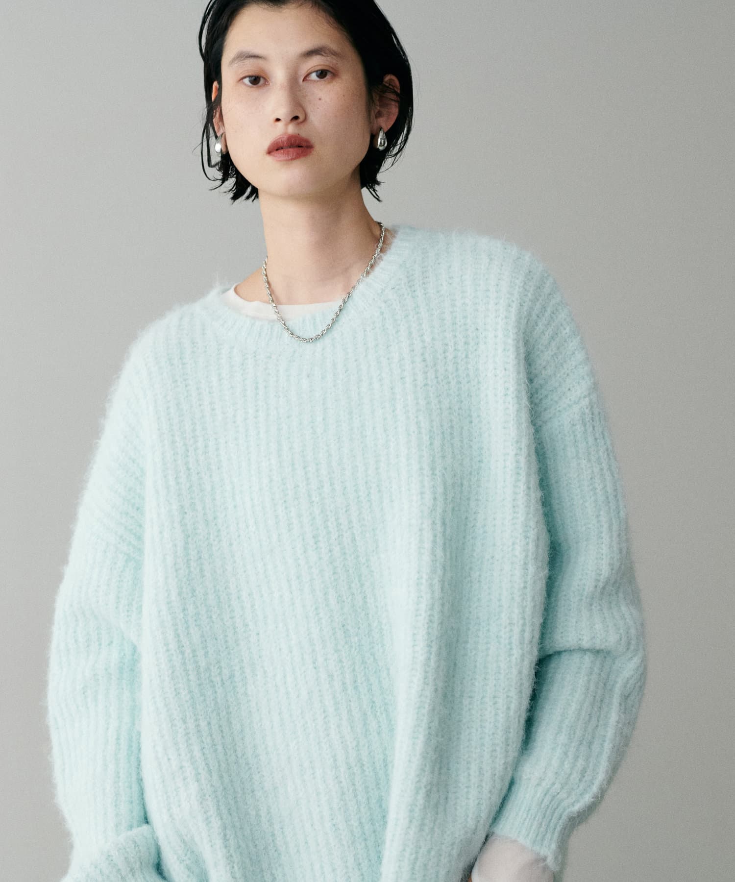 柔らかな質感のふわふわ毛足を楽しめるシャギー素材を使用したニット。