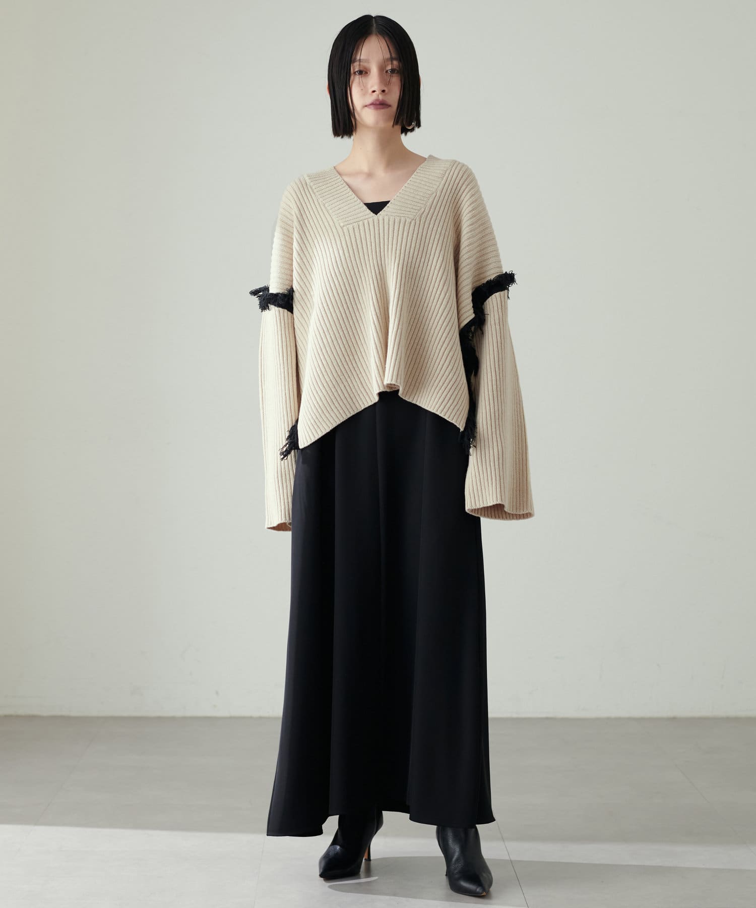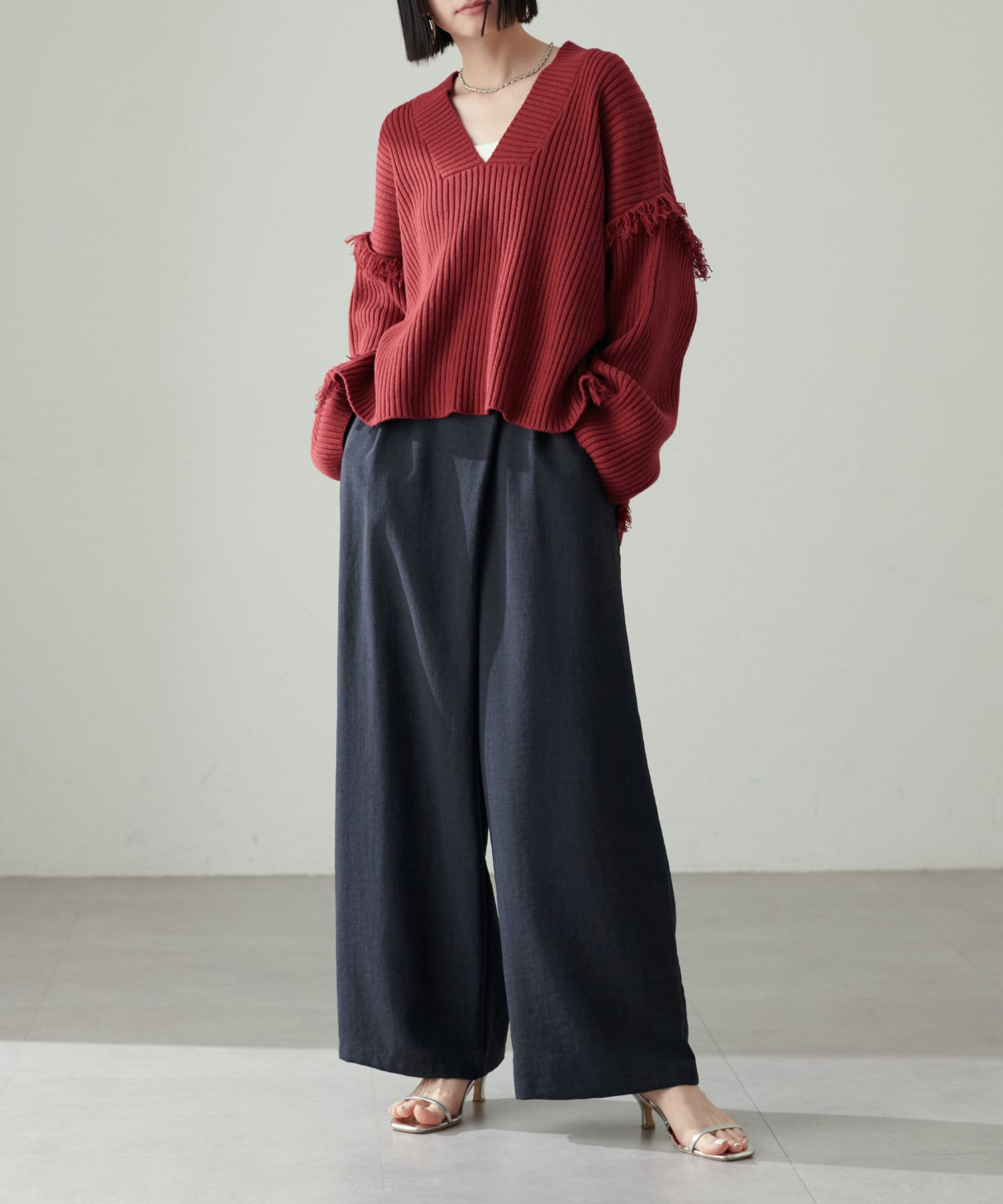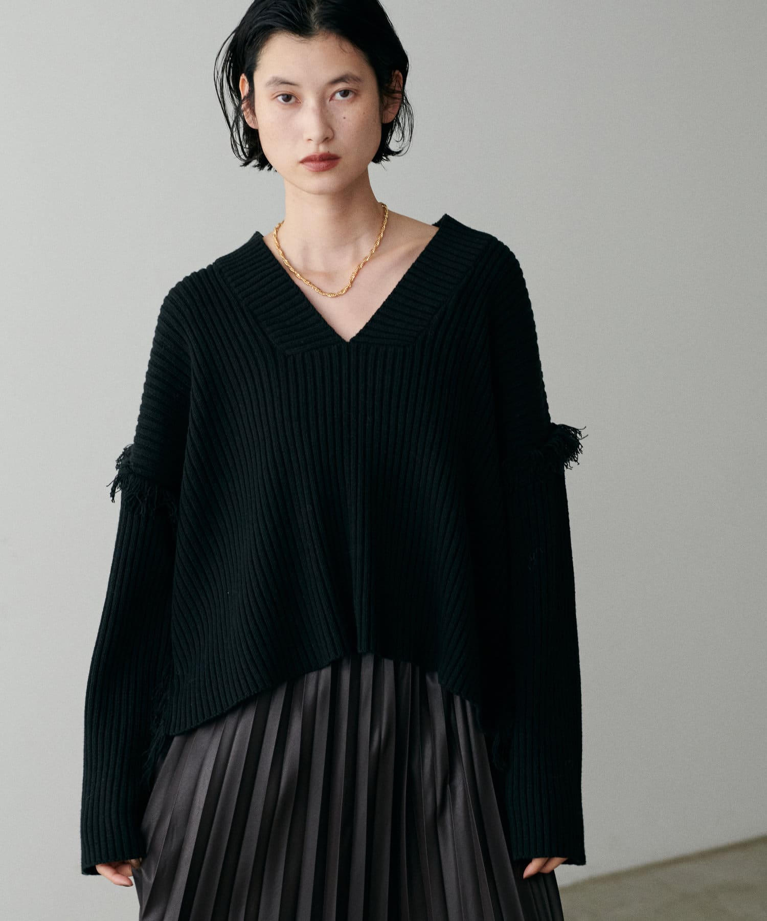 ざっくりと開いたVネックでヘルシーなデコルテに。
