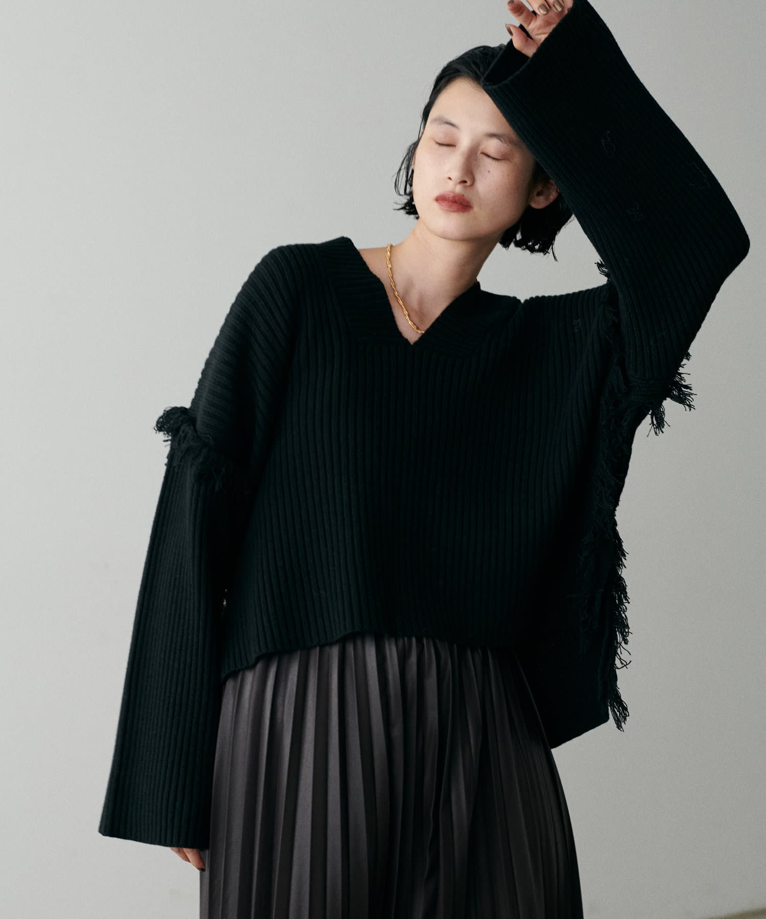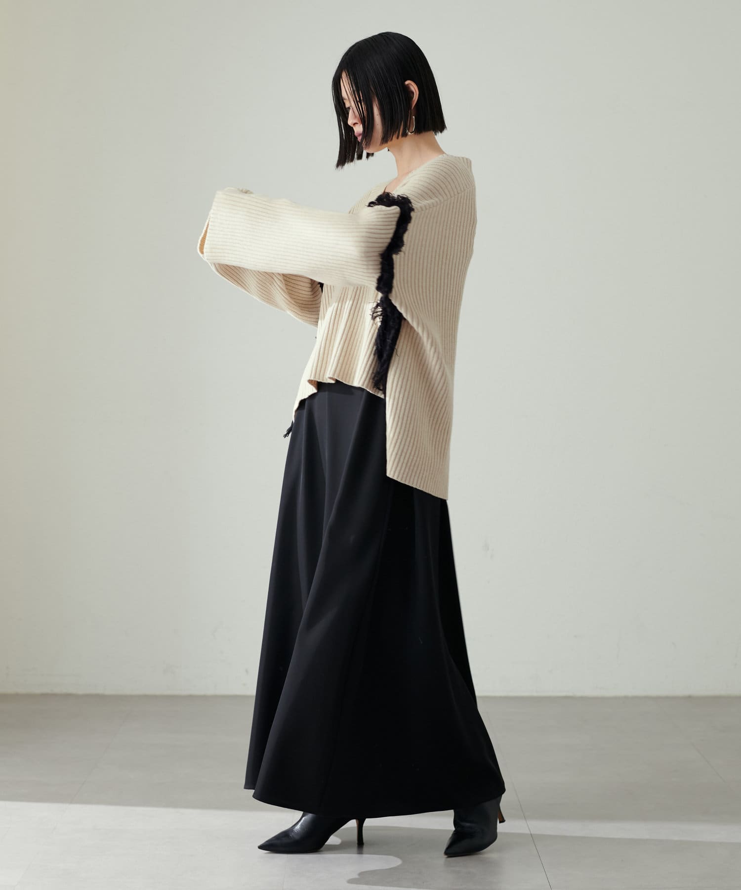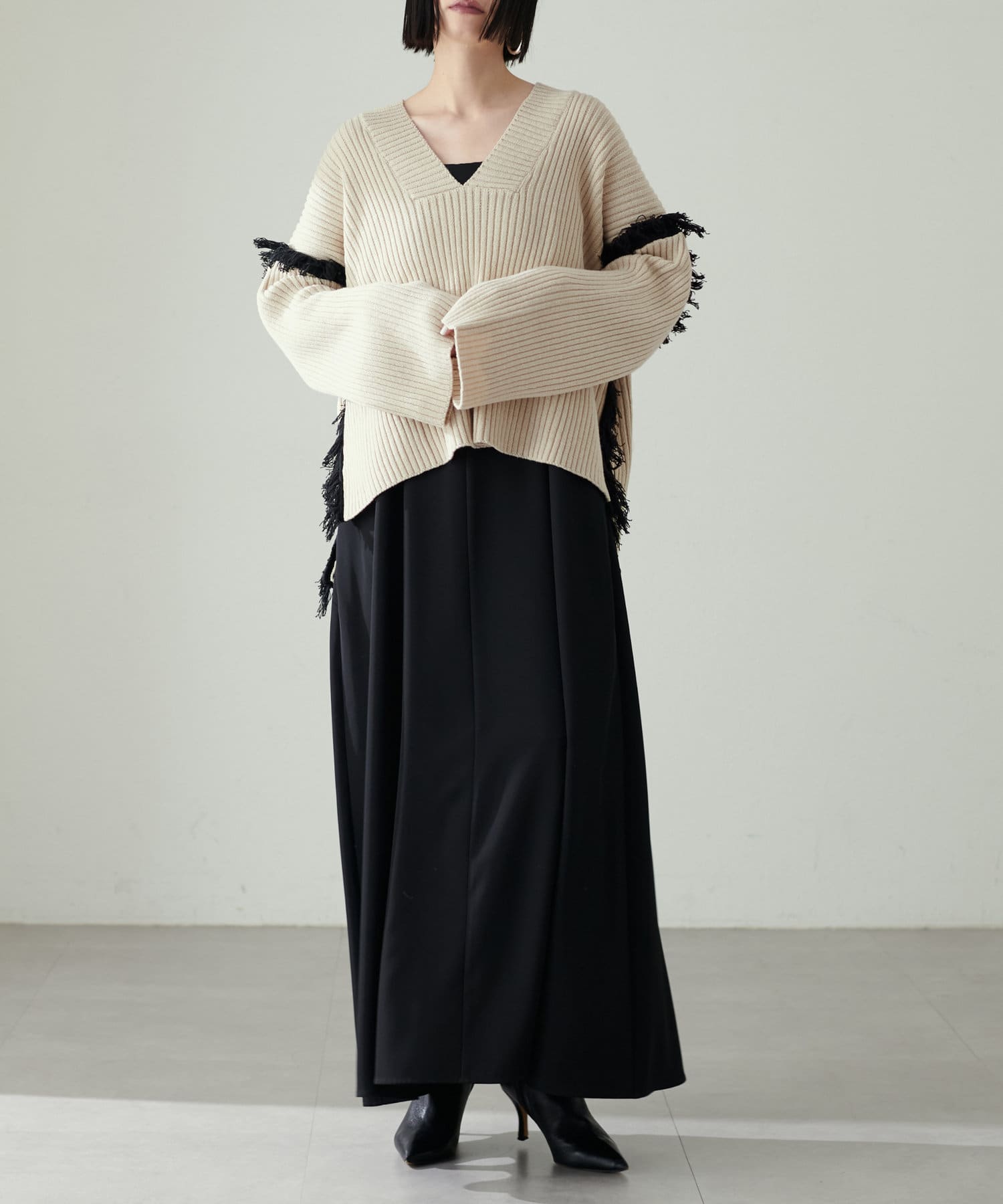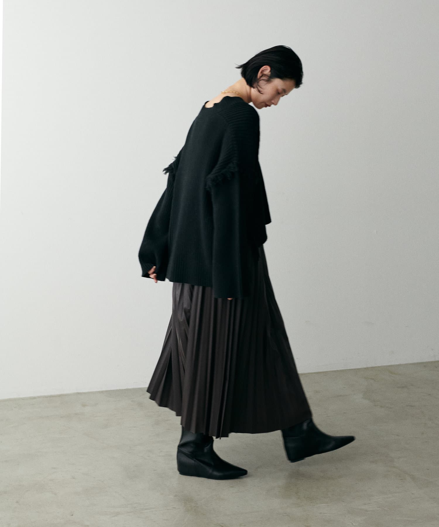 デニムやフェイクレザーのプリーツスカートと合わせて