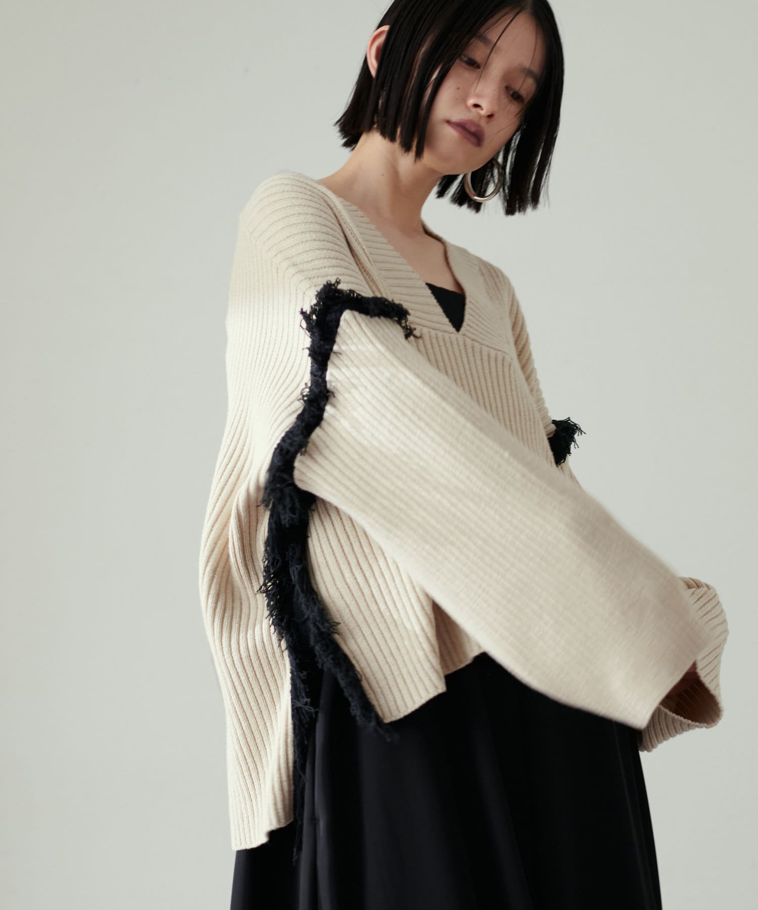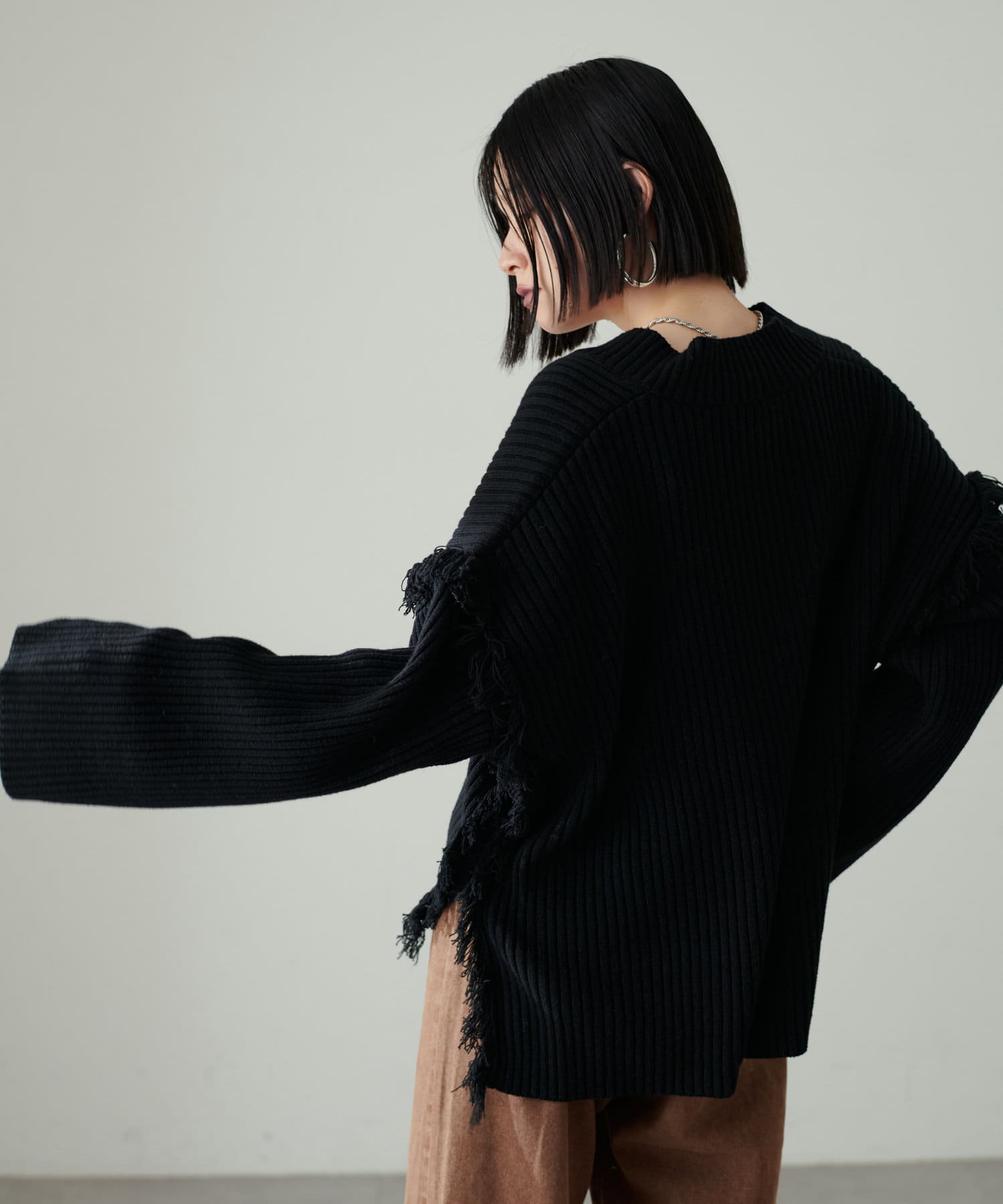 ルーズなサイジングがすっぽりと身体を包み込み、