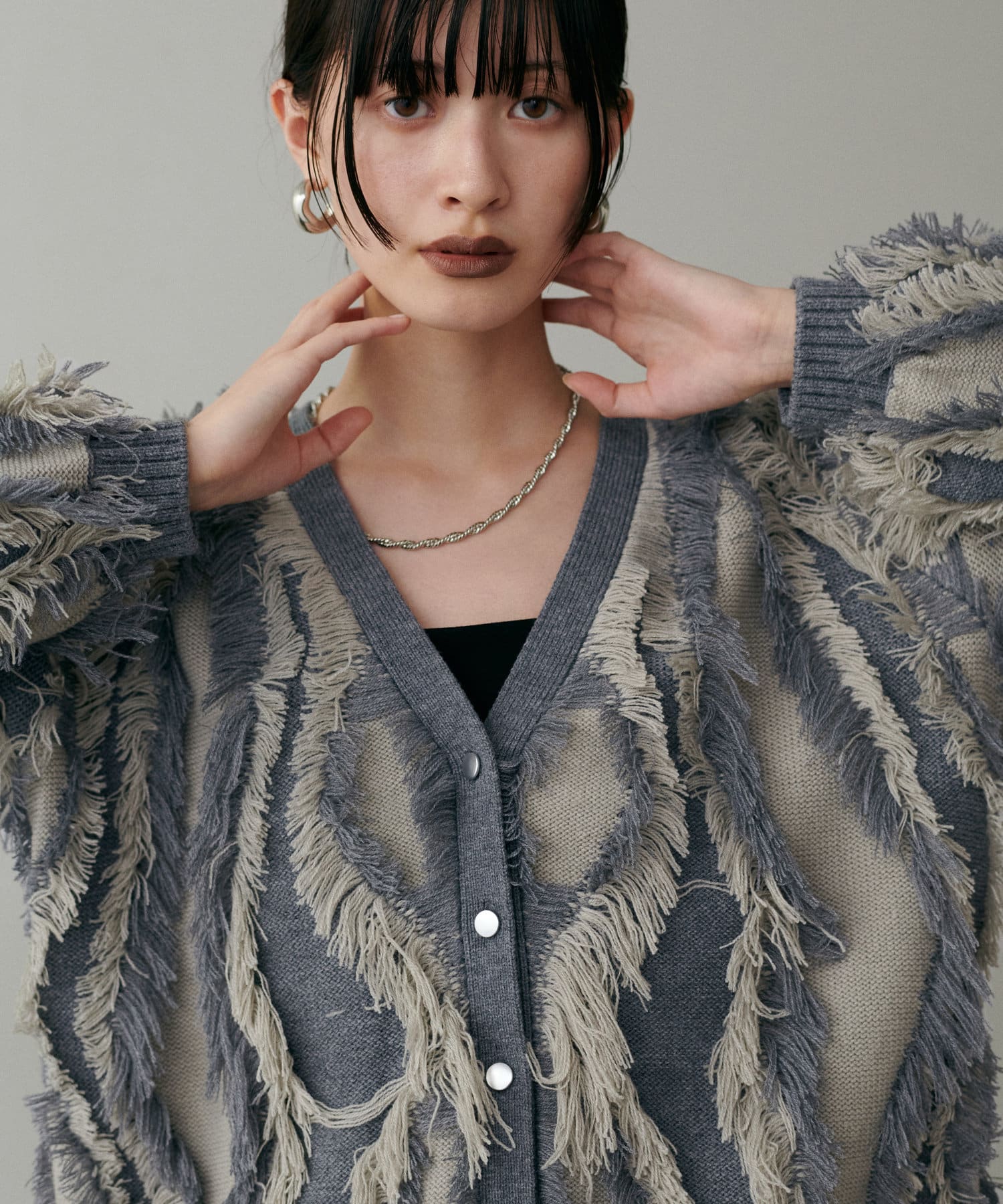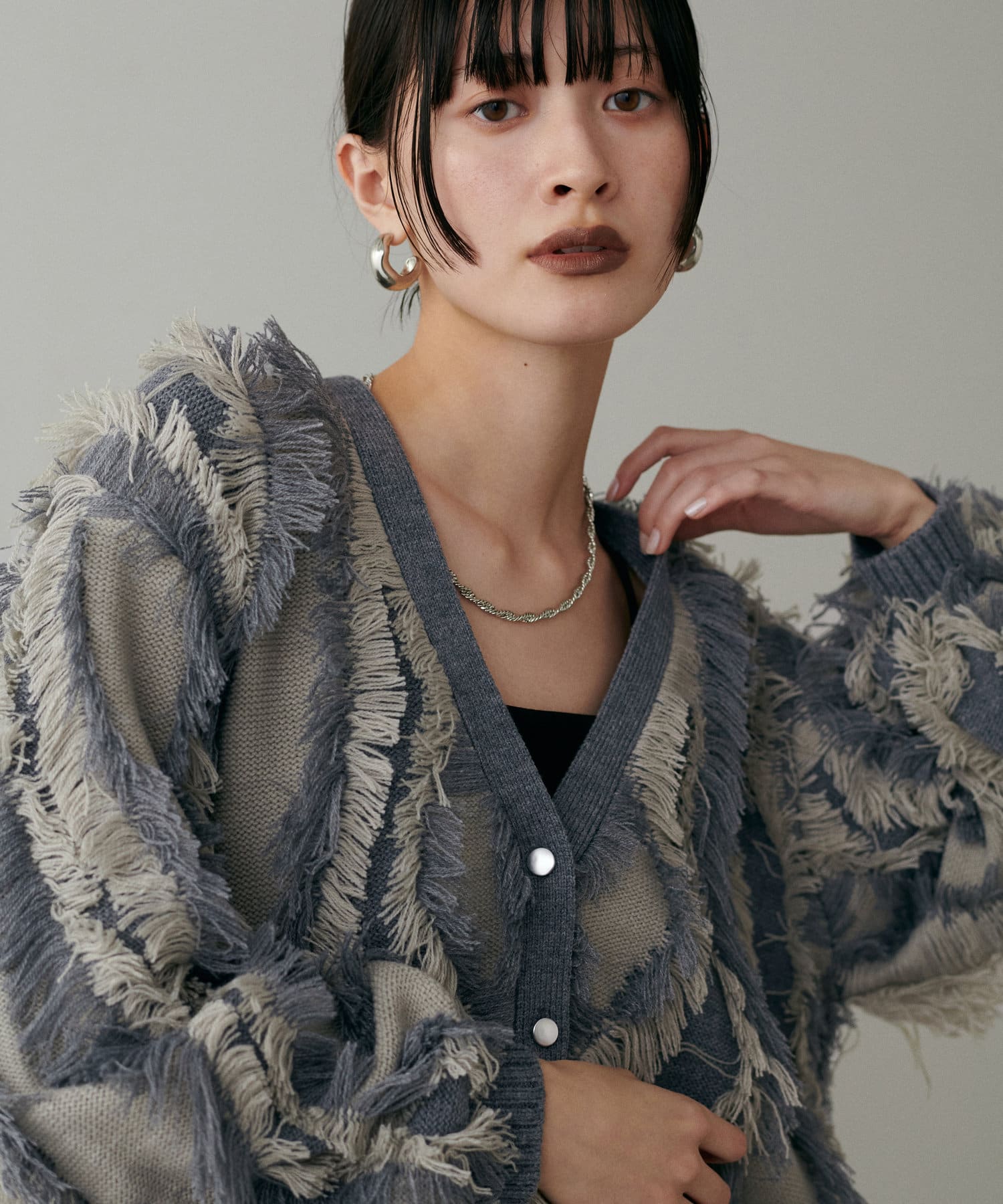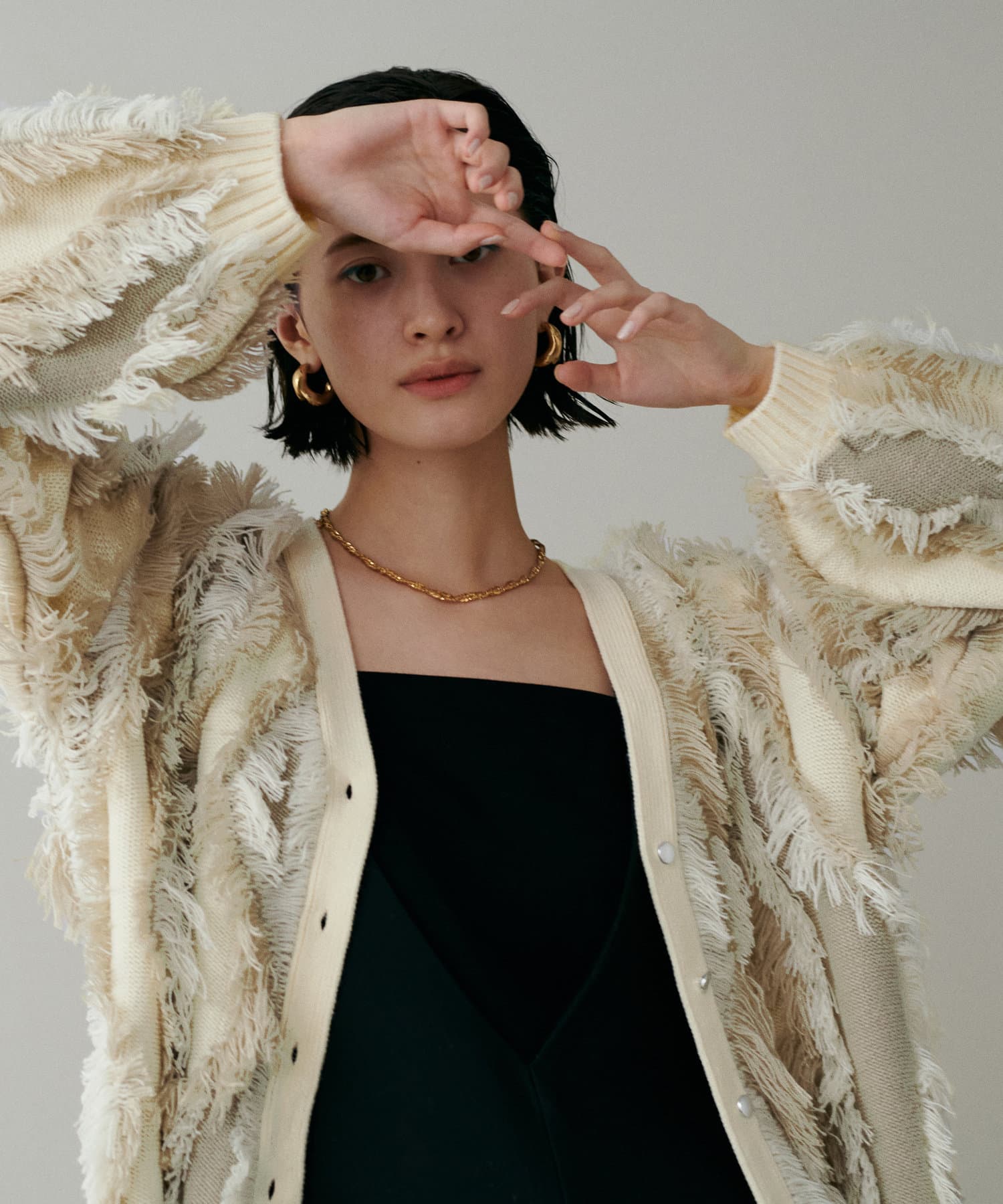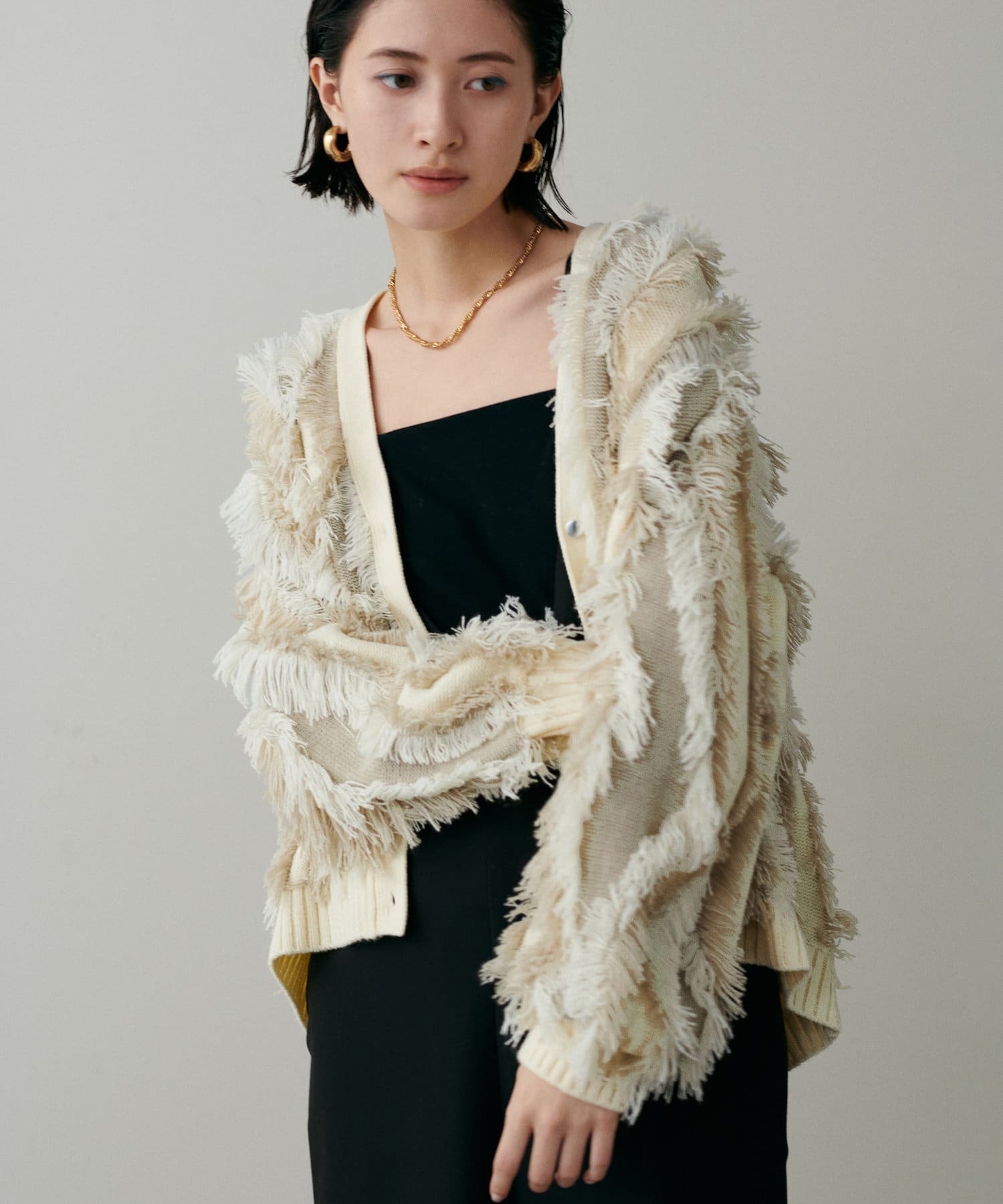 ゆったりとしたシルエットにデコルテをすっきりと見せてくれるVネックのカーデ。