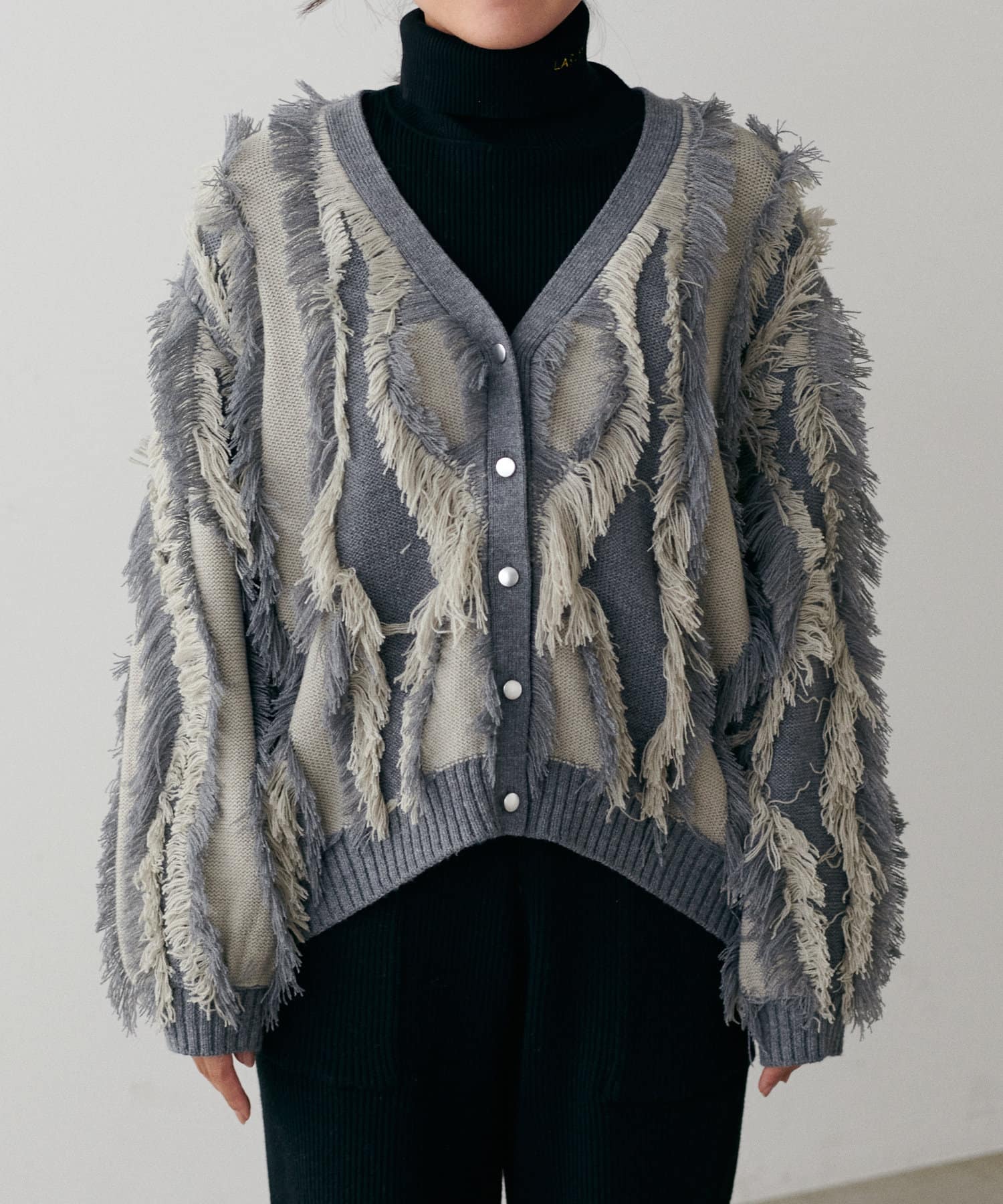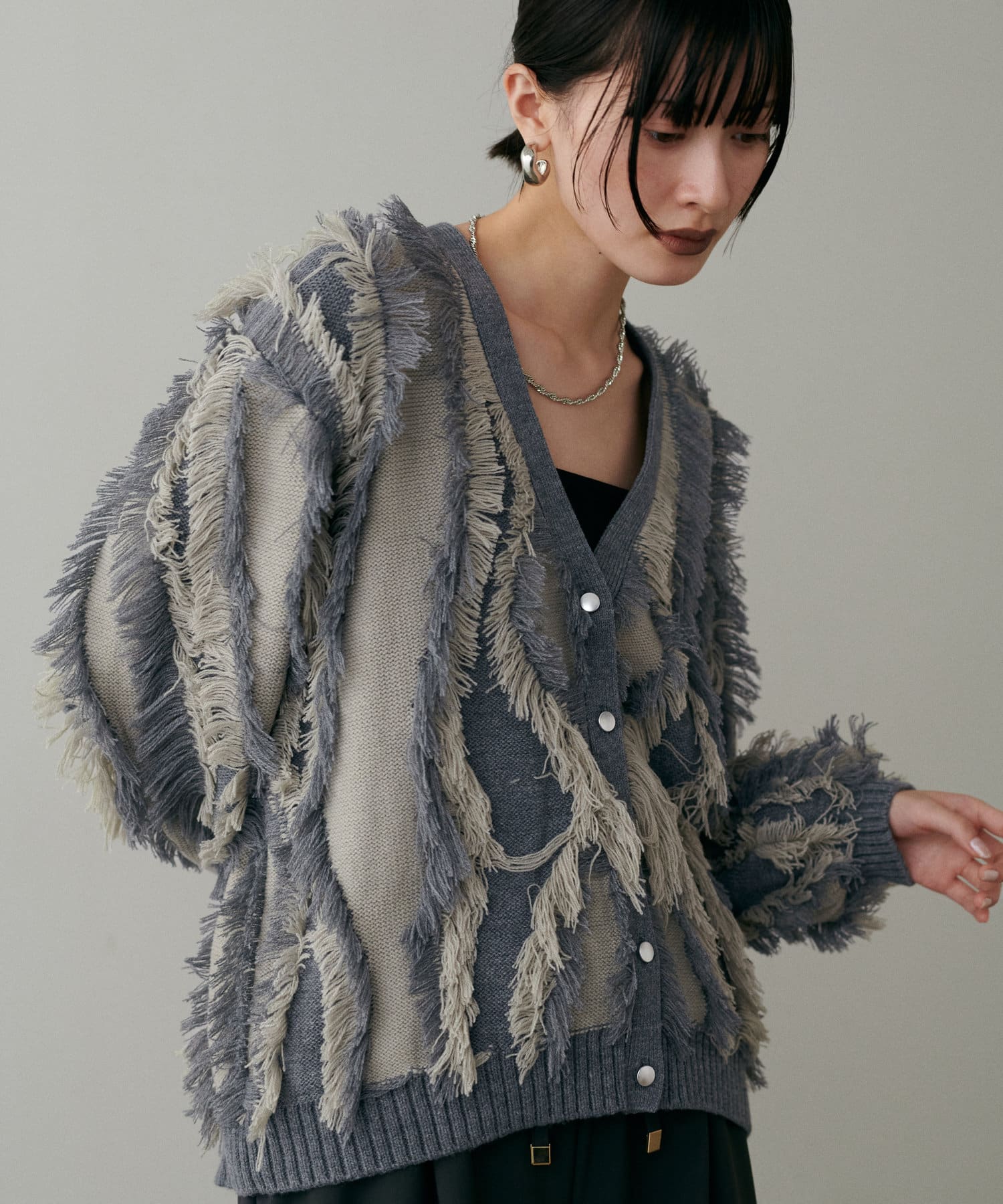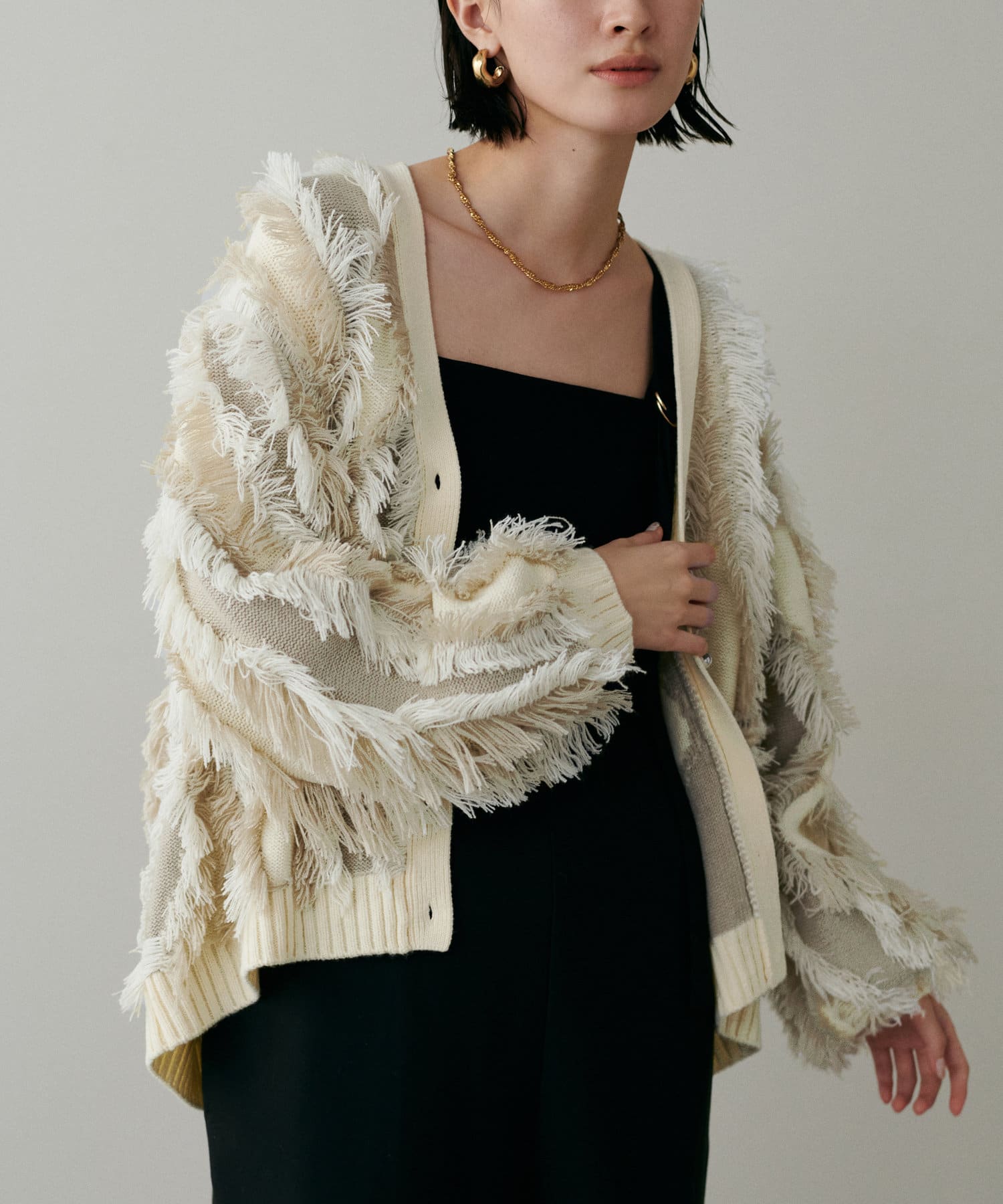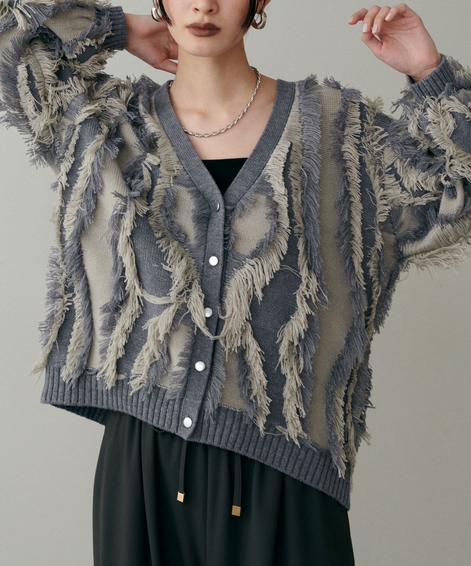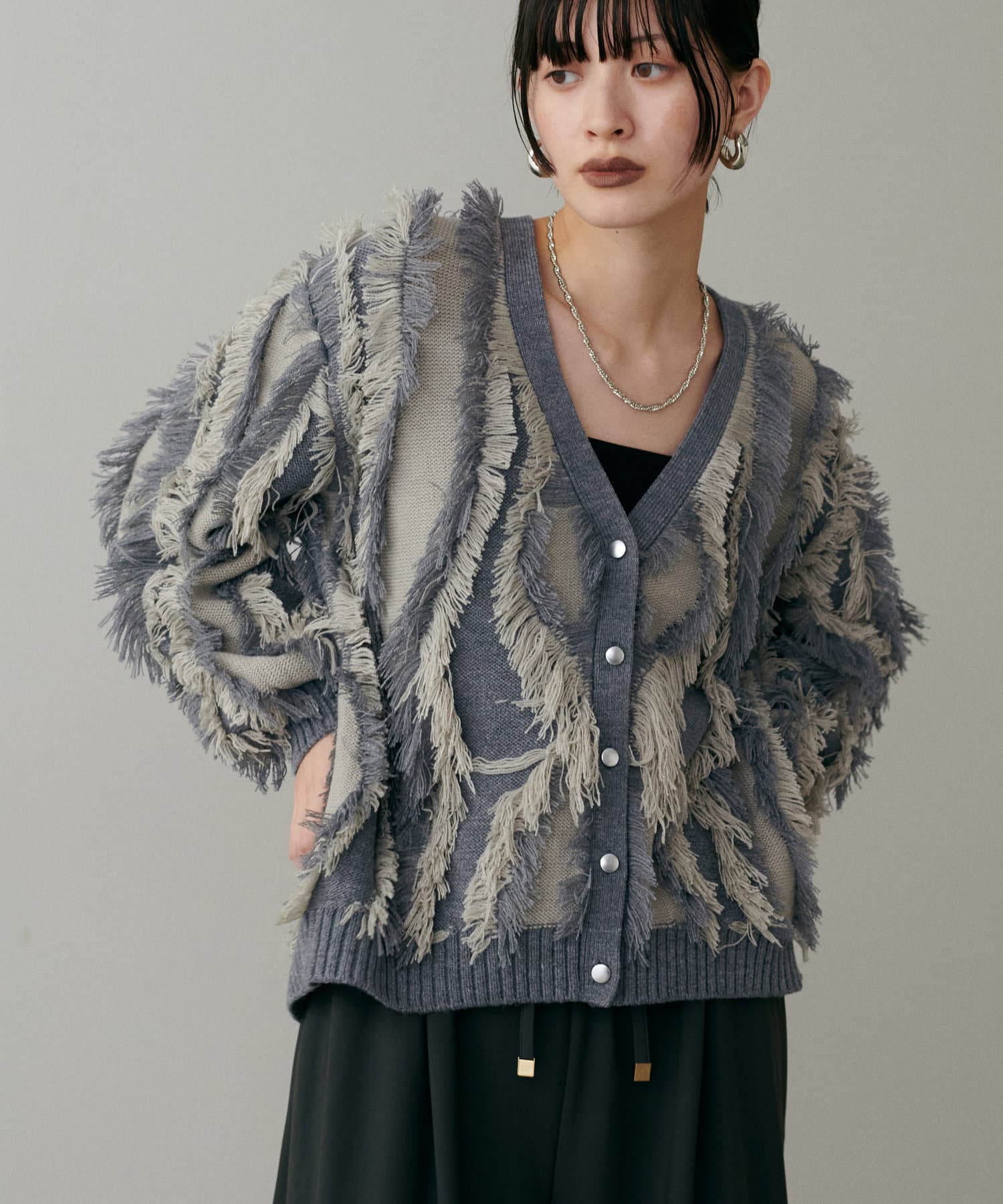 ゆったりとしたシルエットにデコルテをすっきりと見せてくれるVネックのカーデ。