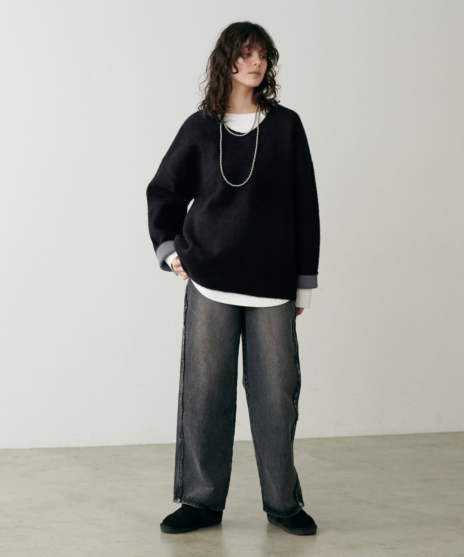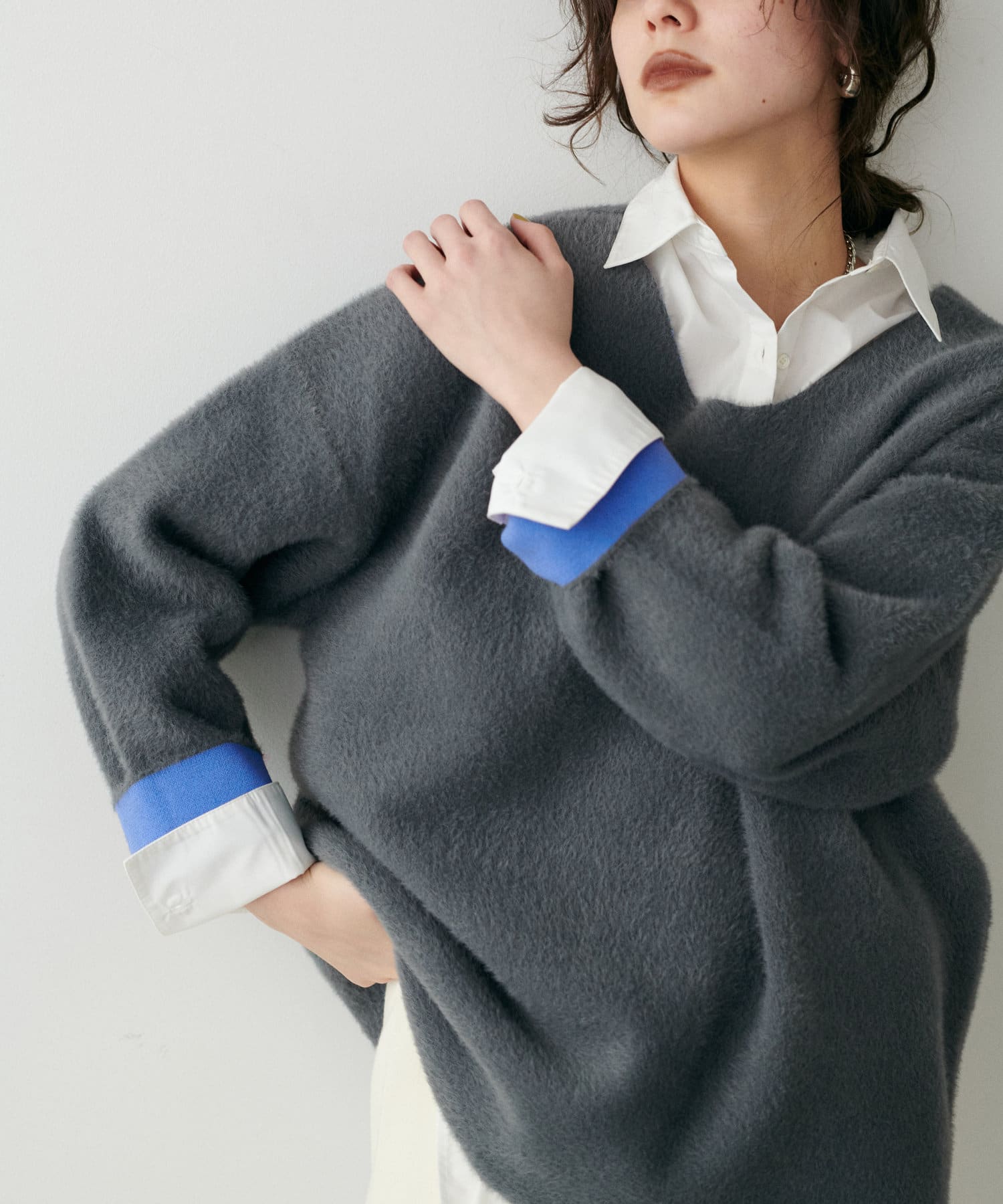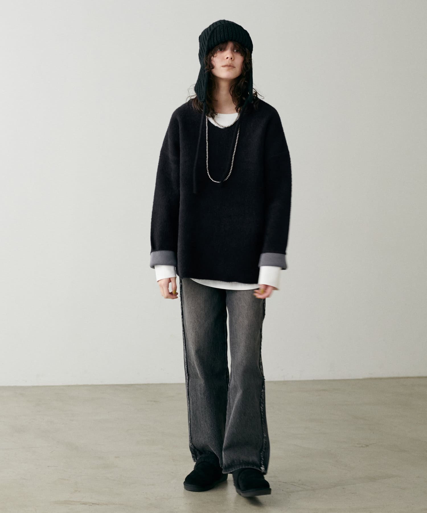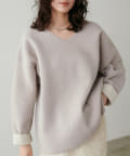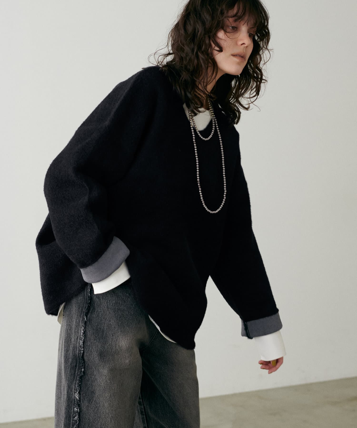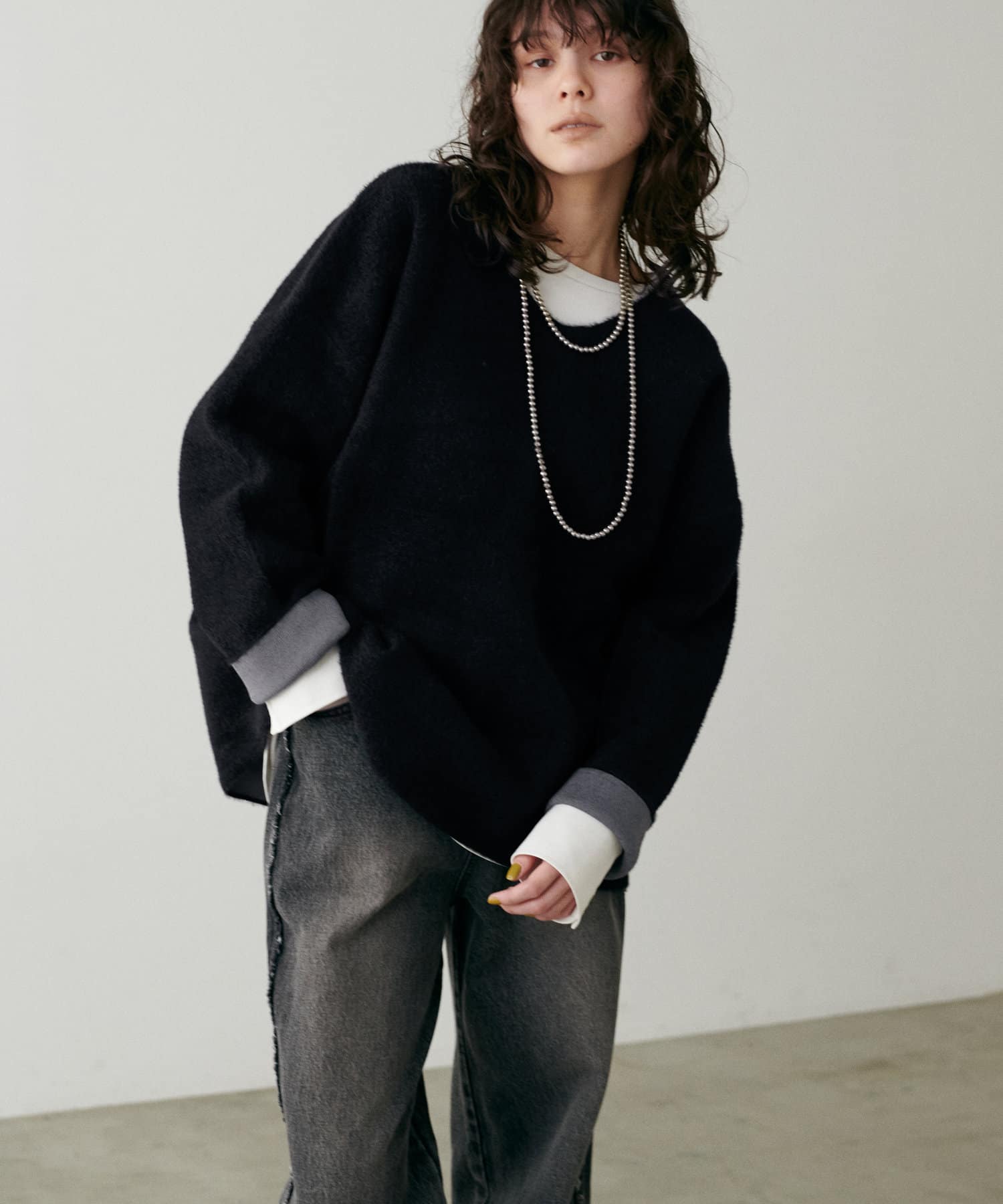 襟ぐりが広めなので、シャツやタートルネックをインしても。