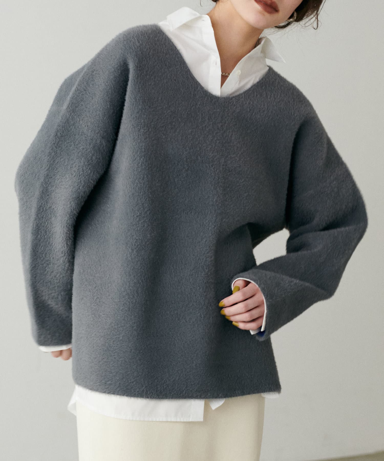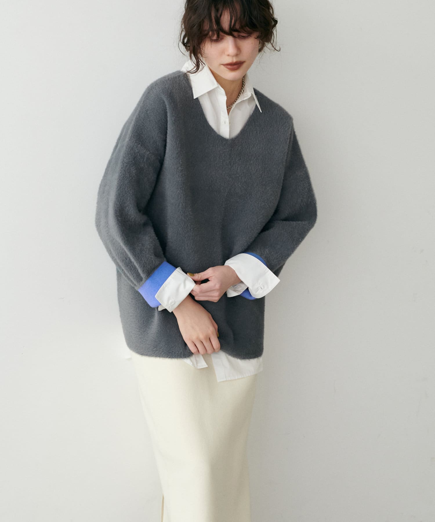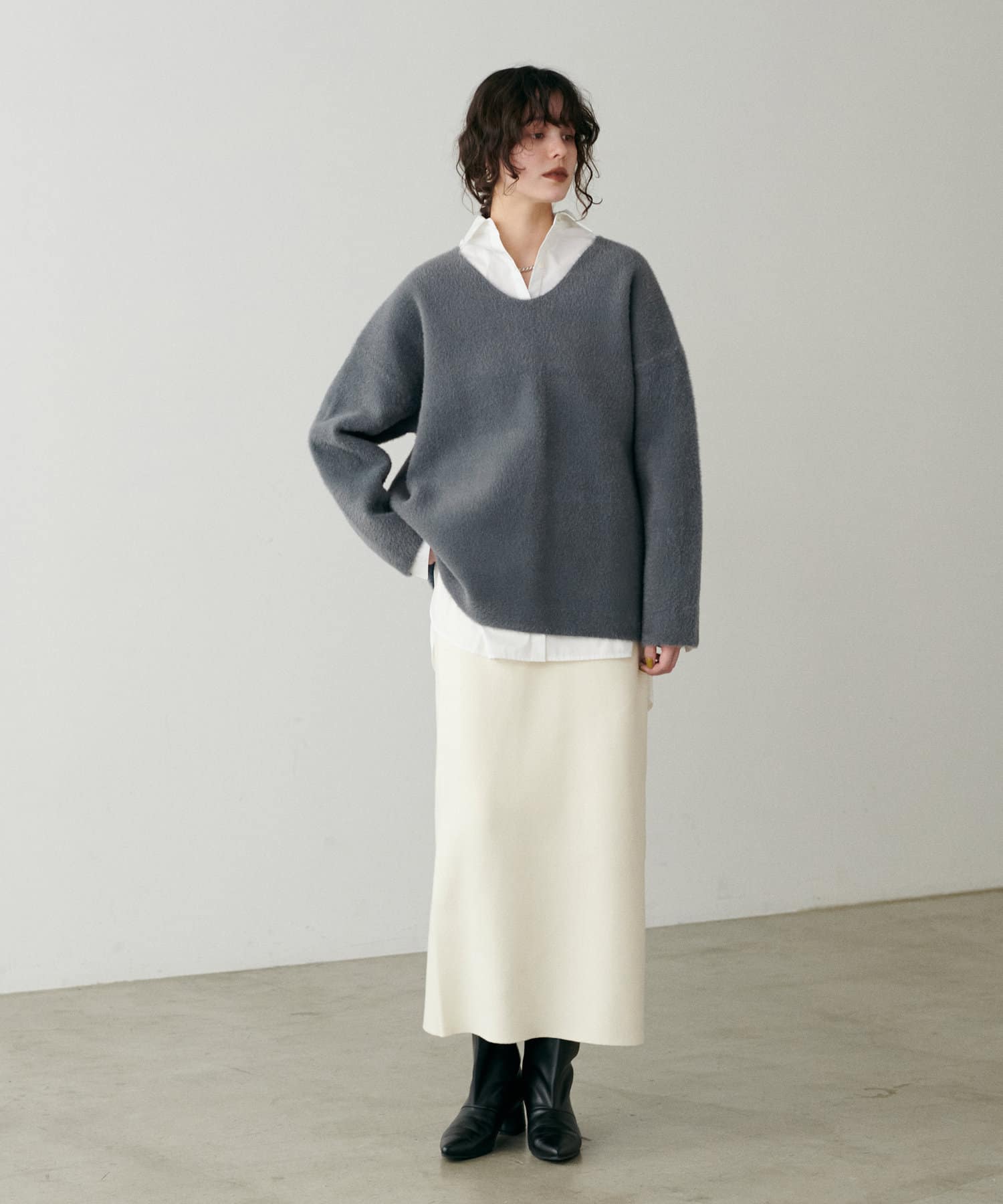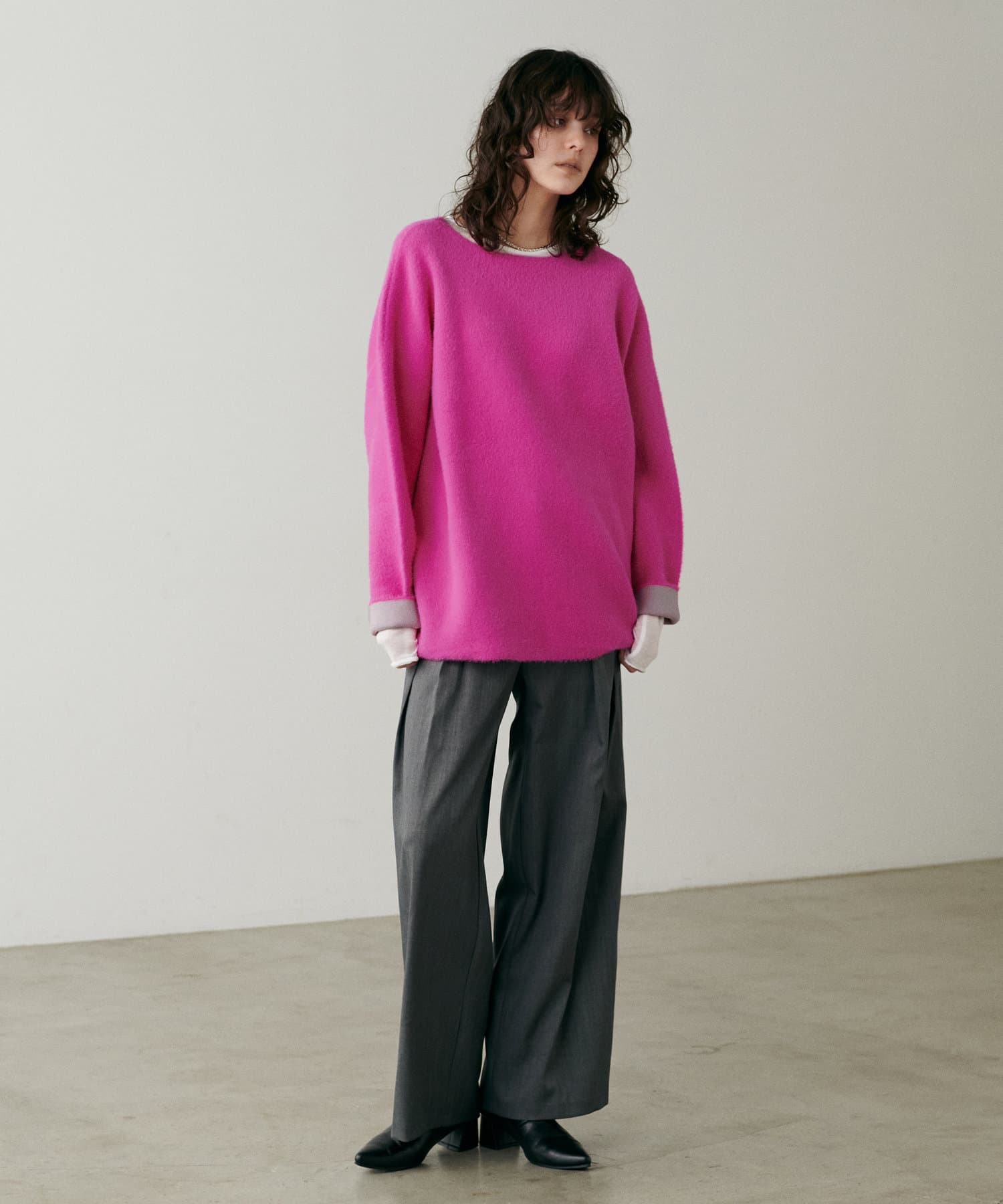 襟ぐりが広めなので、シャツやタートルネックをインしても。