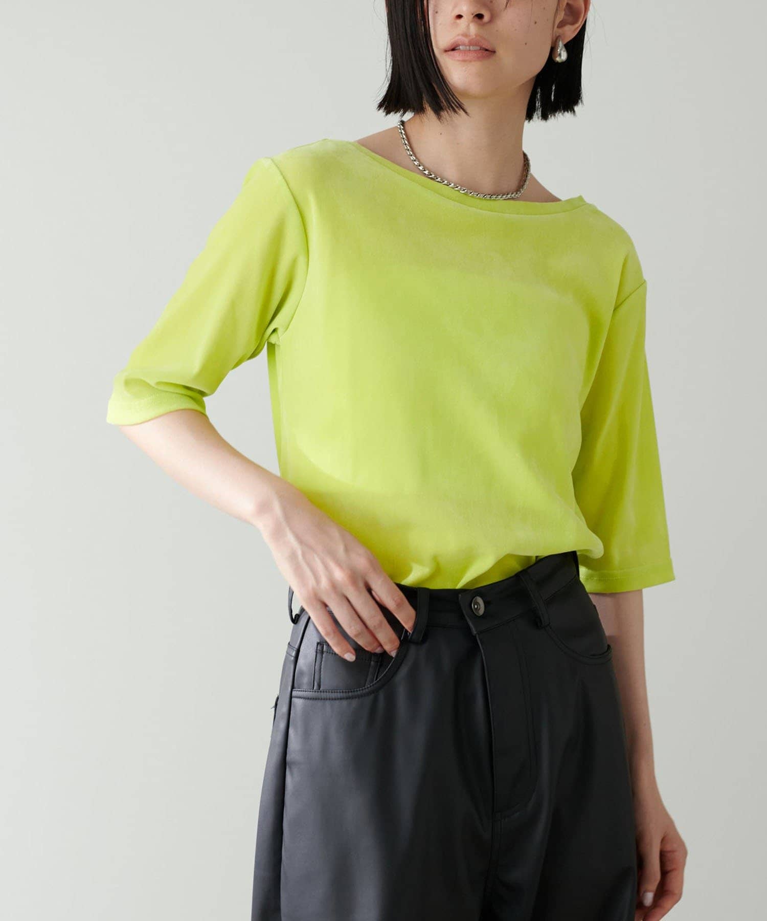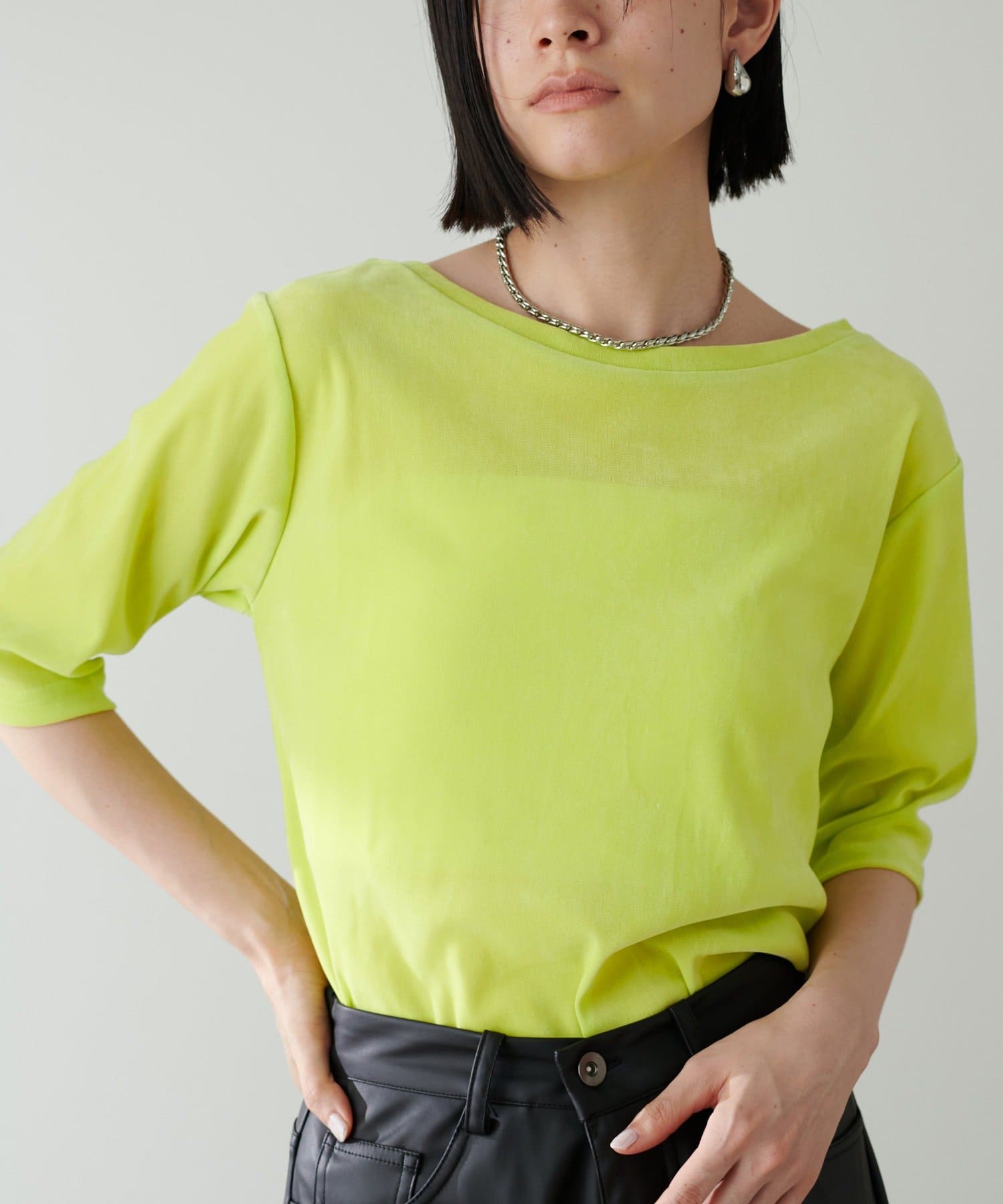 汎用性の高い五分袖デザインは腕周りをすっきりと見せてくれます。