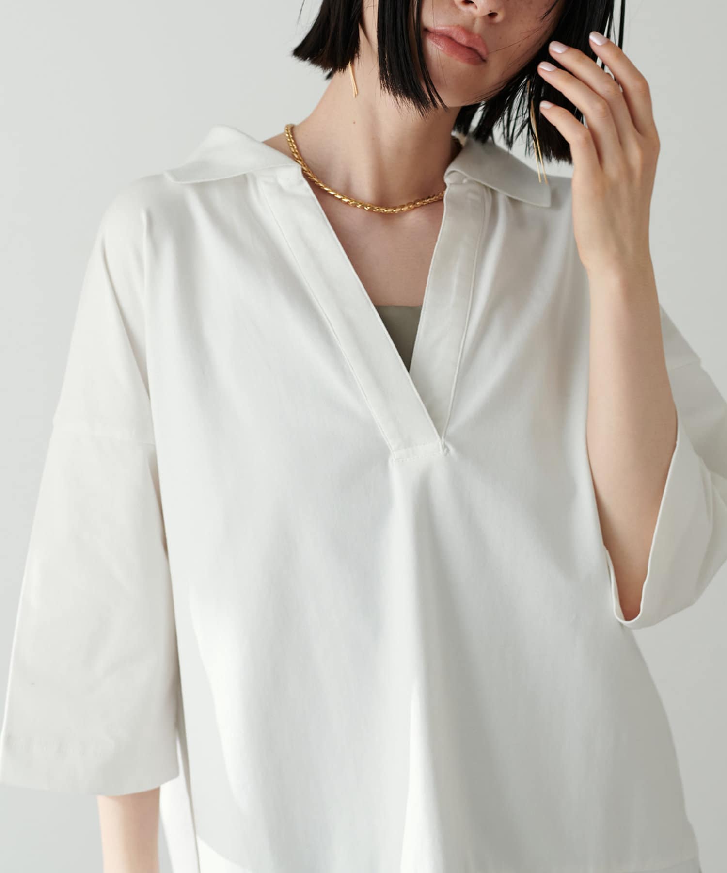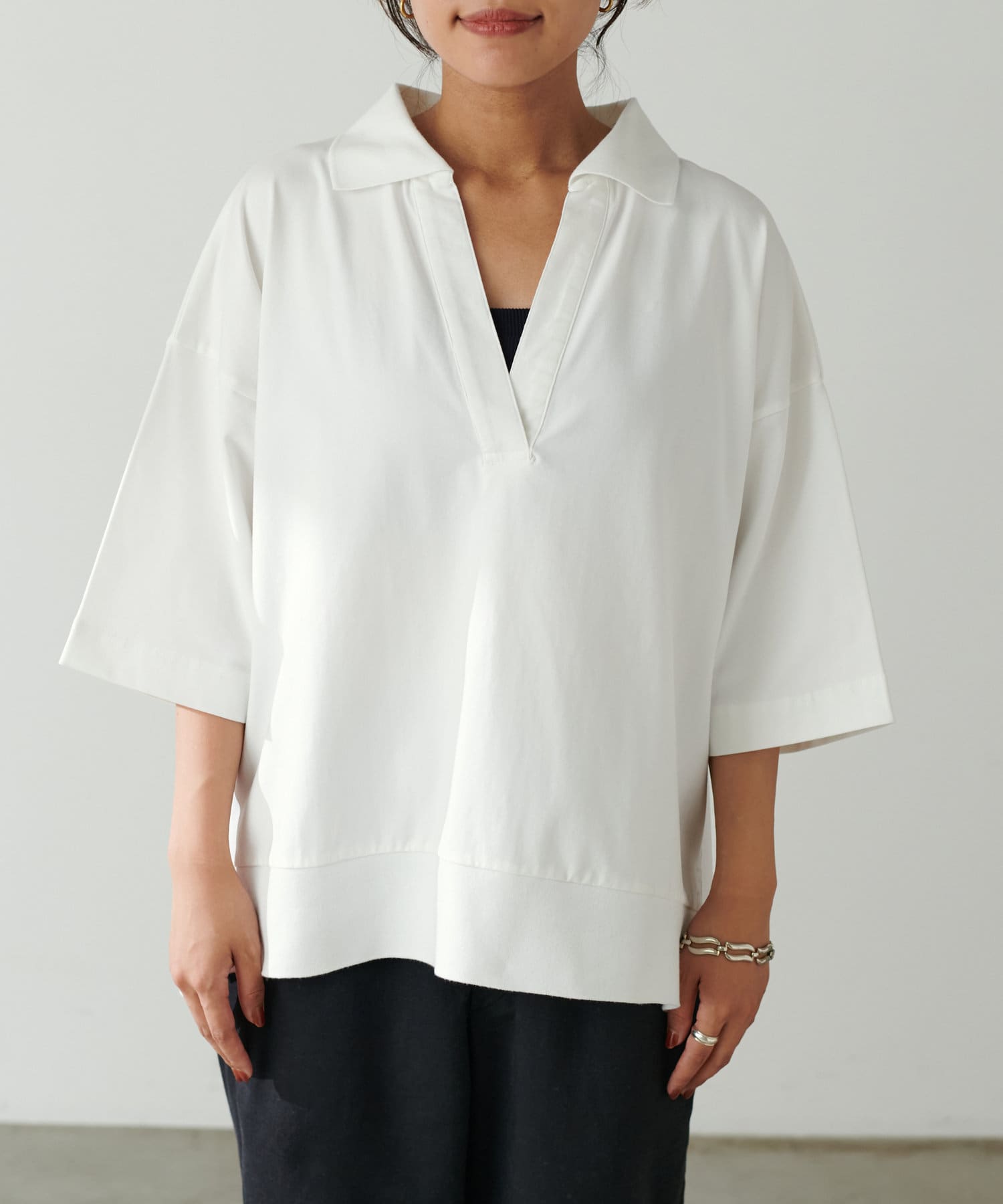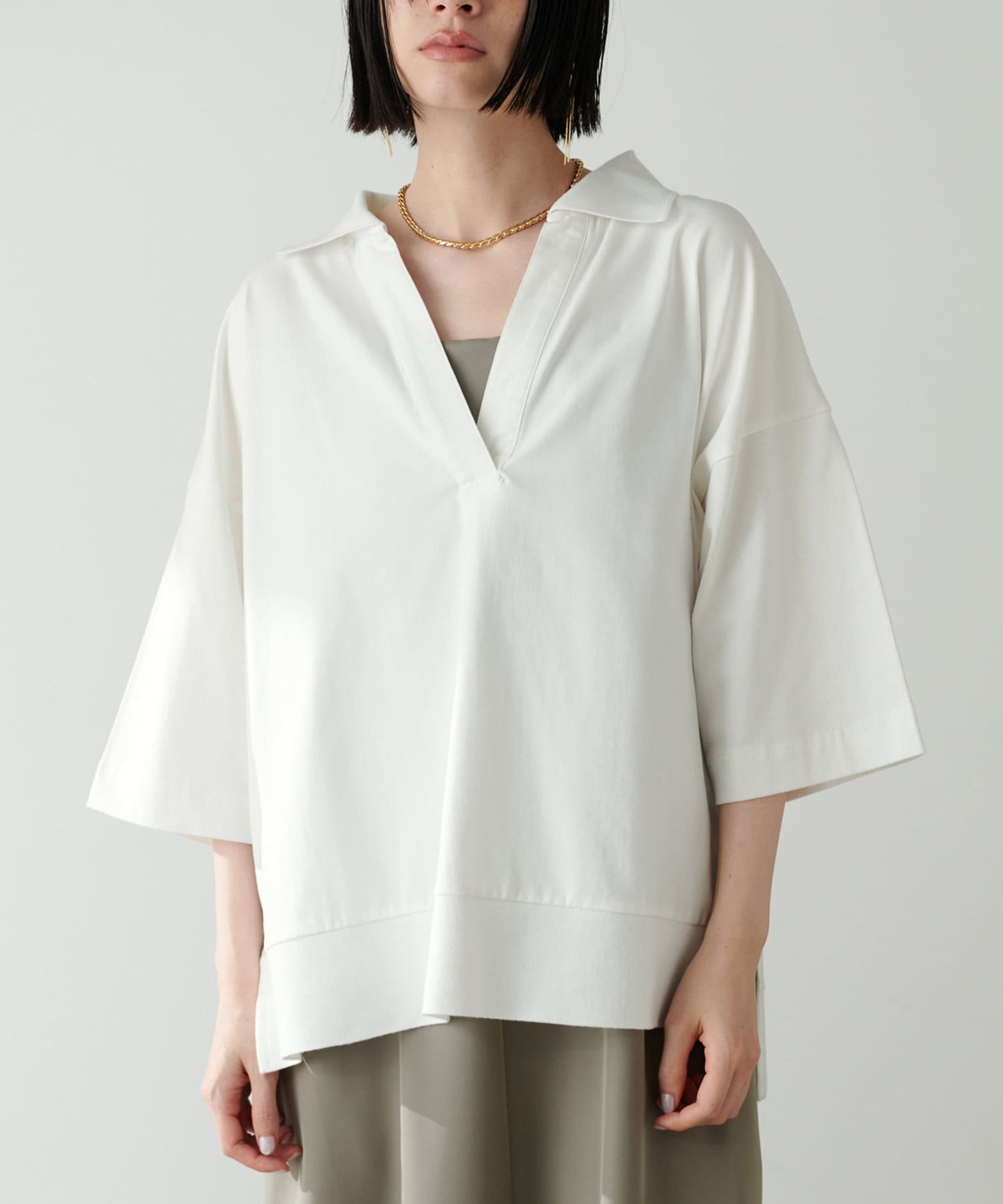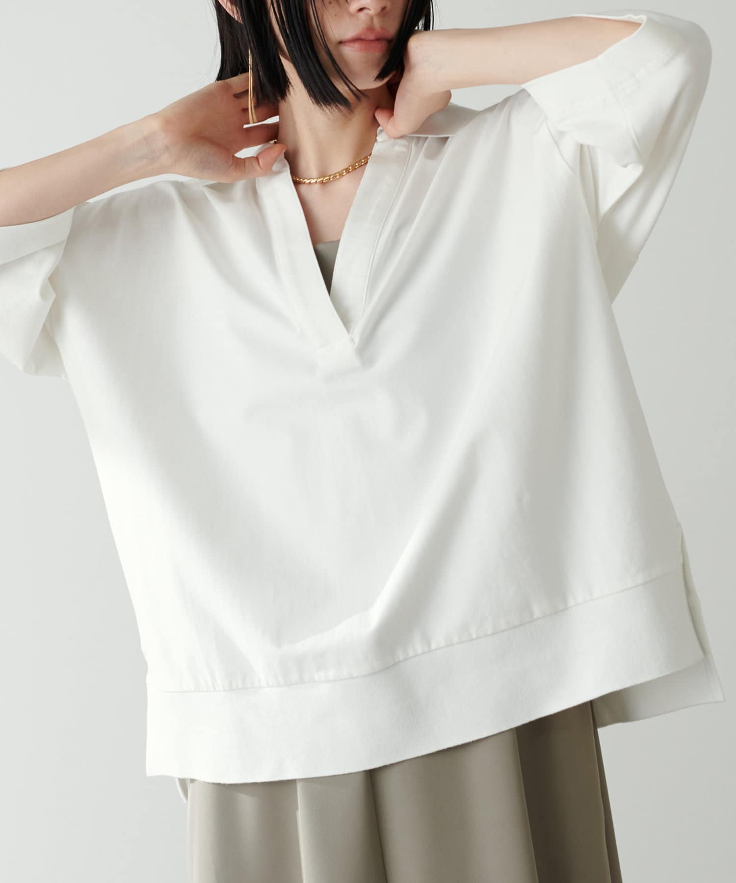ぐっと深く開いたVネックやゆったりとしたサイジングなど