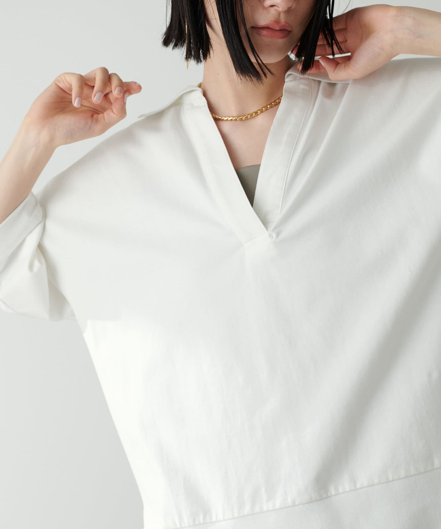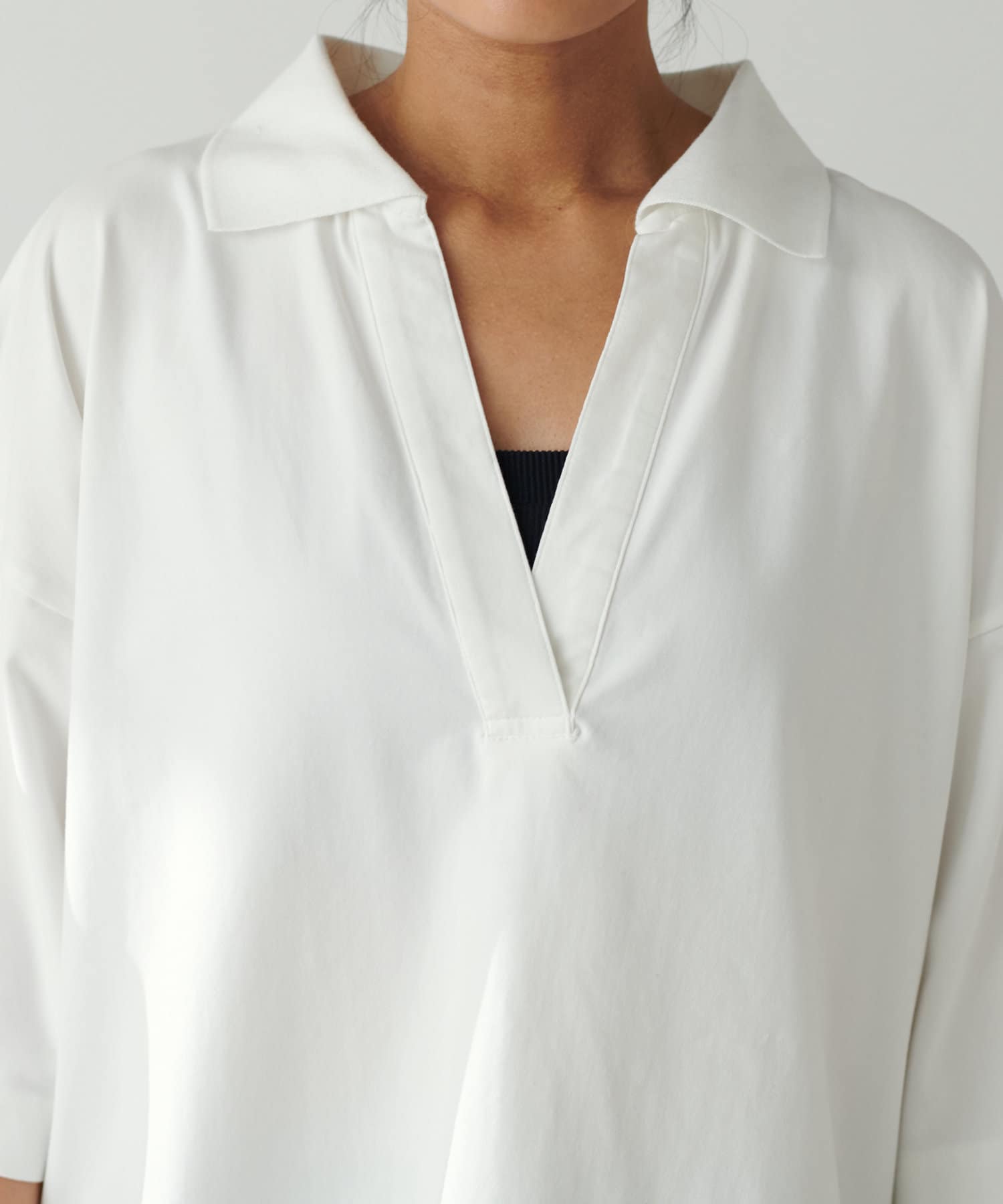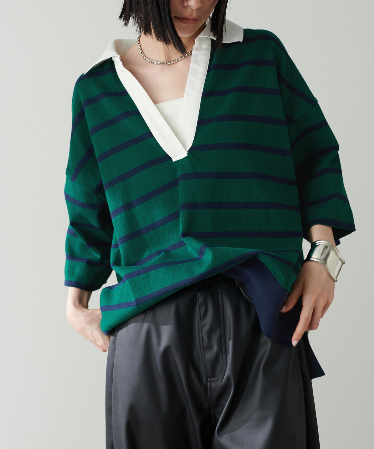 ぐっと深く開いたVネックやゆったりとしたサイジングなど