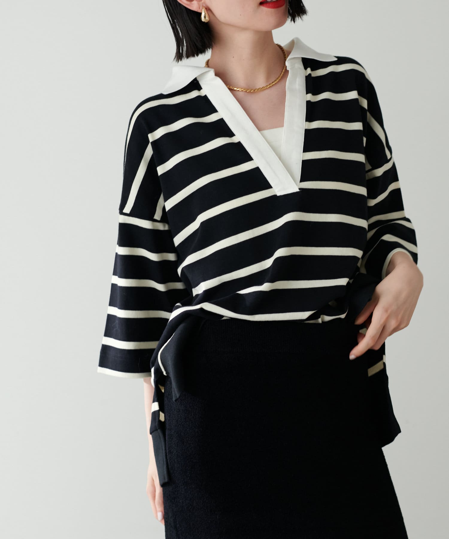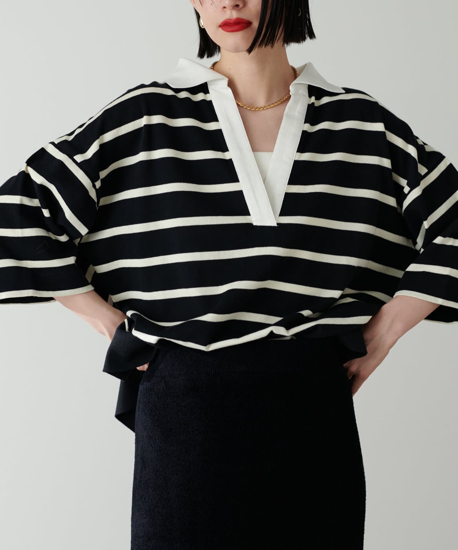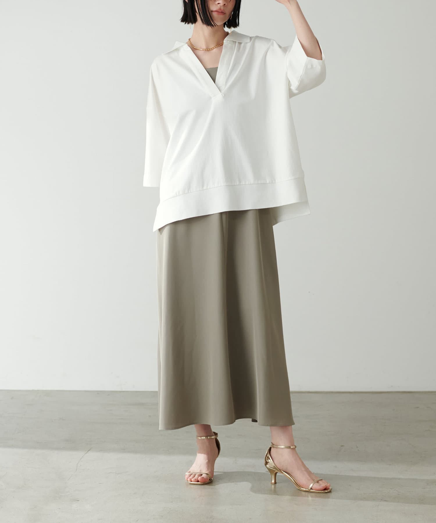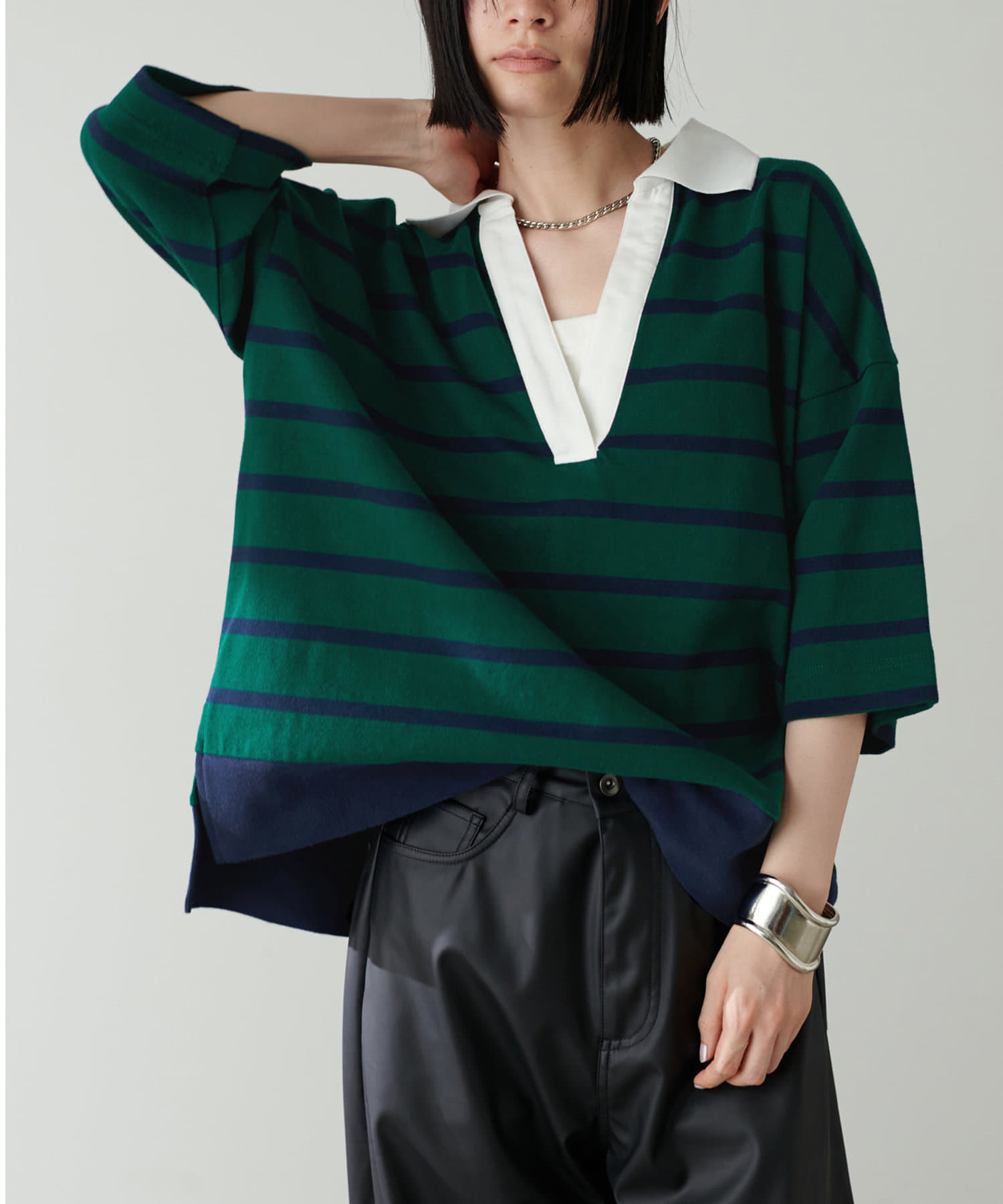 ぐっと深く開いたVネックやゆったりとしたサイジングなど