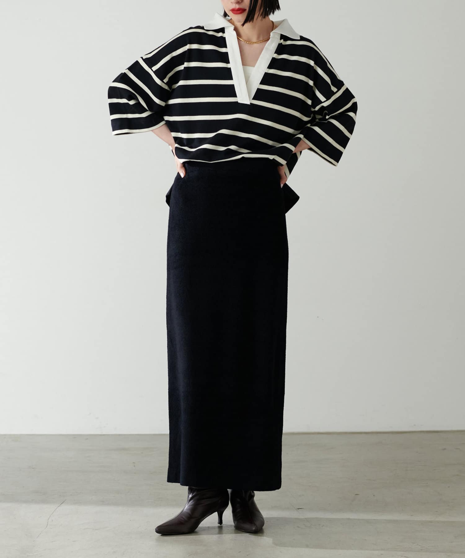 大人ぽく決まるポイント。ワイドなタックパンツや、スカートなどきれいめな