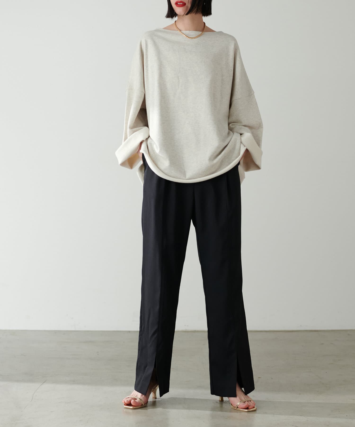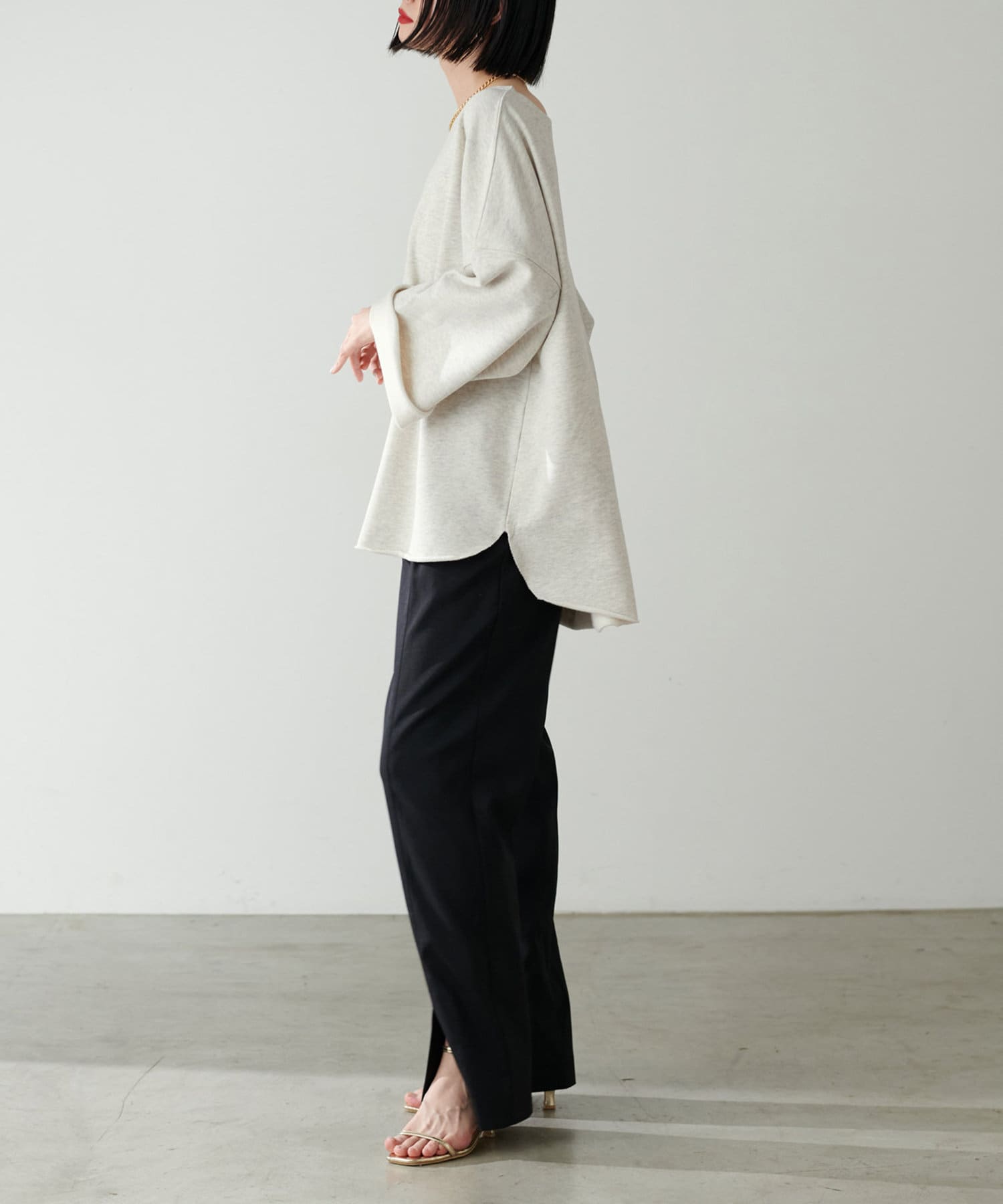 ボートネックがすっきりとした顔周りを演出してくれます。