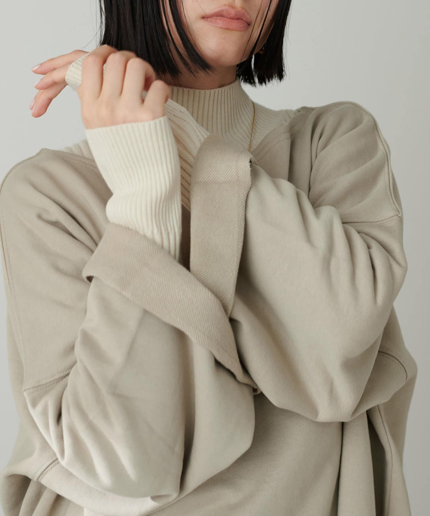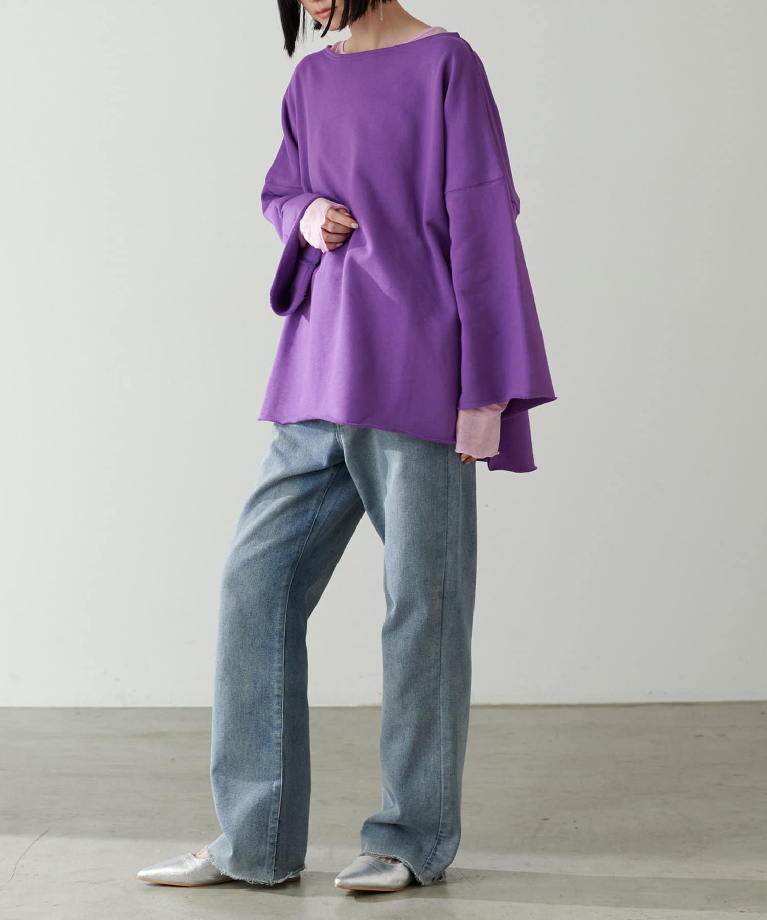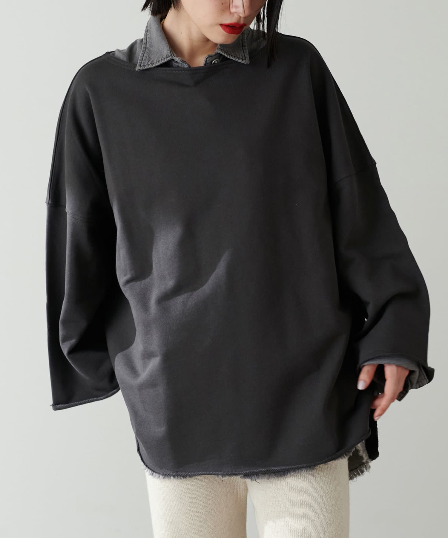 ずるっとしたシルエットなのでワンショル風な着こなしもおすすめ。