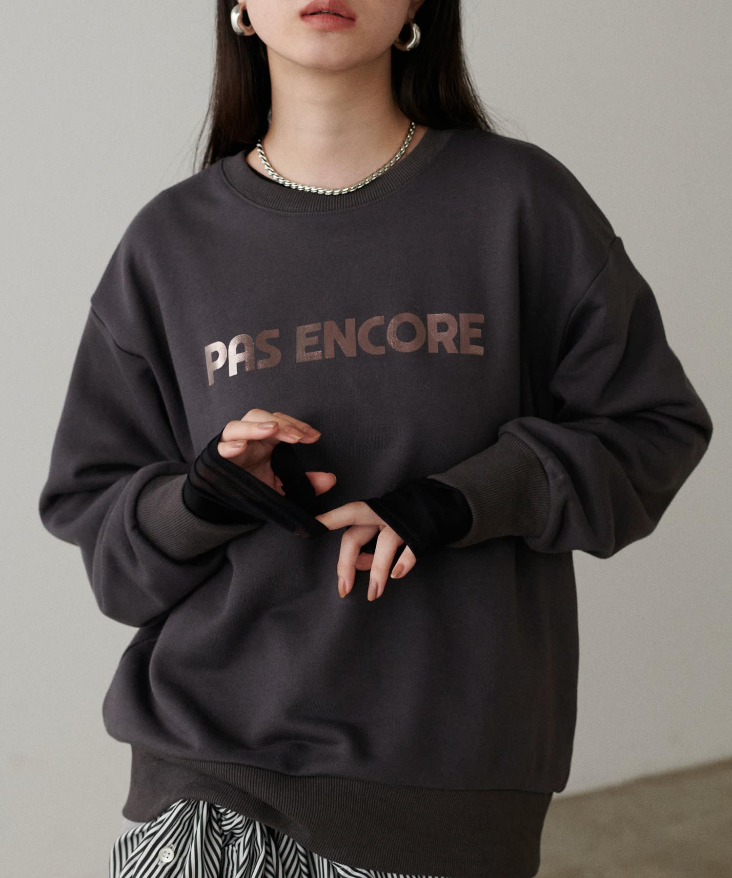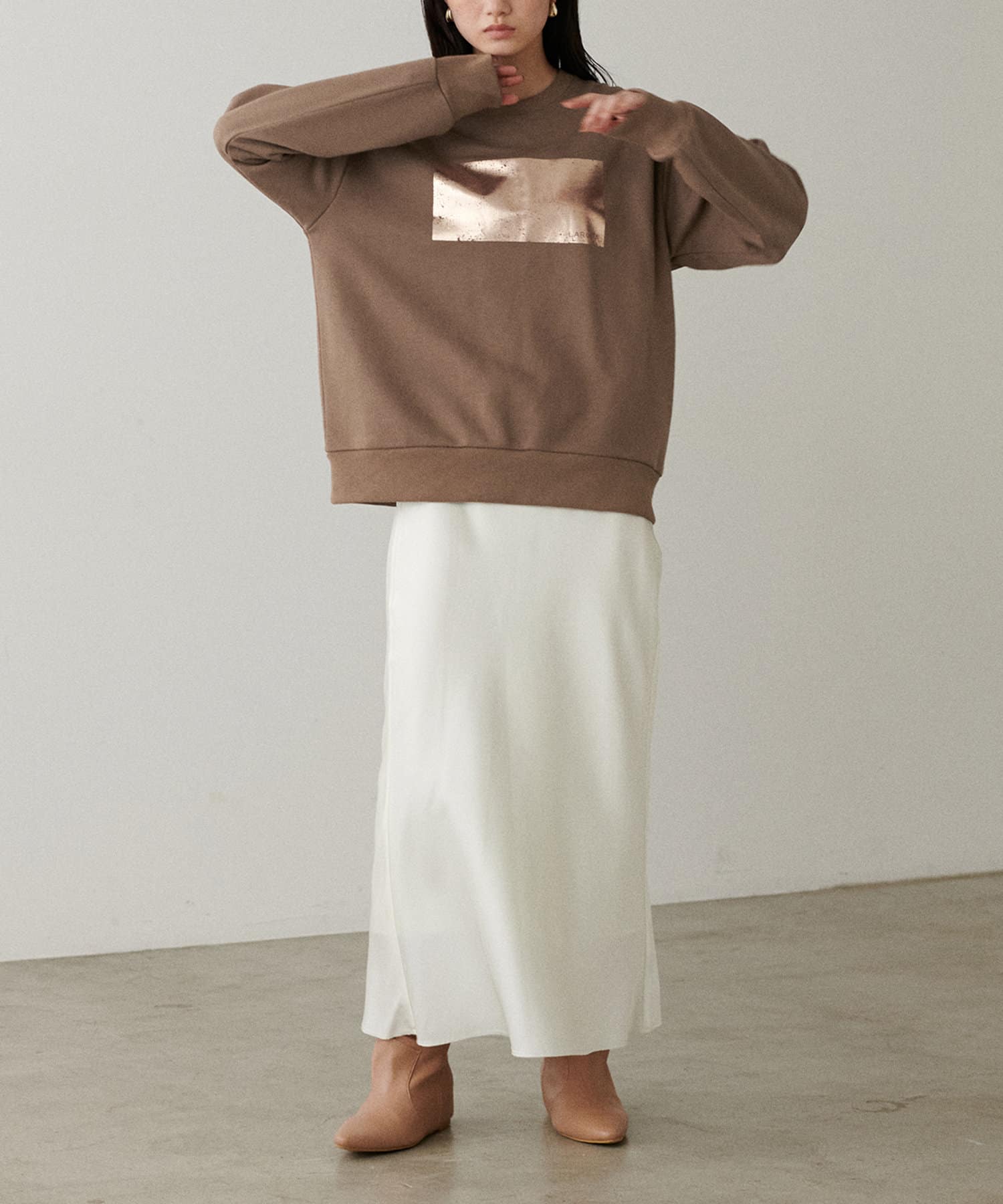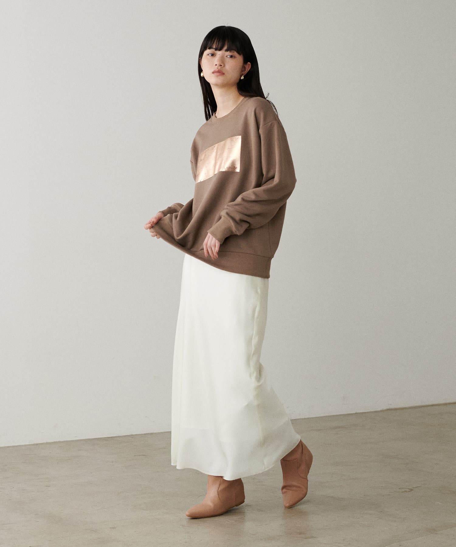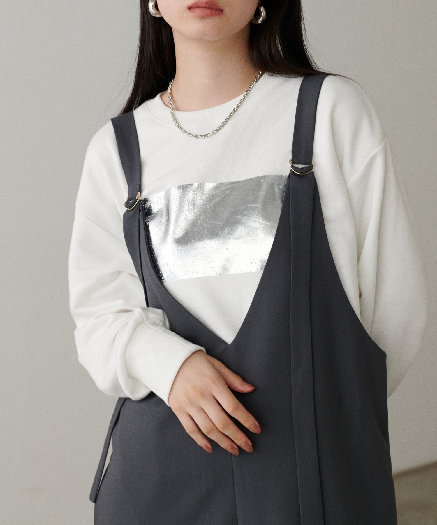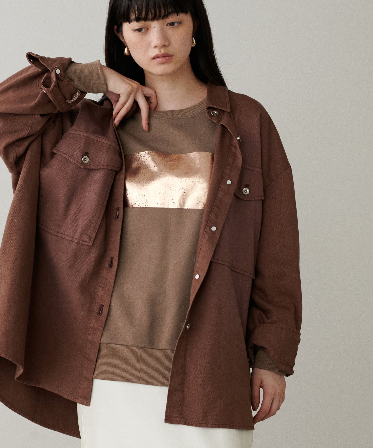 箔プリントがちらりと見える着こなしがオシャレ。