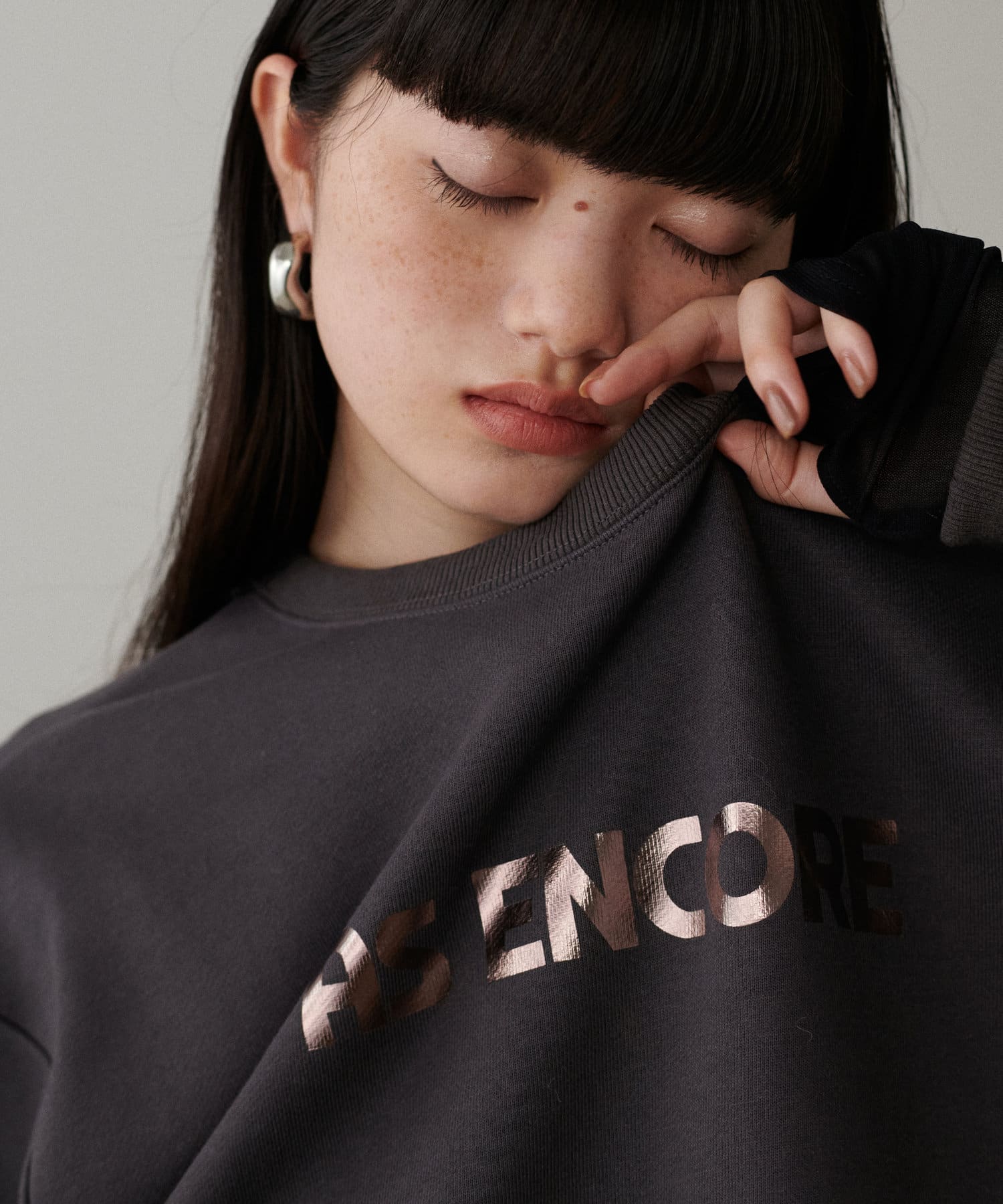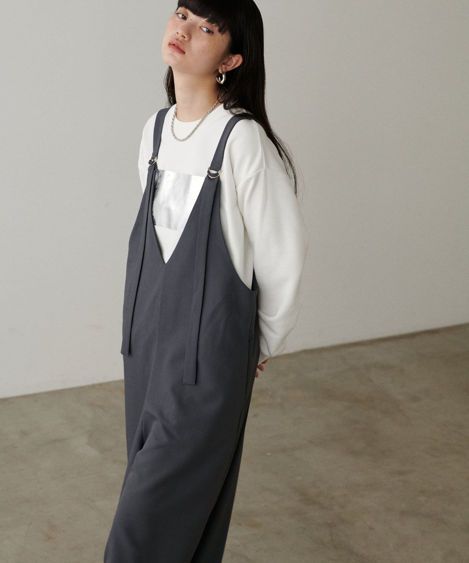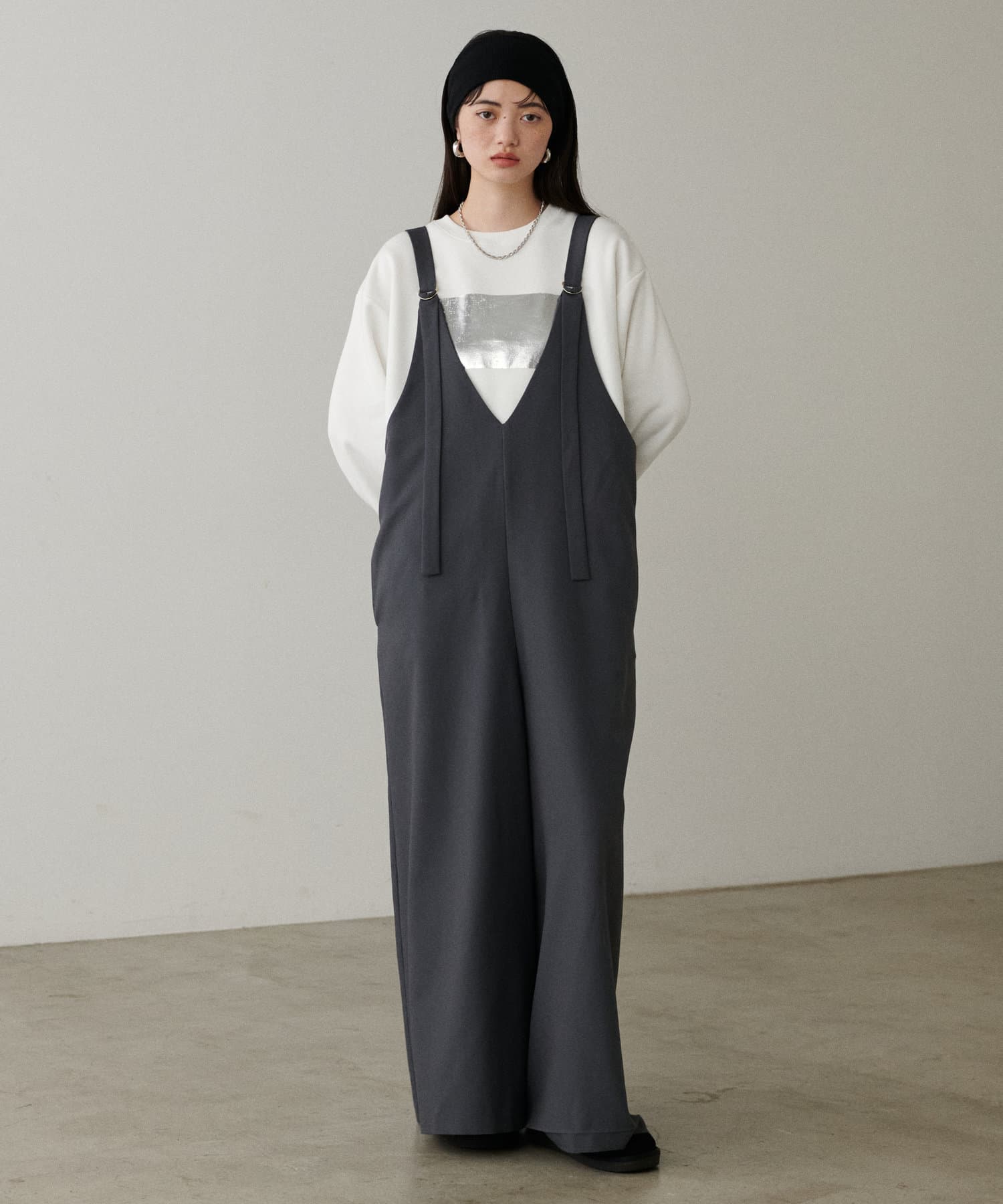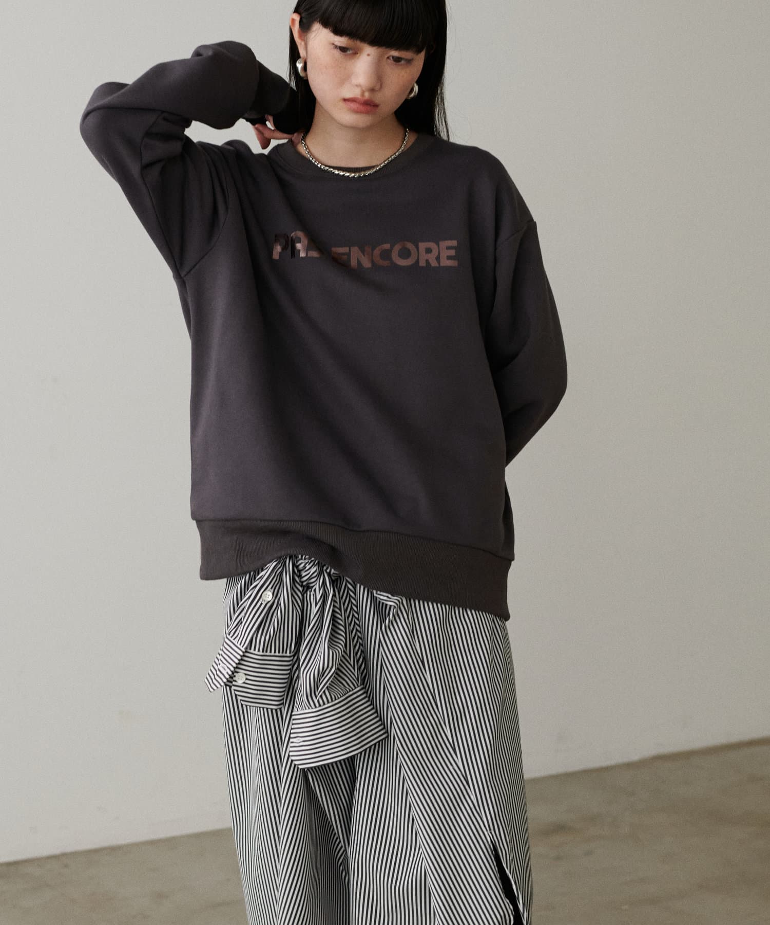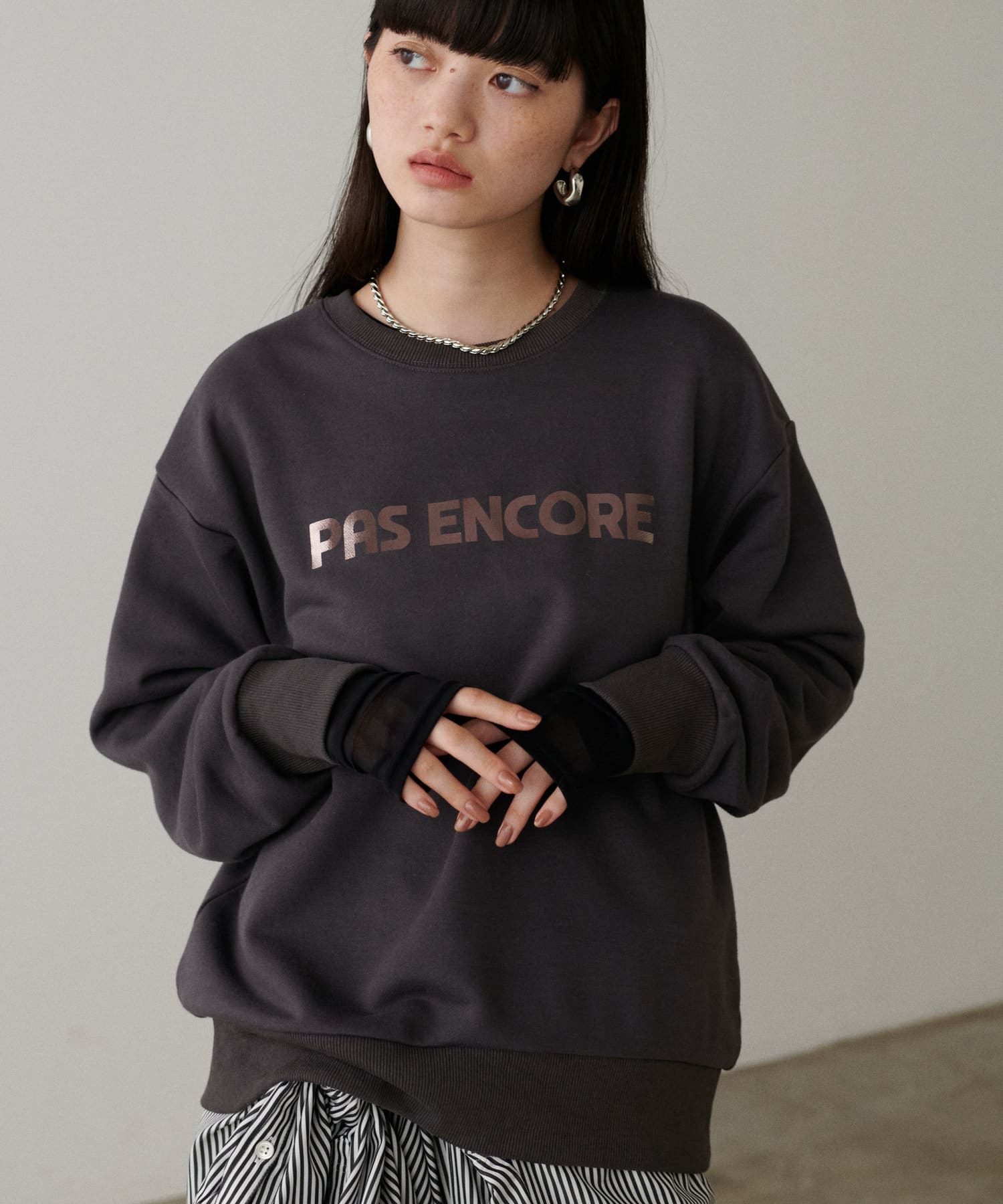 箔プリントがちらりと見える着こなしがオシャレ。