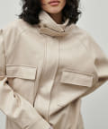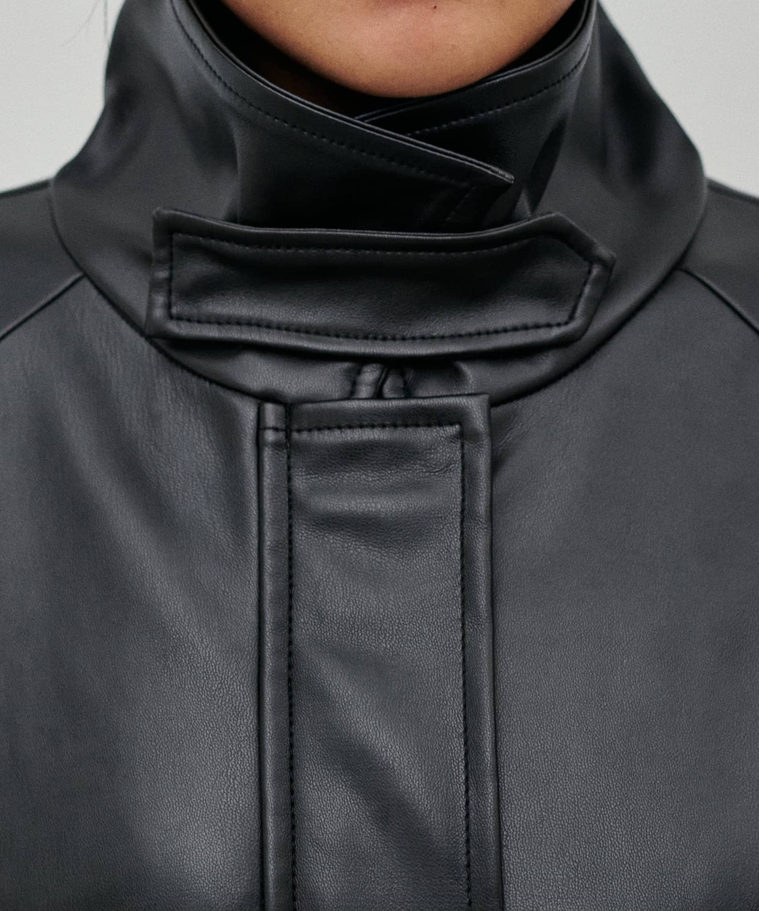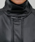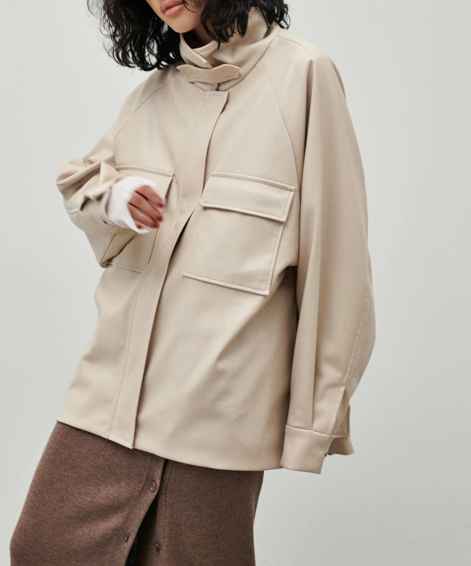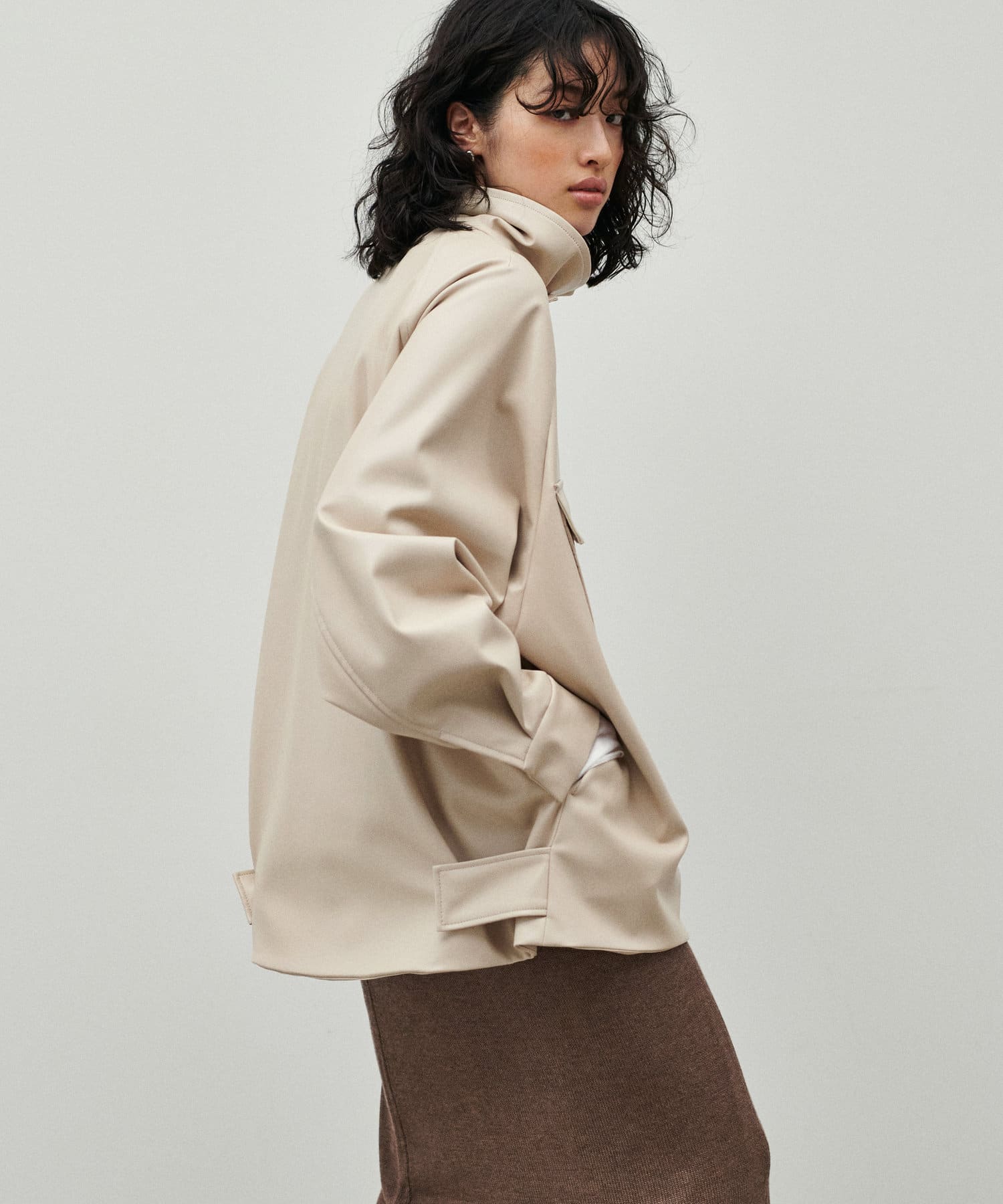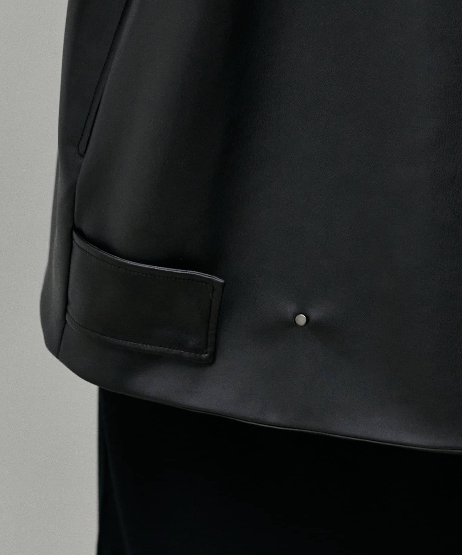 襟のタブを前で留めてスタンドカラーとしても着用可能です。