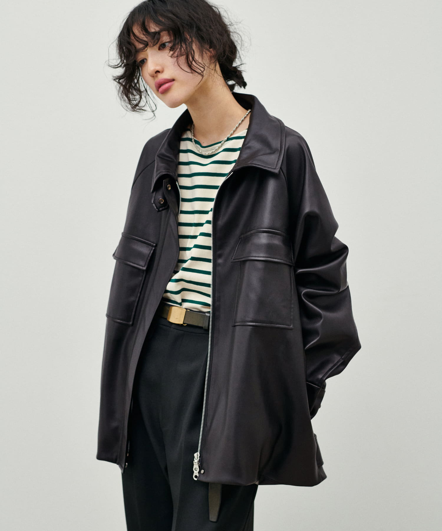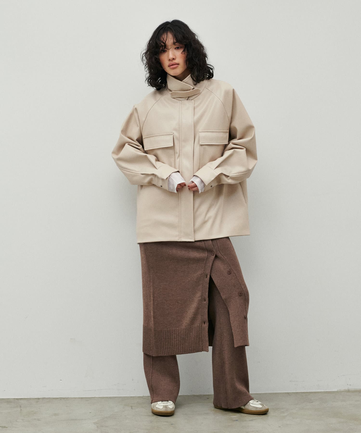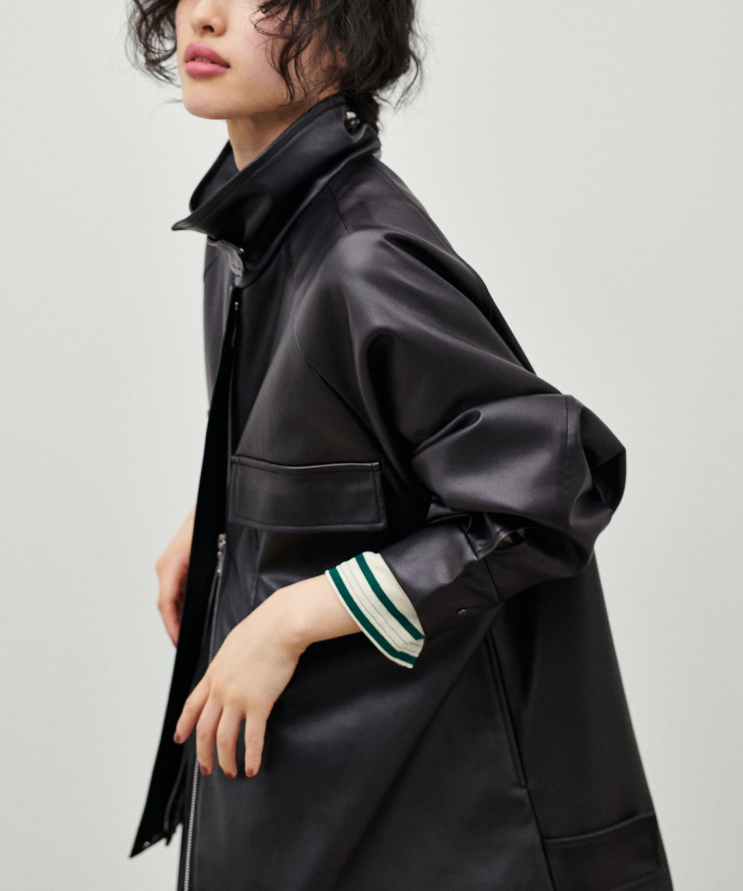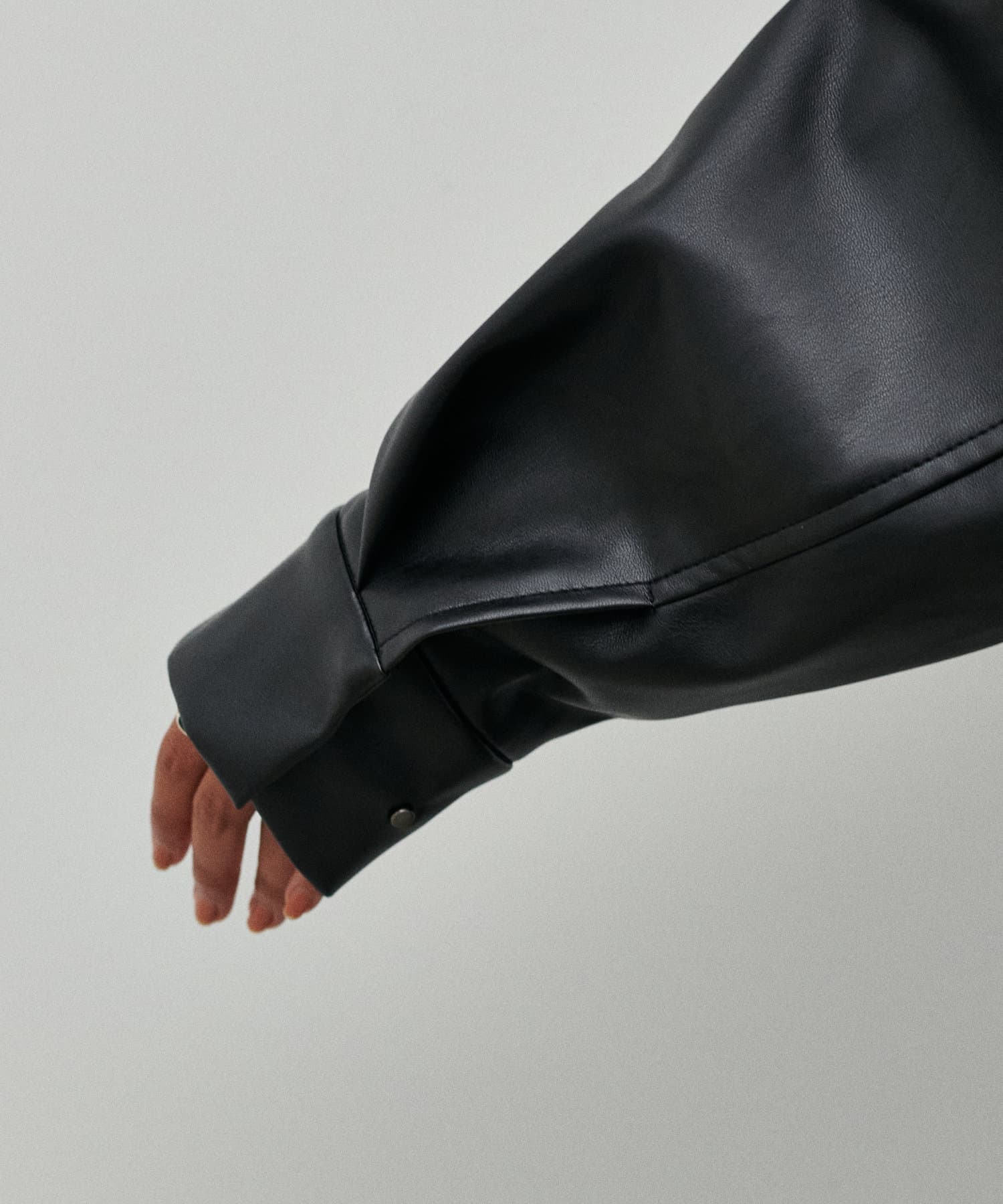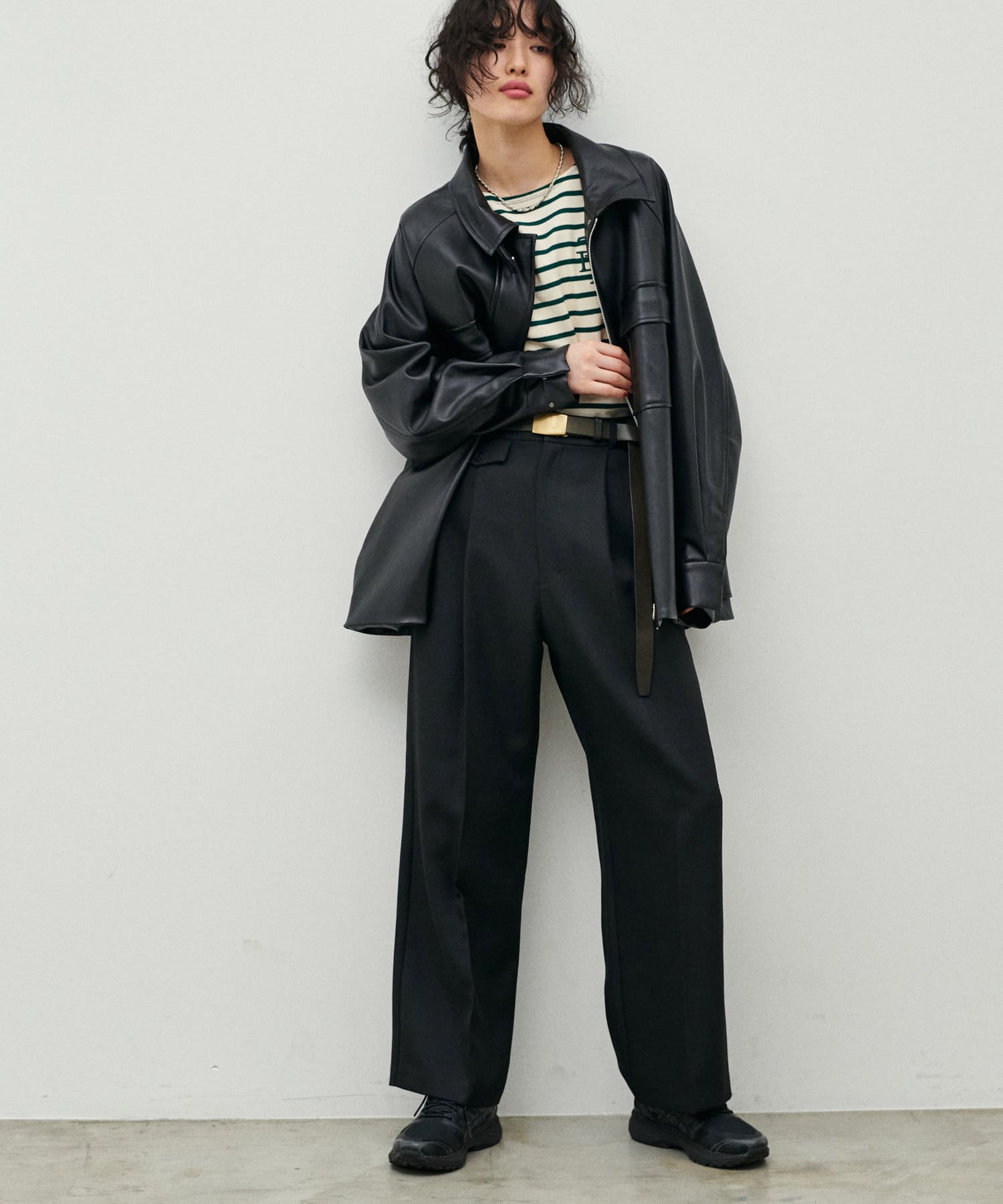 フェイクレザーのスカートと合わせるとモードな印象に。