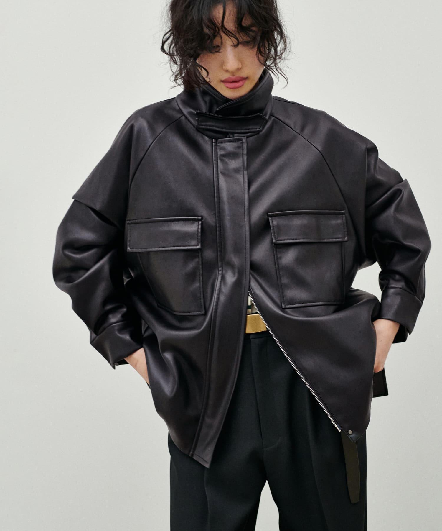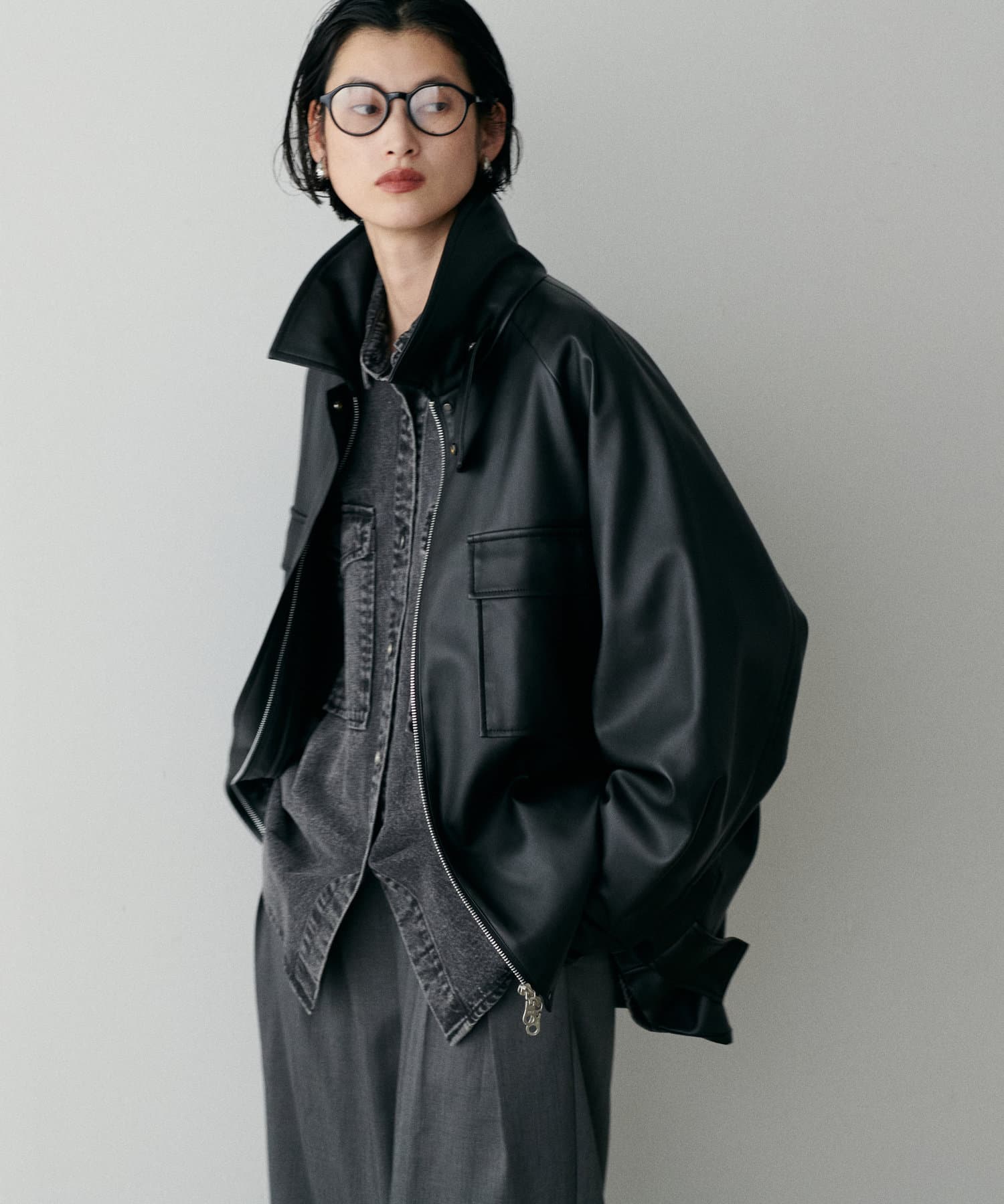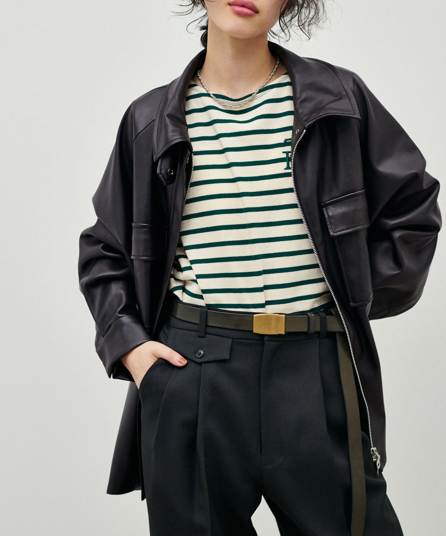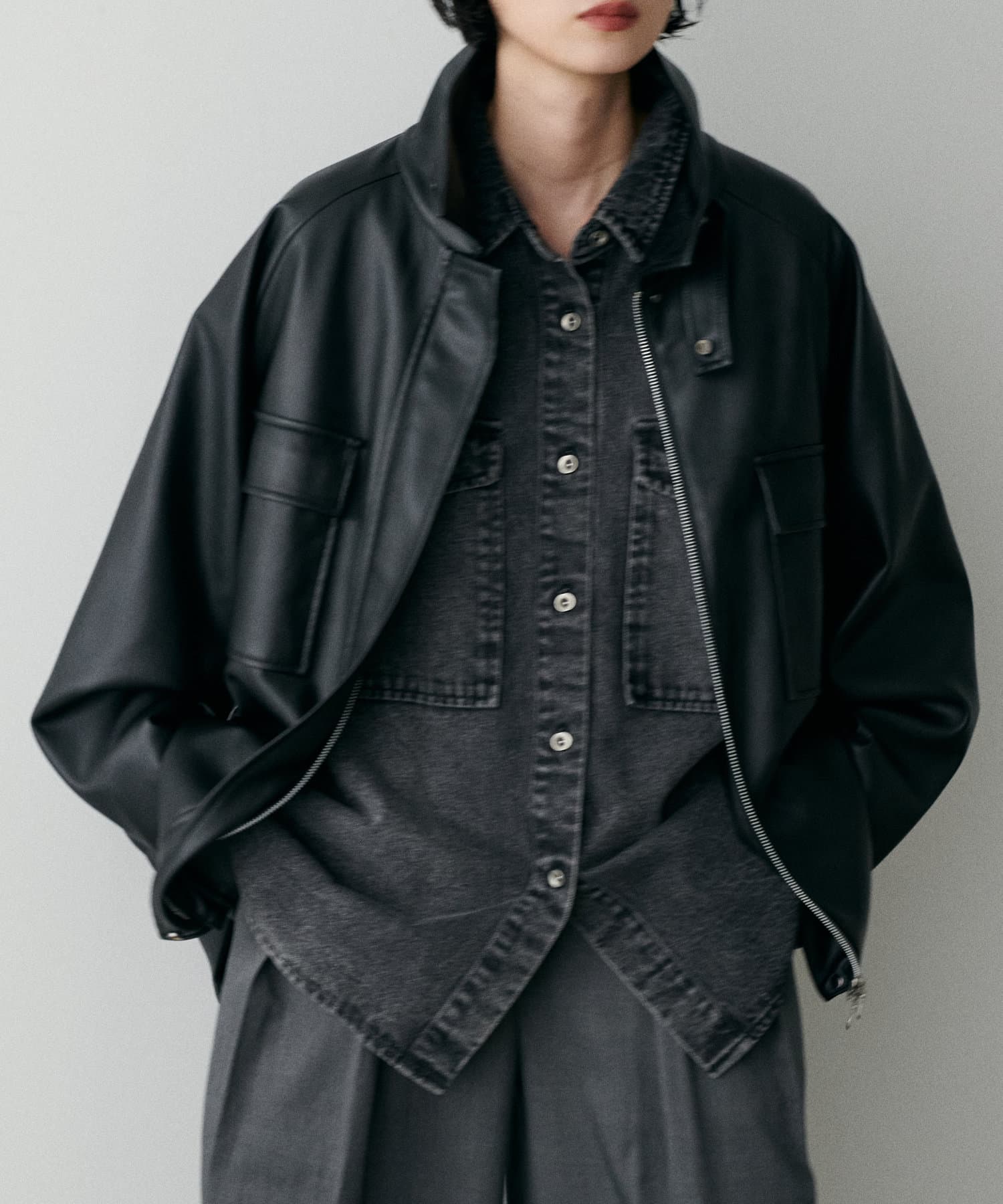 フェイクレザーのスカートと合わせるとモードな印象に。