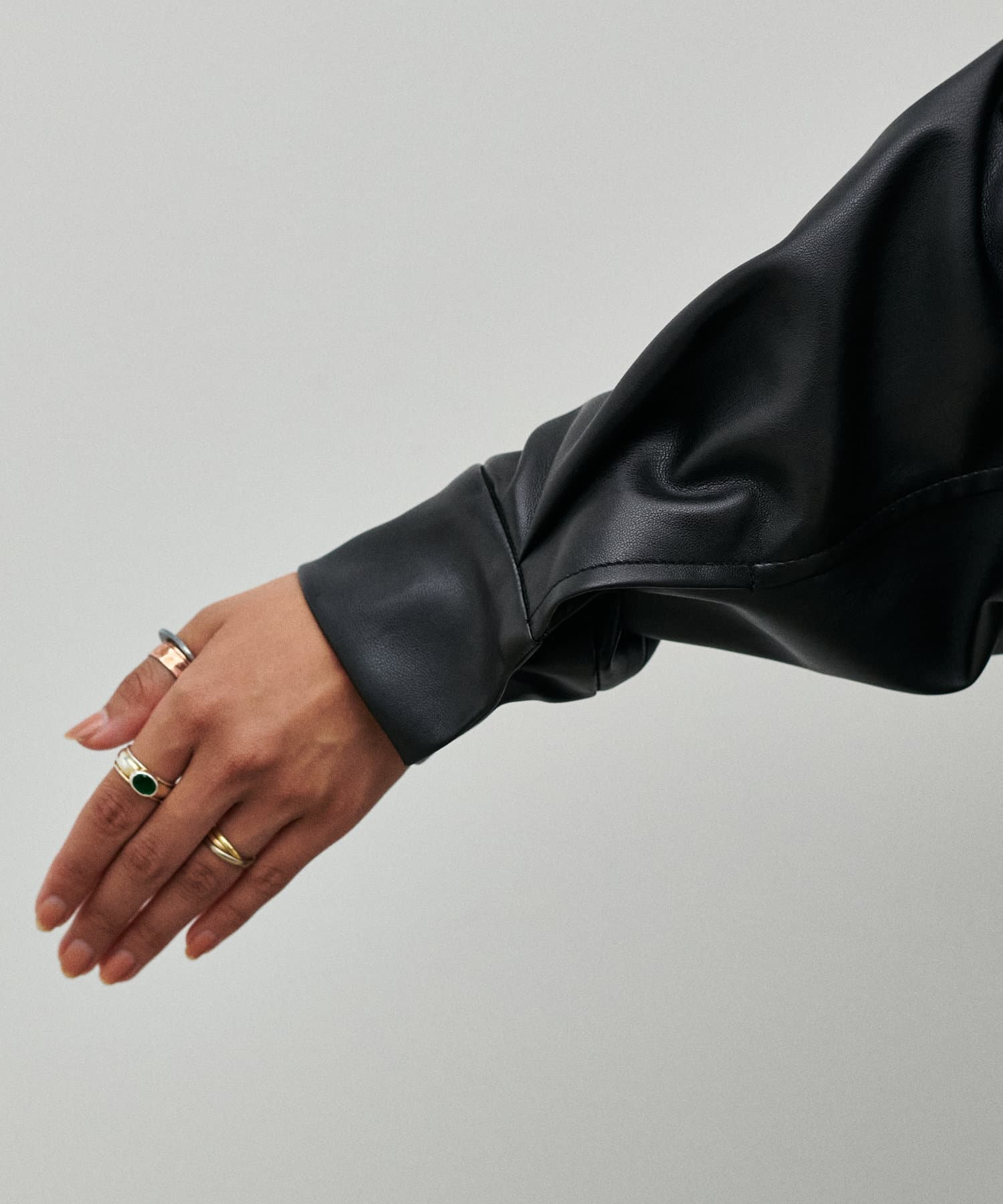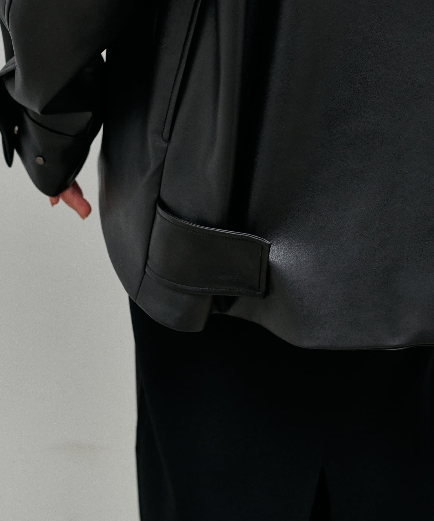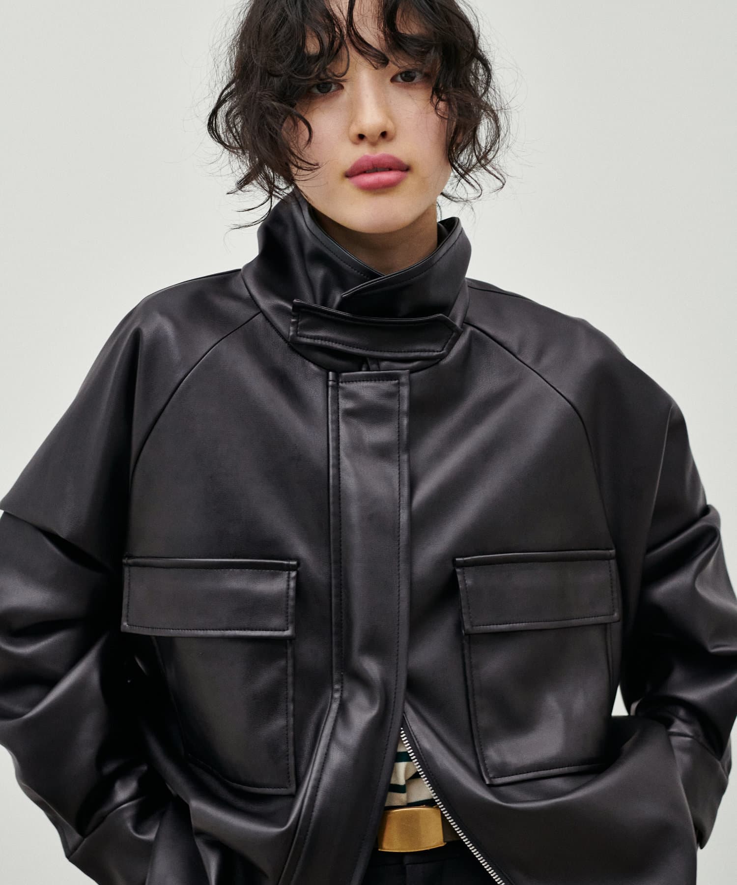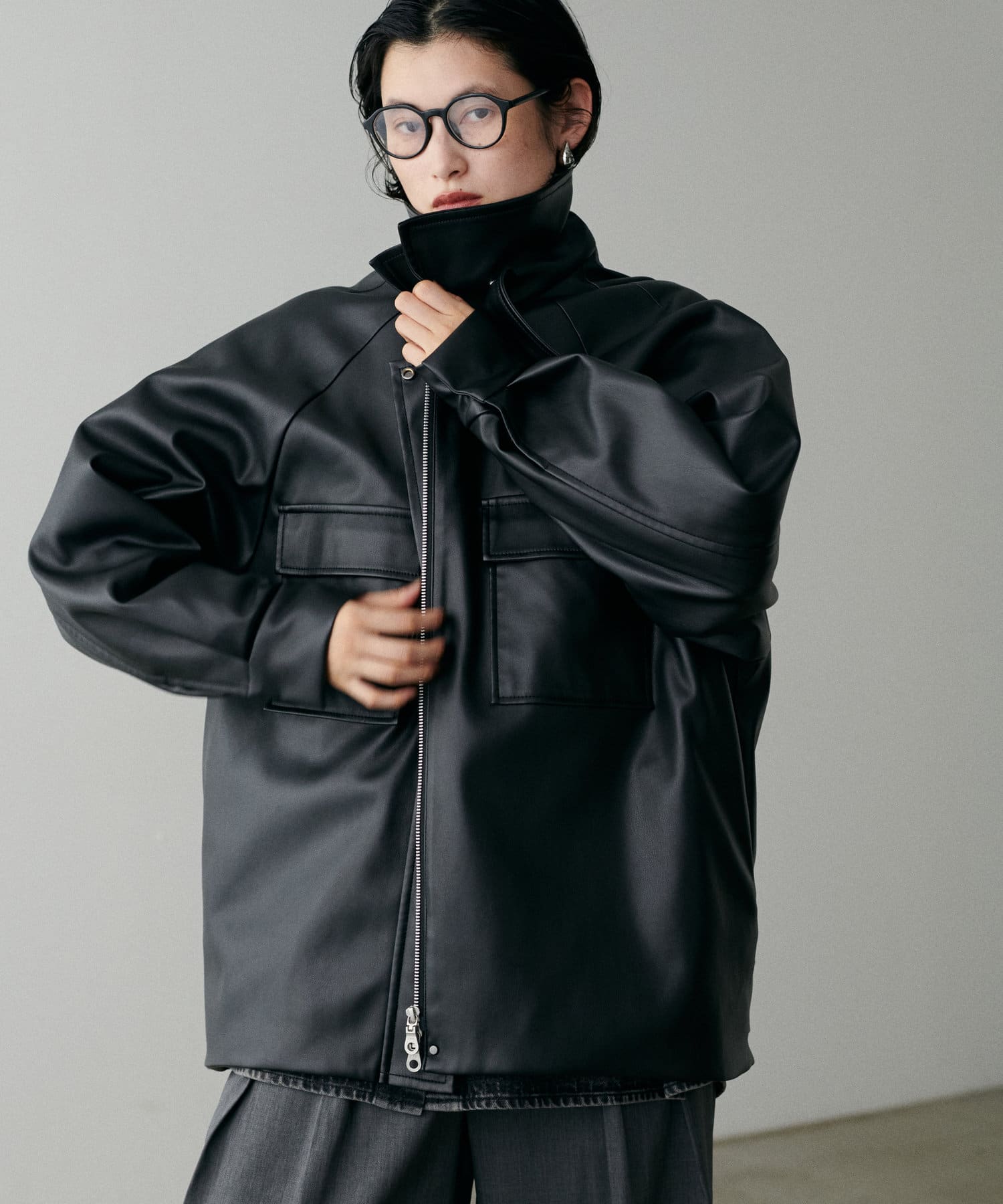 フェイクレザーのスカートと合わせるとモードな印象に。