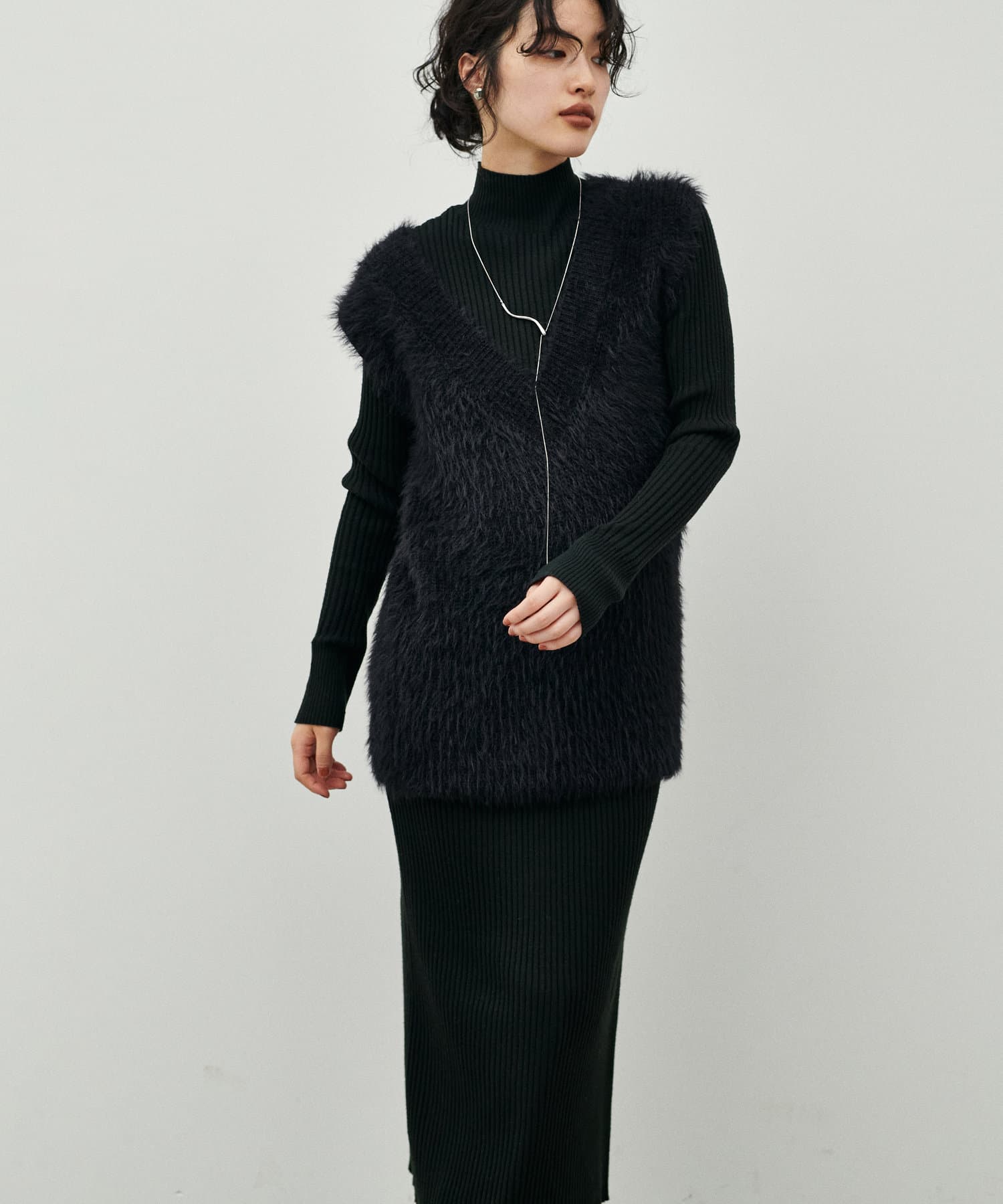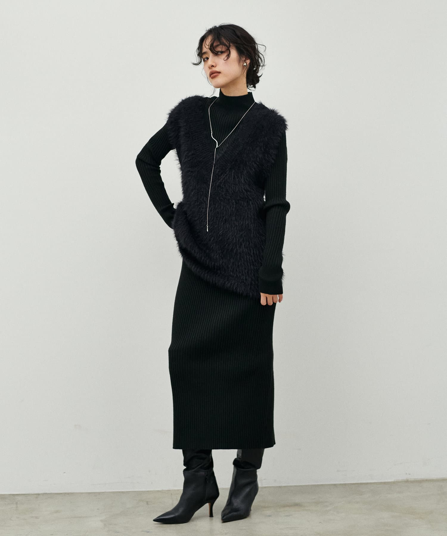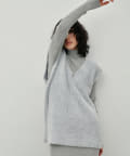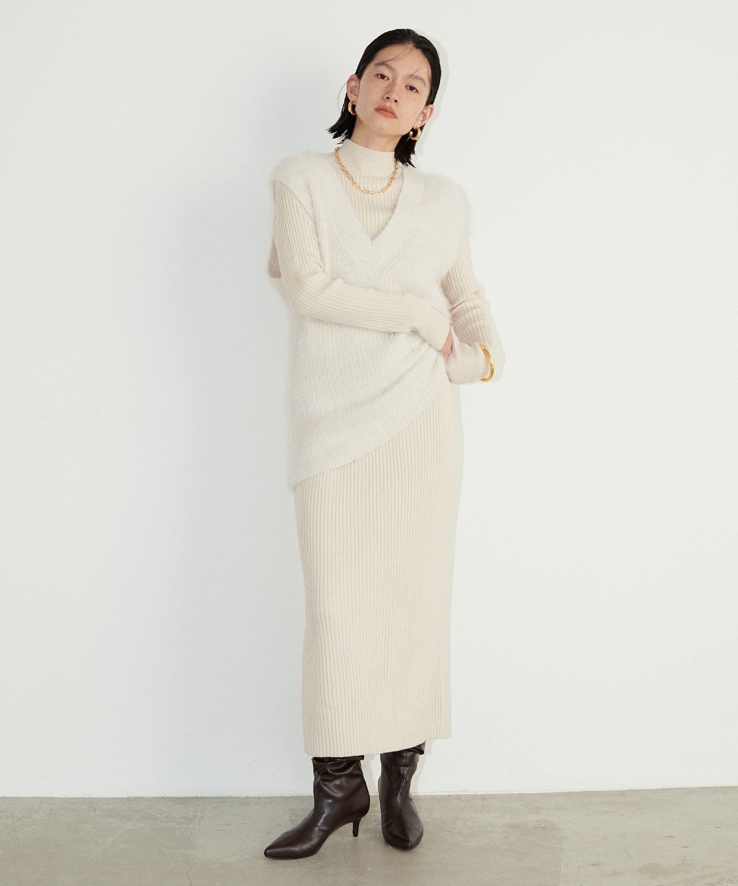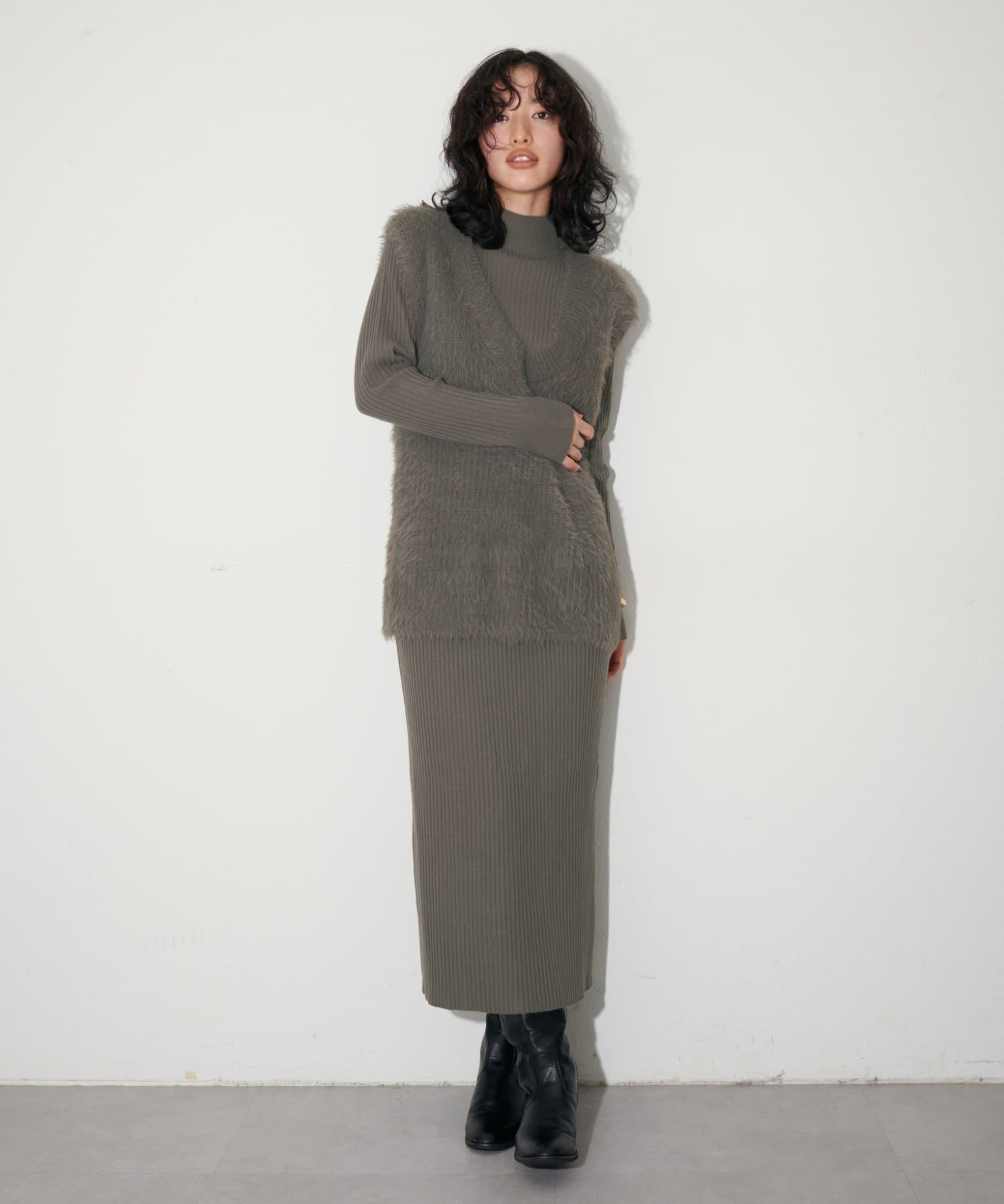 シンプルなリブのニットワンピースに同色のフェザーベストがセットになったアイテム。