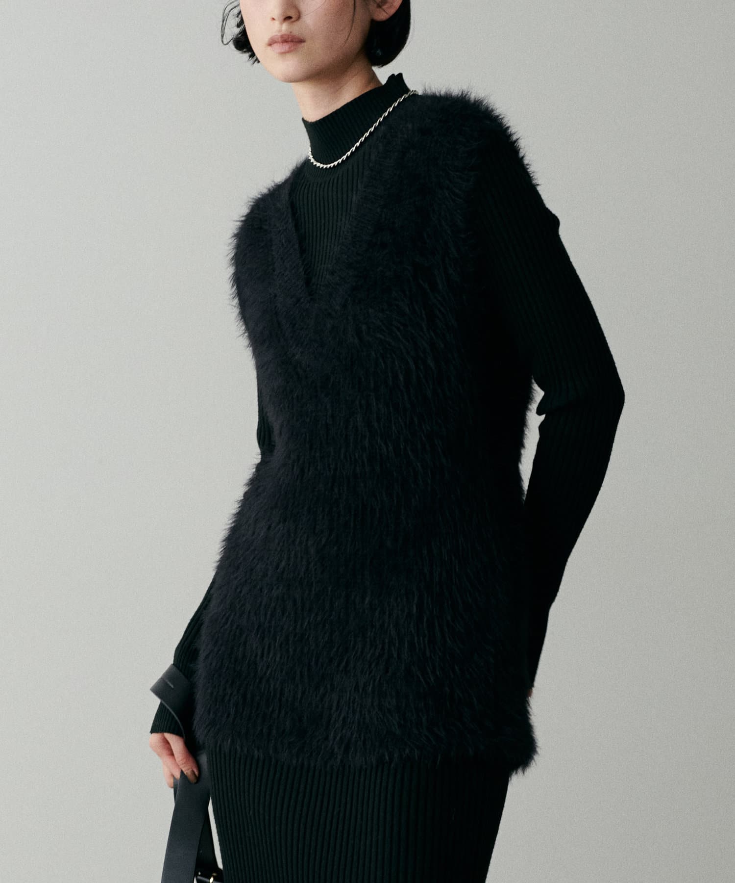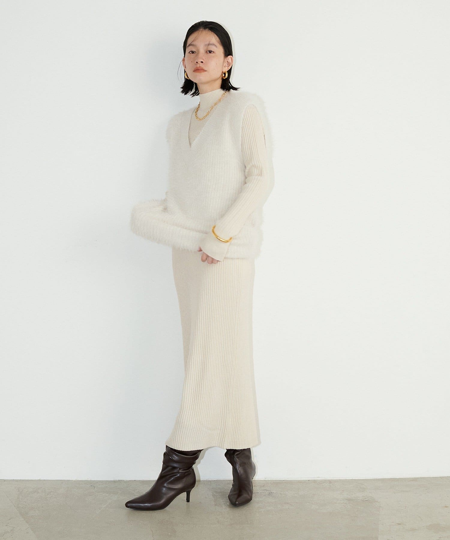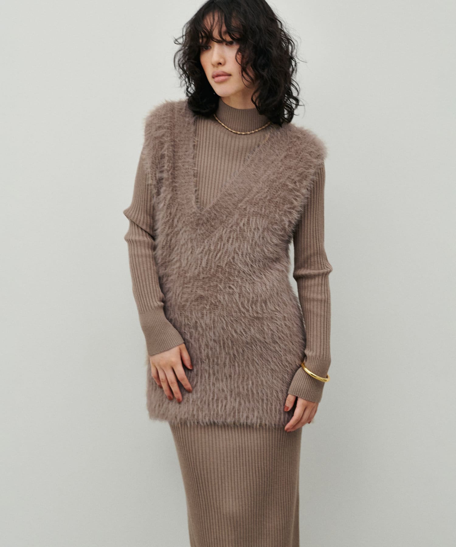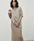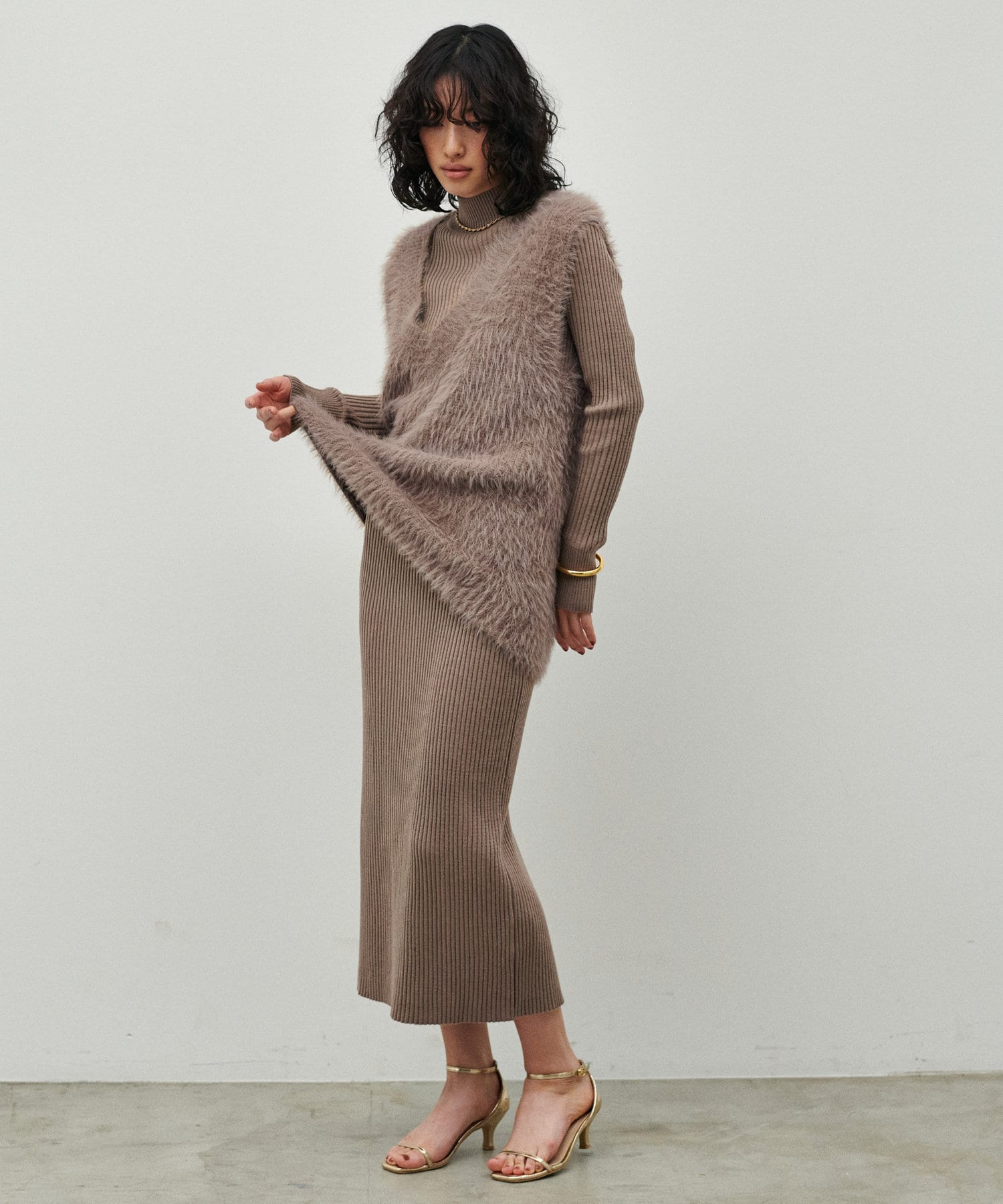 シンプルなリブのニットワンピースに同色のフェザーベストがセットになったアイテム。