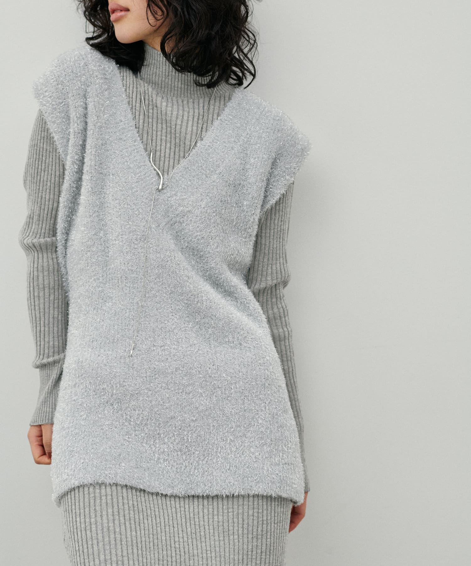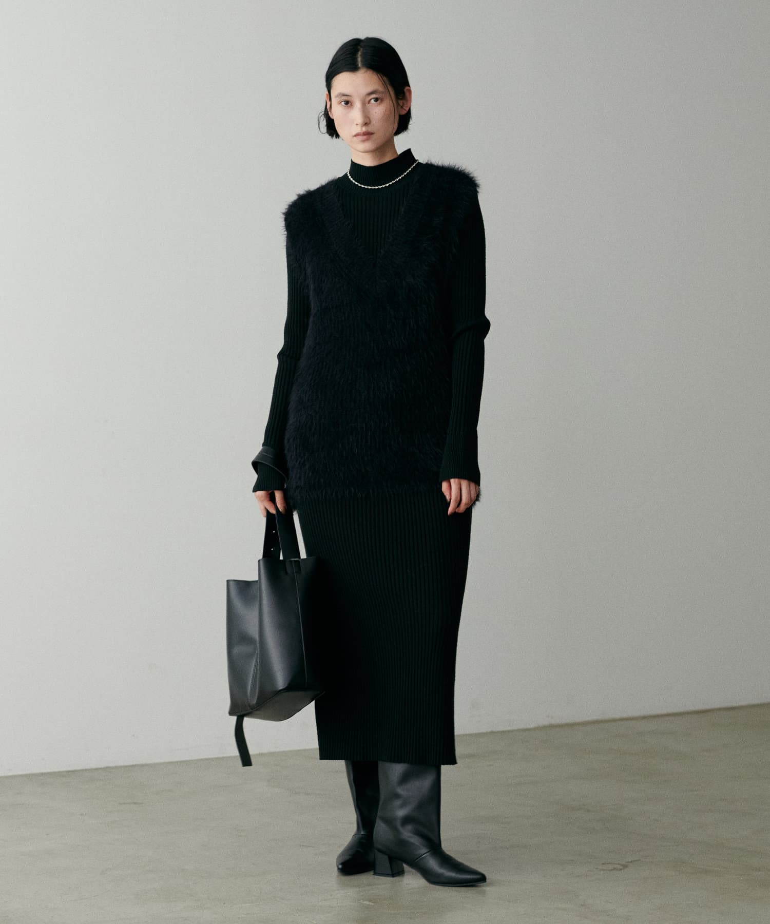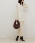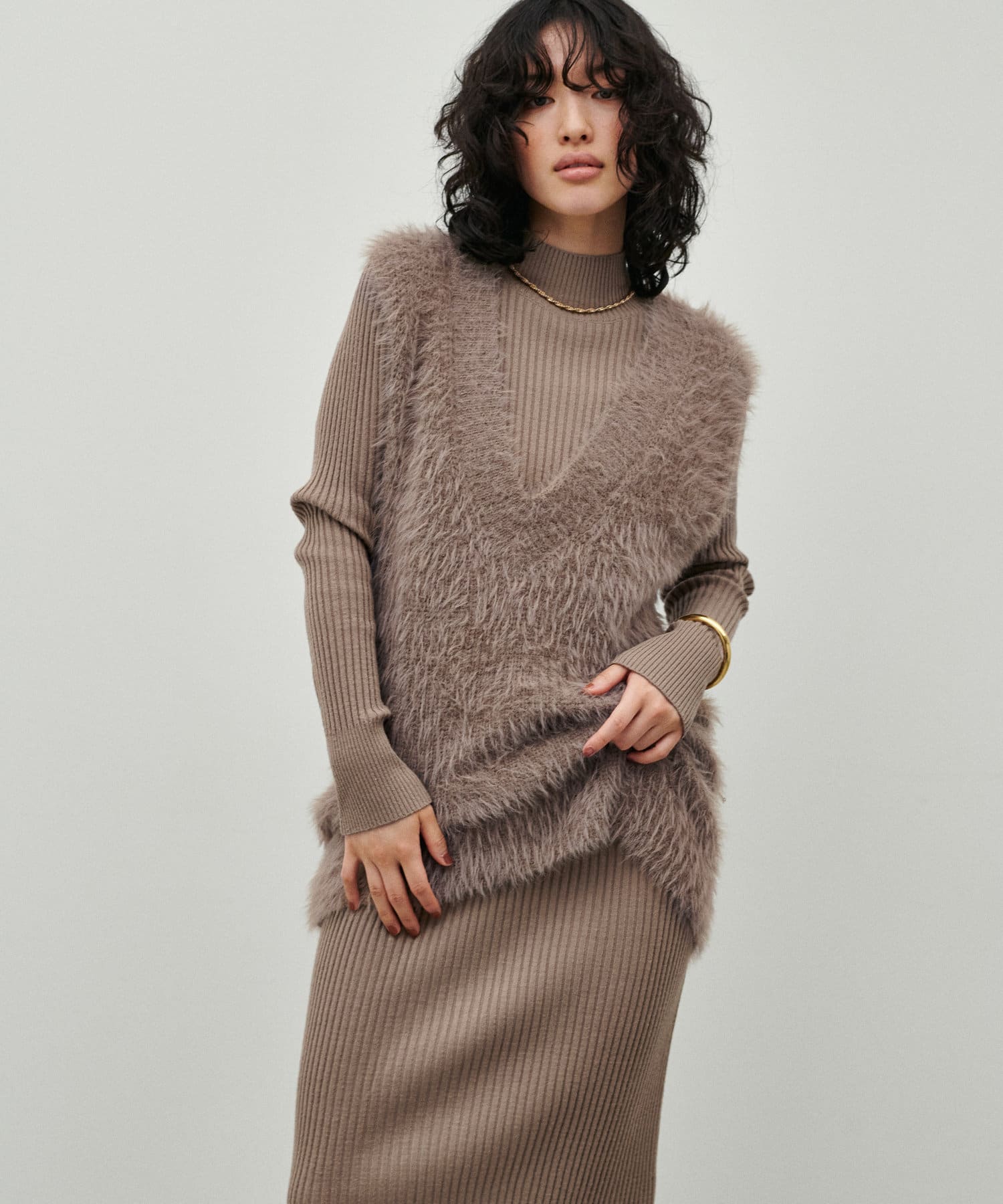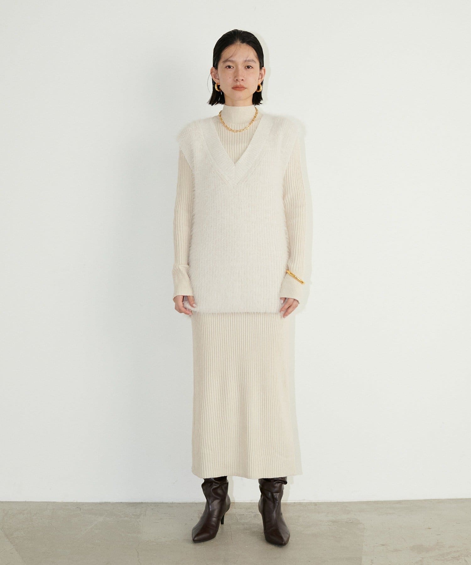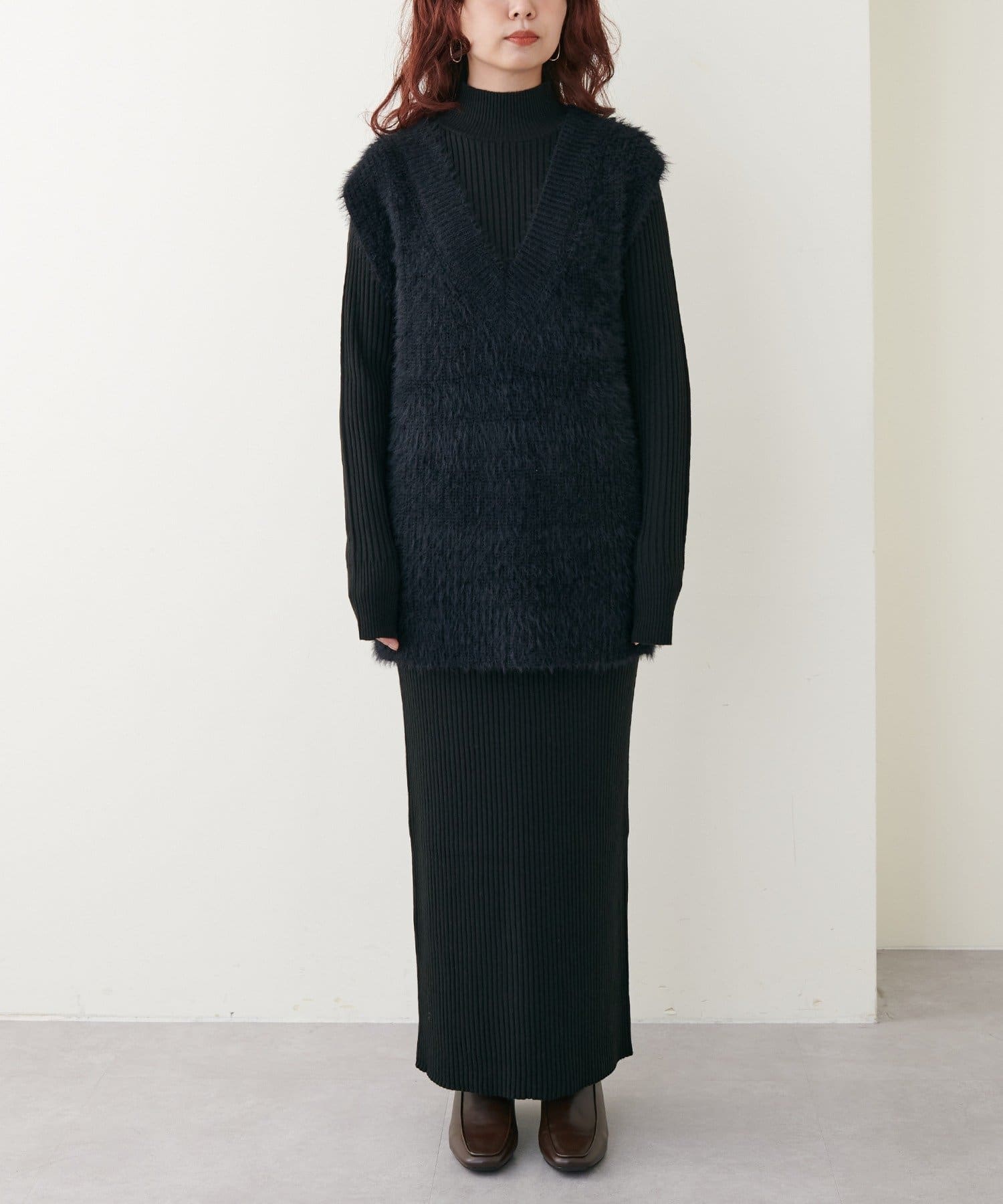 シンプルなリブのニットワンピースに同色のフェザーベストがセットになったアイテム。