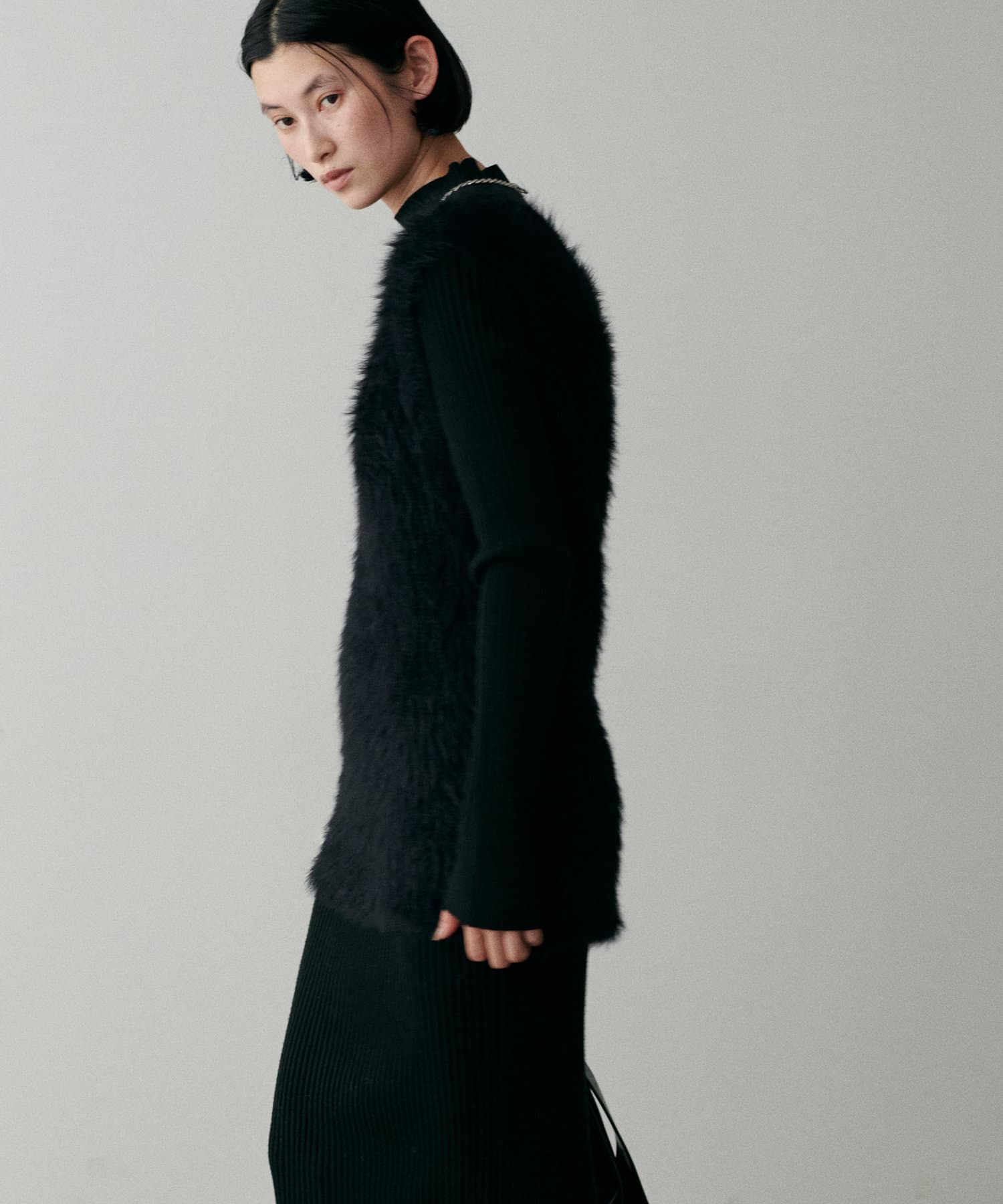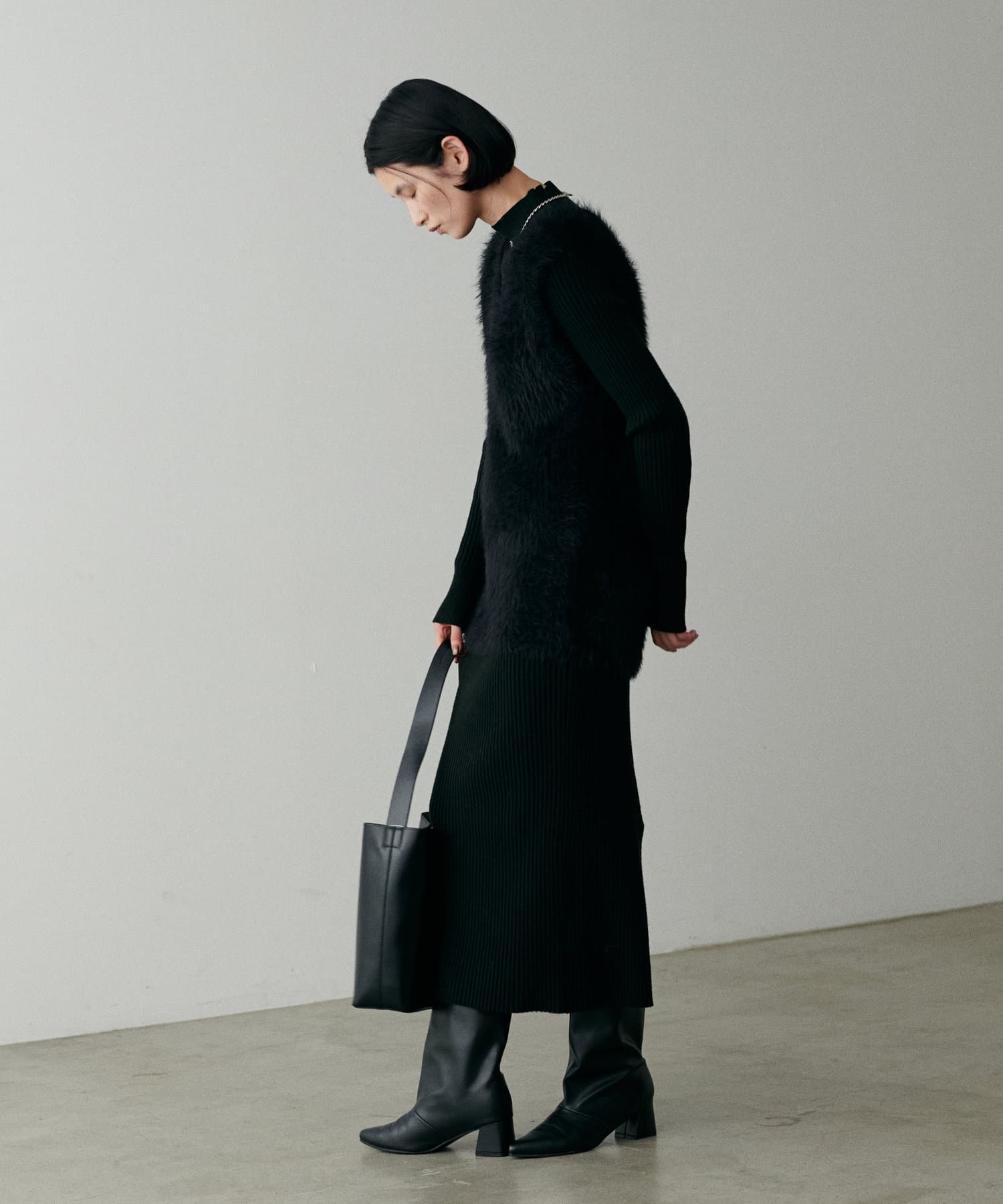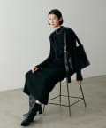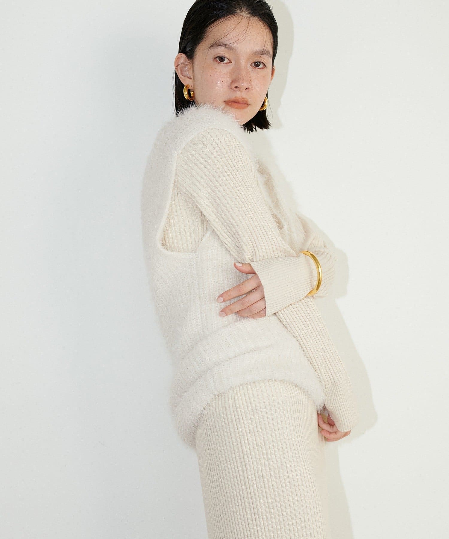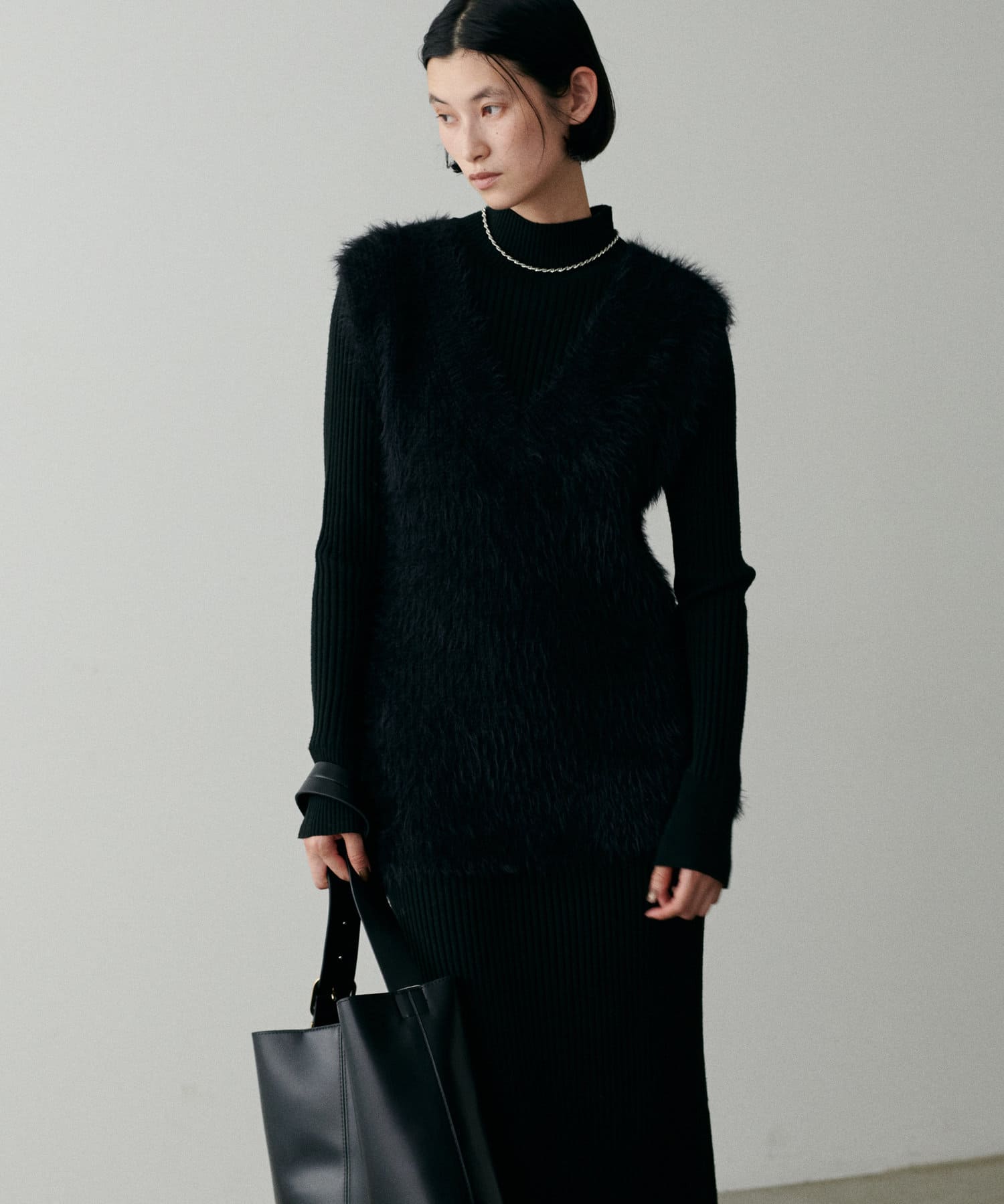 シンプルなリブのニットワンピースに同色のフェザーベストがセットになったアイテム。