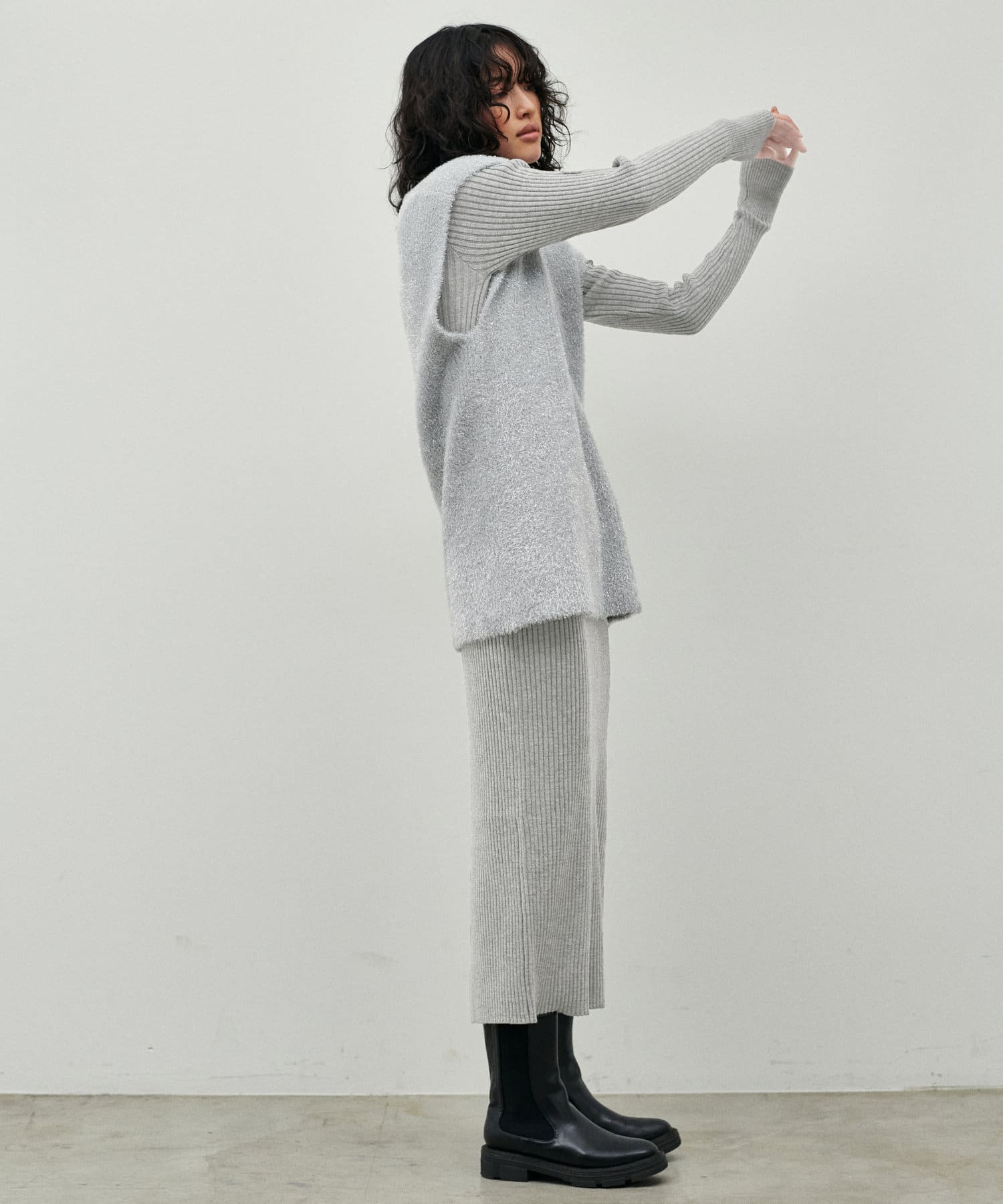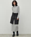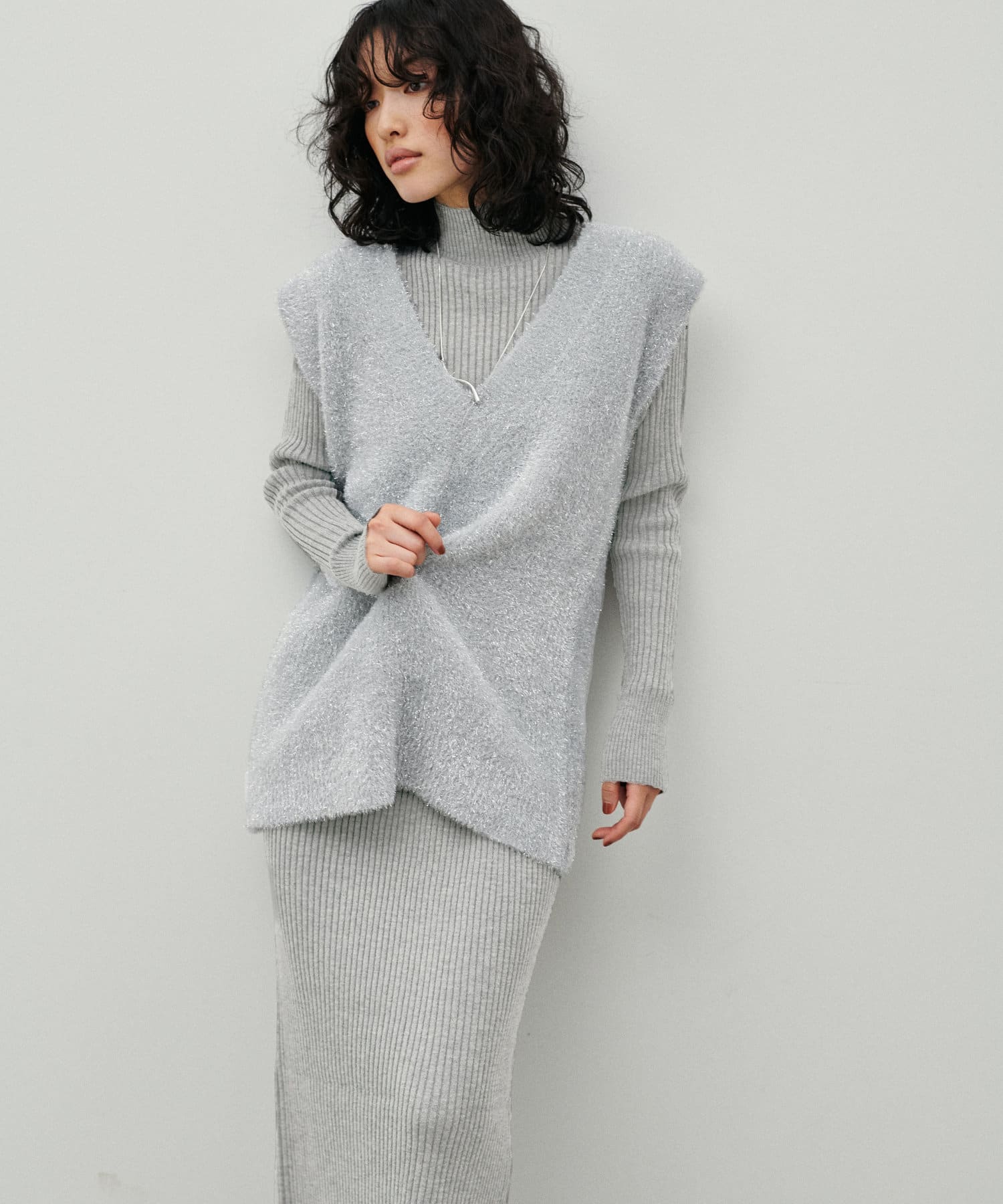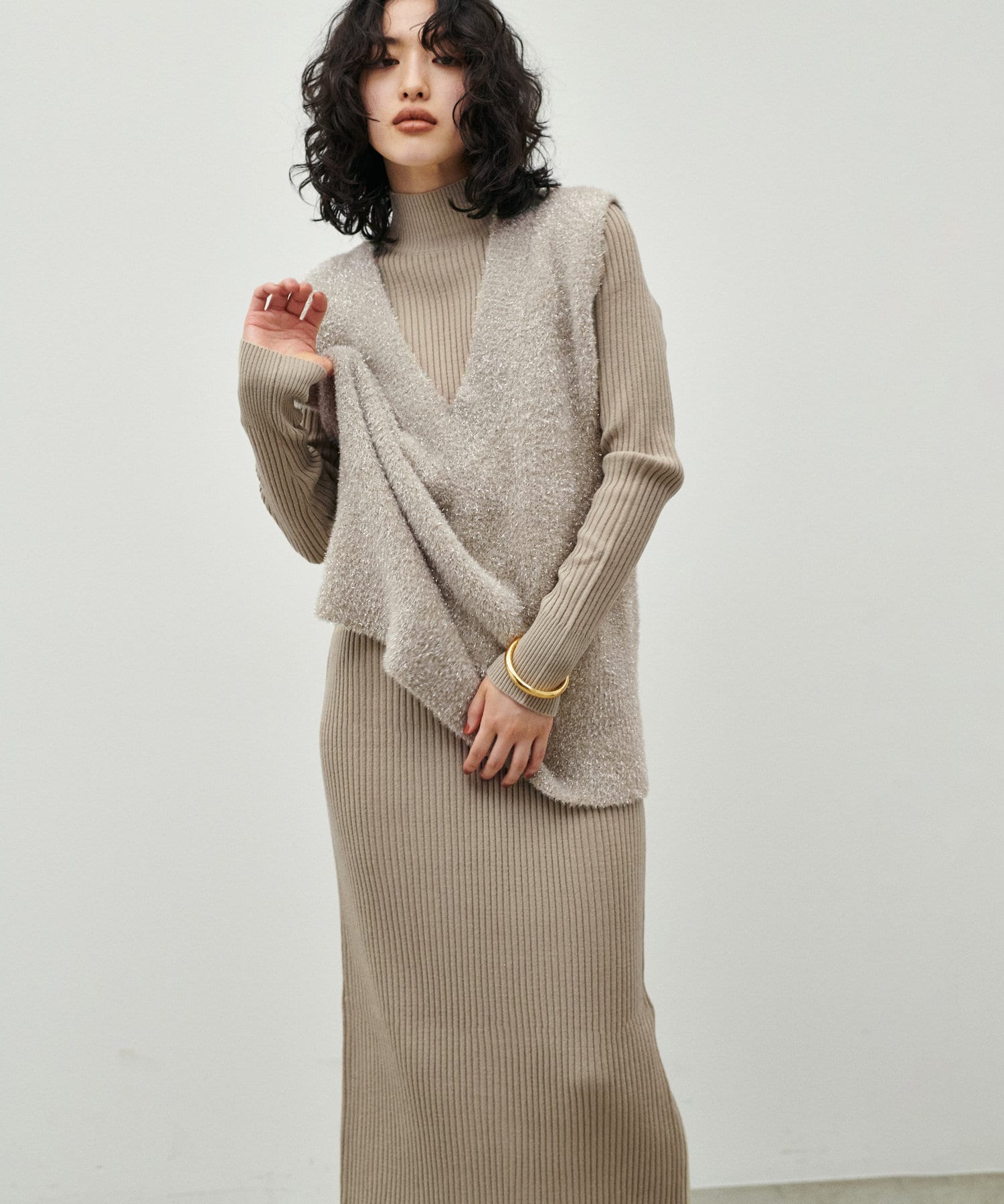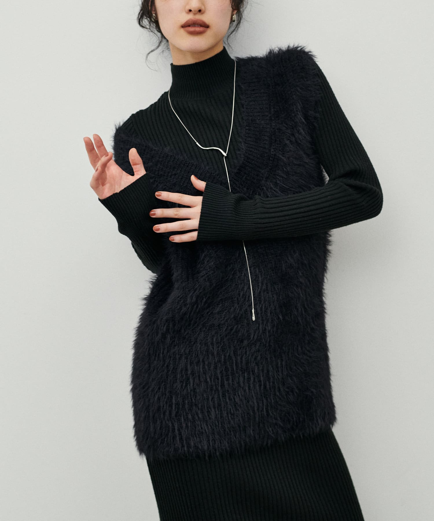シンプルなリブのニットワンピースに同色のフェザーベストがセットになったアイテム。