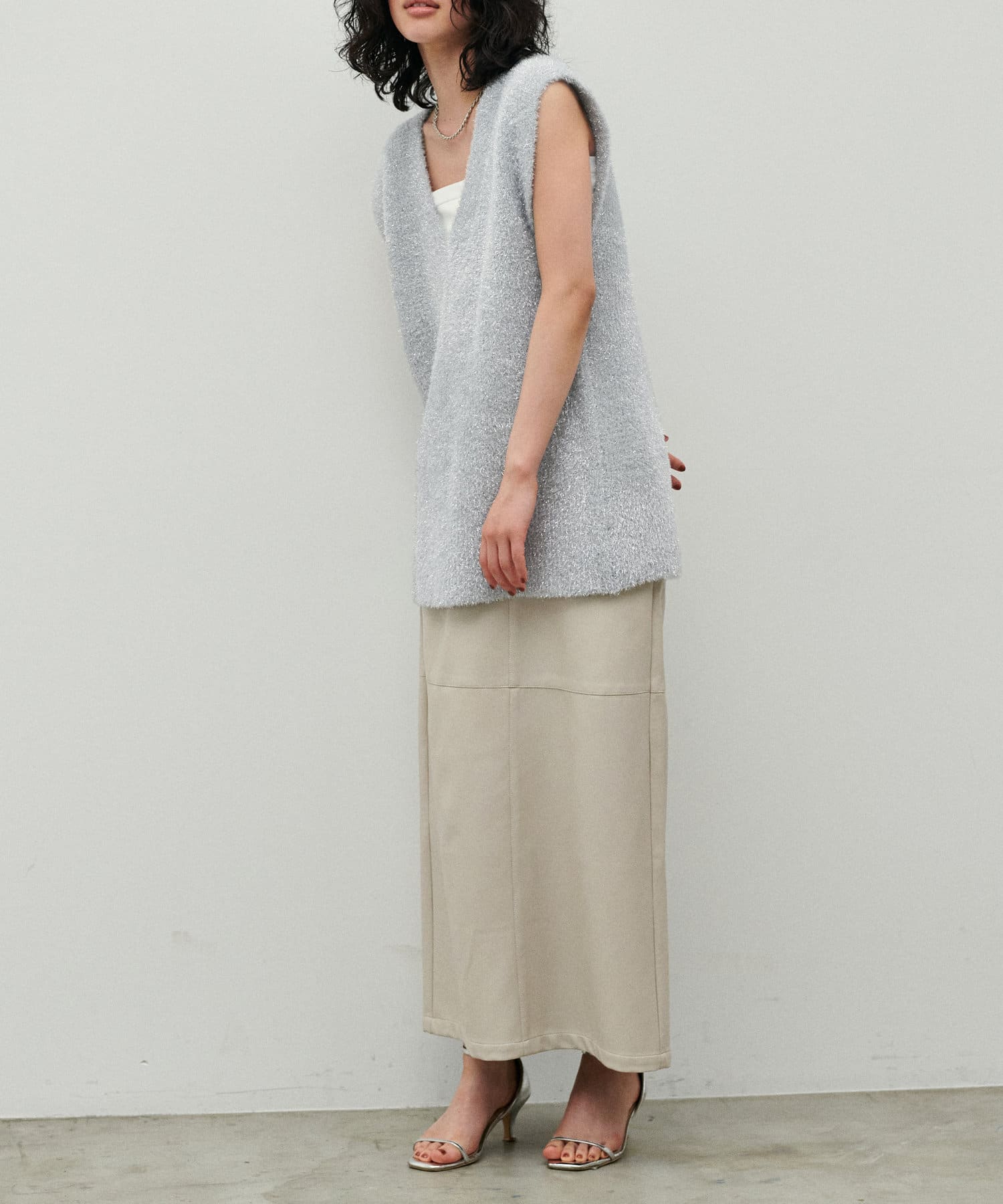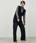 フェザーベストは深いVネック開きデザインにすることで、すっきりとした印象に。