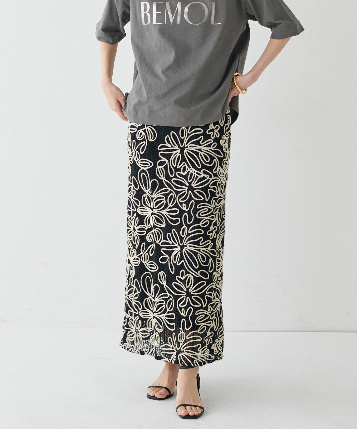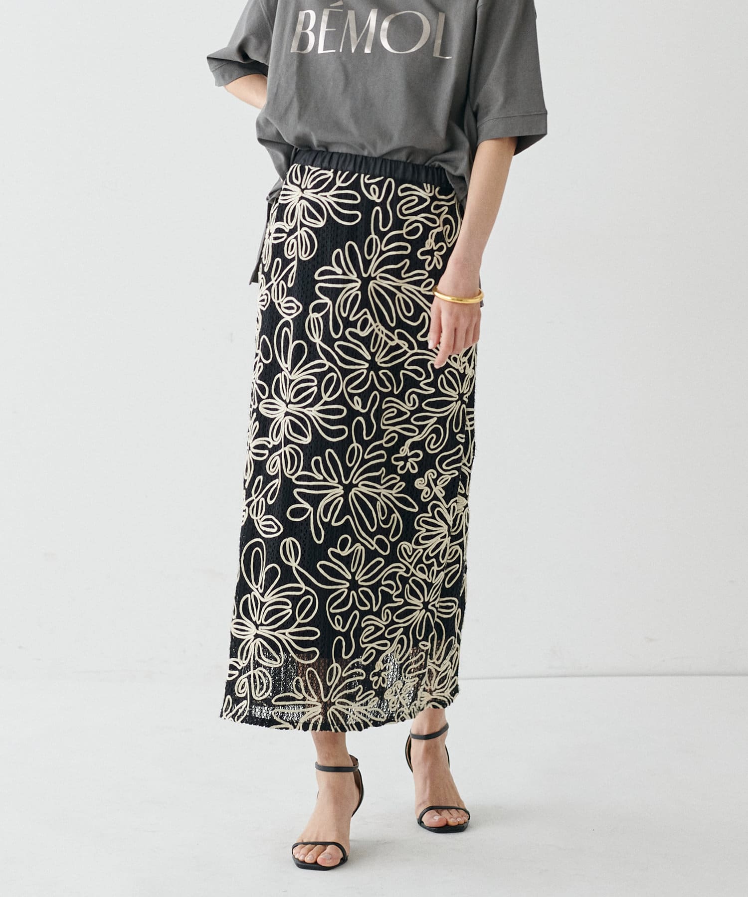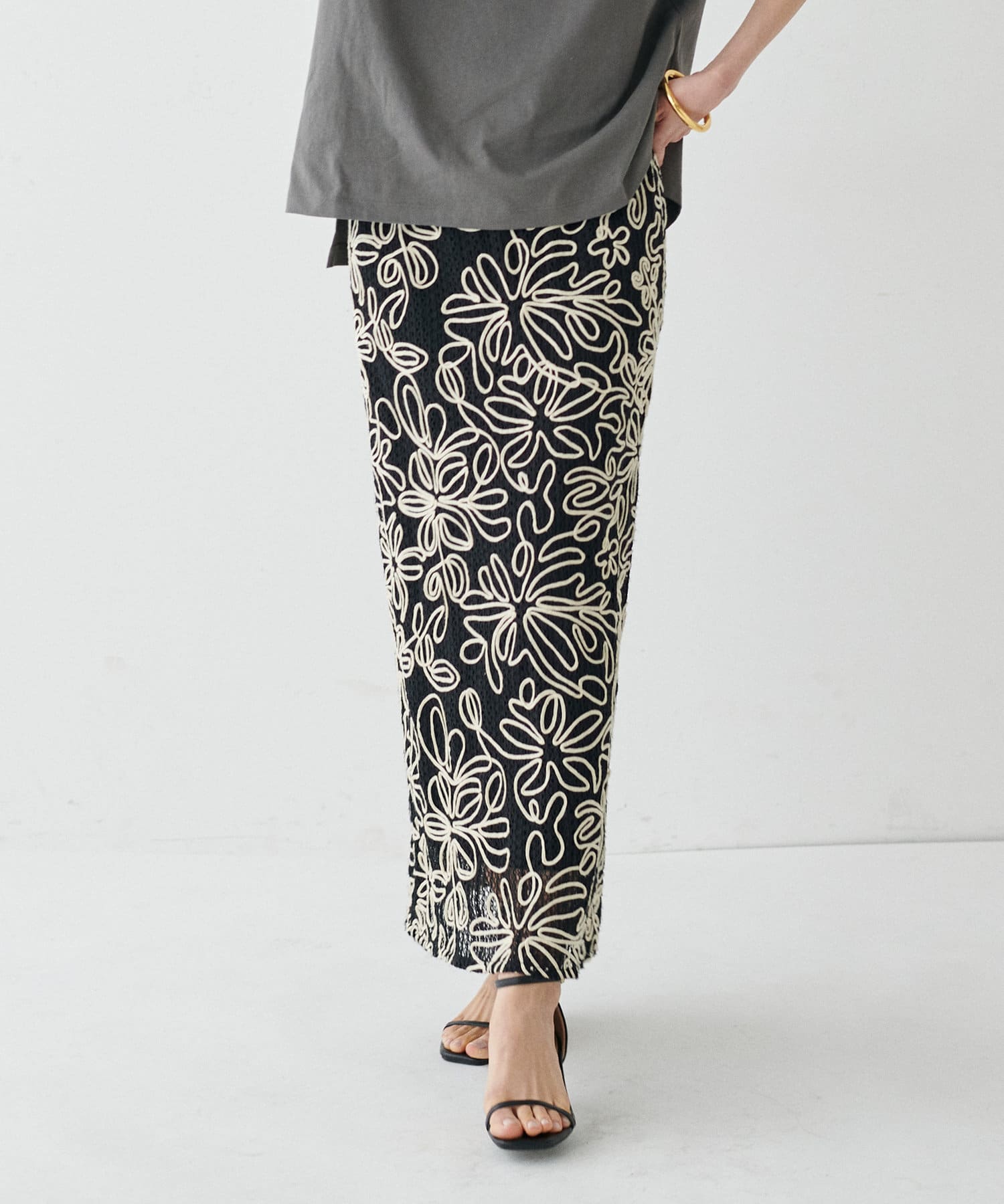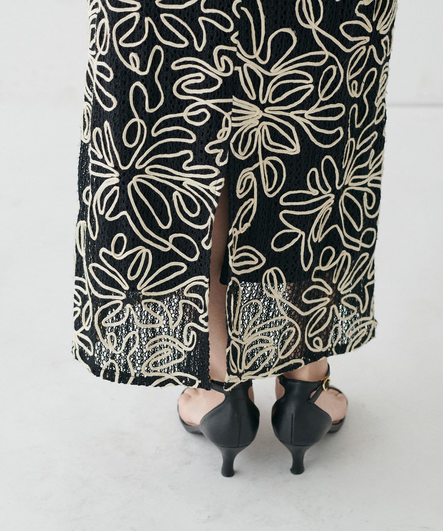 花柄のようなコード刺繍が存在感のあるレーススカート。