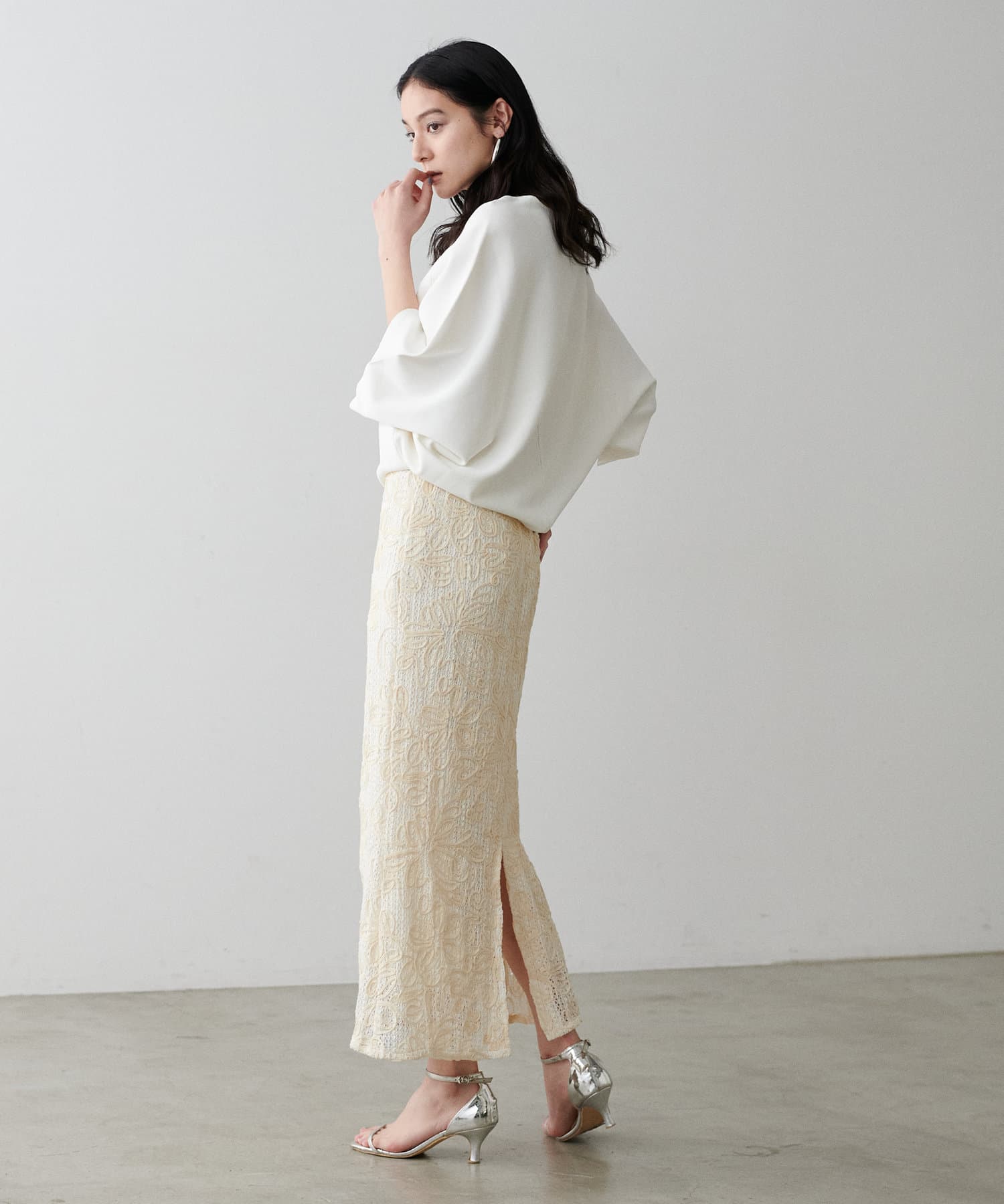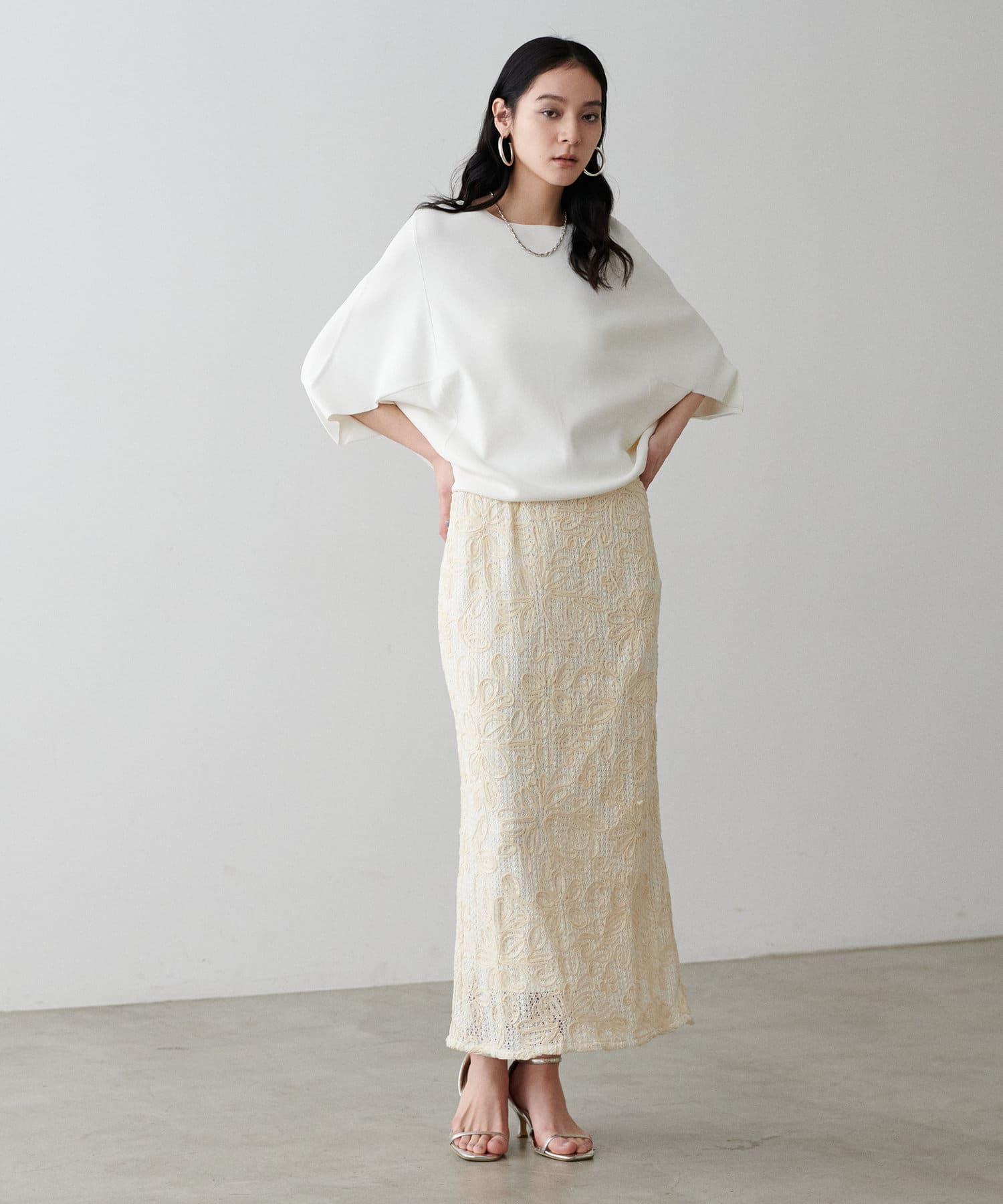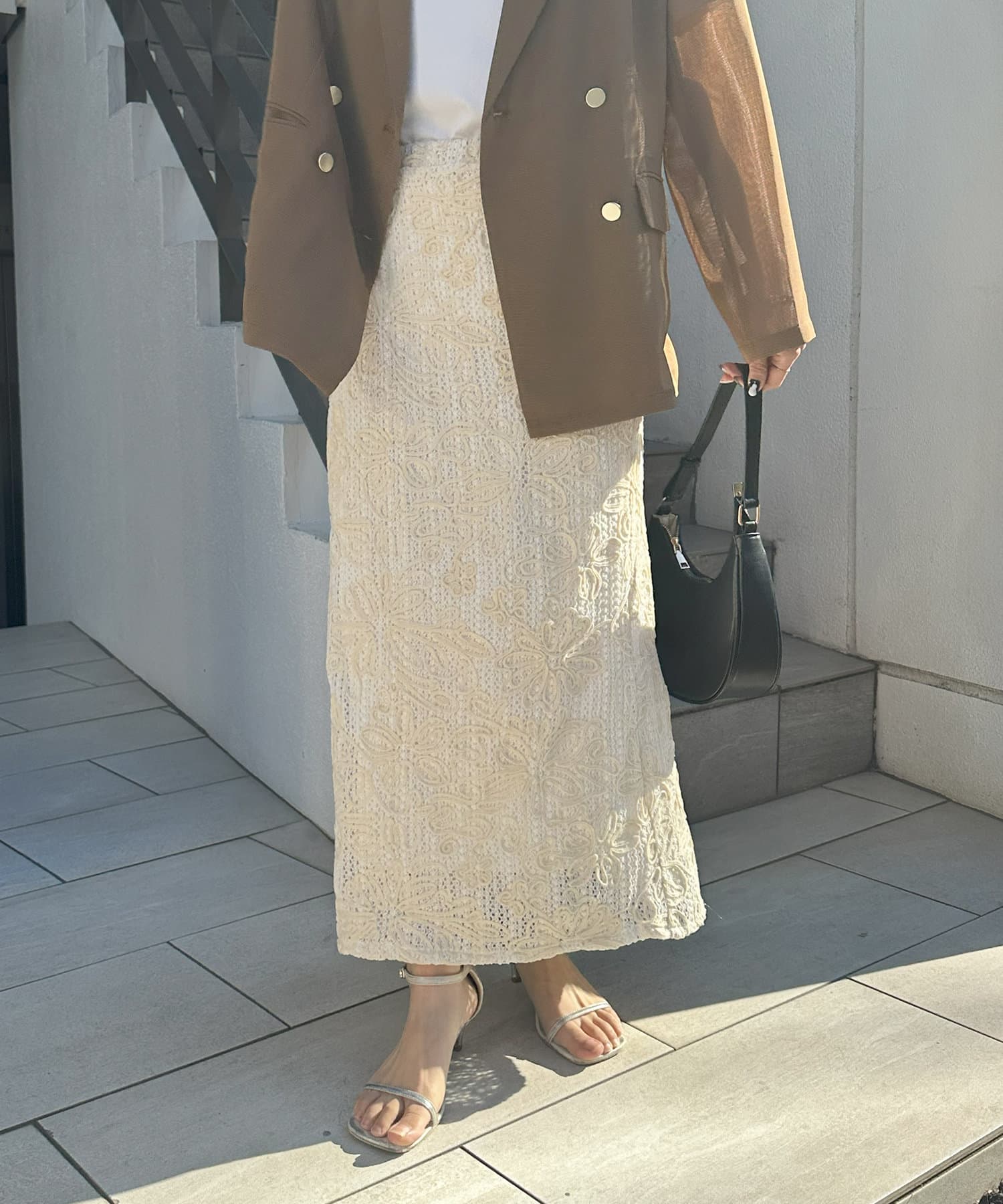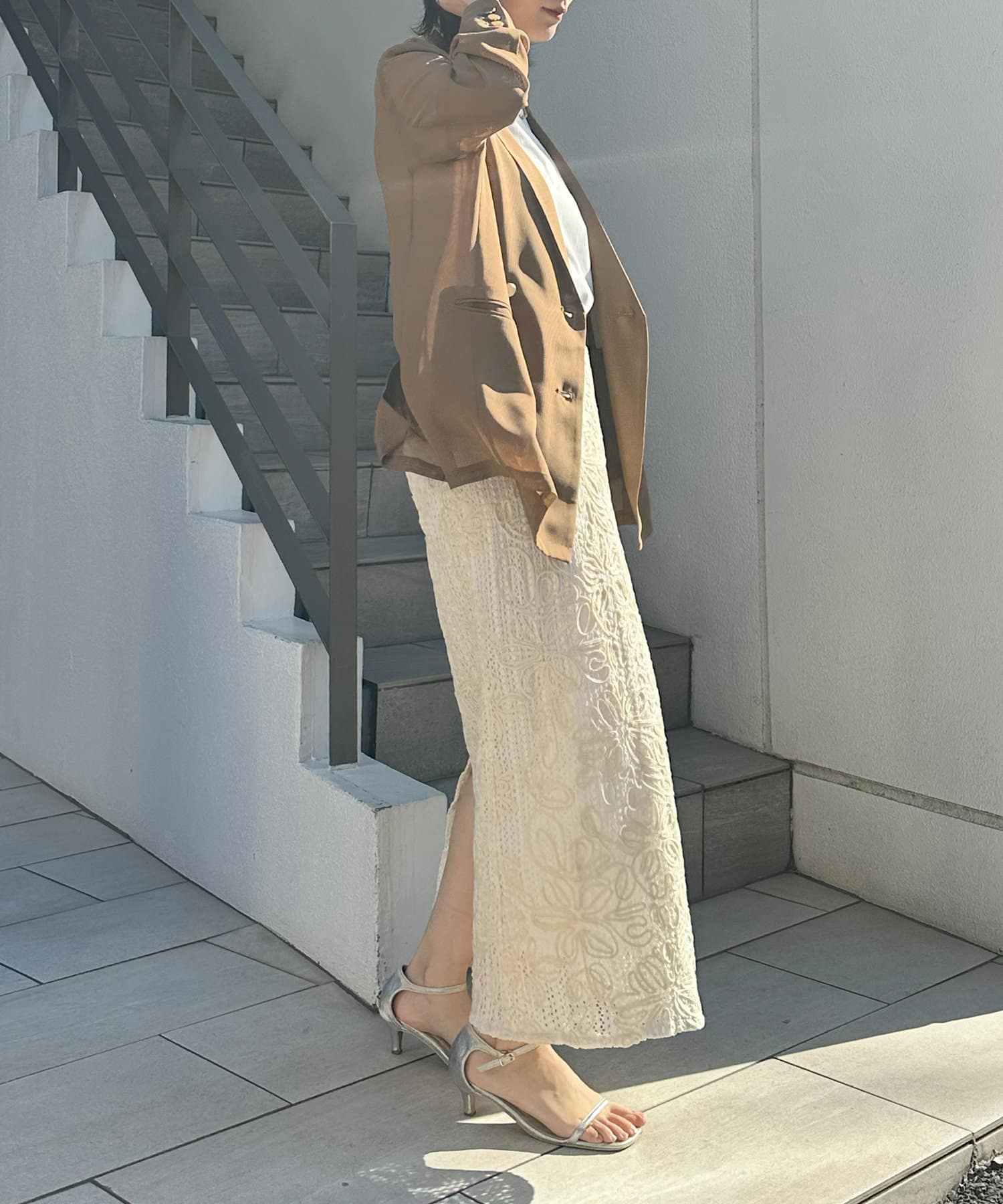 花柄のようなコード刺繍が存在感のあるレーススカート。