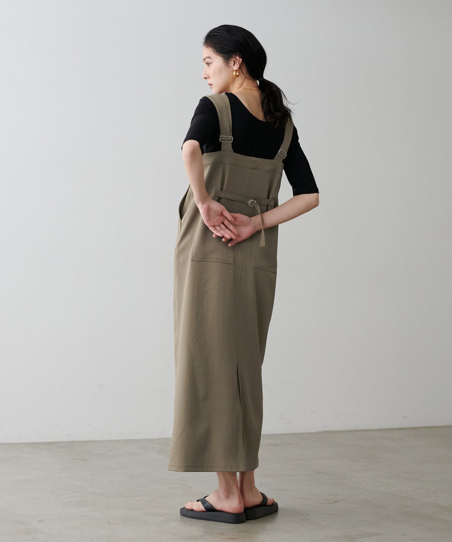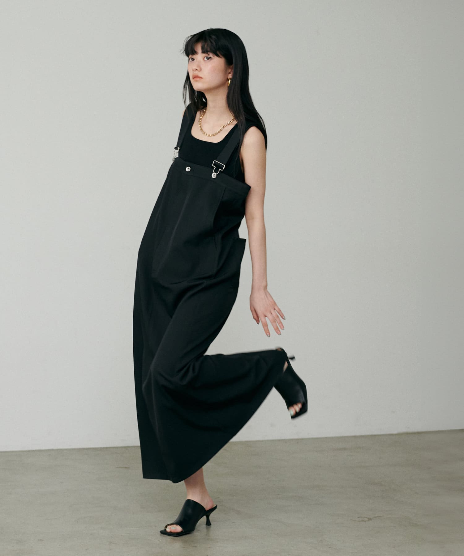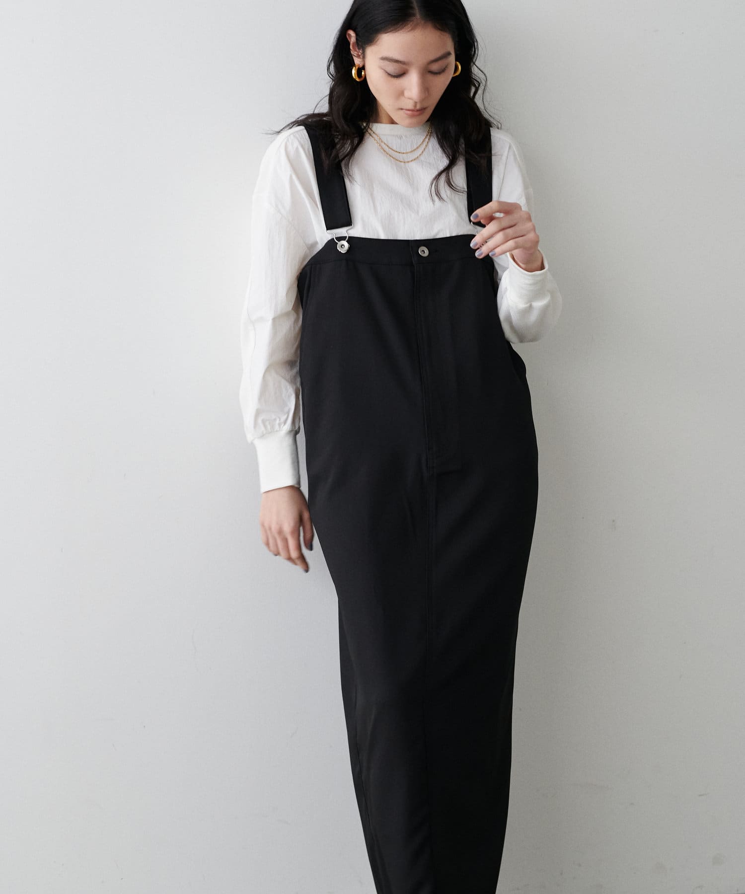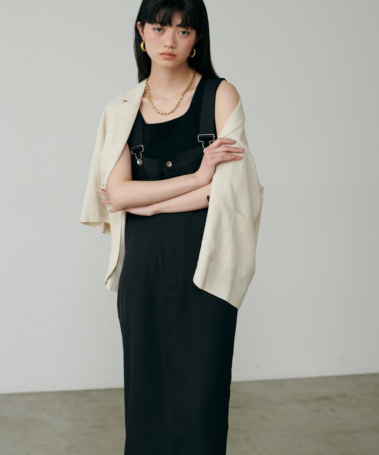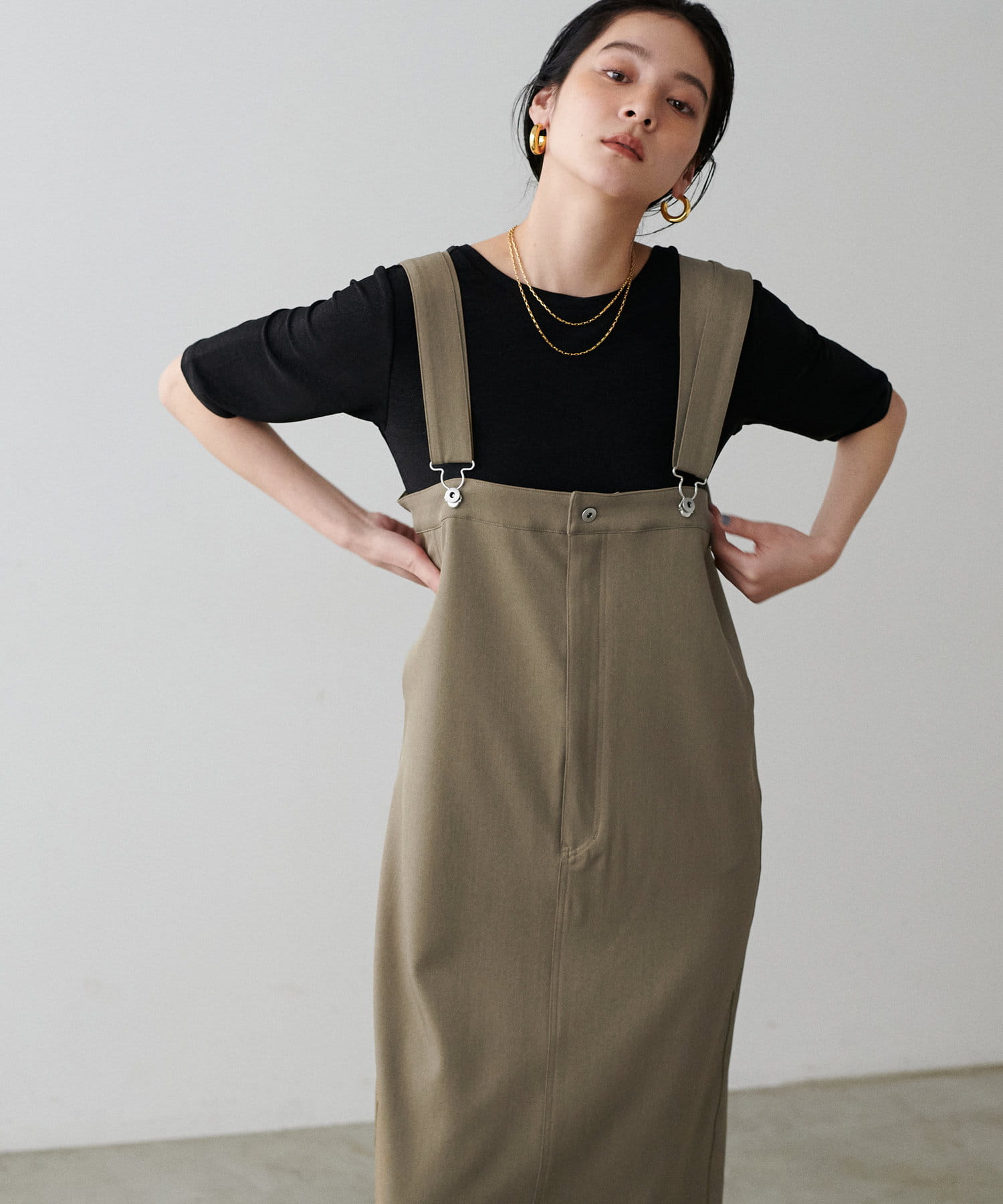 昨年大人気だったデニムサロペットがきれいめ素材になって再登場。