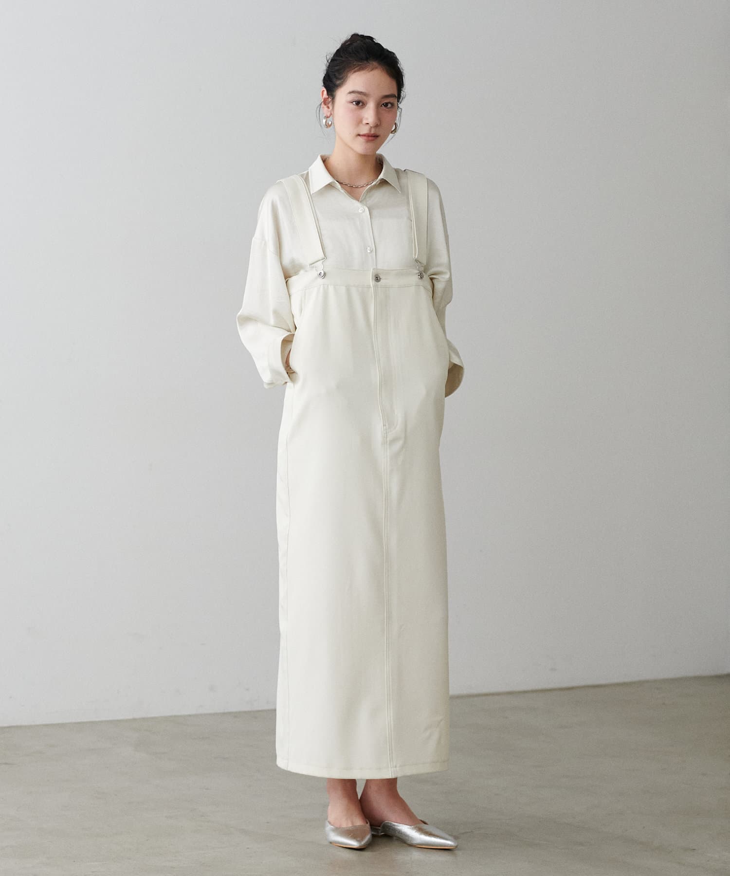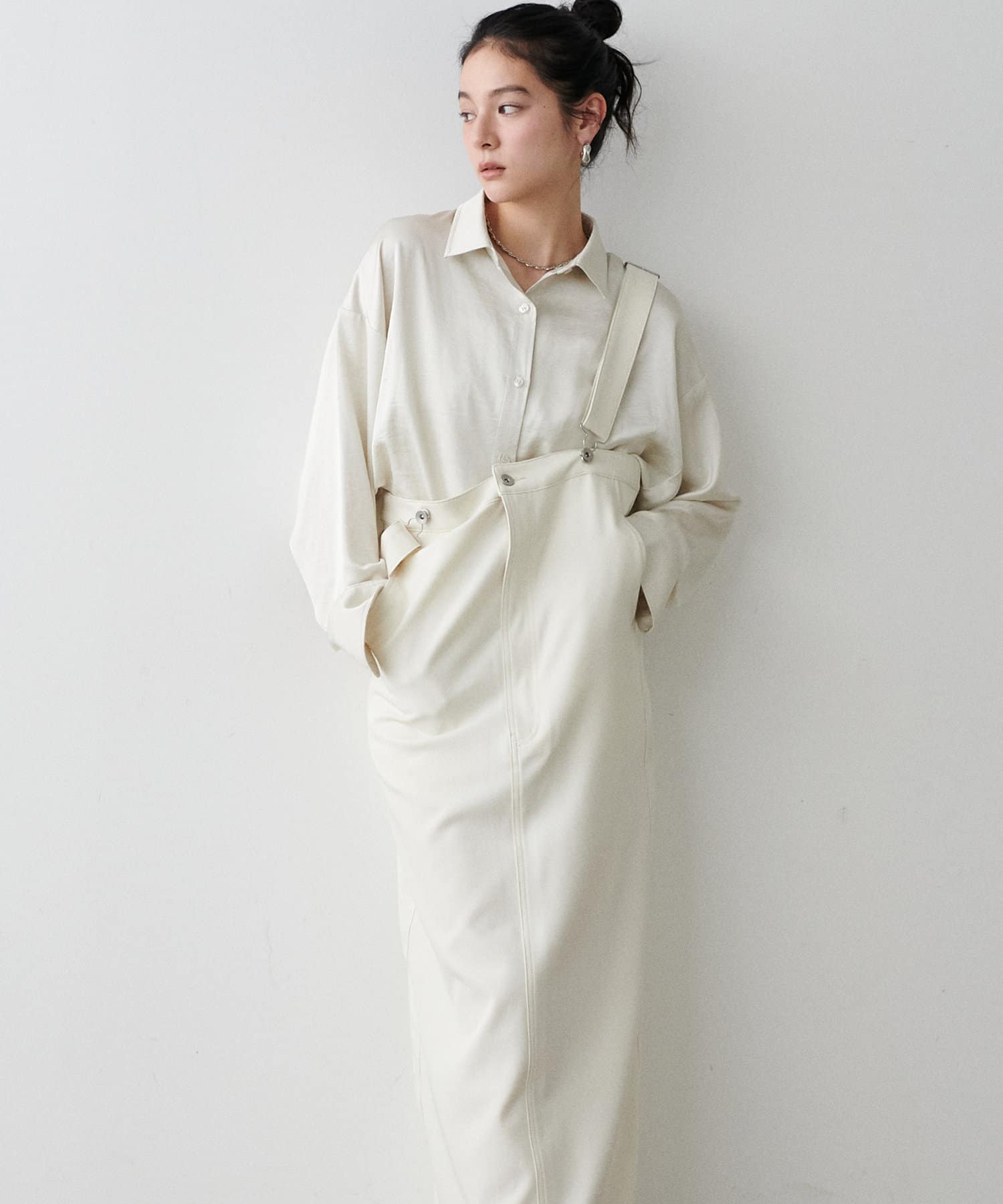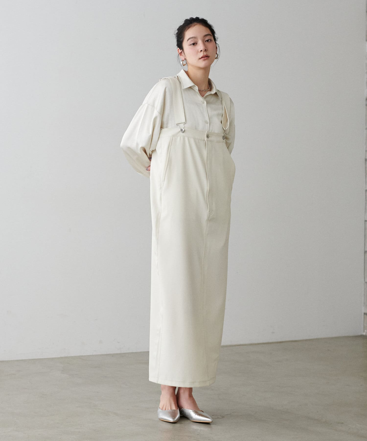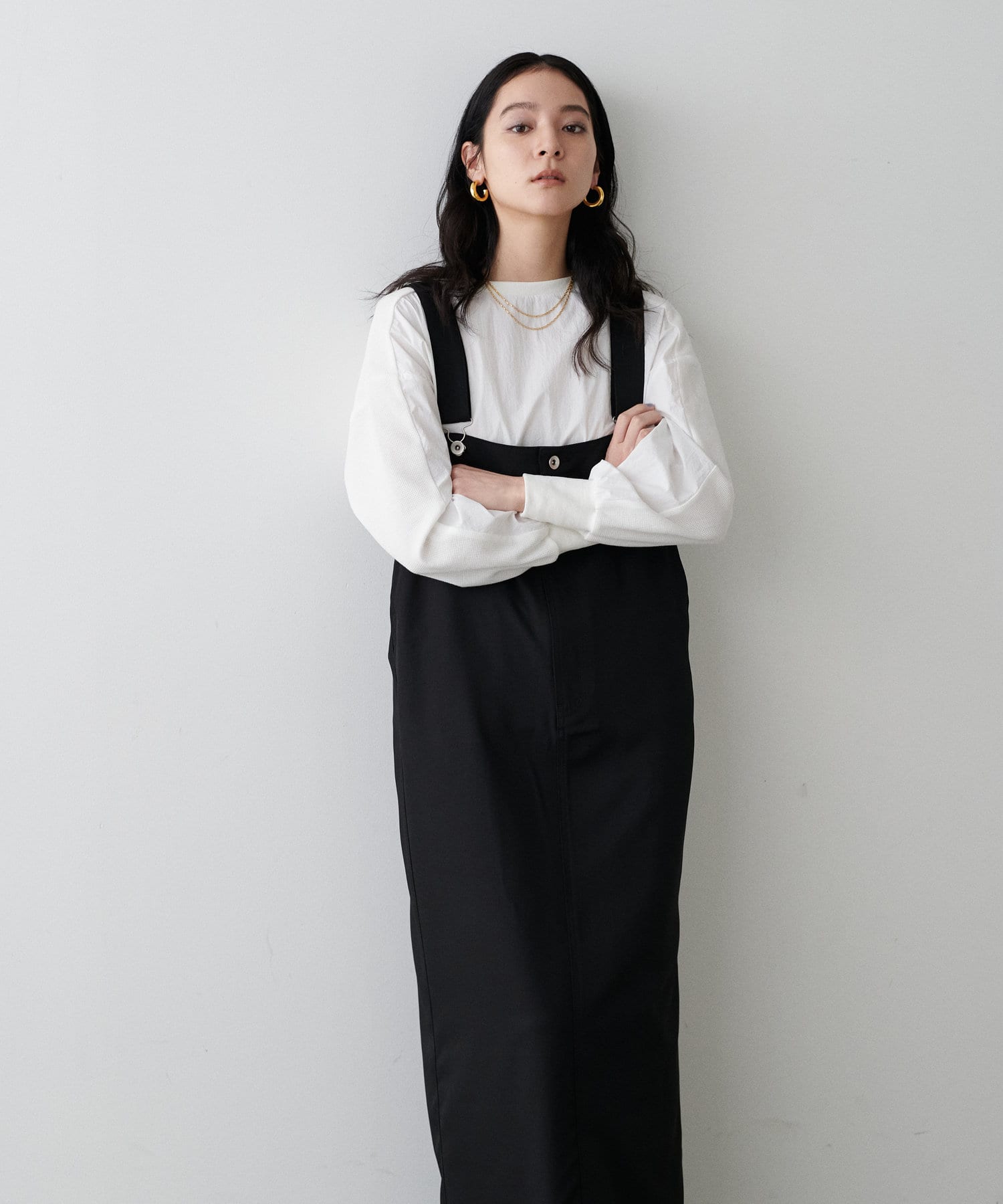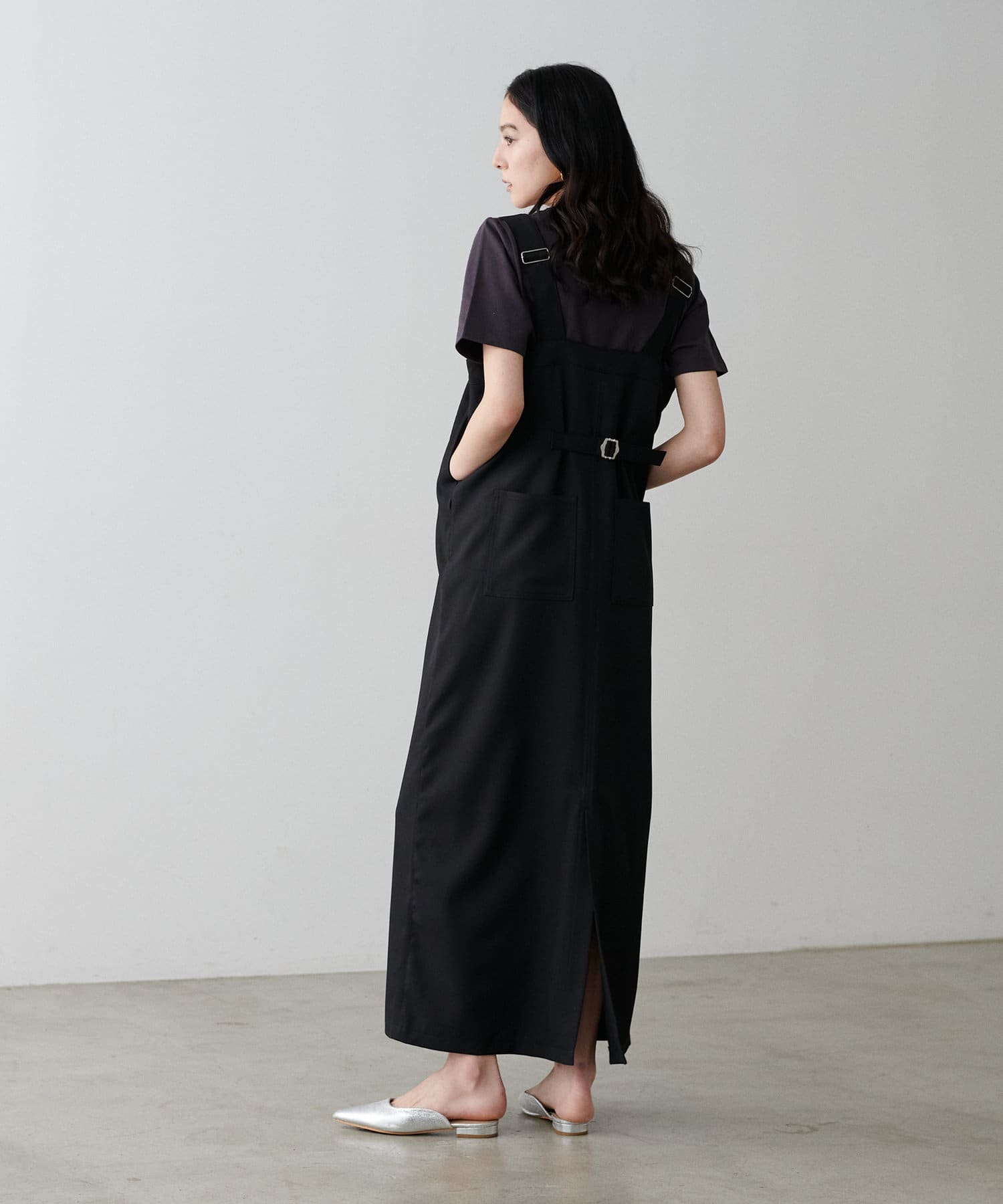 昨年大人気だったデニムサロペットがきれいめ素材になって再登場。