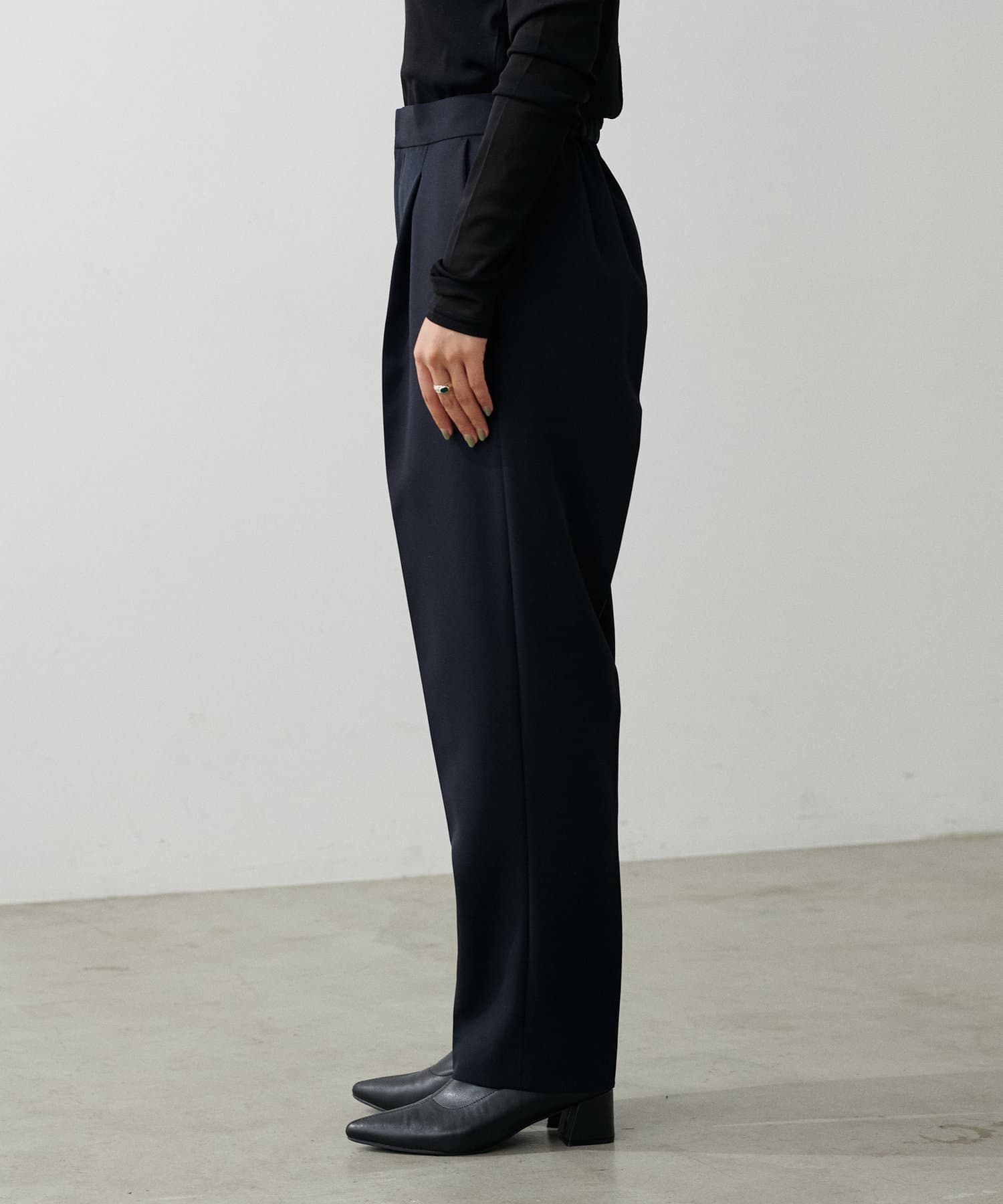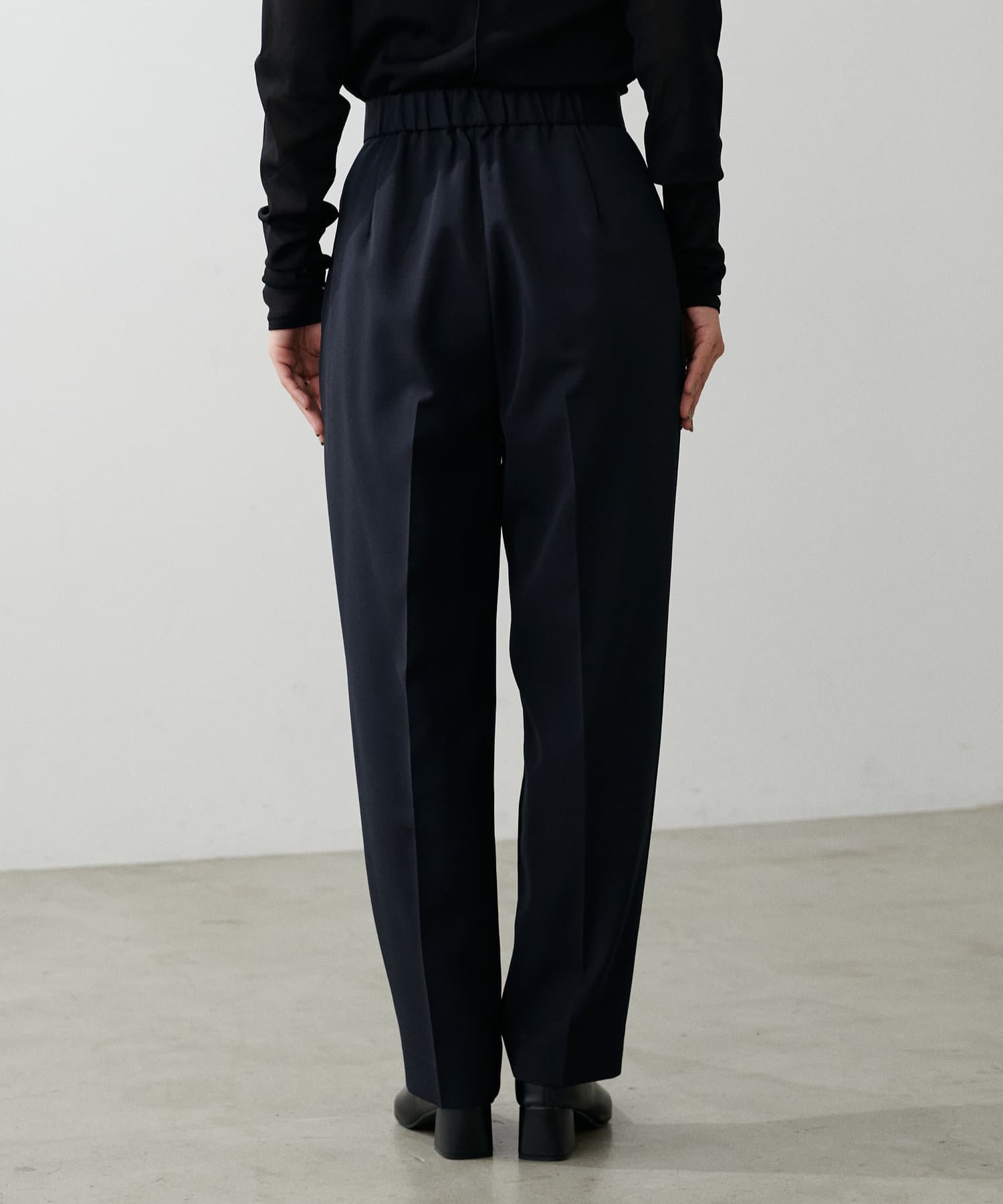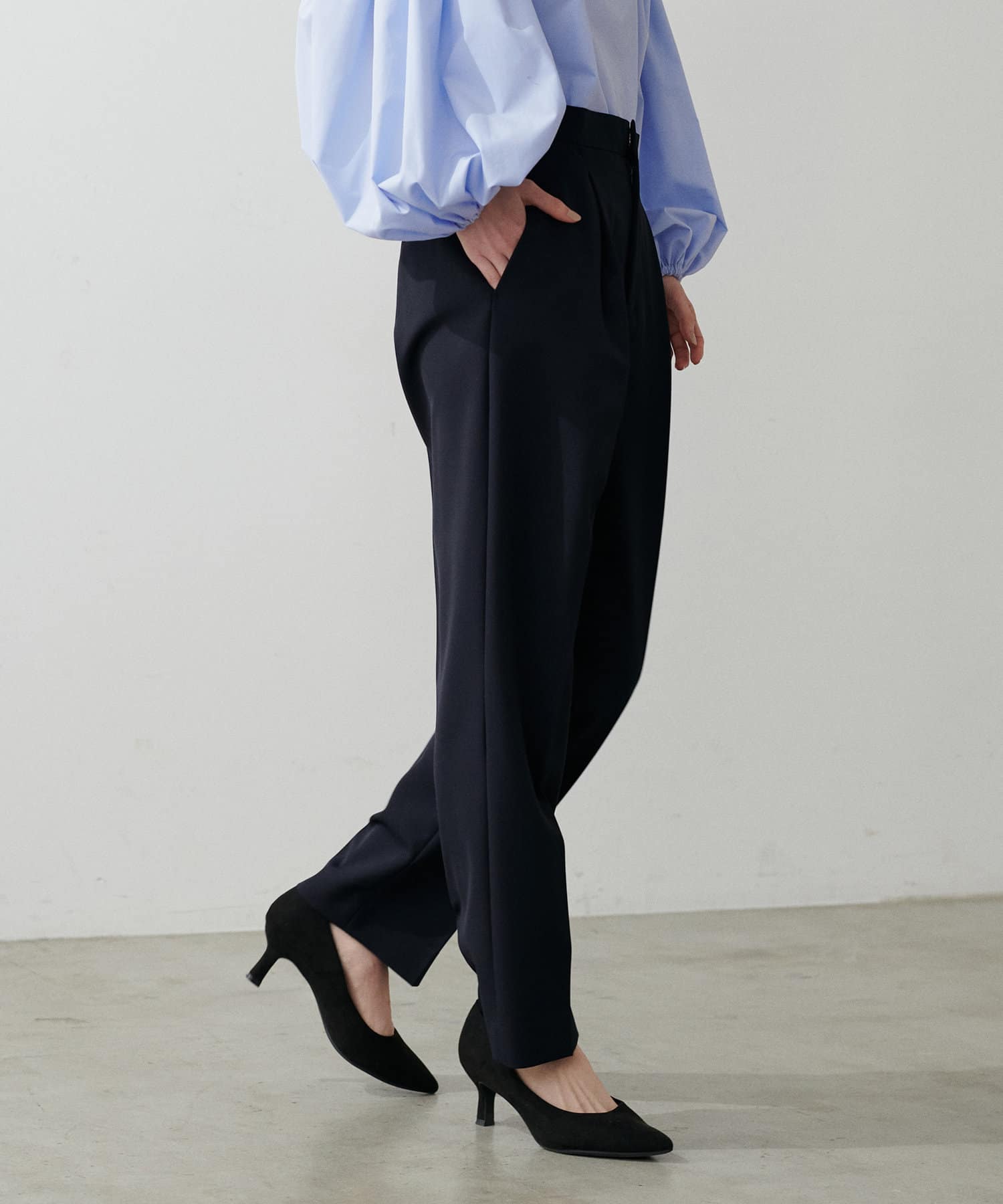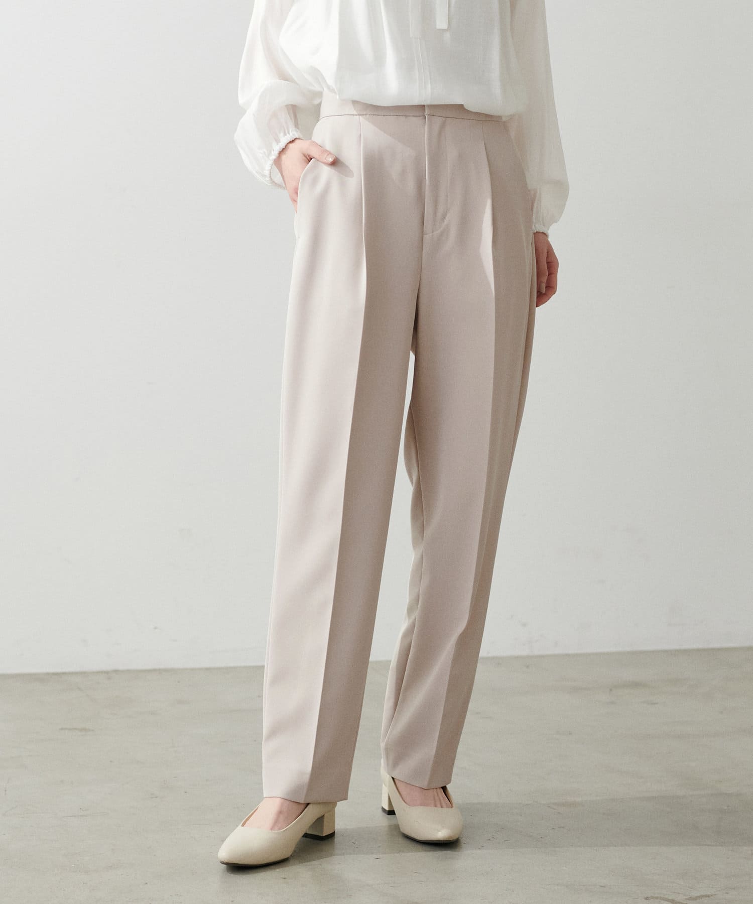 程よく肉感のある素材で脚のラインを拾わず、ウエスト位置もやや高めに設定することで、スタイルアップが叶う一枚です。