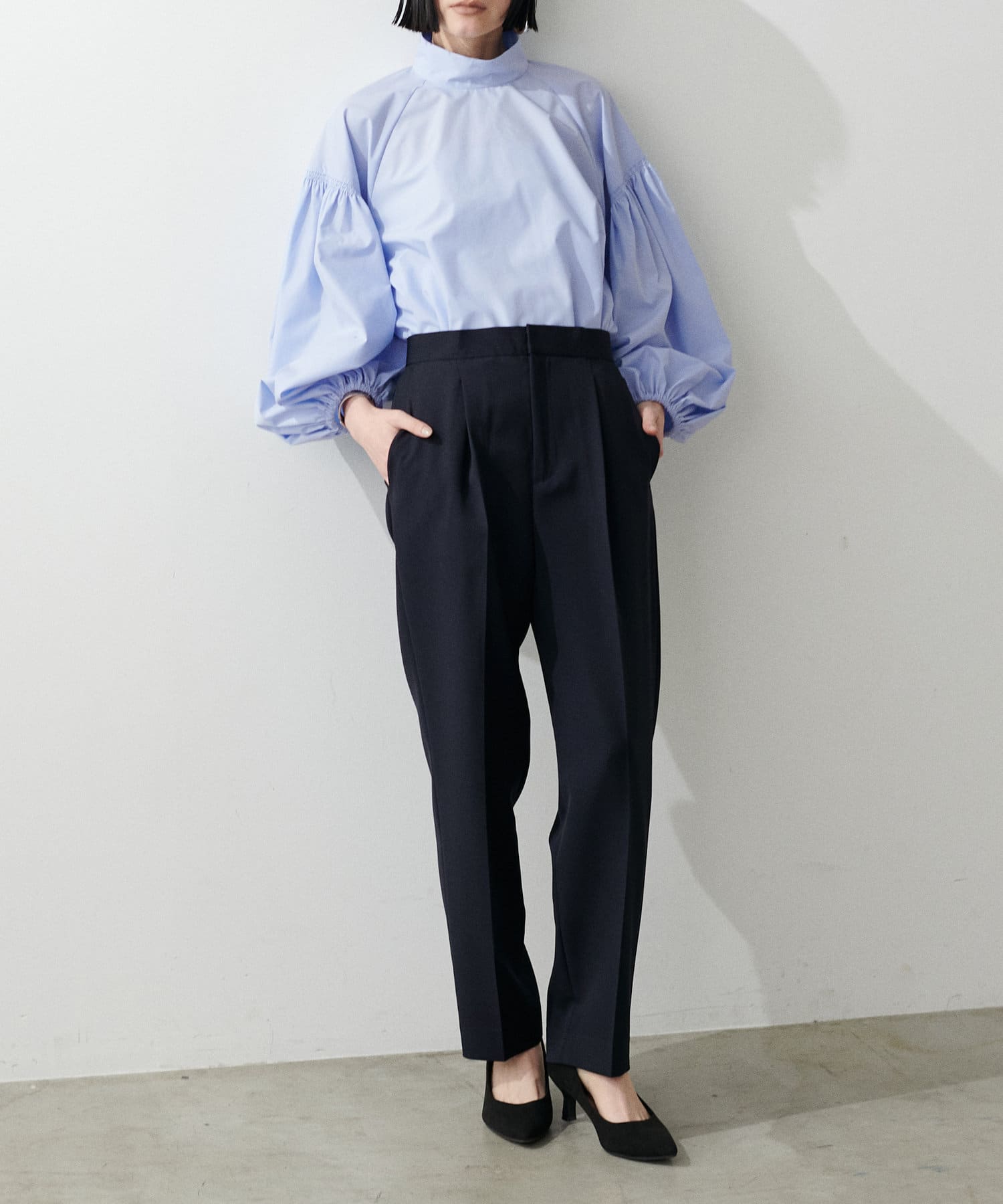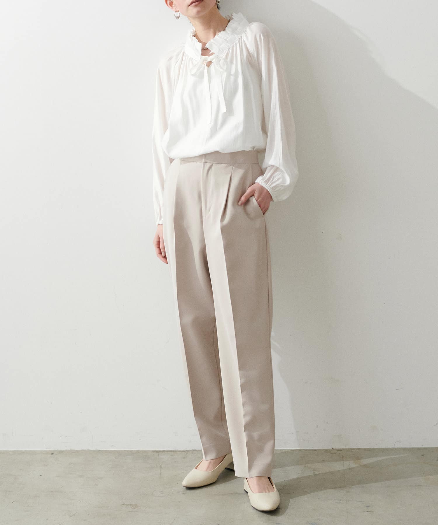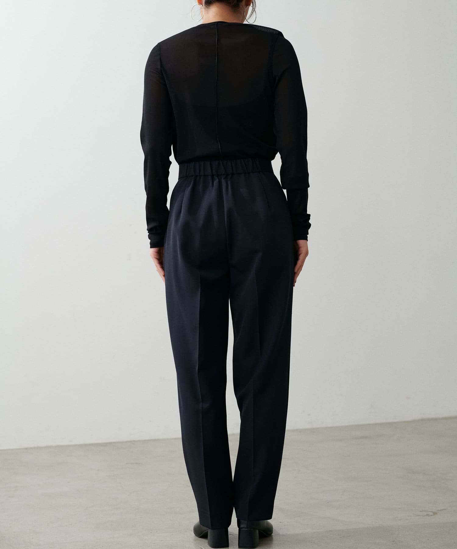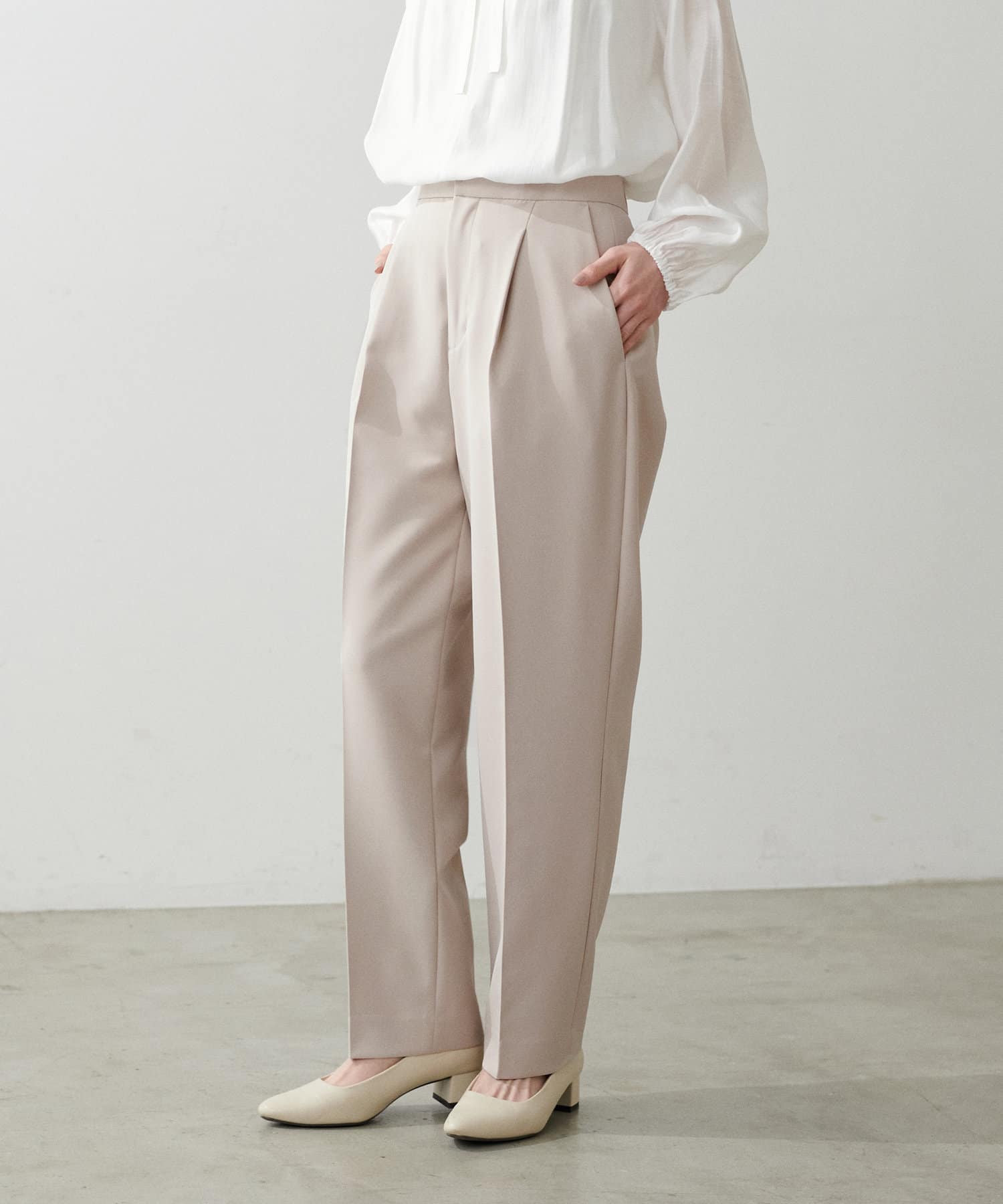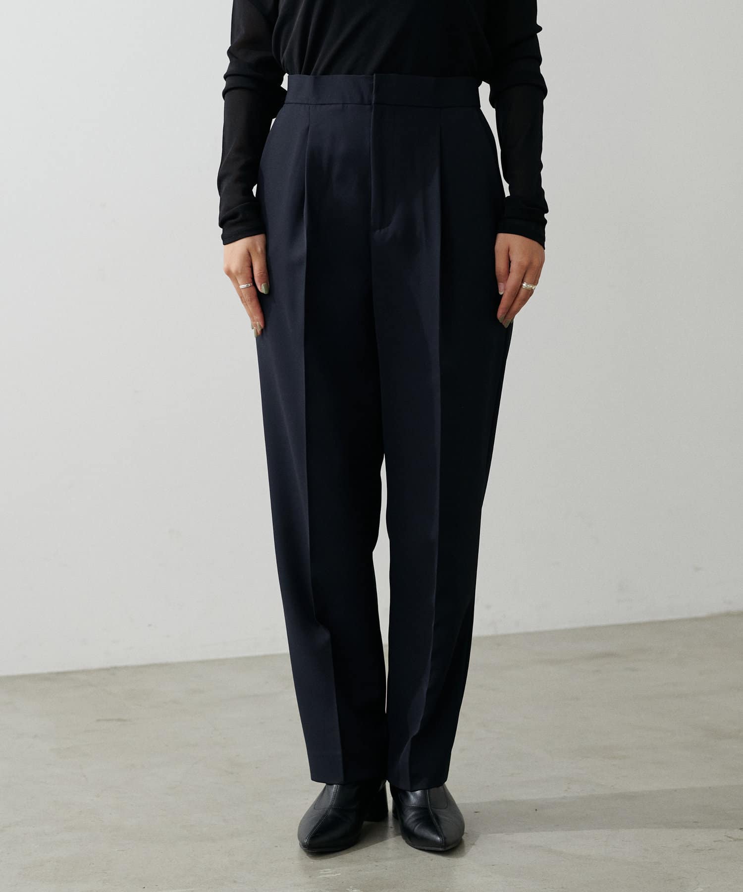 程よく肉感のある素材で脚のラインを拾わず、ウエスト位置もやや高めに設定することで、スタイルアップが叶う一枚です。