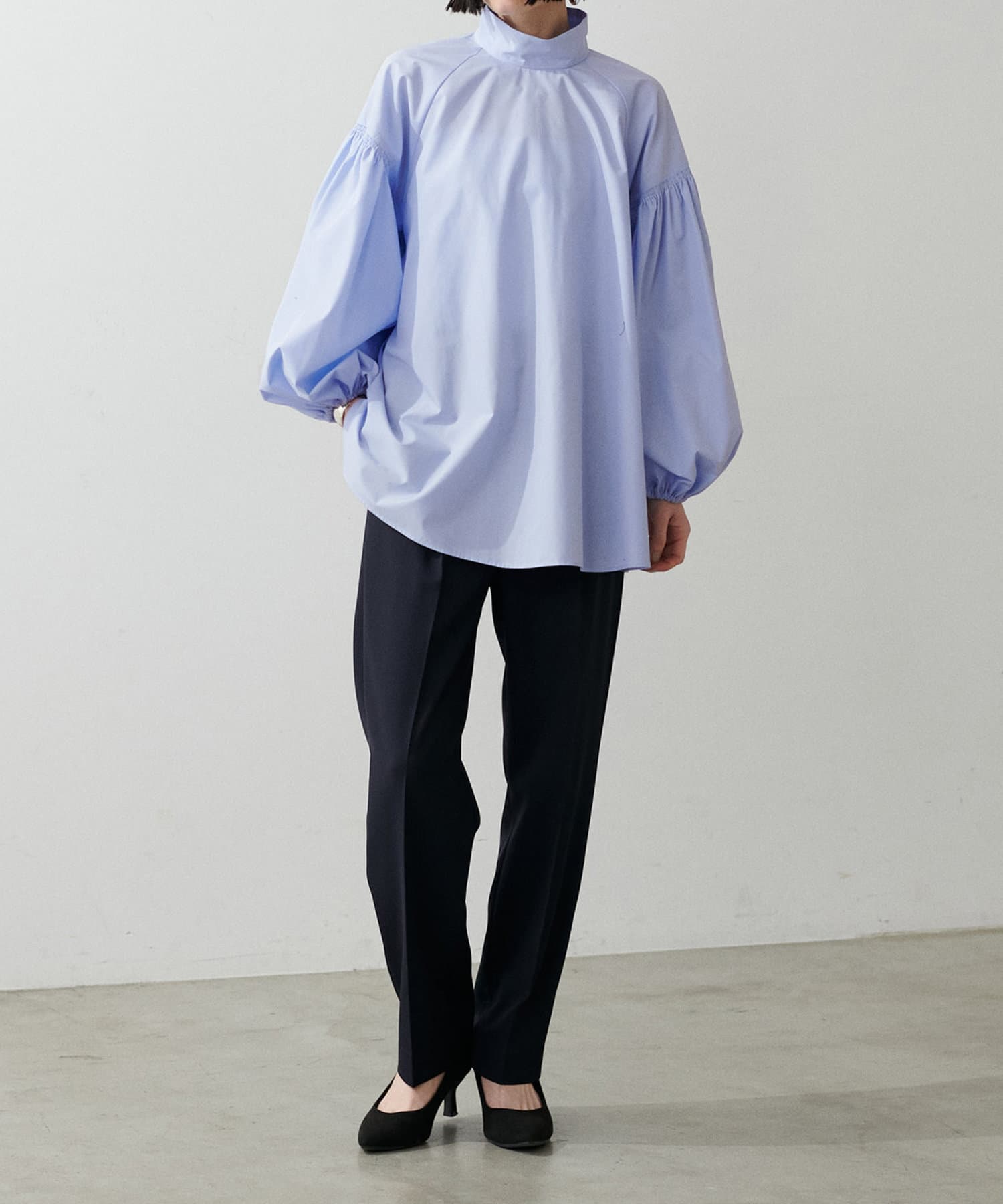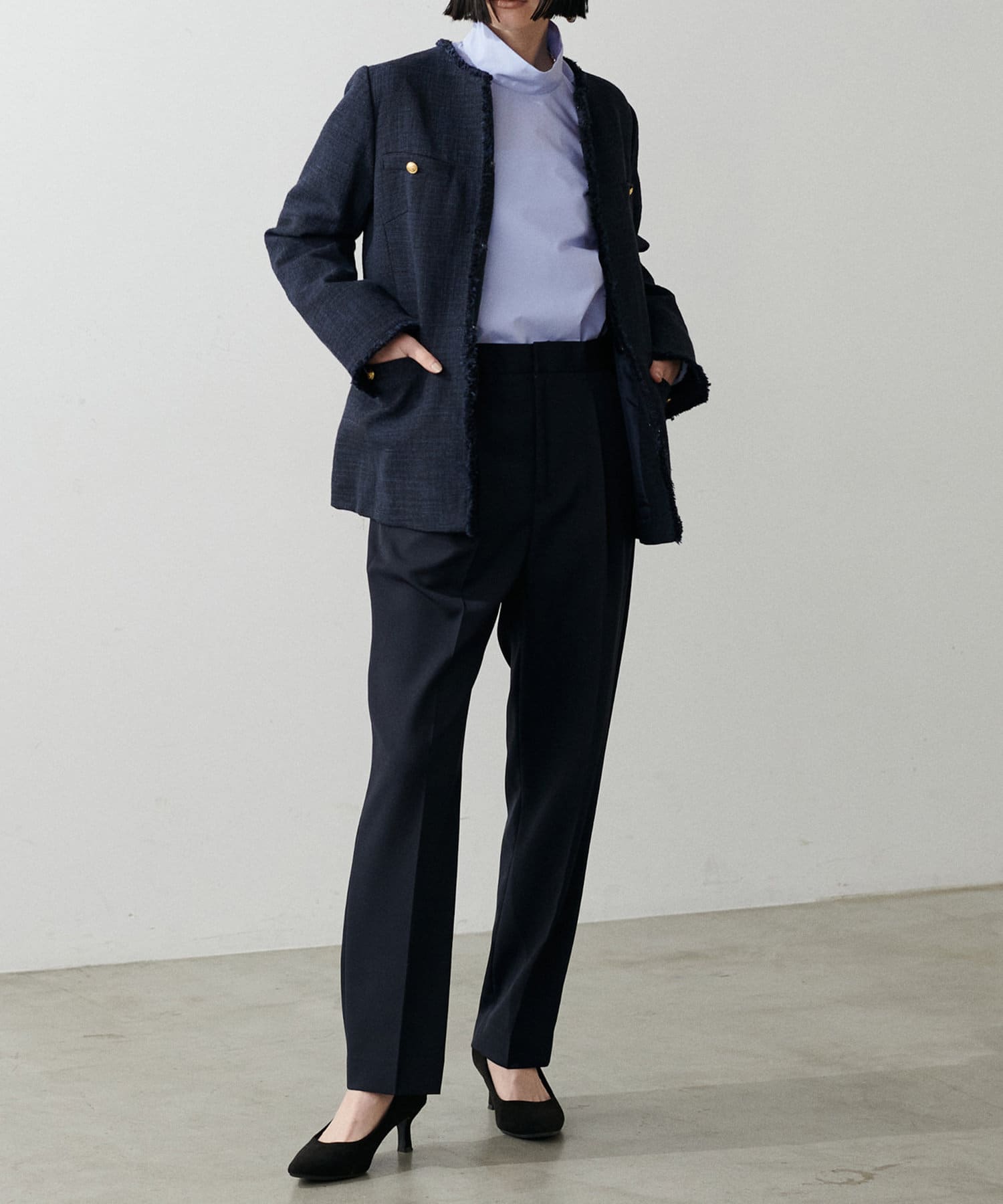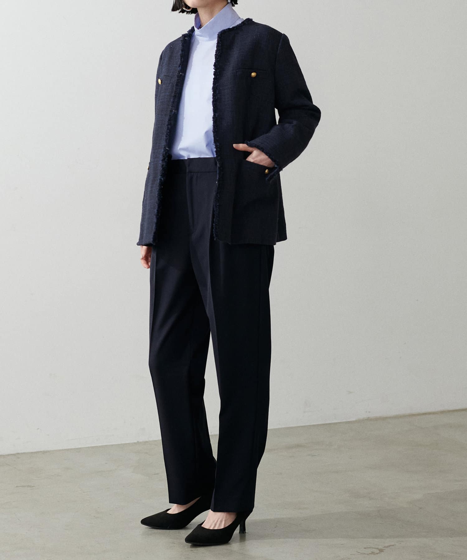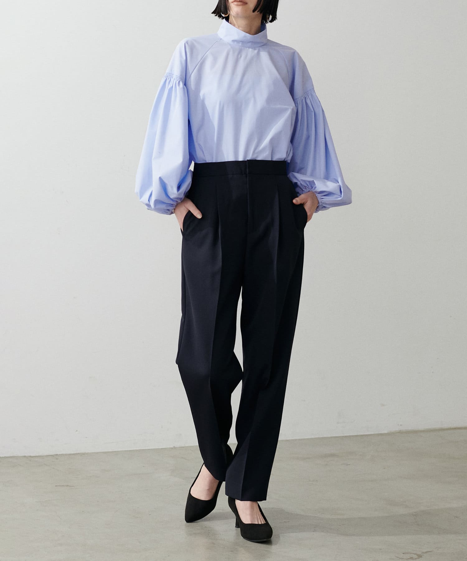 程よく肉感のある素材で脚のラインを拾わず、ウエスト位置もやや高めに設定することで、スタイルアップが叶う一枚です。