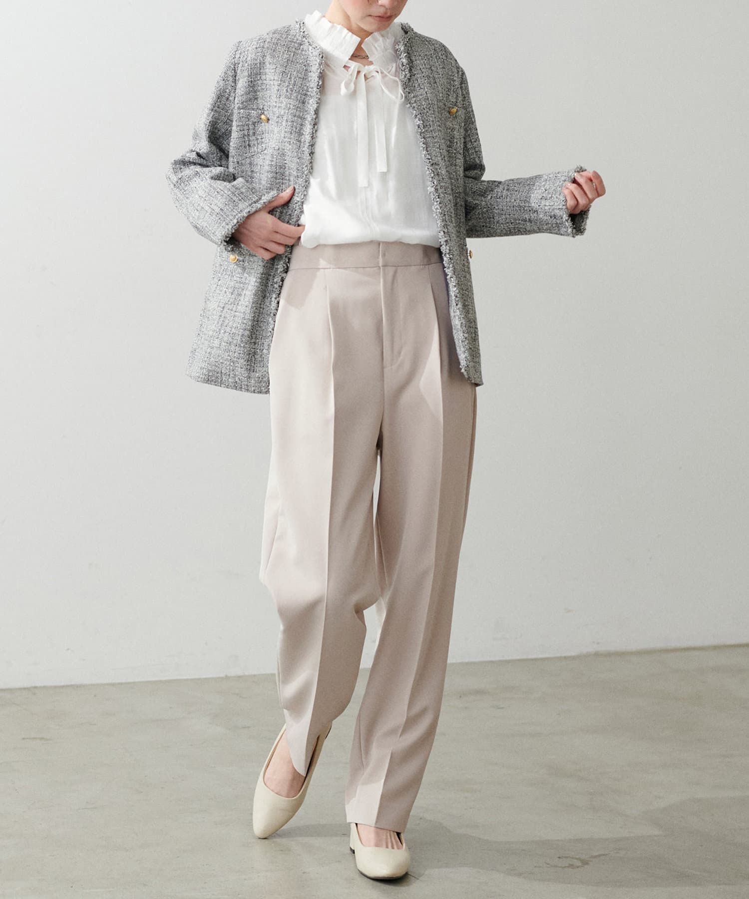 ボータイリボンギャザーブラウスやノーカラーフリンジツィードジャケットなどの