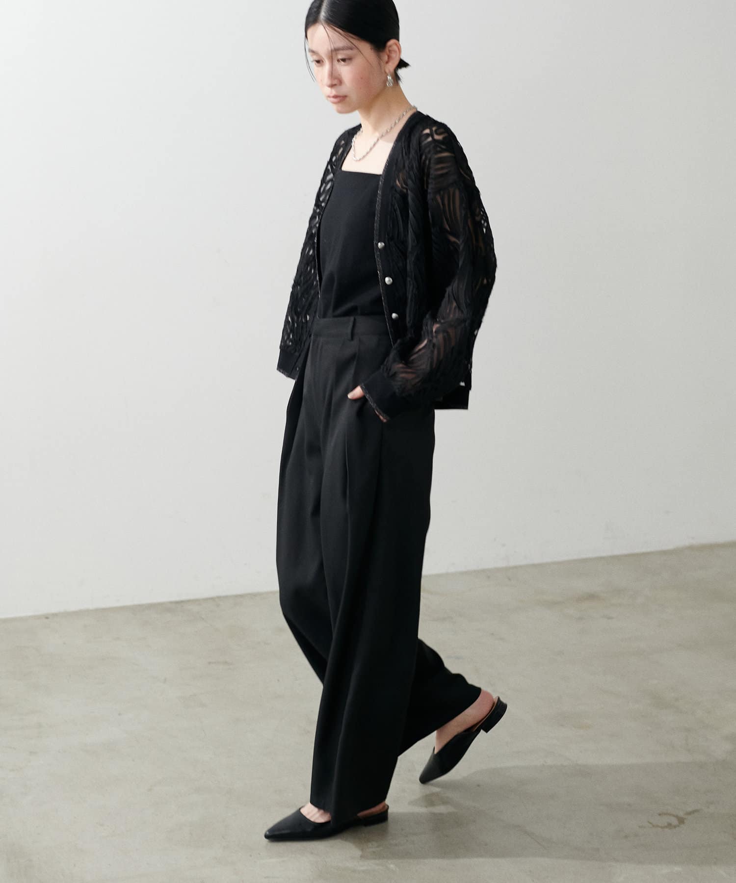 ポインテッドタイプのシューズなど、シャープ&フェミニンな