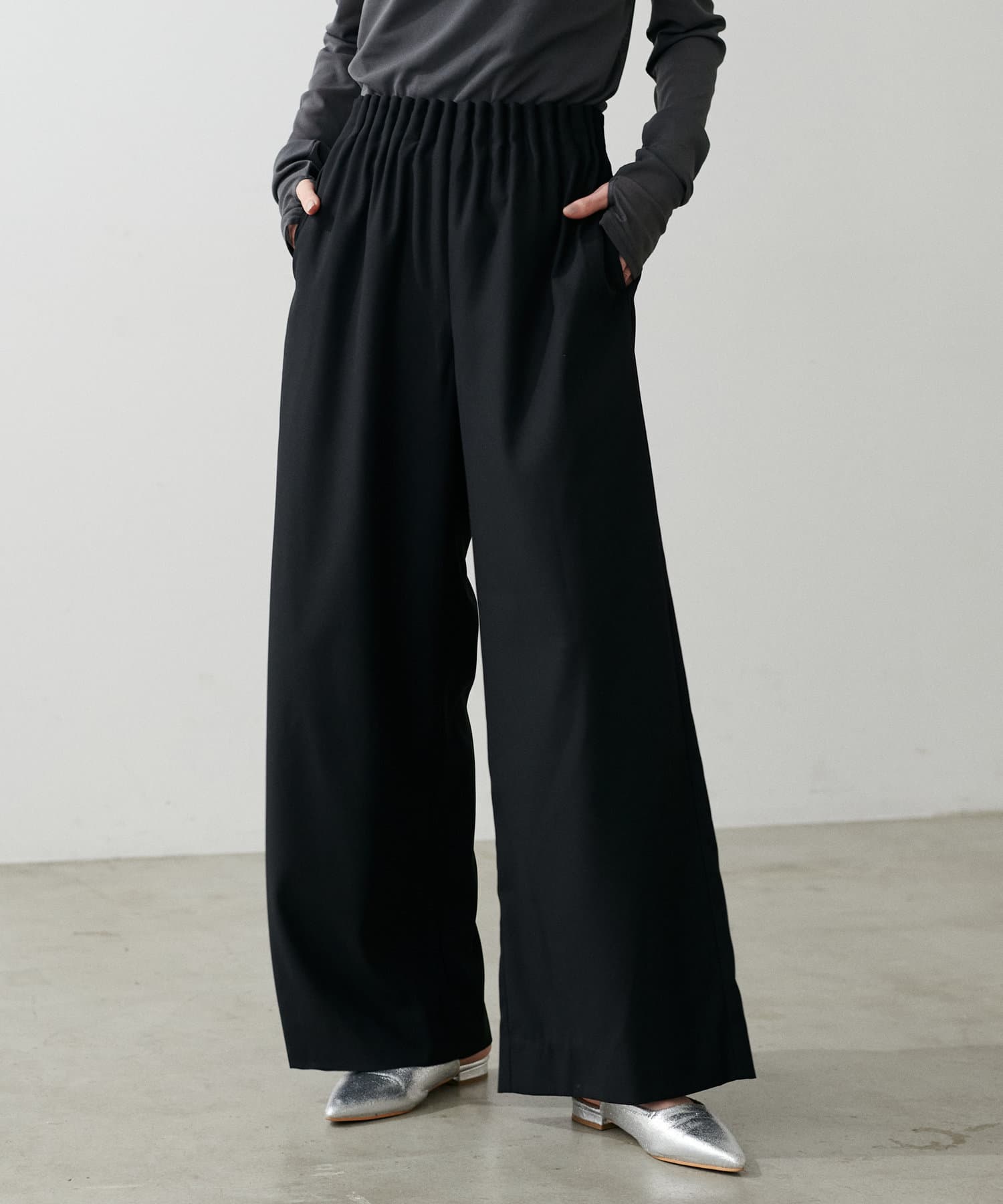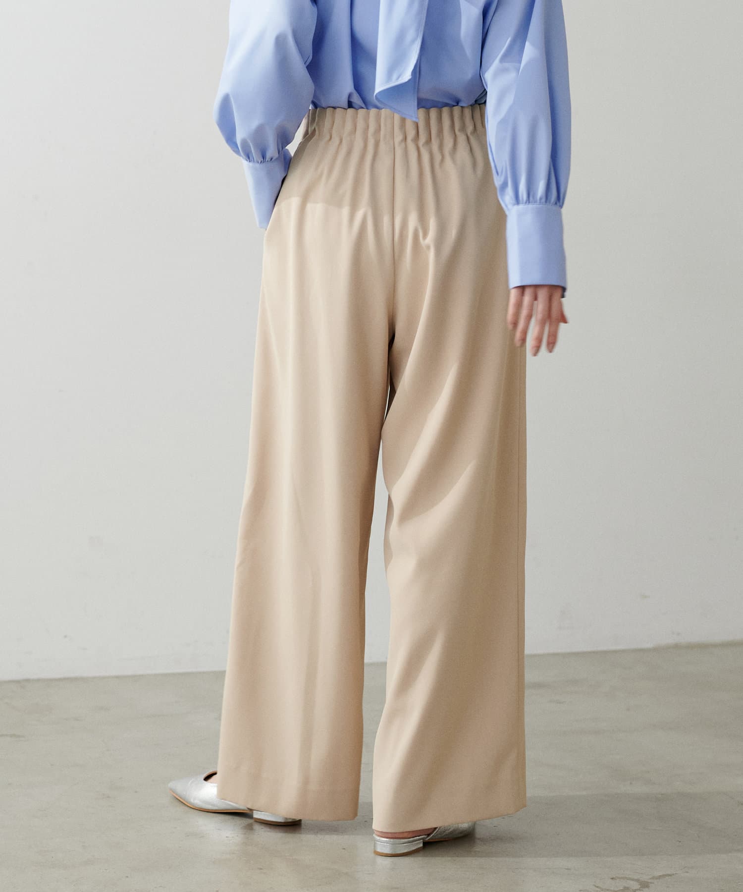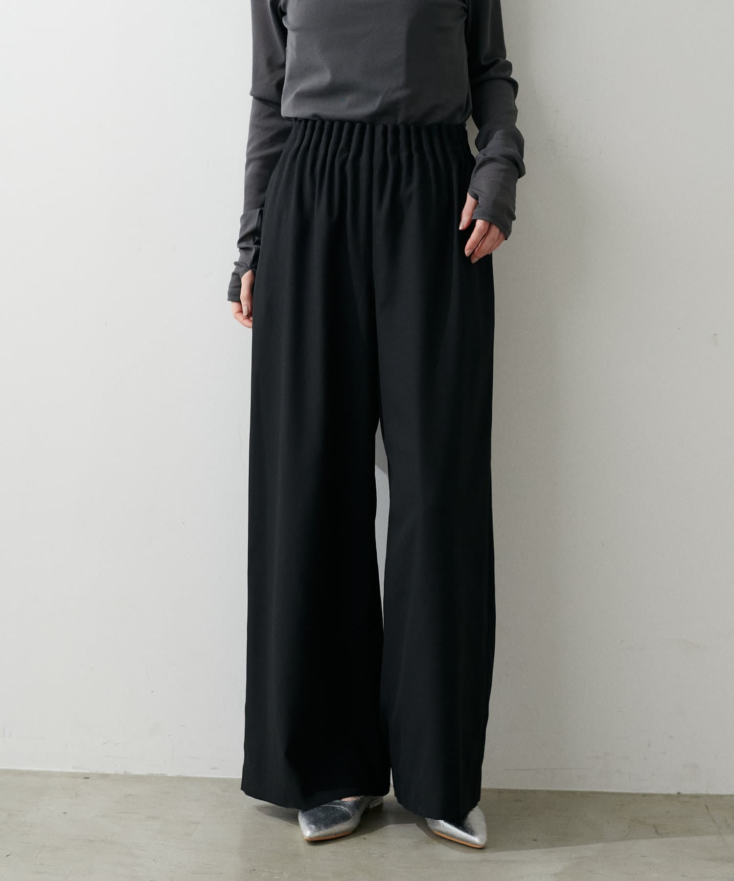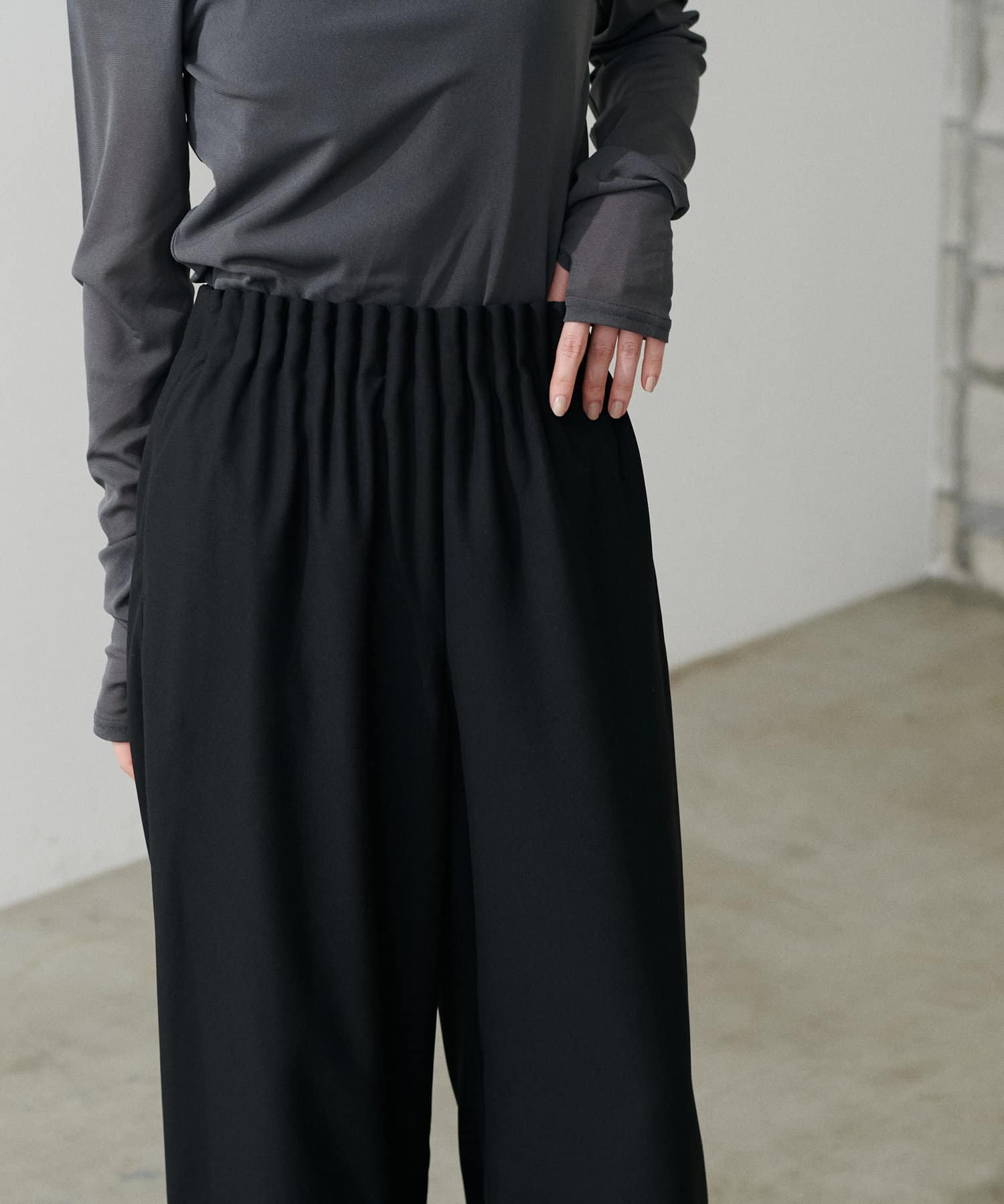 ワイドシルエットでシンプルな見た目ながら、ウエストがキャタピラーのような立体的なタックデザインで