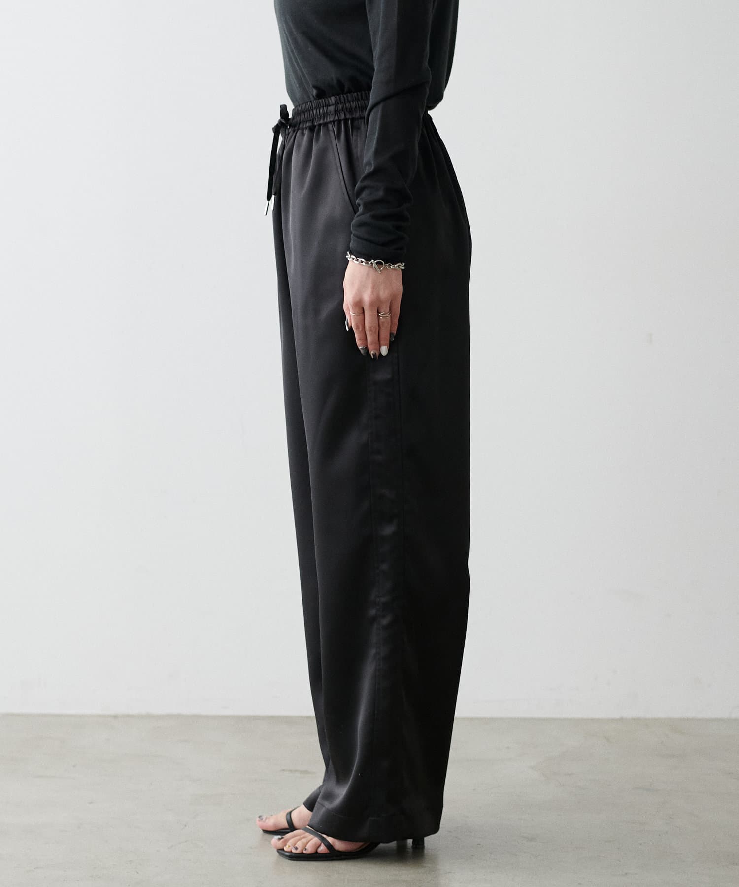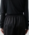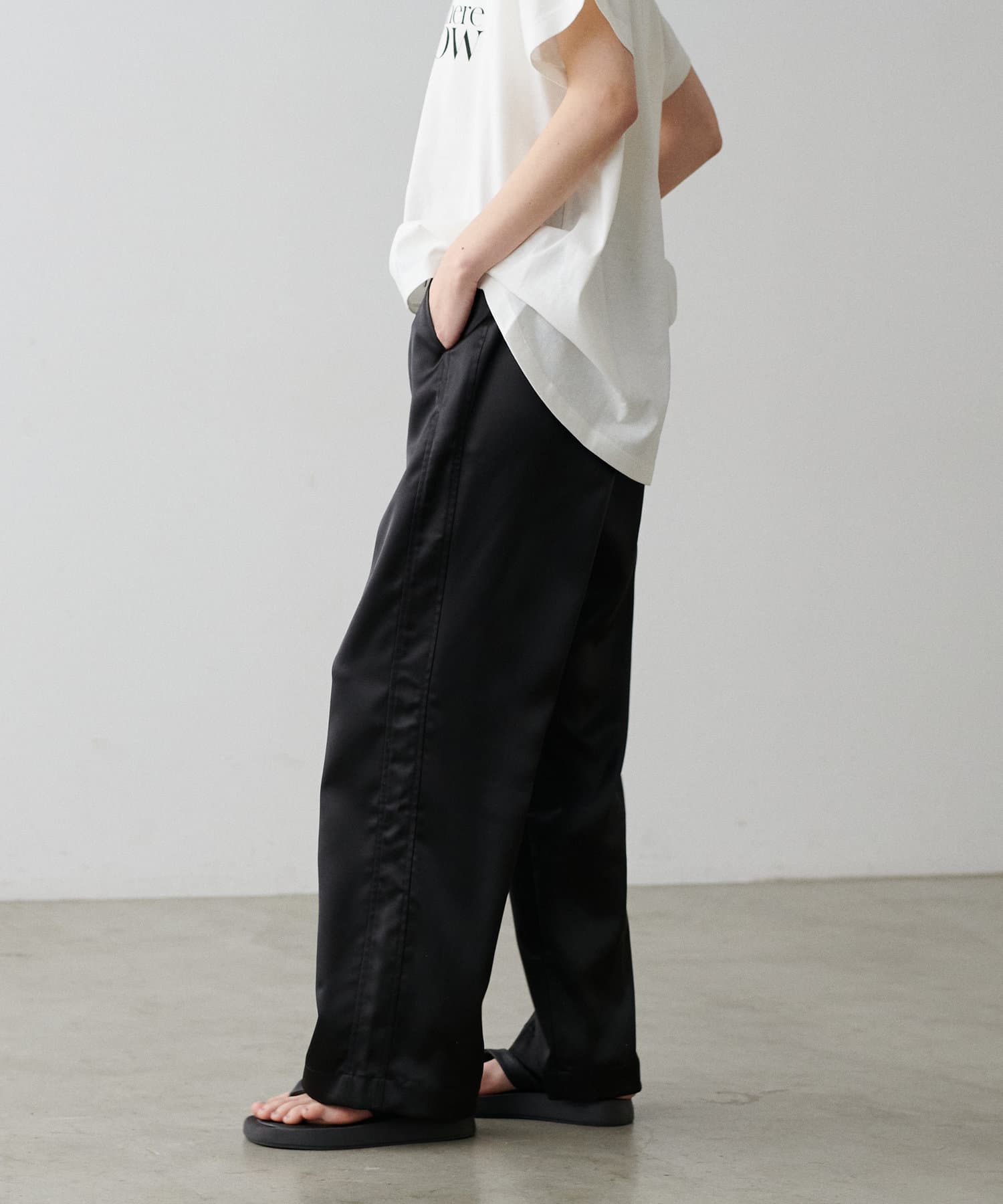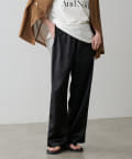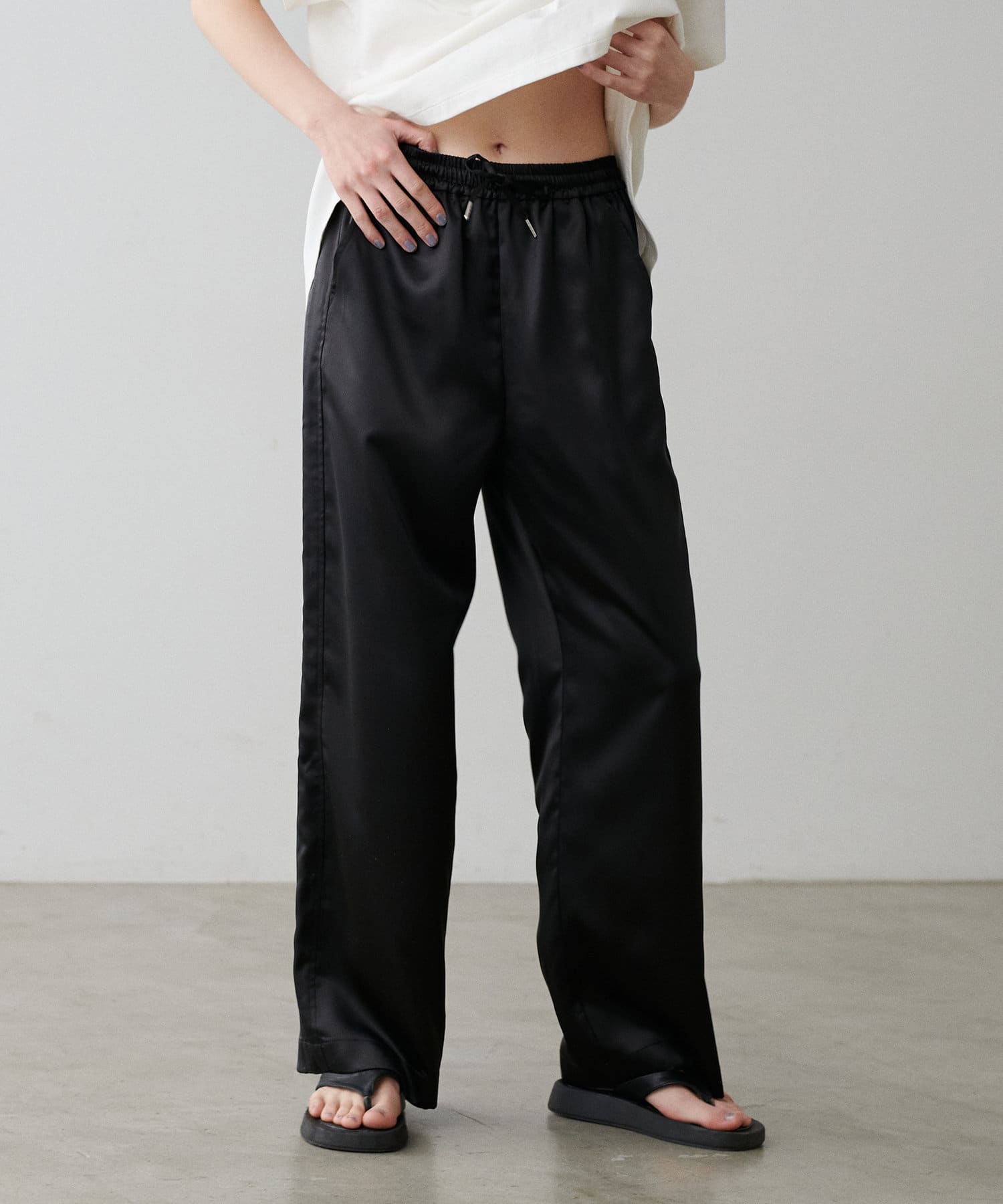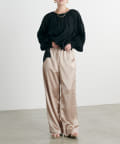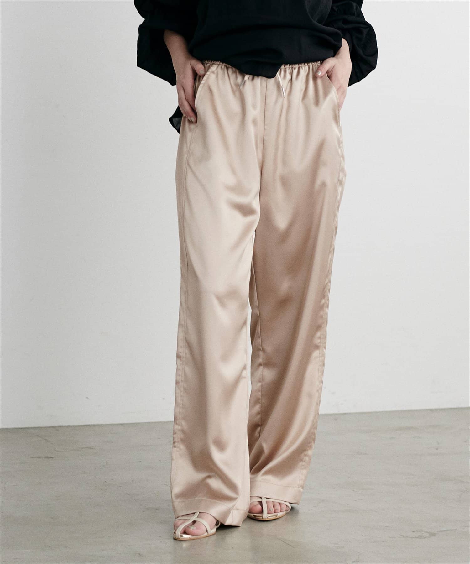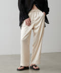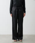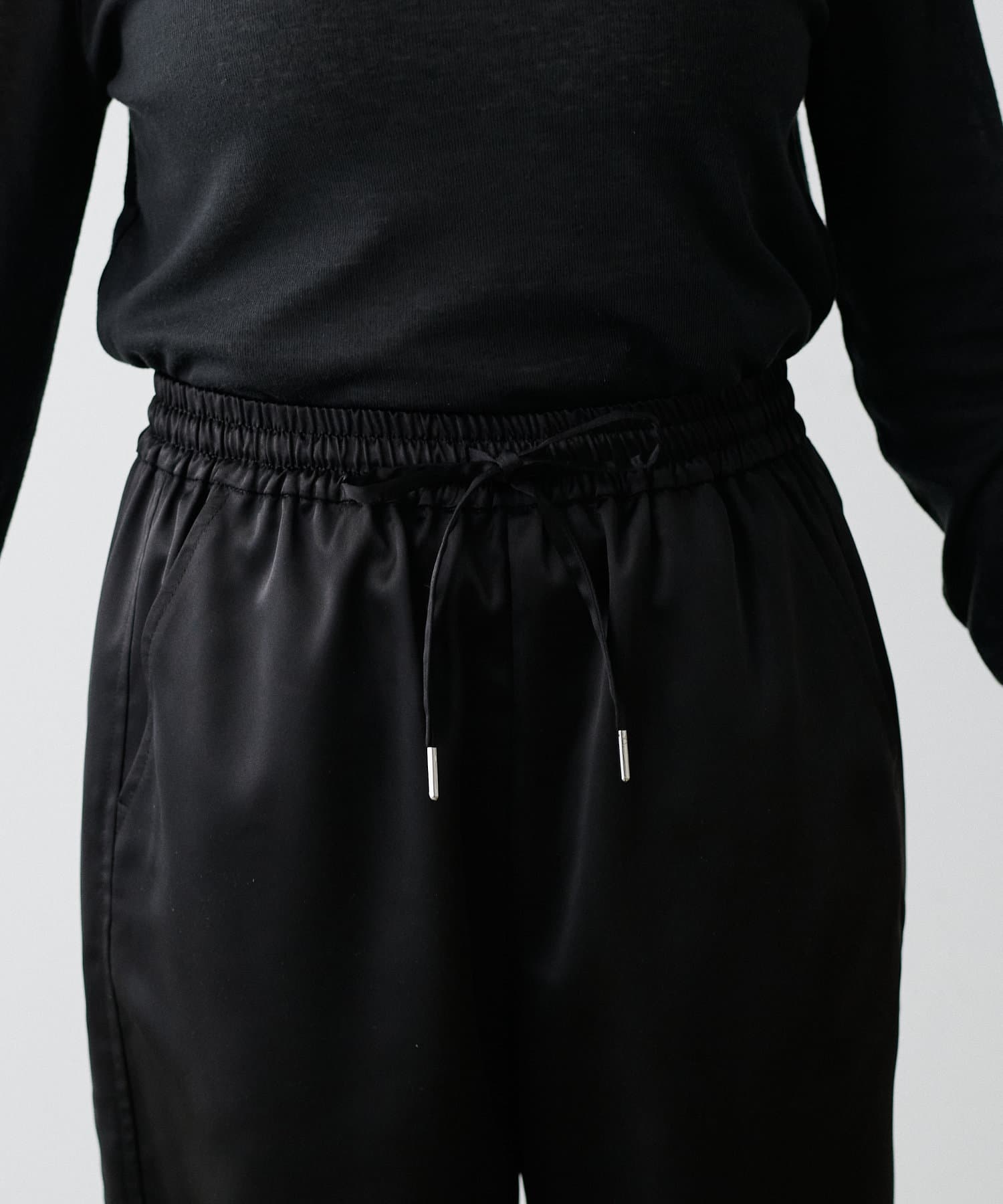 サイドのラインと艶のあるサテン生地がコーディネートのポイントになるイージーパンツ。