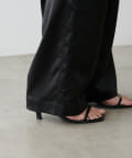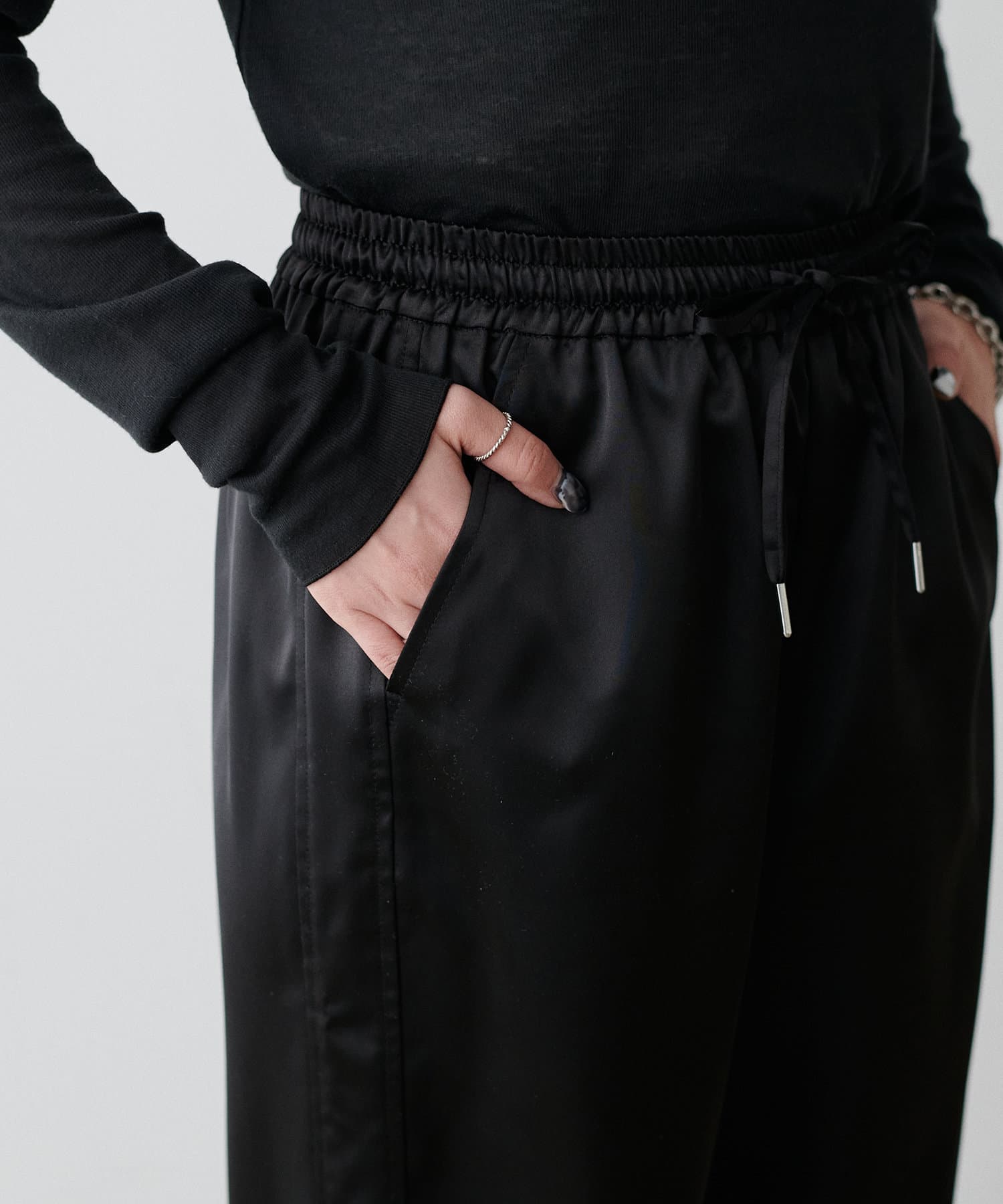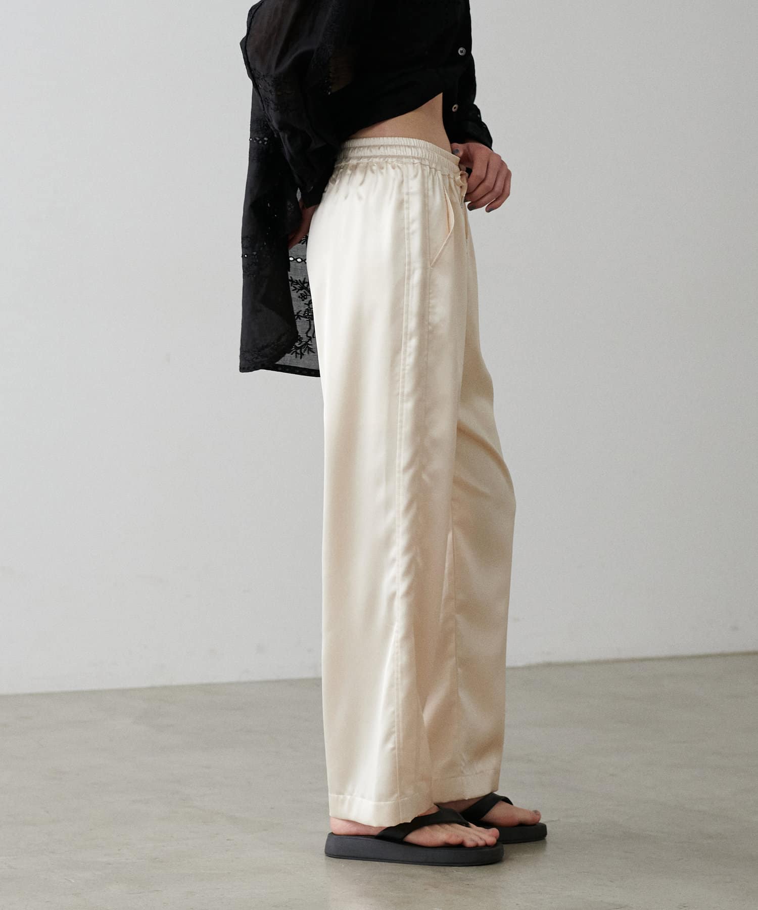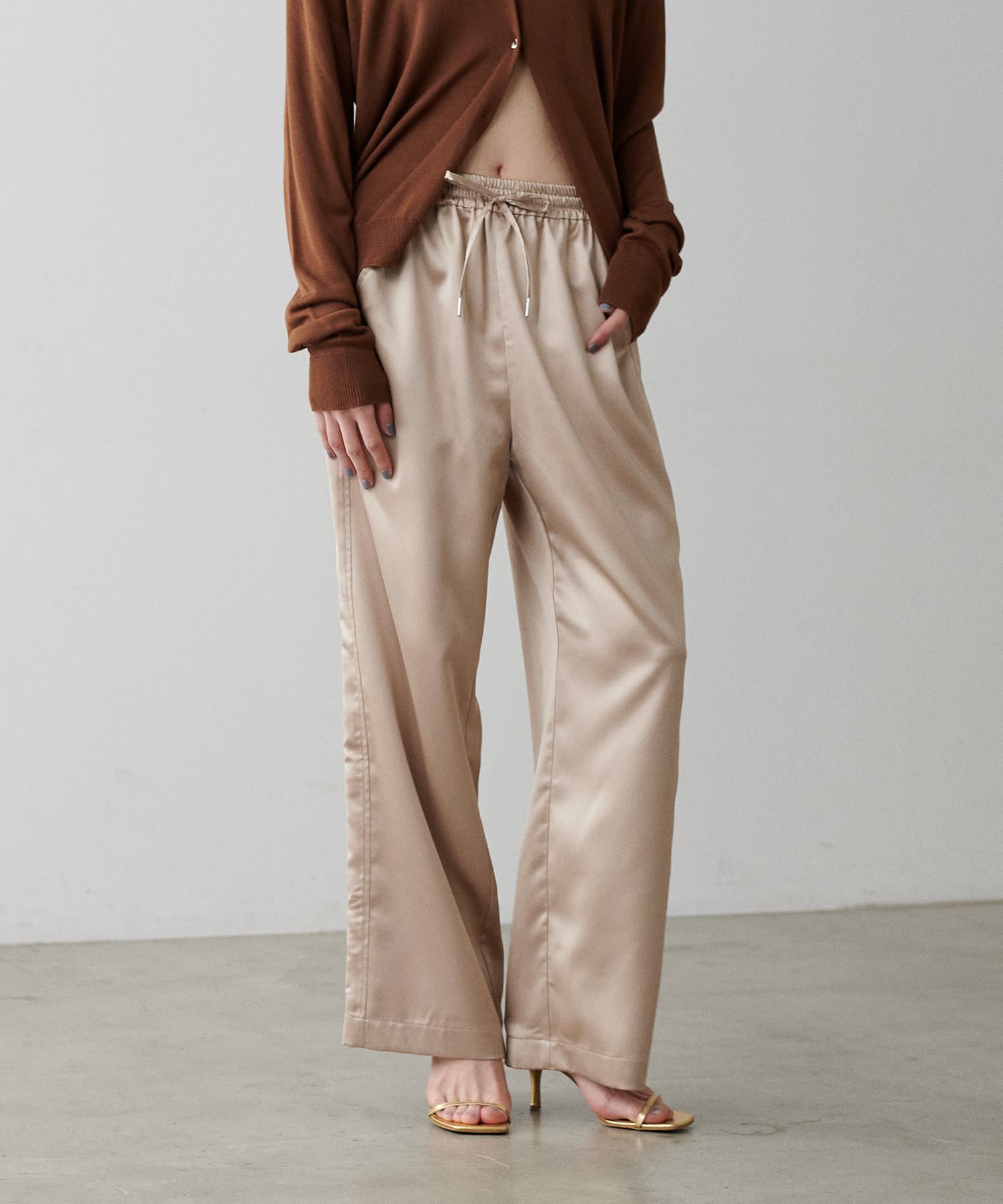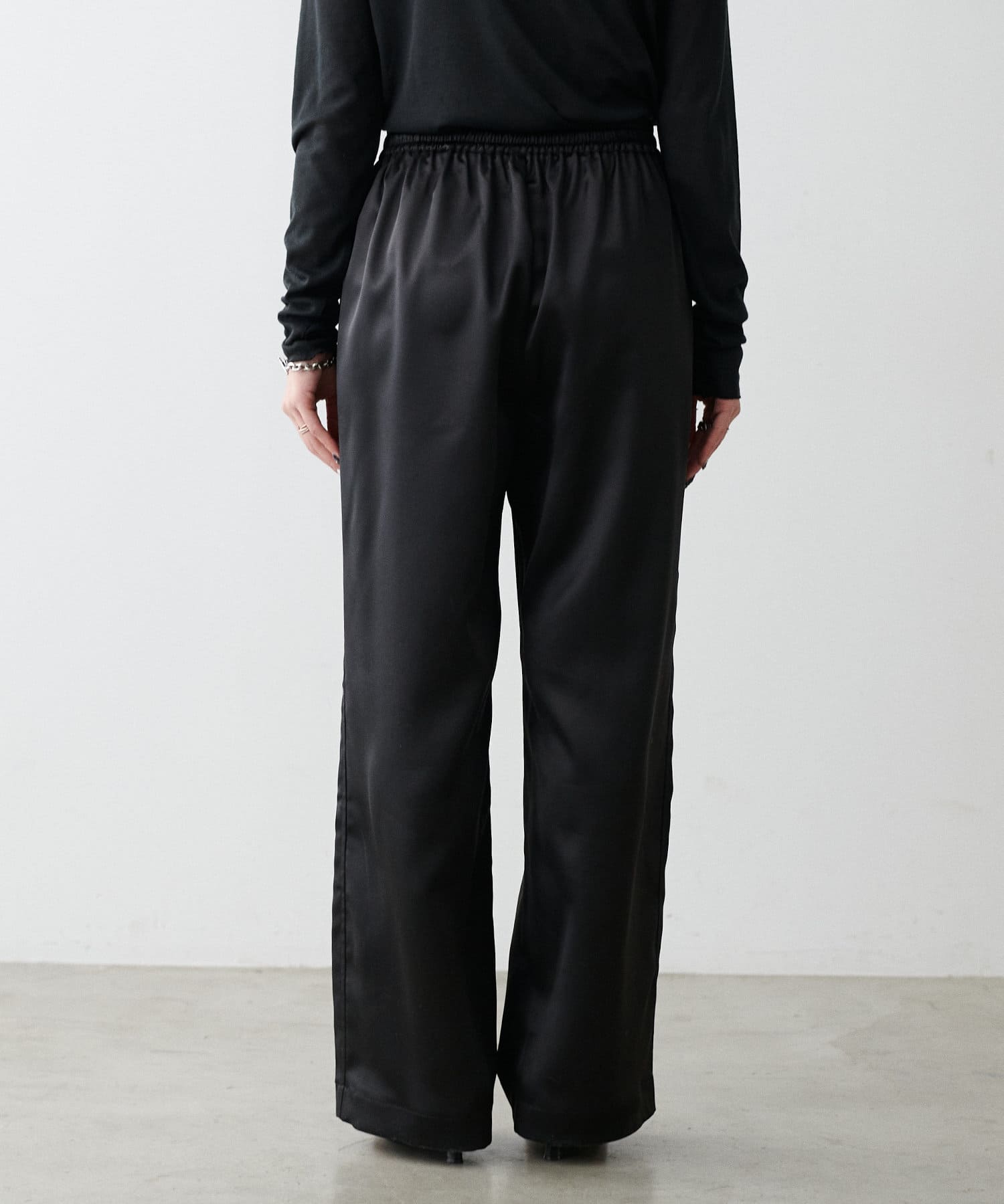 サイドのラインと艶のあるサテン生地がコーディネートのポイントになるイージーパンツ。